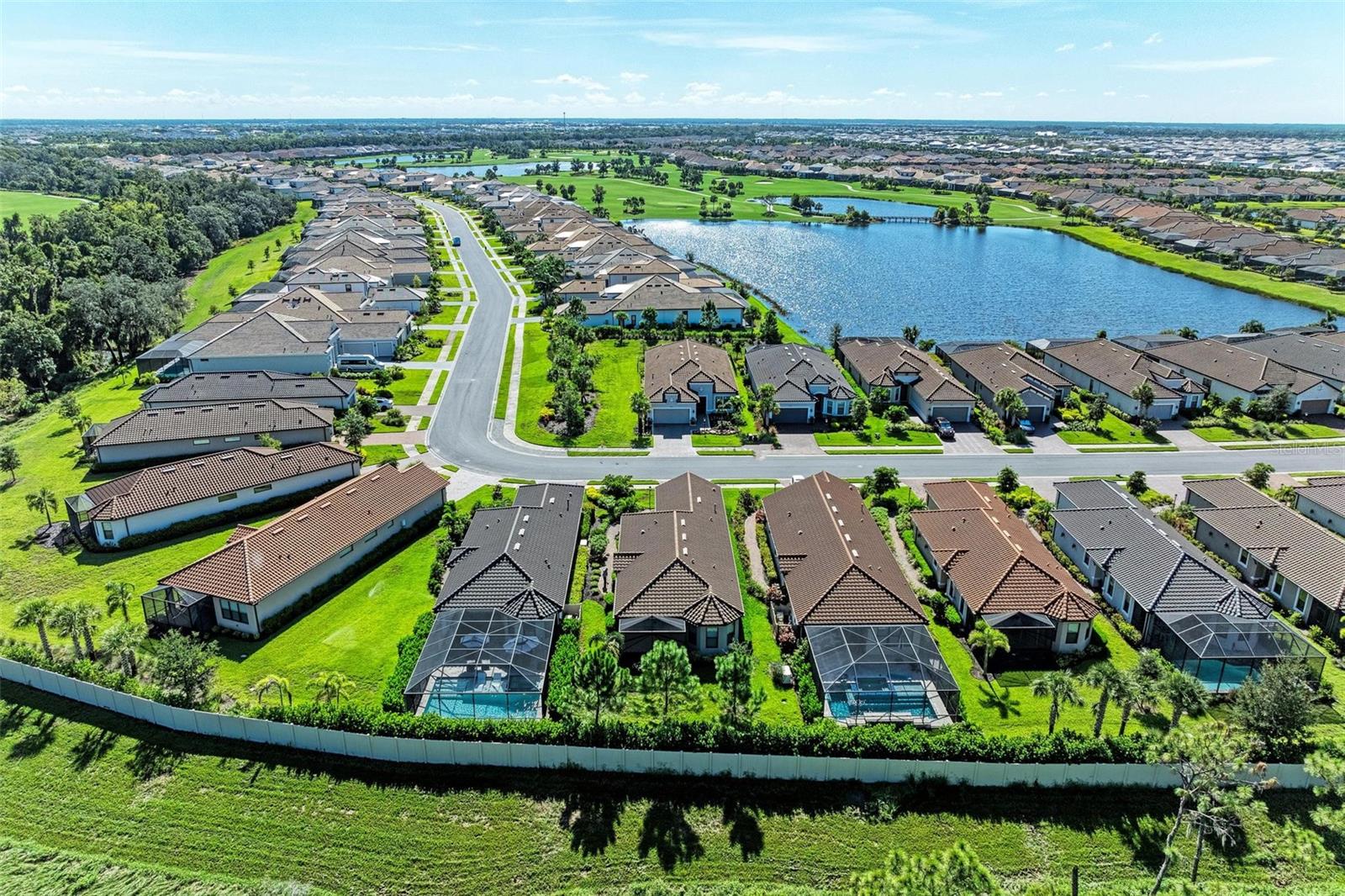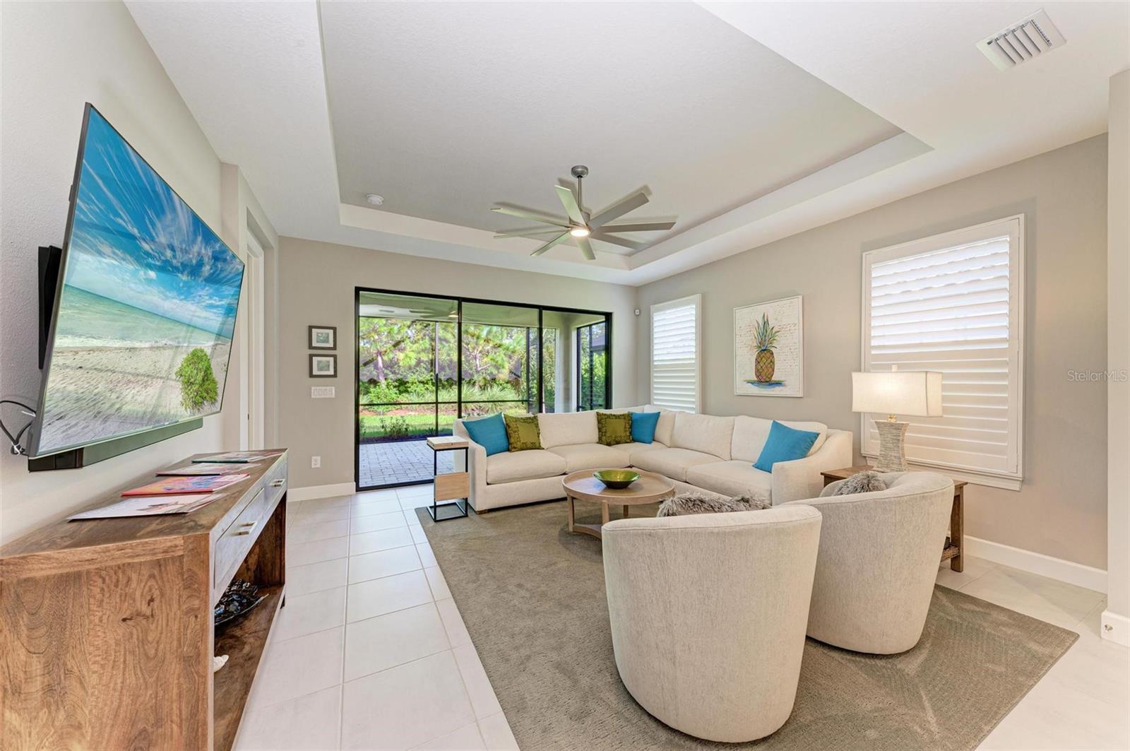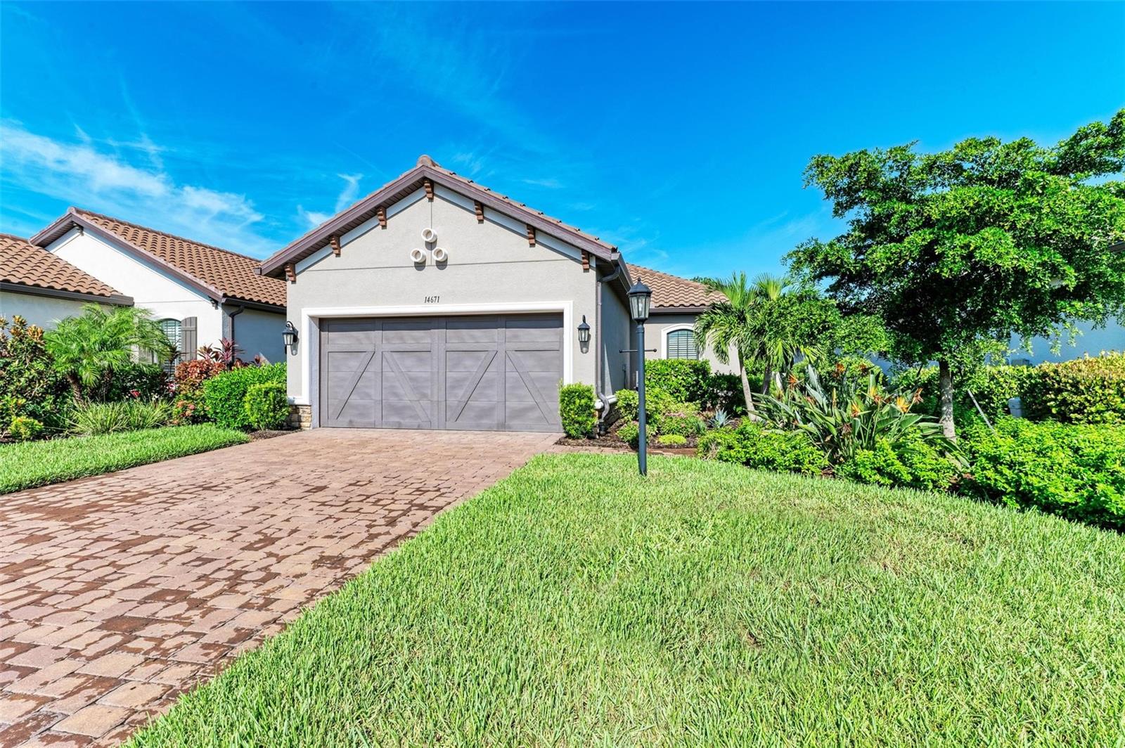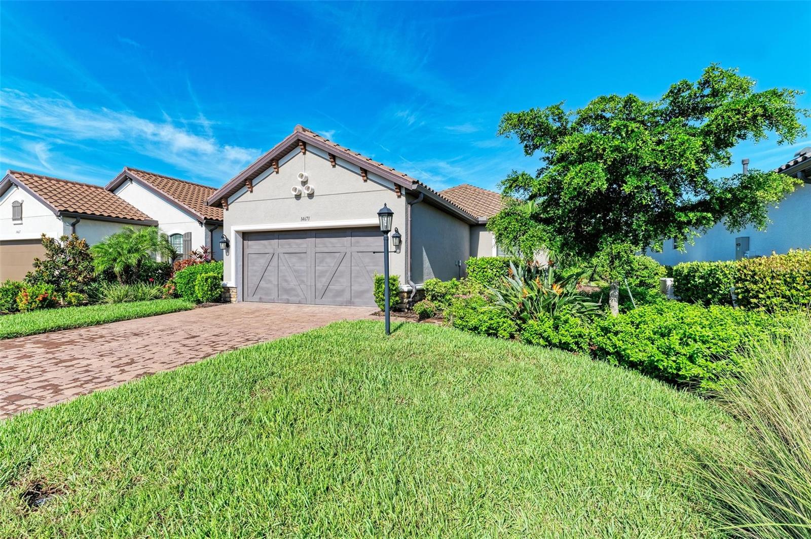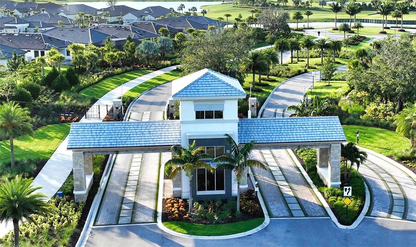Gorgeous best priced detached Roma Villa model in Azario! Welcome to luxury living at Azario Golf & Country Club! Culinary Center is now open! This spacious Roma villa is 1,689 sq ft, in meticulous condition, ready to move into with deeded golf! This detached 2-bedroom villa plus den is in like-new move-in condition and lives like a single family home. Step outside and experience Florida's year-round sunshine on your expansive outdoor extended screened-in Lanai for entertaining and quiet moments. The Lanai is outfitted with gas and plumbing rough-ins for a future outdoor kitchen. The convenient Den/Study features a tray ceiling, double pocket sliding doors, and transom window. The designer Kitchen features 42” white shaker cabinets with soft-close drawers and doors, and white quartz countertops. Appliances are GE including a gas range, dishwasher, microwave, and disposal. Enjoy the convenience of a breakfast bar, newly upgraded large single basin stainless sink, under cabinet ambient lighting, lots of storage, and a full pantry. The adjacent dining room features a tray ceiling and chandelier. The Great Room is light and airy with white tile flooring, two windows with plantation shutters, a glass slider to Lanai, a designer ceiling fan with light, plus a tray ceiling. The Primary Bedroom is a retreat all its own showcasing bay windows, a designer ceiling fan with light, a tray ceiling, walk-in closet, and an ensuite bath with a large walk-in shower and dual vanities. Upgraded laundry room with LG washer and dryer, utility sink, a base cabinet as well as abundant wall cabinetry. The 2nd bedroom has a walk-in closet, designer ceiling fan with light, and a pocket door to the 2nd bathroom. The 2nd bathroom also has a door to the hallway with a Linen Closet. All neutral décor, 8’ interior doors, upgraded 10' ceilings, Gutters, and Plantation Shutters throughout. Large 4’ extended Garage with Epoxy flooring, automatic door opener, gas water heater, lots of room for storage or workspace, and includes the home's hurricane shutters. The landscaped yard will accommodate a pool, plus includes enhanced landscaping. Nestled within this exclusive gated, resort-style community, you'll discover a stunning 18 hole Championship golf course and an array of world-class amenities designed to make every day feel like you are on vacation. Amenities include a lifestyle director, 16 Pickleball courts, 6 lighted Har-Tru Tennis courts, 4 Bocce Ball courts. Relax by the lavish resort-style community pool with cabanas and lounge chairs, or enjoy the separate Satellite pool. Wellness Center. 24/7 State of the Art Fitness, Dog Parks, full Salon, and Spa. Special Bahama Bar is located by the pool and features outdoor casual dining. Culinary Center is now open! Gorgeous Clubhouse with a full indoor bar, gourmet restaurant, wine tastings, dinners, and special events and cooking classes. Spa and Massage. Toasted Café Coffee Bar for specialty coffees and pastries. Additionally Lakewood Ranch features 150 miles of walking/biking trails. Fabulous shopping and dining options and medical. World-famous Gulf Coast beaches, airports, and downtown Sarasota are just 30 minutes away. Experience unperilled luxury with a resort lifestyle. Welcome to your new home in paradise! Easy to see! Call today! Are you displaced by the storm? This beautiful villa offers immediate occupancy with cash, or new loan and motivated seller!!