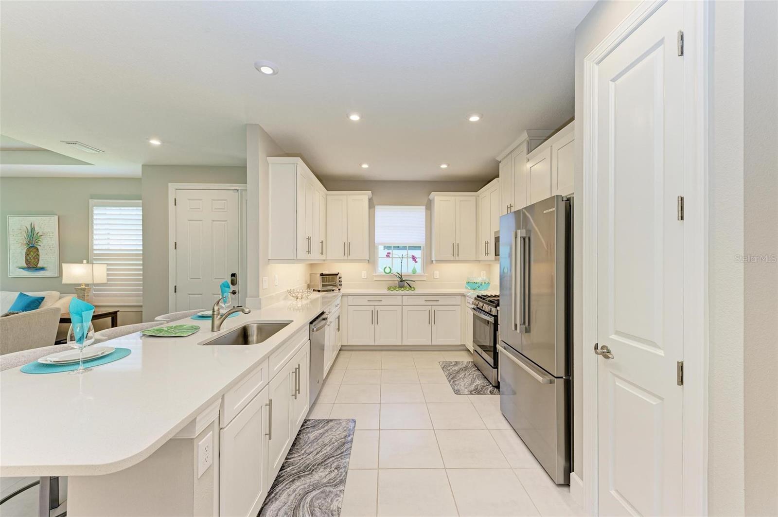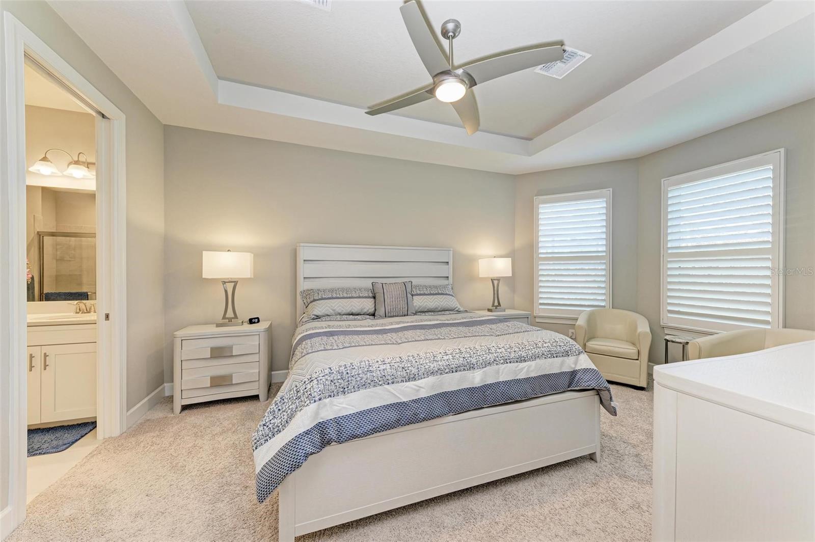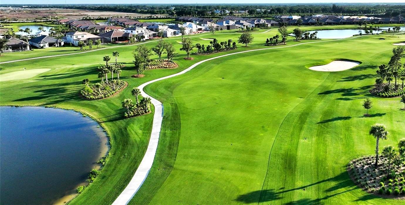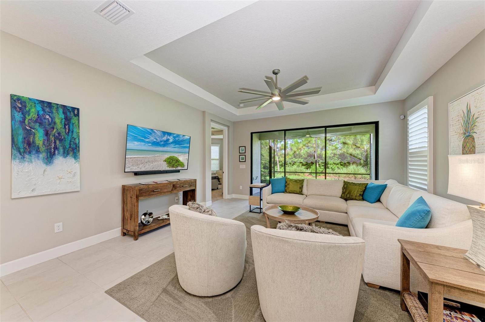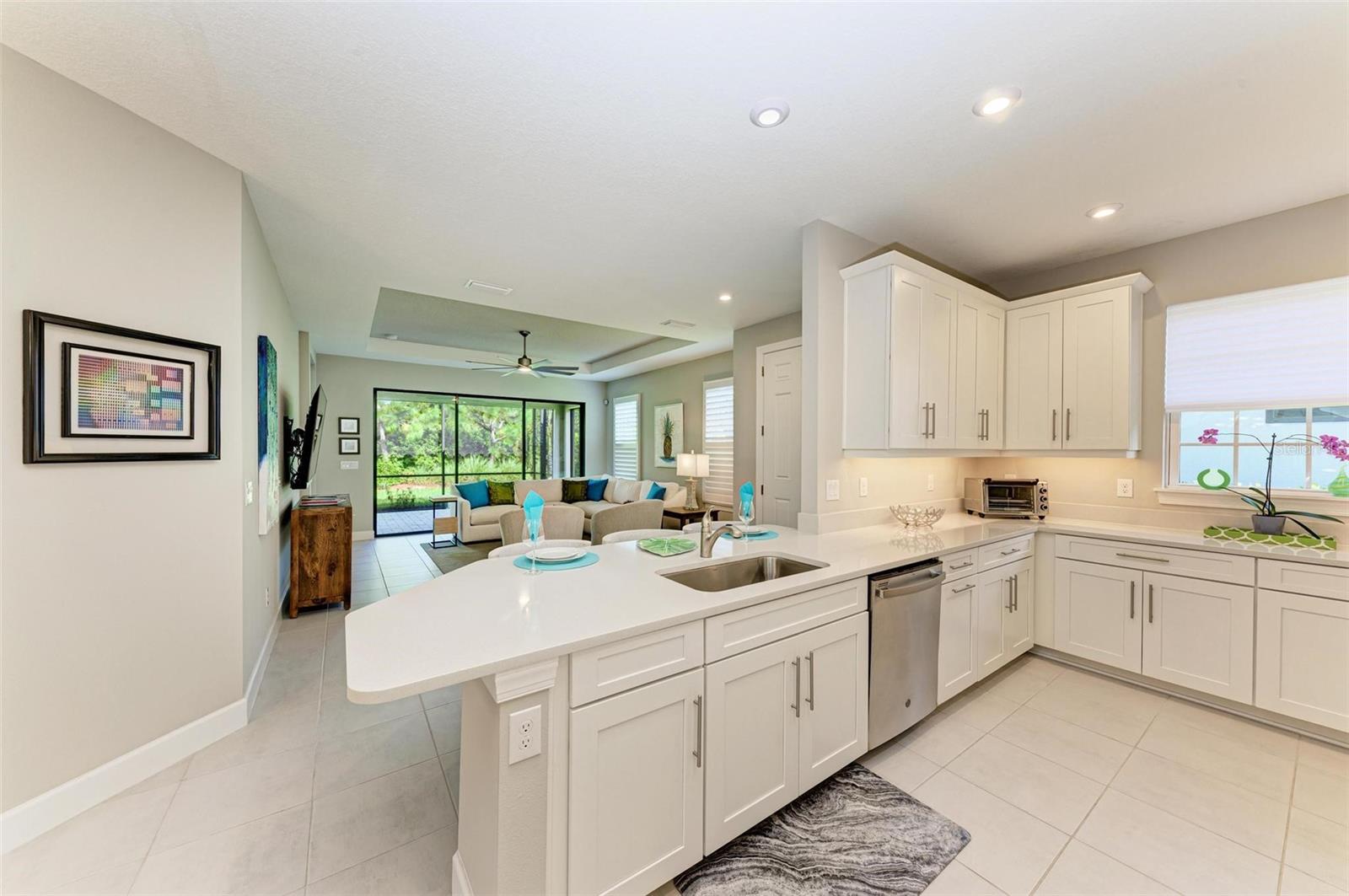 Gorgeous best priced detached Roma Villa model in Azario! Welcome to luxury living at Azario Golf & Country Club! Culinary Center is now open! This spacious Roma villa is 1,689 sq ft, in meticulous condition, ready to move into with deeded golf! This detached 2-bedroom villa plus den is in like-new move-in condition and lives like a single family home. Step outside and experience Florida's year-round sunshine on your expansive outdoor extended screened-in Lanai for entertaining and quiet moments. The Lanai is outfitted with gas and plumbing rough-ins for a future outdoor kitchen. The convenient Den/Study features a tray ceiling, double pocket sliding doors, and transom window. The designer Kitchen features 42” white shaker cabinets with soft-close drawers and doors, and white quartz countertops. Appliances are GE including a gas range, dishwasher, microwave, and disposal. Enjoy the convenience of a breakfast bar, newly upgraded large single basin stainless sink, under cabinet ambient lighting, lots of storage, and a full pantry. The adjacent dining room features a tray ceiling and chandelier. The Great Room is light and airy with white tile flooring, two windows with plantation shutters, a glass slider to Lanai, a designer ceiling fan with light, plus a tray ceiling. The Primary Bedroom is a retreat all its own showcasing bay windows, a designer ceiling fan with light, a tray ceiling, walk-in closet, and an ensuite bath with a large walk-in shower and dual vanities. Upgraded laundry room with LG washer and dryer, utility sink, a base cabinet as well as abundant wall cabinetry. The 2nd bedroom has a walk-in closet, designer ceiling fan with light, and a pocket door to the 2nd bathroom. The 2nd bathroom also has a door to the hallway with a Linen Closet. All neutral décor, 8’ interior doors, upgraded 10' ceilings, Gutters, and Plantation Shutters throughout. Large 4’ extended Garage with Epoxy flooring, automatic door opener, gas water heater, lots of room for storage or workspace, and includes the home's hurricane shutters. The landscaped yard will accommodate a pool, plus includes enhanced landscaping. Nestled within this exclusive gated, resort-style community, you'll discover a stunning 18 hole Championship golf course and an array of world-class amenities designed to make every day feel like you are on vacation. Amenities include a lifestyle director, 16 Pickleball courts, 6 lighted Har-Tru Tennis courts, 4 Bocce Ball courts. Relax by the lavish resort-style community pool with cabanas and lounge chairs, or enjoy the separate Satellite pool. Wellness Center. 24/7 State of the Art Fitness, Dog Parks, full Salon, and Spa. Special Bahama Bar is located by the pool and features outdoor casual dining. Culinary Center is now open! Gorgeous Clubhouse with a full indoor bar, gourmet restaurant, wine tastings, dinners, and special events and cooking classes. Spa and Massage. Toasted Café Coffee Bar for specialty coffees and pastries. Additionally Lakewood Ranch features 150 miles of walking/biking trails. Fabulous shopping and dining options and medical. World-famous Gulf Coast beaches, airports, and downtown Sarasota are just 30 minutes away. Experience unperilled luxury with a resort lifestyle. Welcome to your new home in paradise! Easy to see! Call today! Are you displaced by the storm? This beautiful villa offers immediate occupancy with cash, or new loan and motivated seller!!
