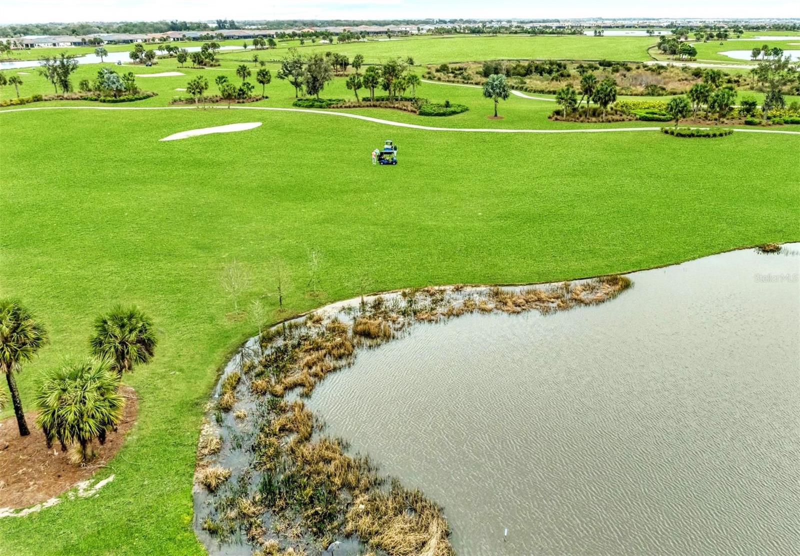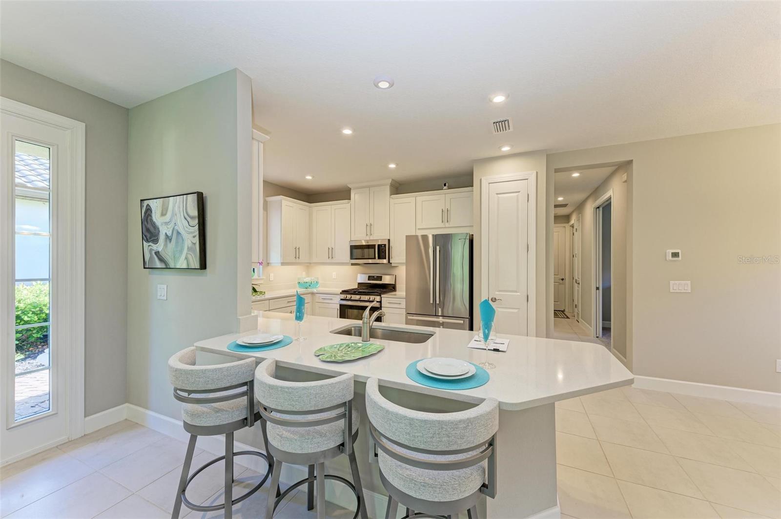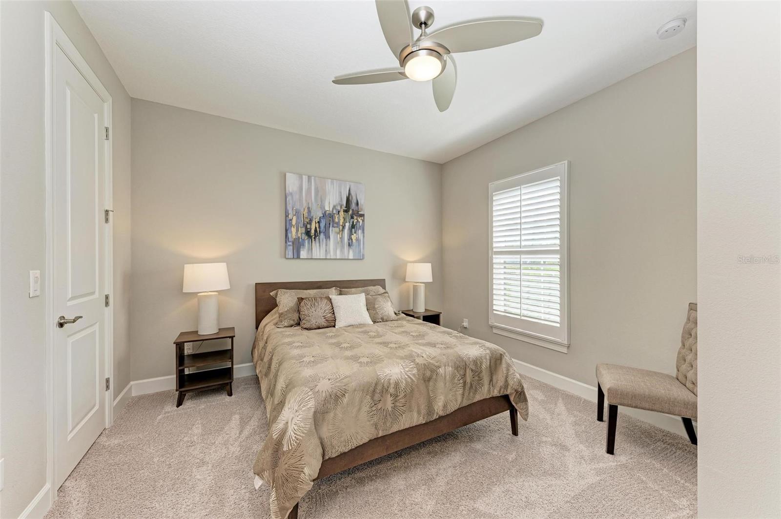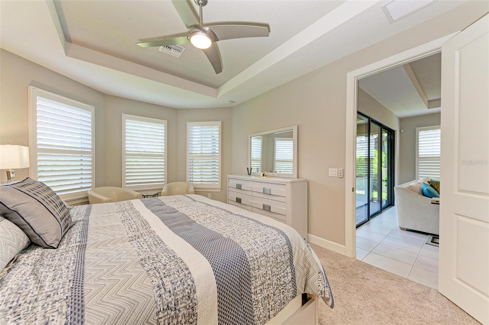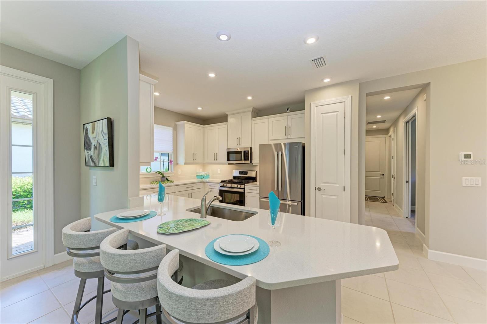 Gorgeous best priced detached Roma Villa model in Azario! Welcome to luxury living at Azario Golf & Country Club! Culinary Center is now open! This spacious Roma villa is 1,689 sq ft, in meticulous condition, ready to move into with deeded golf! This detached 2-bedroom villa plus den is in like-new move-in condition and lives like a single family home. Step outside and experience Florida's year-round sunshine on your expansive outdoor extended screened-in Lanai for entertaining and quiet moments. The Lanai is outfitted with gas and plumbing rough-ins for a future outdoor kitchen. The convenient Den/Study features a tray ceiling, double pocket sliding doors, and transom window. The designer Kitchen features 42” white shaker cabinets with soft-close drawers and doors, and white quartz countertops. Appliances are GE including a gas range, dishwasher, microwave, and disposal. Enjoy the convenience of a breakfast bar, newly upgraded large single basin stainless sink, under cabinet ambient lighting, lots of storage, and a full pantry. The adjacent dining room features a tray ceiling and chandelier. The Great Room is light and airy with white tile flooring, two windows with plantation shutters, a glass slider to Lanai, a designer ceiling fan with light, plus a tray ceiling. The Primary Bedroom is a retreat all its own showcasing bay windows, a designer ceiling fan with light, a tray ceiling, walk-in closet, and an ensuite bath with a large walk-in shower and dual vanities. Upgraded laundry room with LG washer and dryer, utility sink, a base cabinet as well as abundant wall cabinetry. The 2nd bedroom has a walk-in closet, designer ceiling fan with light, and a pocket door to the 2nd bathroom. The 2nd bathroom also has a door to the hallway with a Linen Closet. All neutral décor, 8’ interior doors, upgraded 10' ceilings, Gutters, and Plantation Shutters throughout. Large 4’ extended Garage with Epoxy flooring, automatic door opener, gas water heater, lots of room for storage or workspace, and includes the home's hurricane shutters. The landscaped yard will accommodate a pool, plus includes enhanced landscaping. Nestled within this exclusive gated, resort-style community, you'll discover a stunning 18 hole Championship golf course and an array of world-class amenities designed to make every day feel like you are on vacation. Amenities include a lifestyle director, 16 Pickleball courts, 6 lighted Har-Tru Tennis courts, 4 Bocce Ball courts. Relax by the lavish resort-style community pool with cabanas and lounge chairs, or enjoy the separate Satellite pool. Wellness Center. 24/7 State of the Art Fitness, Dog Parks, full Salon, and Spa. Special Bahama Bar is located by the pool and features outdoor casual dining. Culinary Center is now open! Gorgeous Clubhouse with a full indoor bar, gourmet restaurant, wine tastings, dinners, and special events and cooking classes. Spa and Massage. Toasted Café Coffee Bar for specialty coffees and pastries. Additionally Lakewood Ranch features 150 miles of walking/biking trails. Fabulous shopping and dining options and medical. World-famous Gulf Coast beaches, airports, and downtown Sarasota are just 30 minutes away. Experience unperilled luxury with a resort lifestyle. Welcome to your new home in paradise! Easy to see! Call today! Are you displaced by the storm? This beautiful villa offers immediate occupancy with cash, or new loan and motivated seller!!