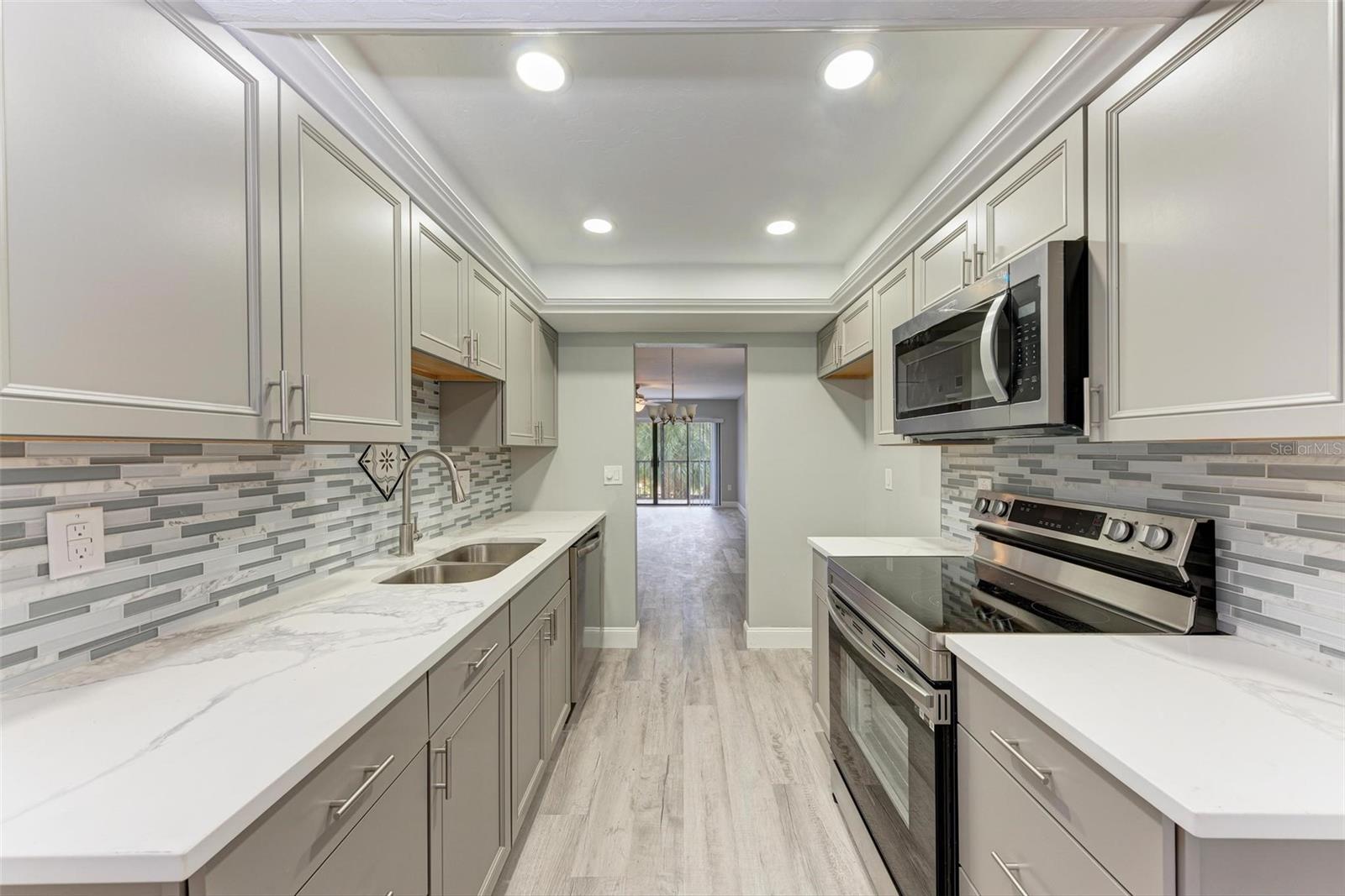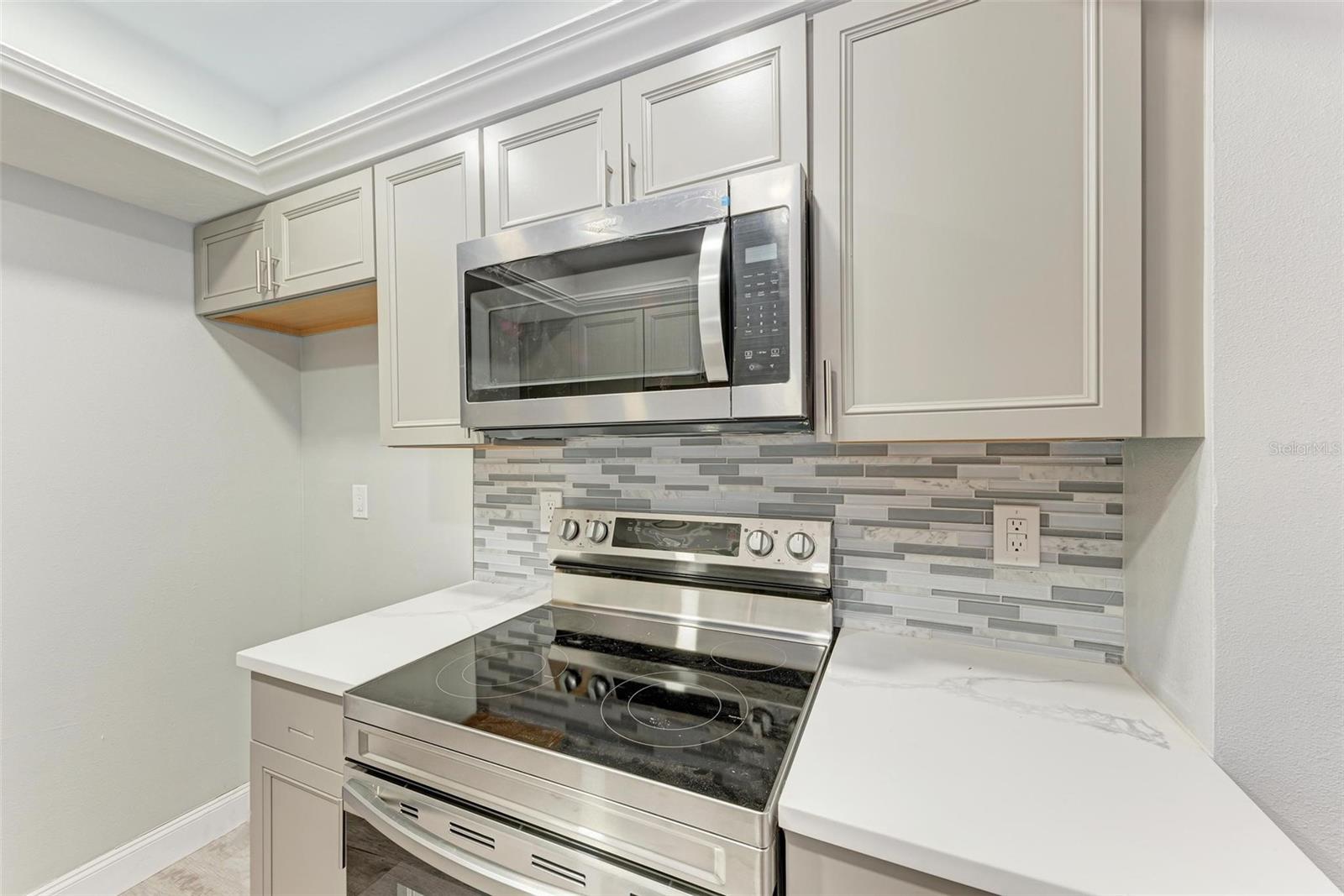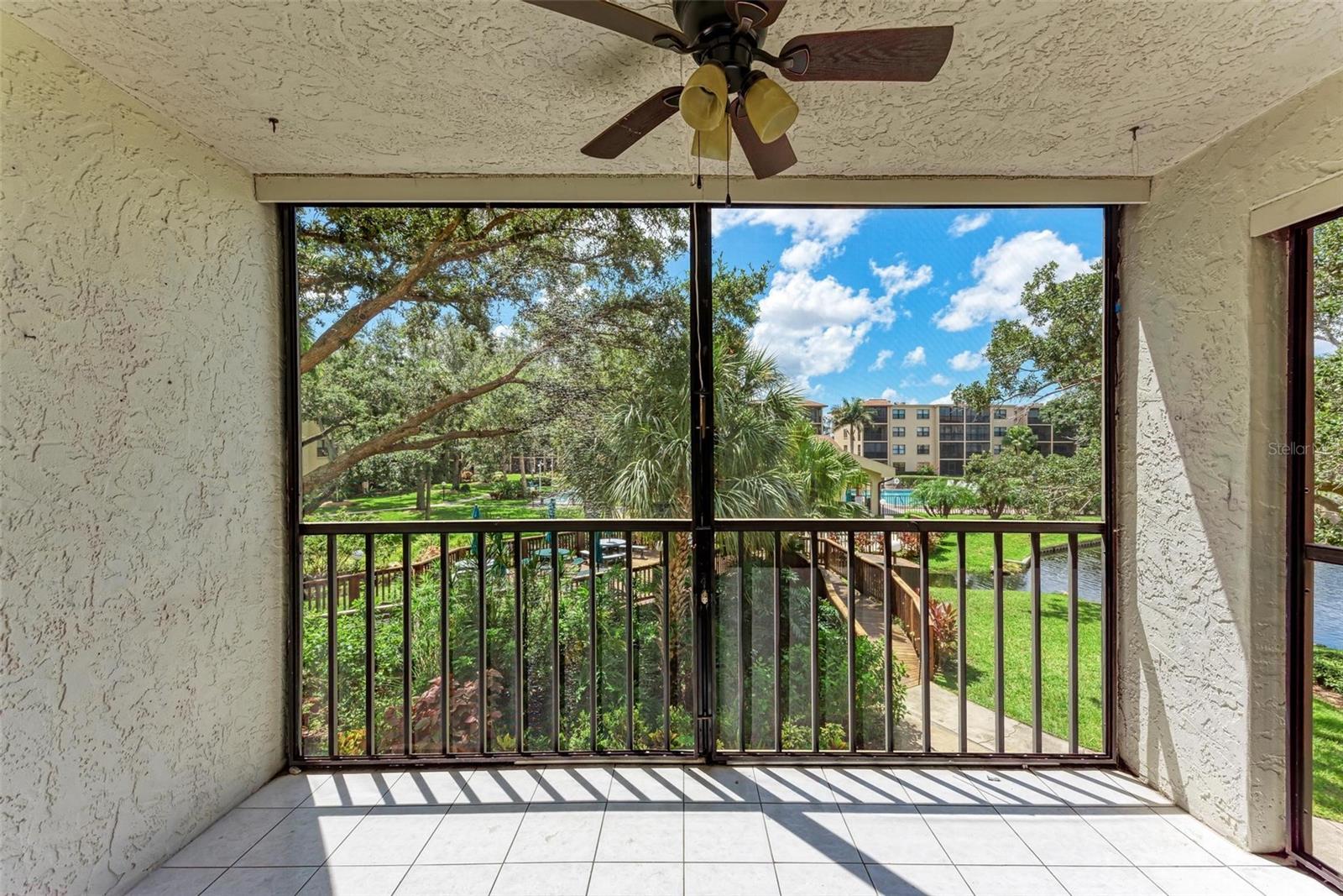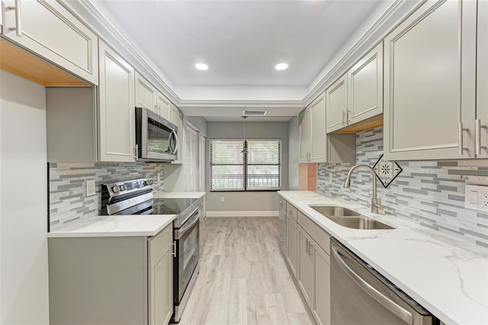 Seller is motivated! Second floor end unit with elevator access featuring 2-bedrooms, 2-baths in the gated community of Woodpark. Tastefully modern and recently remodeled throughout with laminate flooring, paint, kitchen cabinets, bathroom vanities, and beautiful quartz countertops. A nice split floor plan for privacy while entertaining guests. The master bedroom features a large walk-in closet and ensuite bath with a walk-in shower Dining space in the kitchen, stainless appliances, numerous cabinets, tile backsplash and quartz countertops. The lanai offers a relaxing view of the pool and lush tropical landscaping. There is a stacked washer and dryer inside the Condo, ensuring convenience and efficiency in your daily routine. All room dimensions must be verified by the buyers. Woodpark is a gated 55 plus community HOA requires a 700 minimum credit score and Buyer Approval.