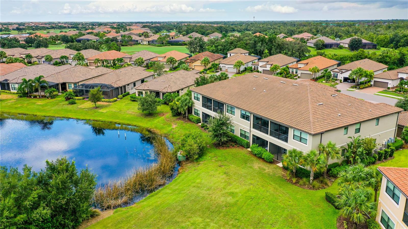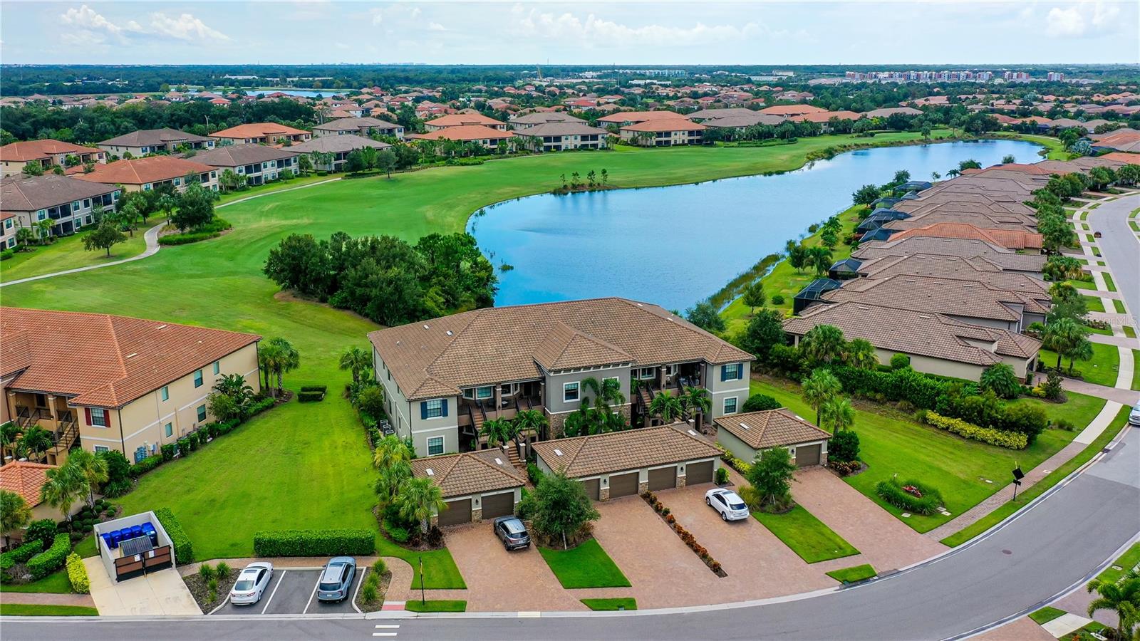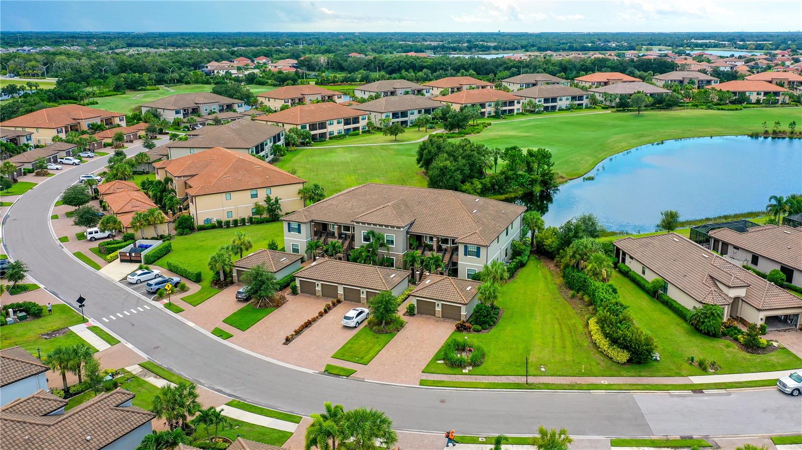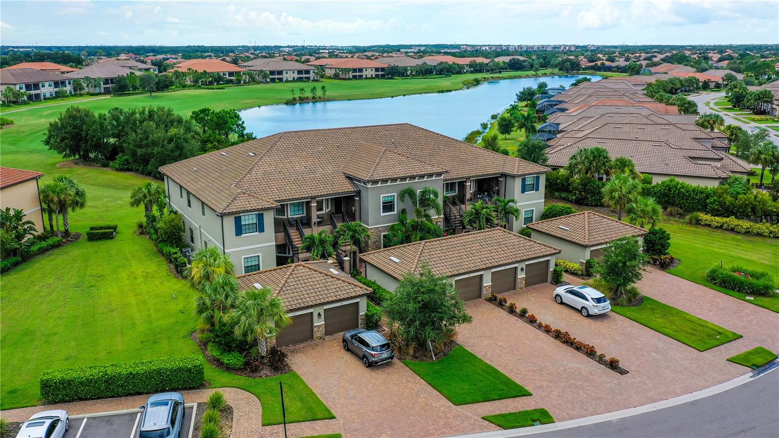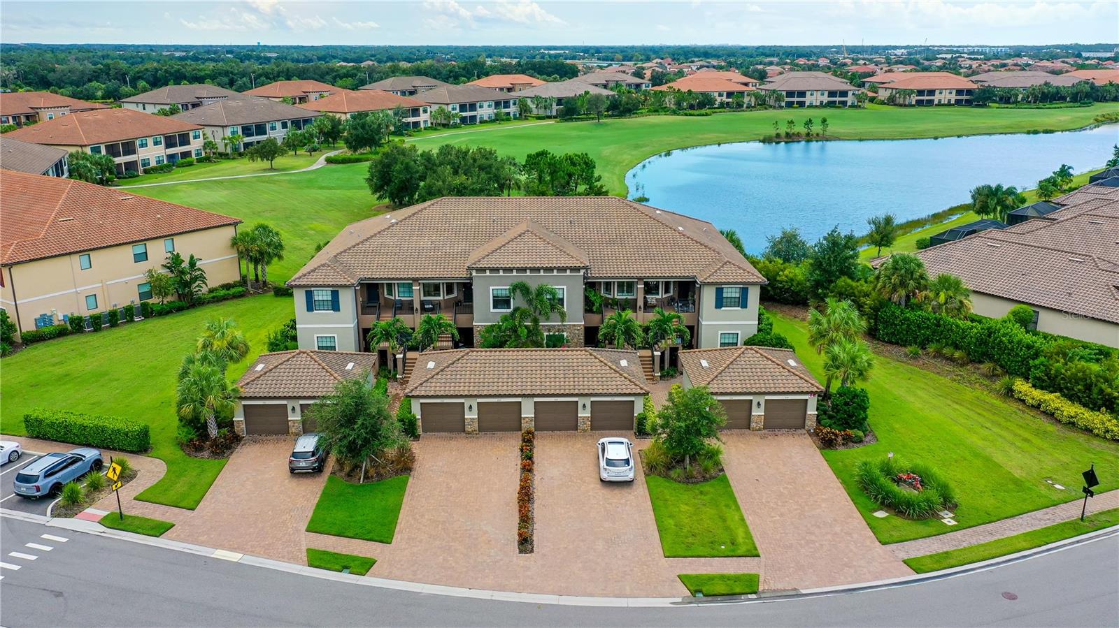FULLY RENOVATED & FULL GOLF MEMBERSHIP to Esplanade Golf & Country Club in Lakewood Ranch is INCLUDED. Welcome to your dream home in the resort-style community of Esplanade at Lakewood Ranch, a 24-hour guard-gated community where picturesque sidewalks wind through scenic landscapes. This stunning, golf-deeded condo comes with a golf membership and is one of only eight units per building, ensuring peace and tranquility with serene water views. Built in 2020 by Taylor Morrison Homes, this home has been completely renovated throughout featuring upgraded finishes and showcases a paver stone extended length driveway with a beautiful Spanish barrel tile roof. Offering over 1,500 square feet of thoughtfully designed living space, this home includes two bedrooms and two bathrooms with a flex room that offers privacy as an office or additional guest accommodation. Step inside to discover an interior that exudes elegance, with a shiplap entry, 13-foot ceilings, ceramic tile flooring throughout, and an open-concept design. The kitchen is a chef's delight, featuring quartz countertops, under-cabinet lighting, white cabinetry, exquisite glass tile backsplash, and stainless-steel appliances. A second pantry with pull-out shelves offers extra storage, complemented by a cozy eat-in kitchen nook. The living area is elevated by crown molding and fresh paint, while frosted sliding doors provide privacy for the office or flex room. The owner’s suite is a peaceful retreat, complete with stunning views, dual walk-in closets, and a spa-like ensuite bathroom with dual sinks, a seamless glass shower, and a private water closet. A split bedroom floor plan offers privacy, with the guest bedroom conveniently located near the guest bathroom. Relax on the screened-in balcony, taking in lake views, stunning sunsets, and watching golfers on the course. Esplanade is a maintenance-free, resort-style golf cart friendly community brimming with amenities. Grab your clubs and enjoy the championship golf course included with the purchase of the home, a state-of-the-art clubhouse with a wellness and fitness center, Koquina Sand Spa, as well as multiple dining options including the Bahama Bar and Culinary Center and the Barrel House Bar and Bistro. With access to 4 community pools including a lagoon-style heated pool and a resistance pool, tennis courts, pickleball courts, bocce, a dog park, the list goes on, you’ll never want to leave. Conveniently located near A-rated schools, University Town Center Mall, Waterside Place, and Florida's world-famous beaches, this home offers the ultimate in luxury and convenience. Don’t miss your chance to call this extraordinary property your own!