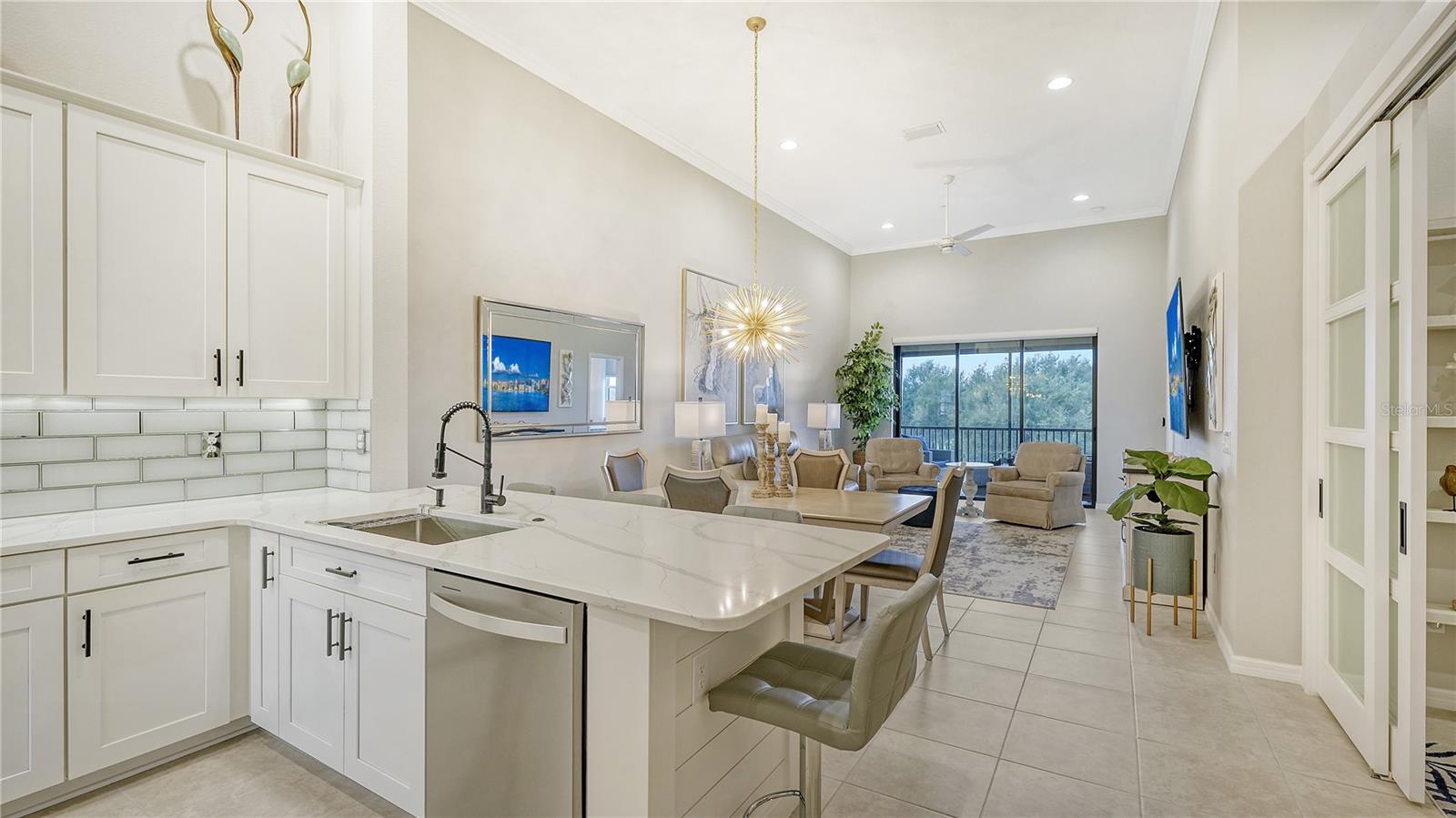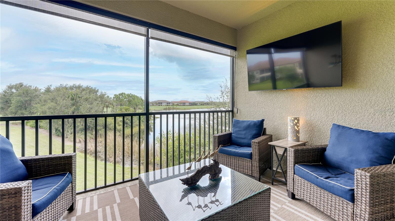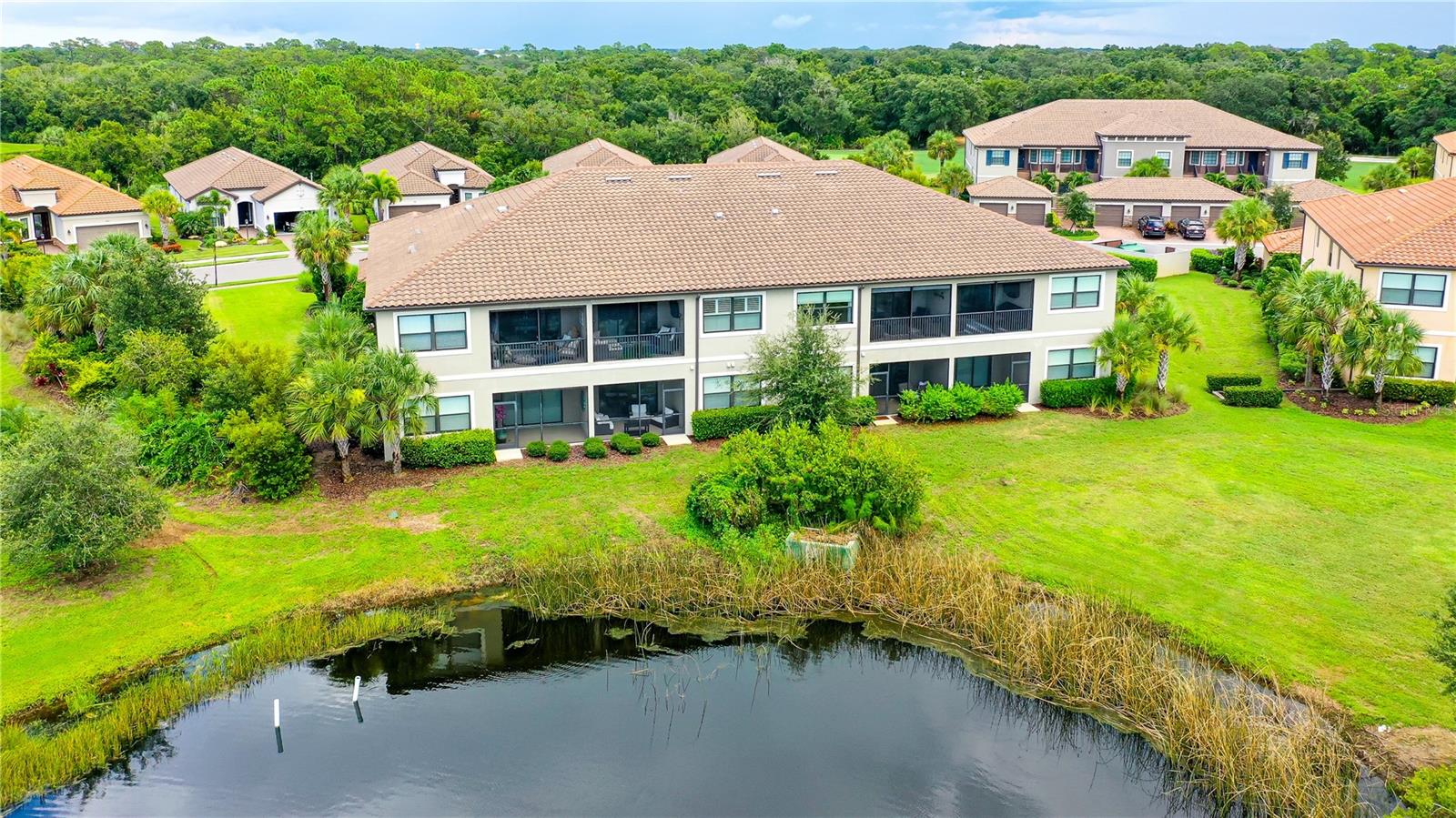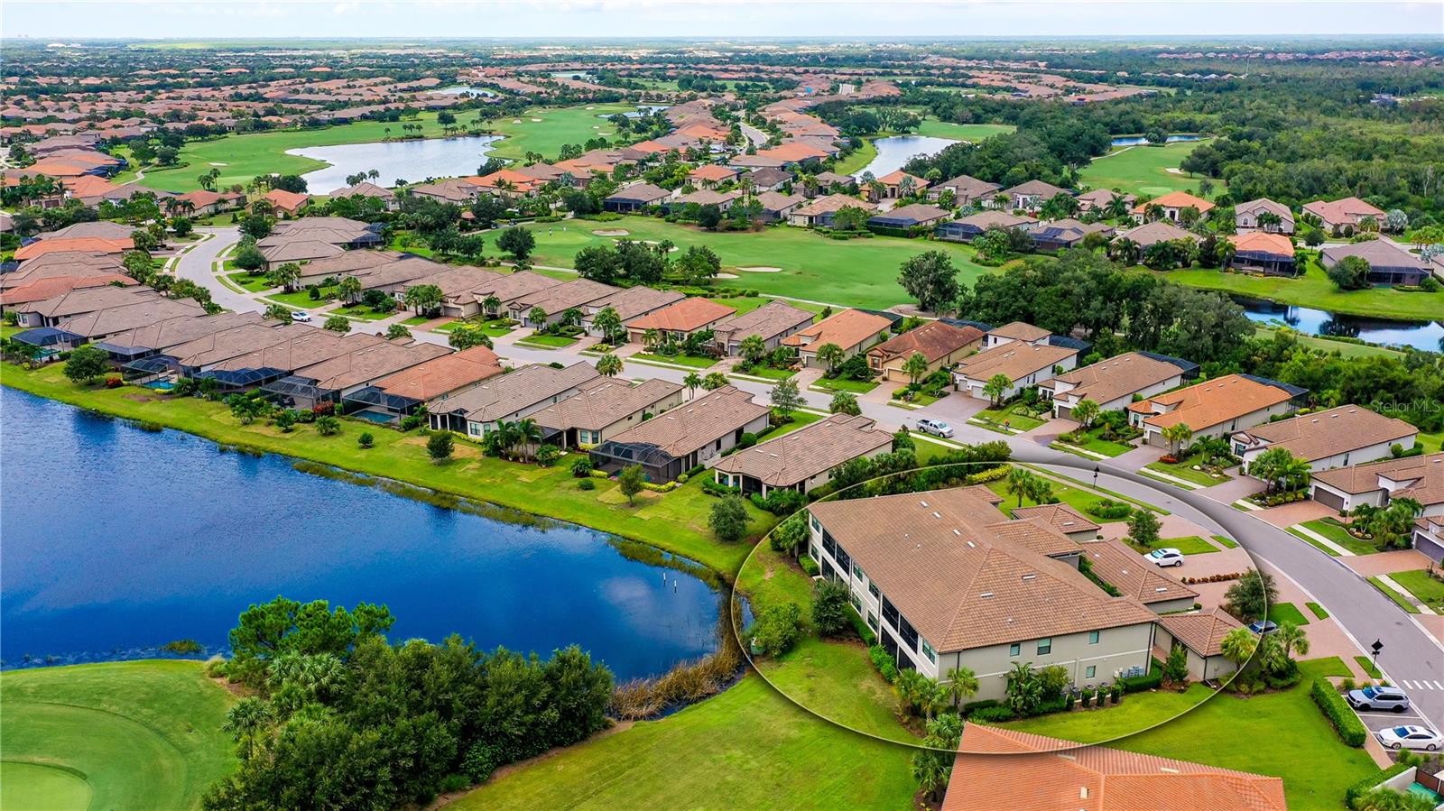 FULLY RENOVATED & FULL GOLF MEMBERSHIP to Esplanade Golf & Country Club in Lakewood Ranch is INCLUDED. Welcome to your dream home in the resort-style community of Esplanade at Lakewood Ranch, a 24-hour guard-gated community where picturesque sidewalks wind through scenic landscapes. This stunning, golf-deeded condo comes with a golf membership and is one of only eight units per building, ensuring peace and tranquility with serene water views. Built in 2020 by Taylor Morrison Homes, this home has been completely renovated throughout featuring upgraded finishes and showcases a paver stone extended length driveway with a beautiful Spanish barrel tile roof. Offering over 1,500 square feet of thoughtfully designed living space, this home includes two bedrooms and two bathrooms with a flex room that offers privacy as an office or additional guest accommodation. Step inside to discover an interior that exudes elegance, with a shiplap entry, 13-foot ceilings, ceramic tile flooring throughout, and an open-concept design. The kitchen is a chef's delight, featuring quartz countertops, under-cabinet lighting, white cabinetry, exquisite glass tile backsplash, and stainless-steel appliances. A second pantry with pull-out shelves offers extra storage, complemented by a cozy eat-in kitchen nook. The living area is elevated by crown molding and fresh paint, while frosted sliding doors provide privacy for the office or flex room. The owner’s suite is a peaceful retreat, complete with stunning views, dual walk-in closets, and a spa-like ensuite bathroom with dual sinks, a seamless glass shower, and a private water closet. A split bedroom floor plan offers privacy, with the guest bedroom conveniently located near the guest bathroom. Relax on the screened-in balcony, taking in lake views, stunning sunsets, and watching golfers on the course. Esplanade is a maintenance-free, resort-style golf cart friendly community brimming with amenities. Grab your clubs and enjoy the championship golf course included with the purchase of the home, a state-of-the-art clubhouse with a wellness and fitness center, Koquina Sand Spa, as well as multiple dining options including the Bahama Bar and Culinary Center and the Barrel House Bar and Bistro. With access to 4 community pools including a lagoon-style heated pool and a resistance pool, tennis courts, pickleball courts, bocce, a dog park, the list goes on, you’ll never want to leave. Conveniently located near A-rated schools, University Town Center Mall, Waterside Place, and Florida's world-famous beaches, this home offers the ultimate in luxury and convenience. Don’t miss your chance to call this extraordinary property your own!