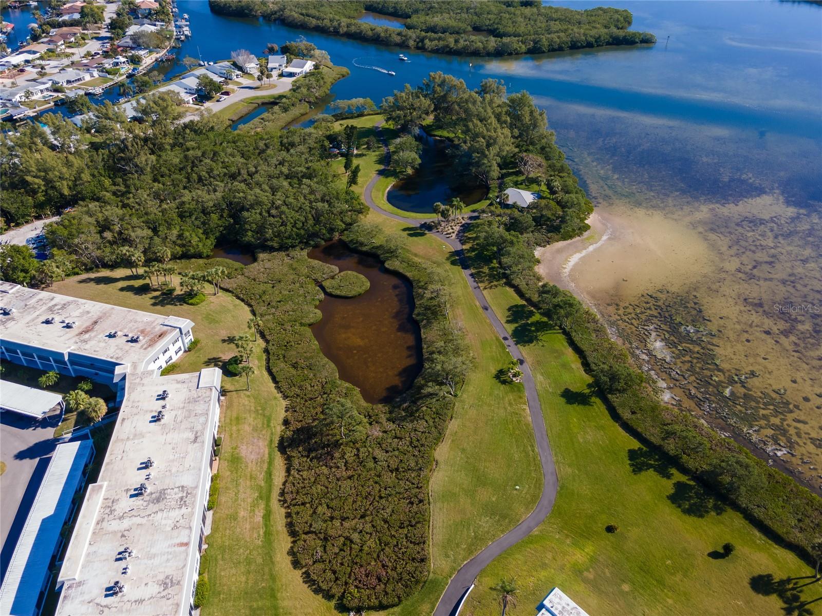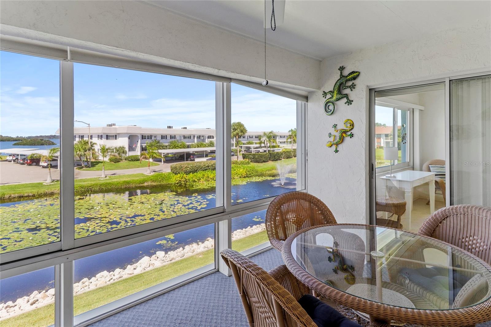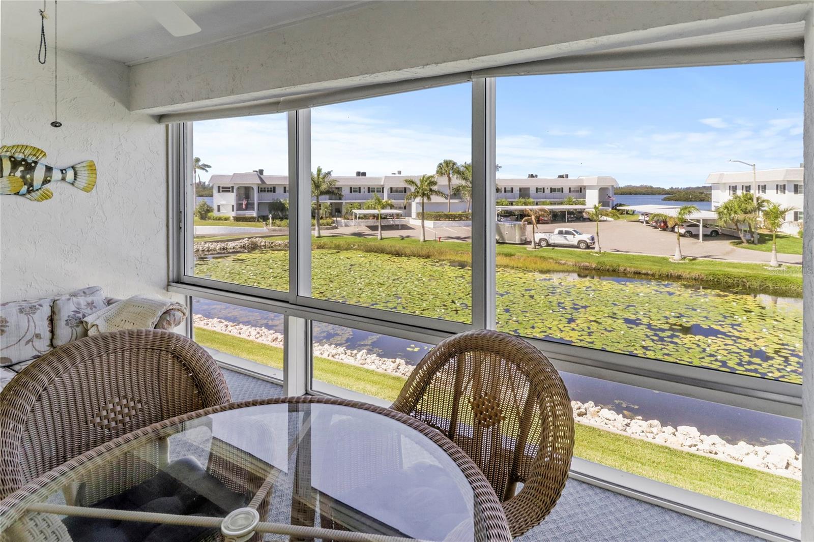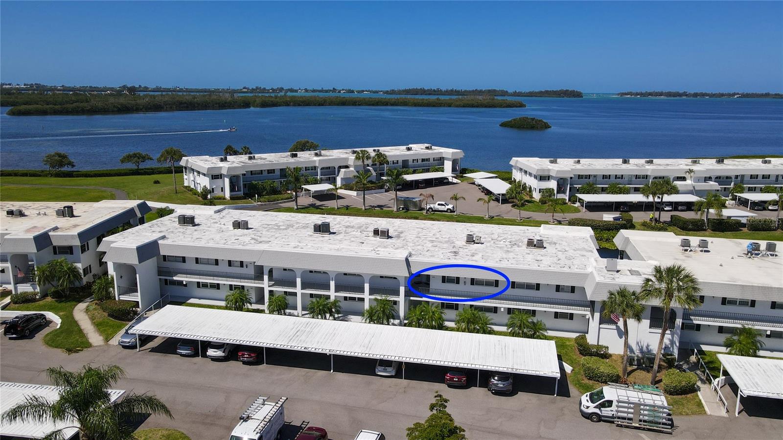 You'll enjoy the view of Sarasota Bay and the tranquil pond from your spacious balcony or from the large picture window in the main bedroom. Primary bedroom has en-suite bathroom and walk-in closet. Open and bright upstairs 2br/2ba condo with full sized washer and dryer in the kitchen. You'll also appreciate the elevator and covered parking! Mount Vernon is an active 55+ community with large clubhouse, tennis and pickle ball courts, heated pool, putting green, and more. Being sold furnished so bring your clothes and move right in then take your time to update to your taste. Kayak included in sale for paddling the tranquil Sarasota Bay.