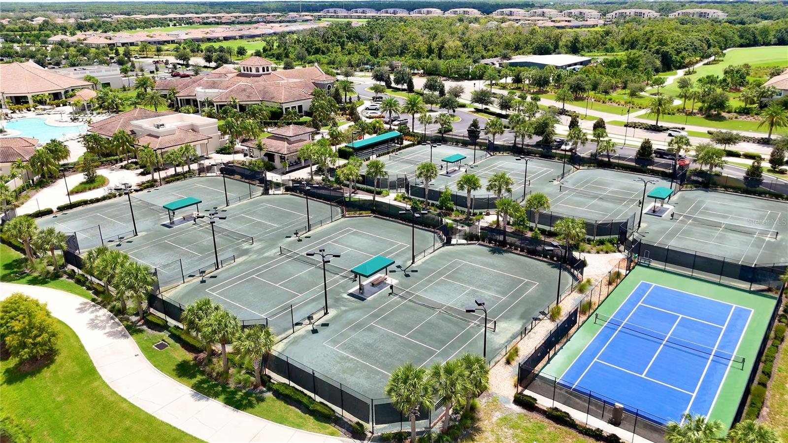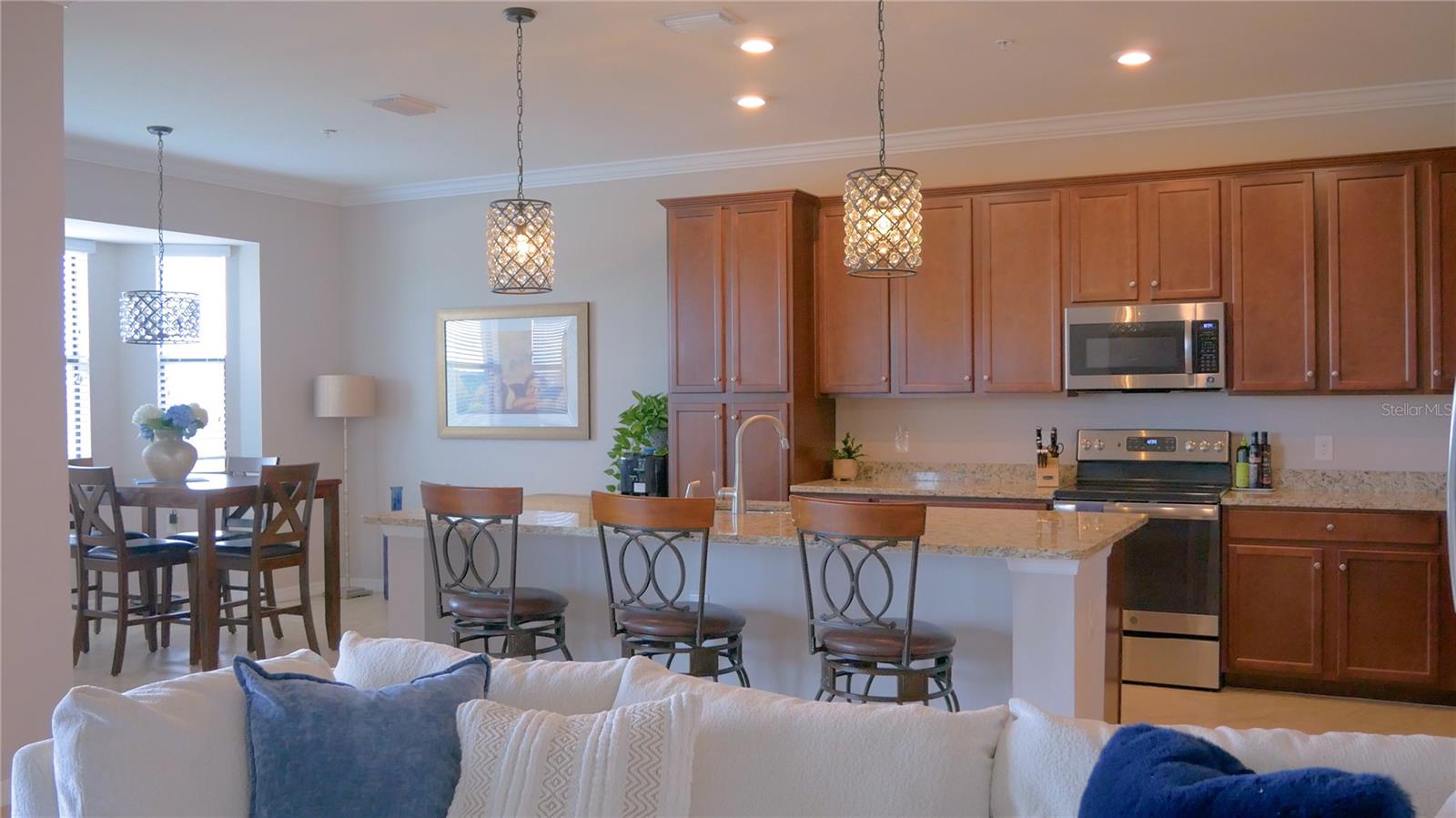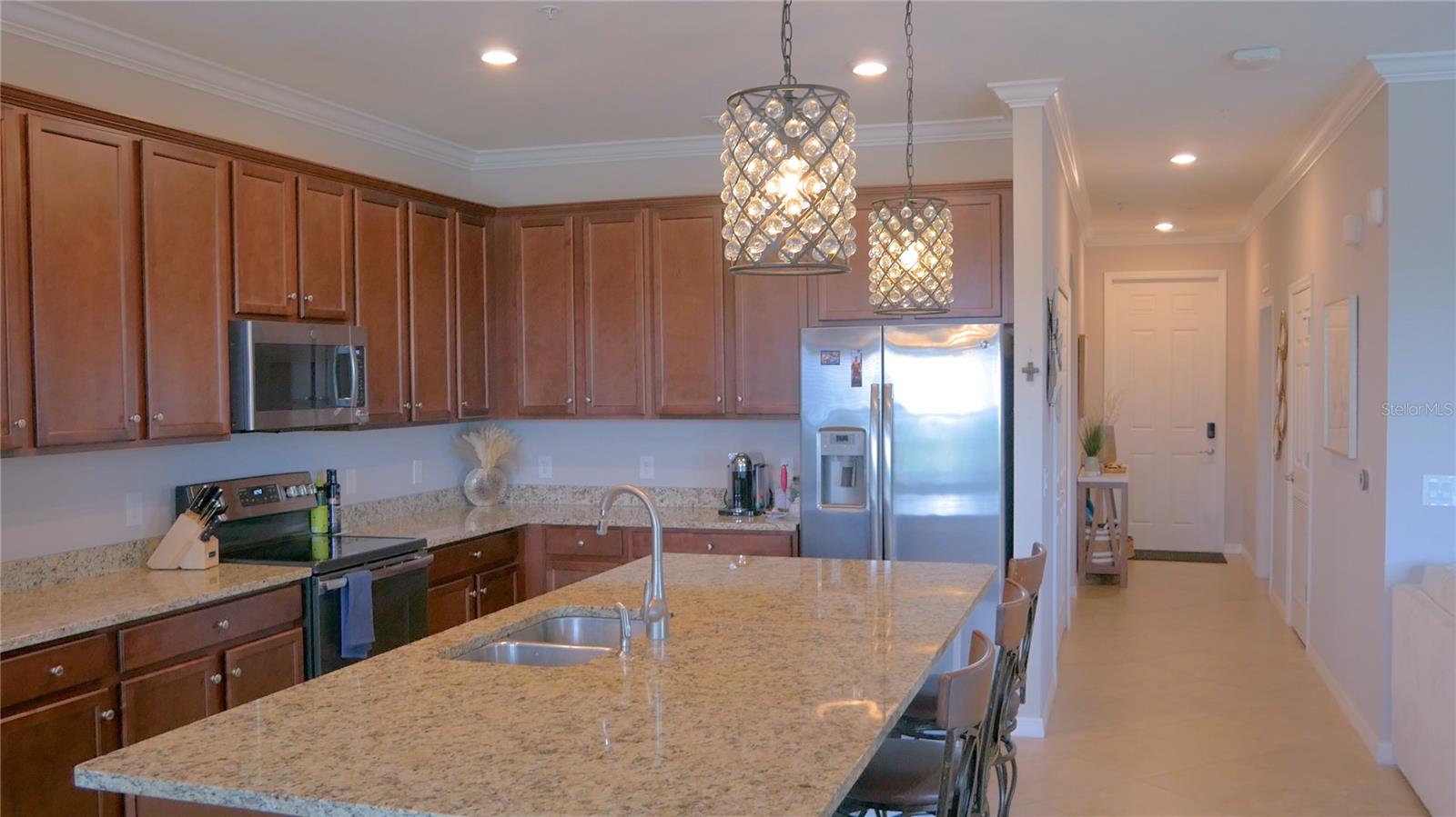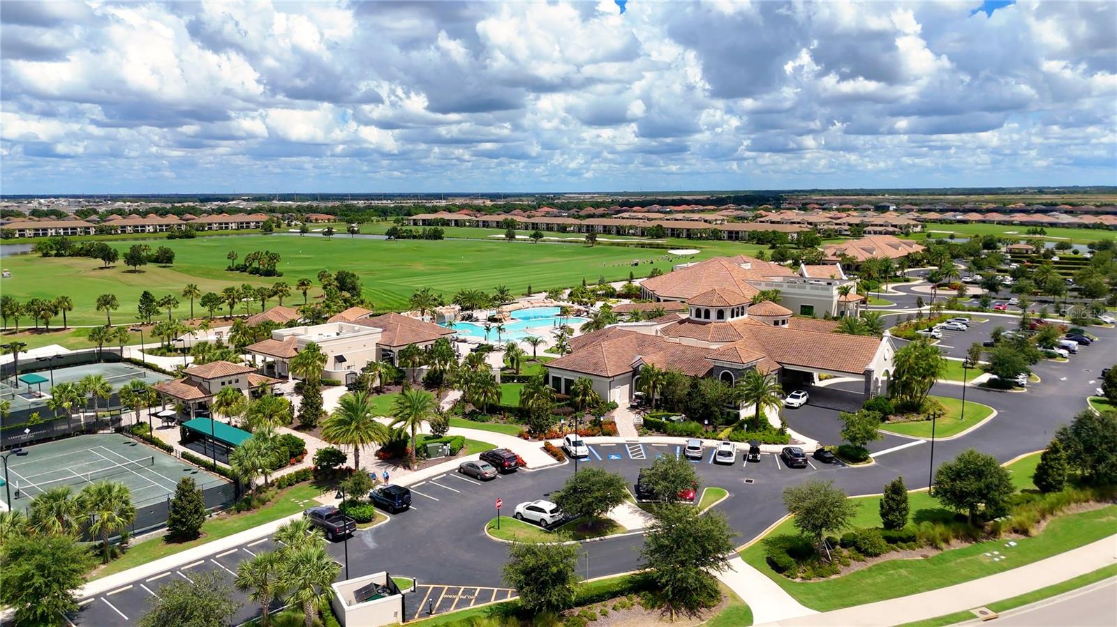 Wake up every day to beautiful golf course and water views from this top floor condominium with a corner screened-in lanai in Lakewood National Golf Club. This luxurious piece of paradise in the #1 Master Planned Community in the United States with unparalleled amenities including a transferrable full golf membership could be yours. This is not only an excellent primary residence but can also be used as an investment/rental property. This exquisite two-bedroom, two-bathroom condo located on the 4th floor features an open concept kitchen and living area with large ceramic tile throughout. An over-sized island with granite countertops and seating for five is the focal point and boasts a chef’s kitchen with 42” solid wood cabinets, ample storage and stainless-steel appliances. The well-appointed living room has high ceilings that provide a feeling of space that extends onto the lanai where the views are breathtaking. A cozy dining area provides the perfect nook for morning coffees and family dinners. Plantation shutters provide extra privacy for both bedrooms. The primary bedroom has an ensuite bathroom with a large shower and walk in closets with built-ins. The second bedroom is spacious and just steps from the second bathroom with a full-size tub. Extra storage throughout the unit is complimented by a large (6x10) storage unit just outside the entrance. Two assigned parking spots including one covered are just outside the elevator. But you aren’t going to spend much time inside this incredible home because the amenities are endless. Two Arnold Palmer designed golf courses, four pickle ball courts, eight clay lighted tennis courts, and two bocce ball courts will fill your days with recreation. Then it’s time to relax at the tiki bar and resort style pool or unwind in the onsite spa. After a full day of fun, join your friends and neighbors at the beautiful Grand Clubhouse for dinner! Exclusivity is ensured with the twenty-four-hour security gate entrance. Lakewood National is only 35 minutes to the award-winning Gulf Coast beaches. Shopping and dining are close by at University Town Center and Lakewood Ranch Mainstreet. This amazing condo is not just a place to live, it's a lifestyle!