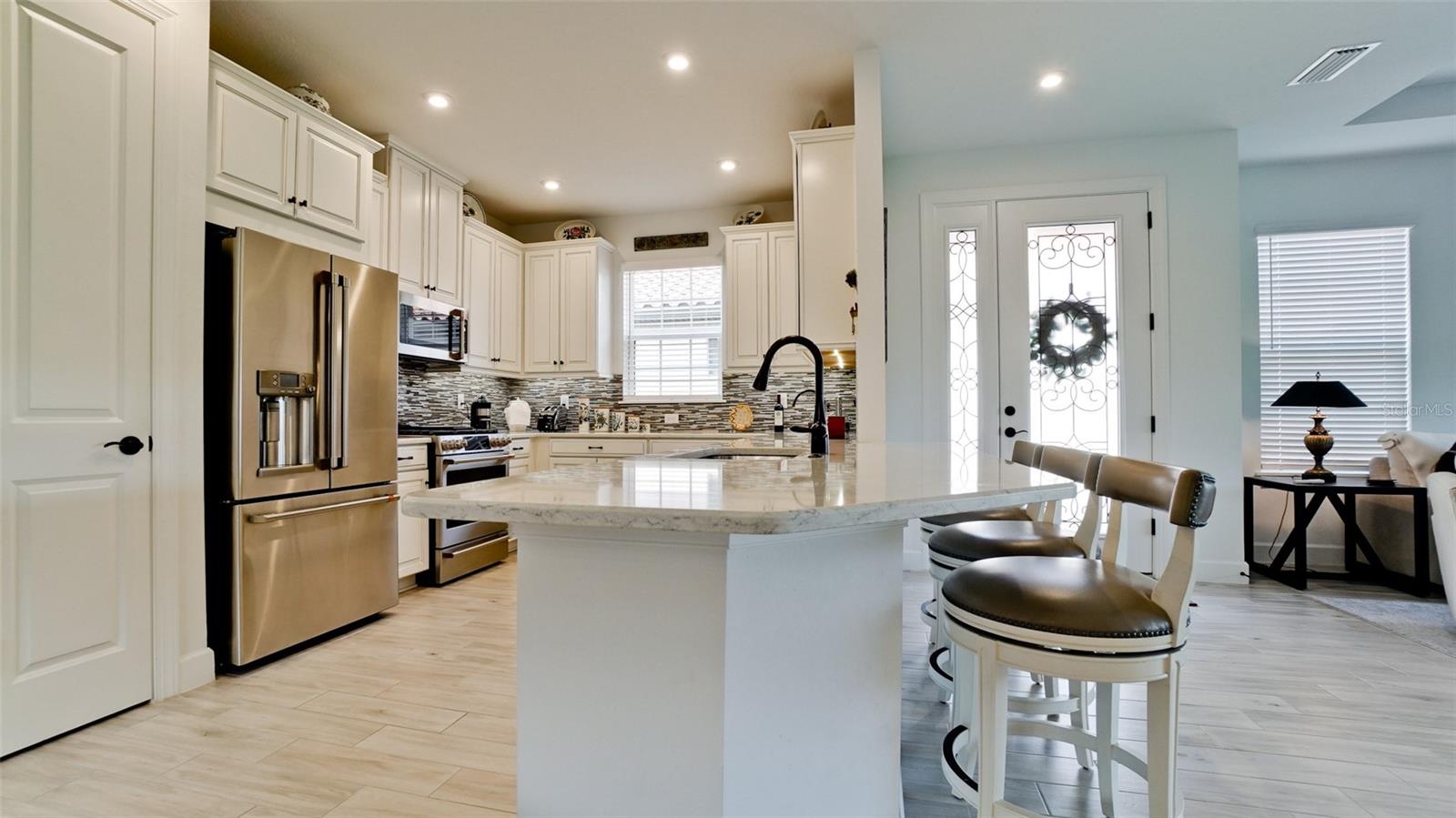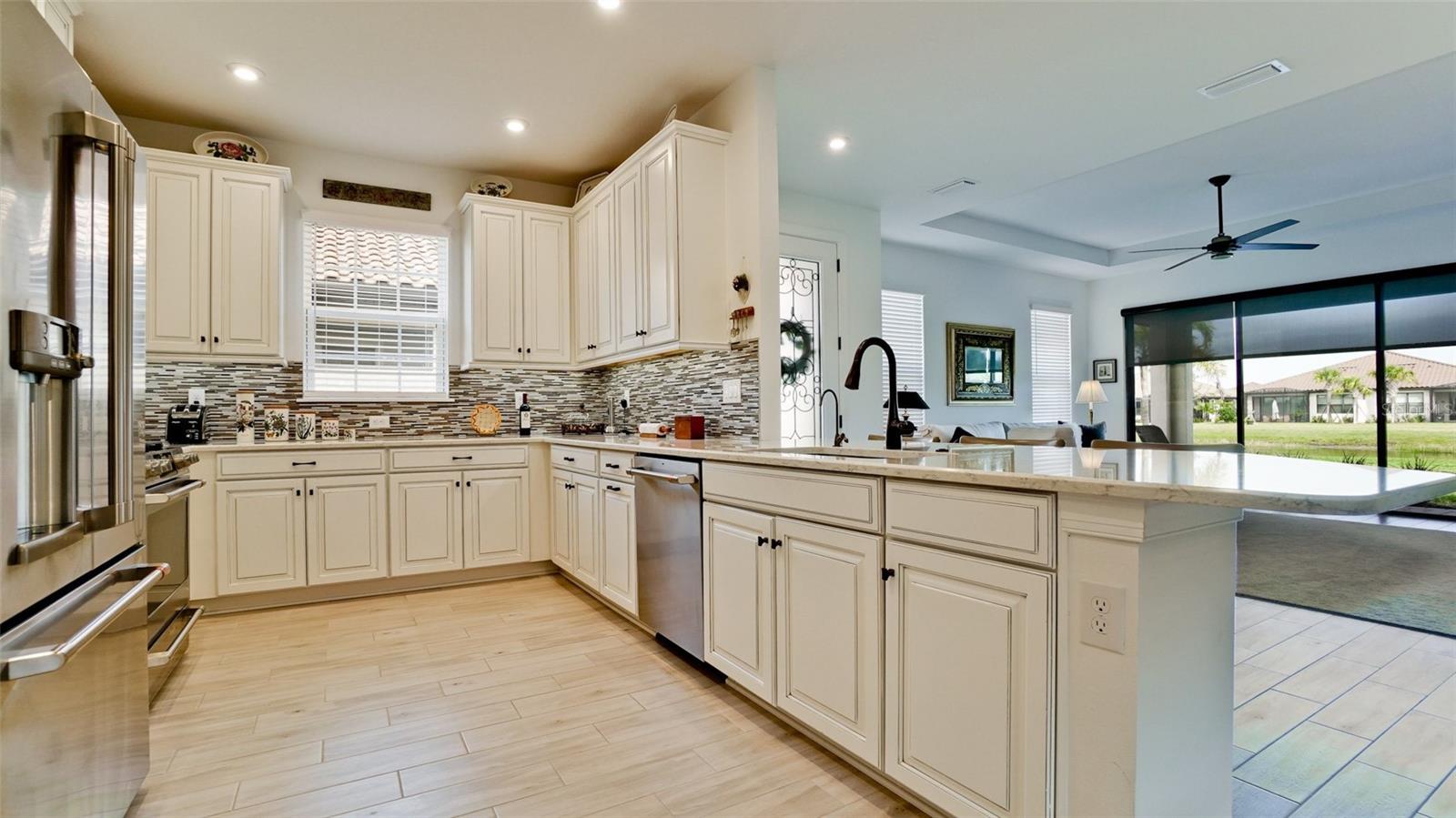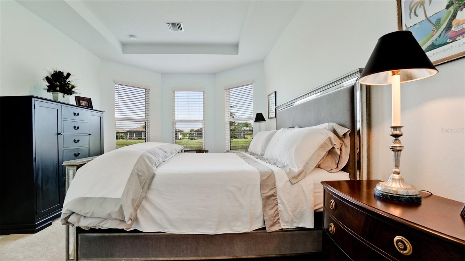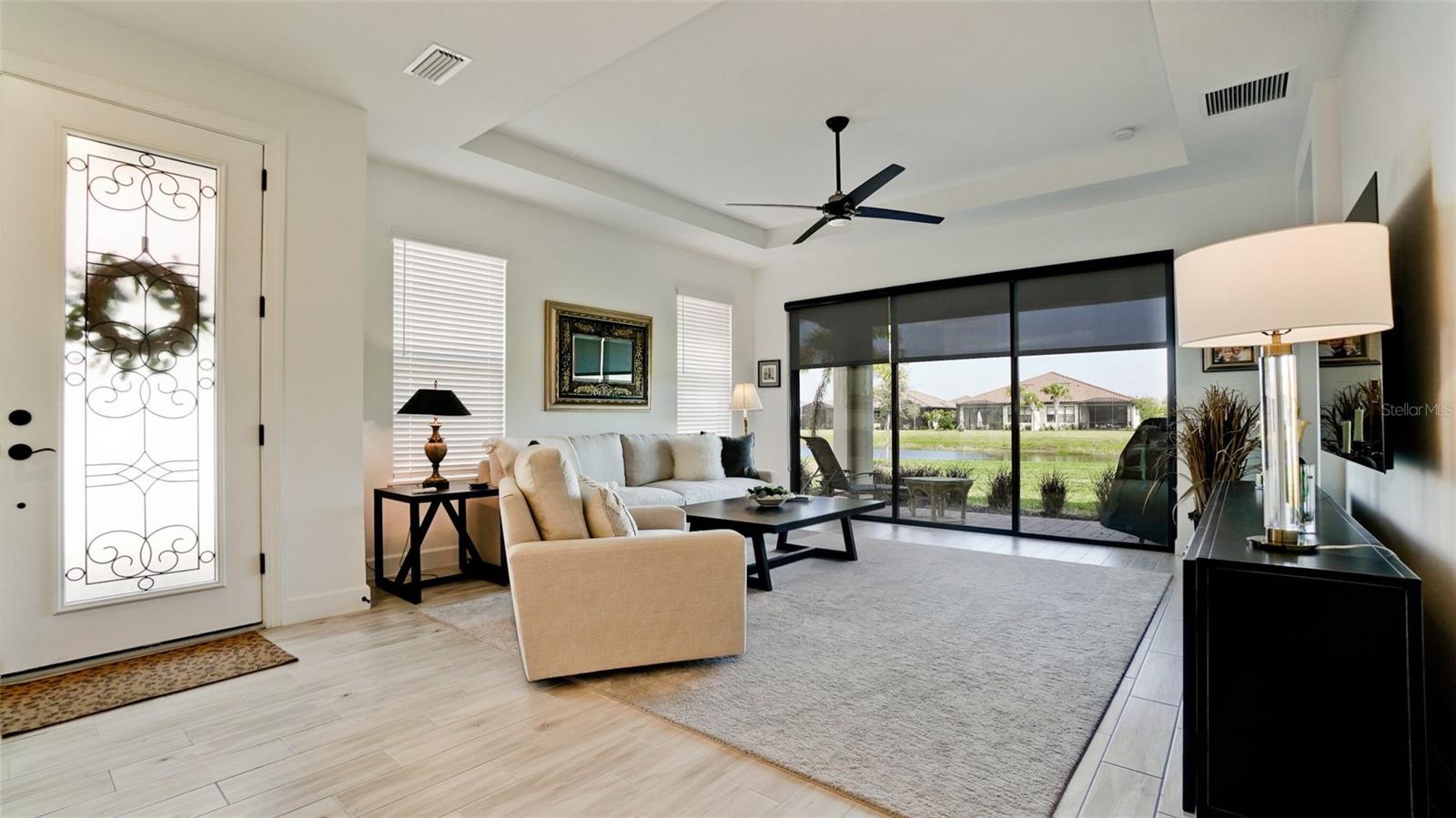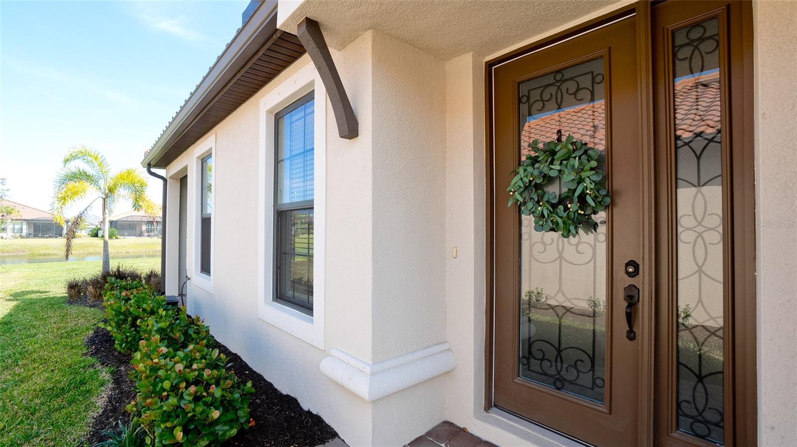 Single family villa w/ water views, on a cul-de-sac, DEEDED GOLF. Front door is iron inlay. 10’ ceilings and 8’ doors, open concept living with tray ceiling package. Three panel glass sliders appointed with privacy shades leads to the enclosed lanai prepped for an outdoor kitchen. Ceramic plank floors throughout. Upgraded SS GE Café appliances, microwave with convection option, center griddle gas range. Quartz counters are complemented with glass stacked tile backsplash and under cabinet lighting. Primary suite w bay providing additional square footage The ensuite with double sinks and center vanity triple upgrade includes frameless glass shower and pebble stone shower floor. This floorplan offers the guest bedroom with second bath access on the opposite side of the home. Walk in closets. French doors lead to the study/flex room. Also, this hallway leads to the 2-car garage and laundry/mud room fully equipped with like new washer and dryer. Exterior upgrades include epoxy 2 car garage floor, radiant barrier in attic, professional landscaping, and cement barrel tile roof. Upgrades: bronze designer finishes, fixtures and lighting, blinds throughout. Amenities: Resort Heated Pool & Spa, Bahama Grille/Bar, 18-Hole Golf Course, Driving Range, Lighted Pickle Ball and Tennis Courts, Bocce Courts, Activity Center w/ Fitness Center, Luxurious Wellness Center, Hair Salon, Coffee Café, 15,000 square foot Culinary Center with fine dining and Italian eatery w pizza station.
