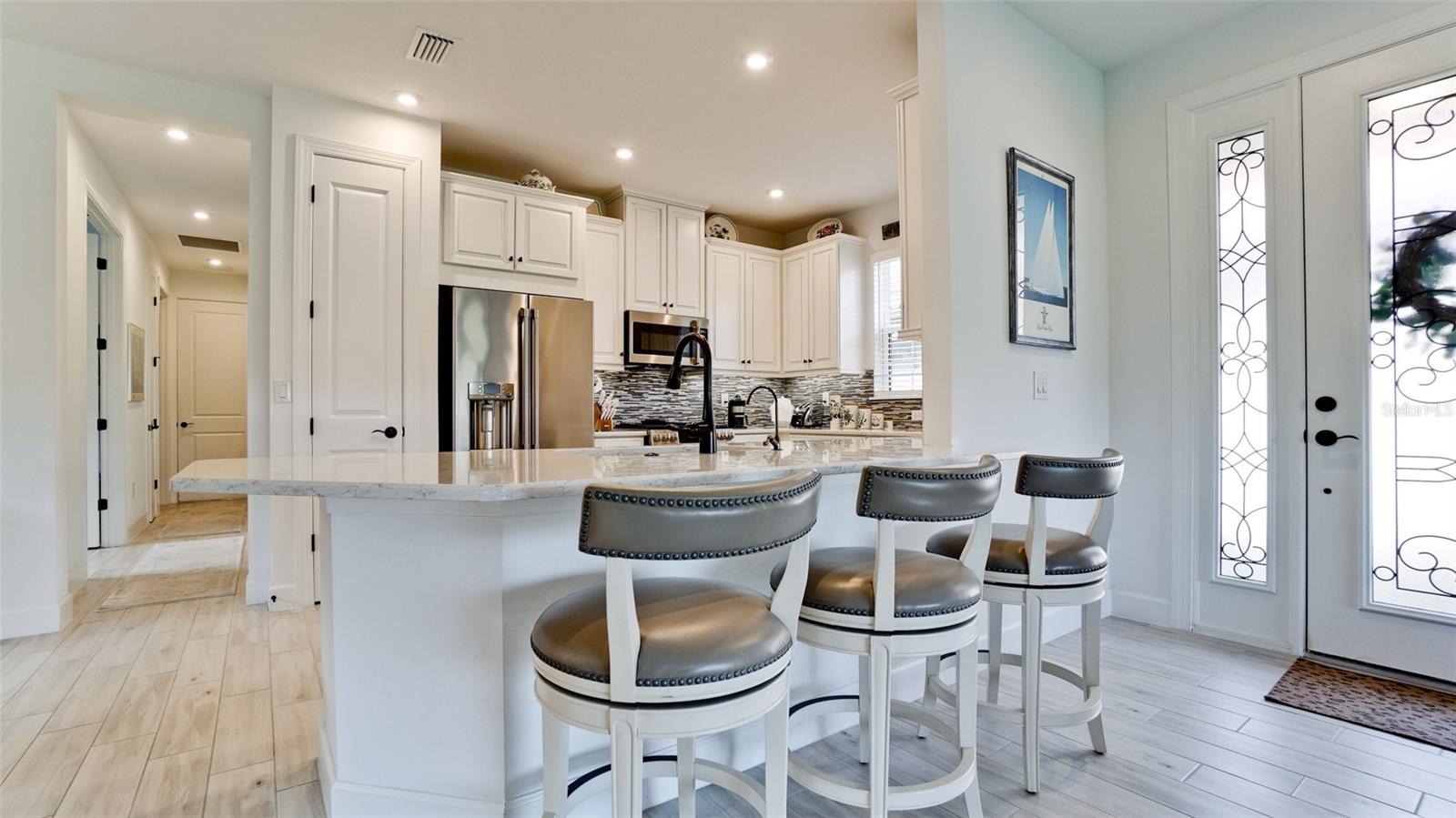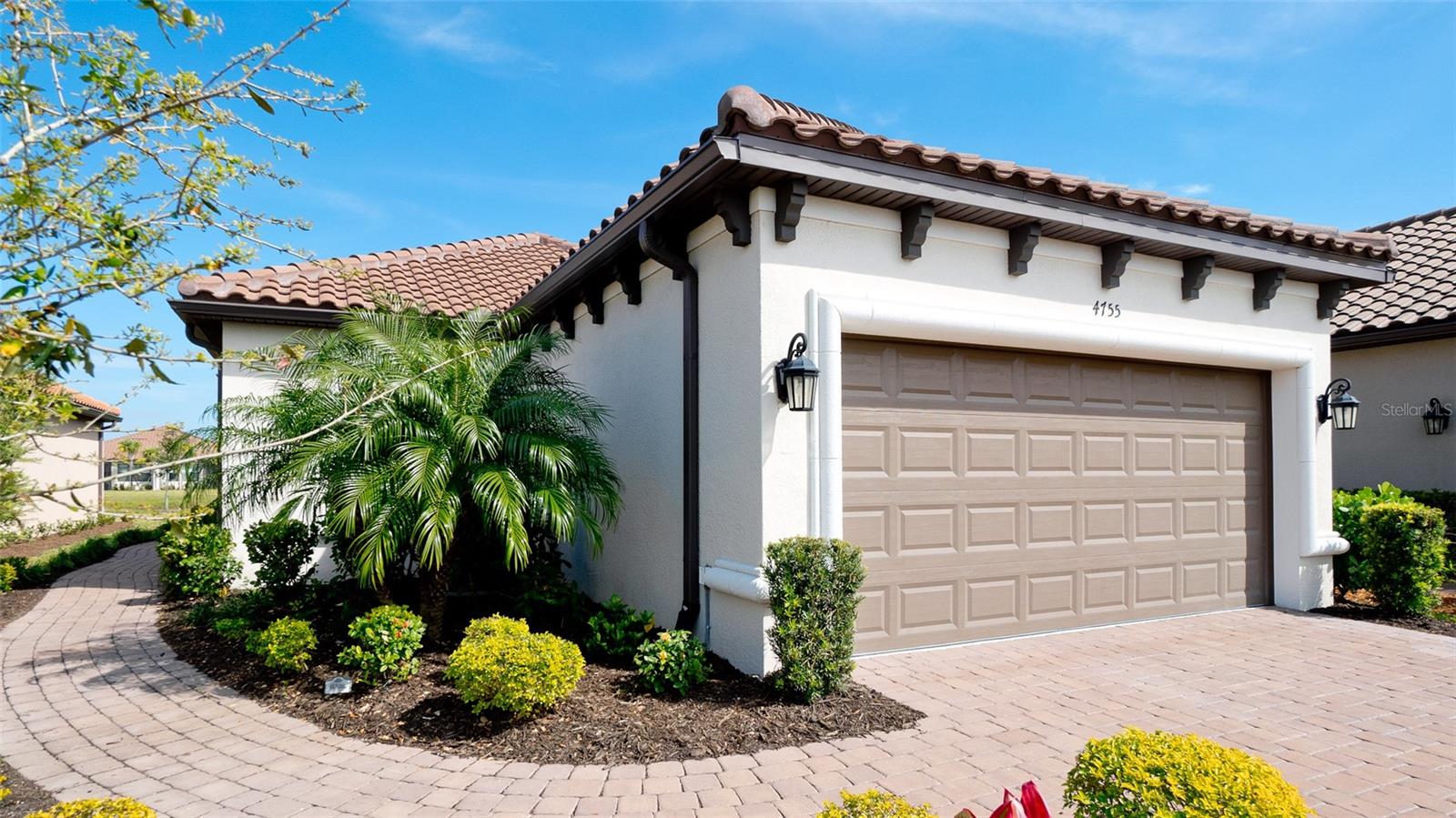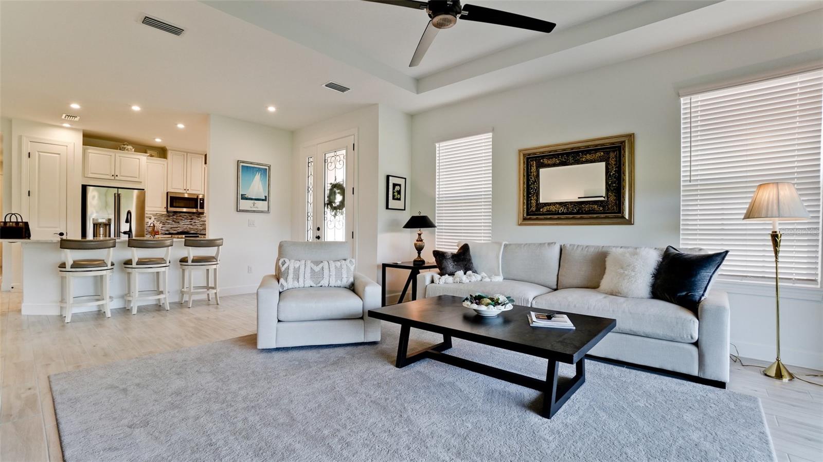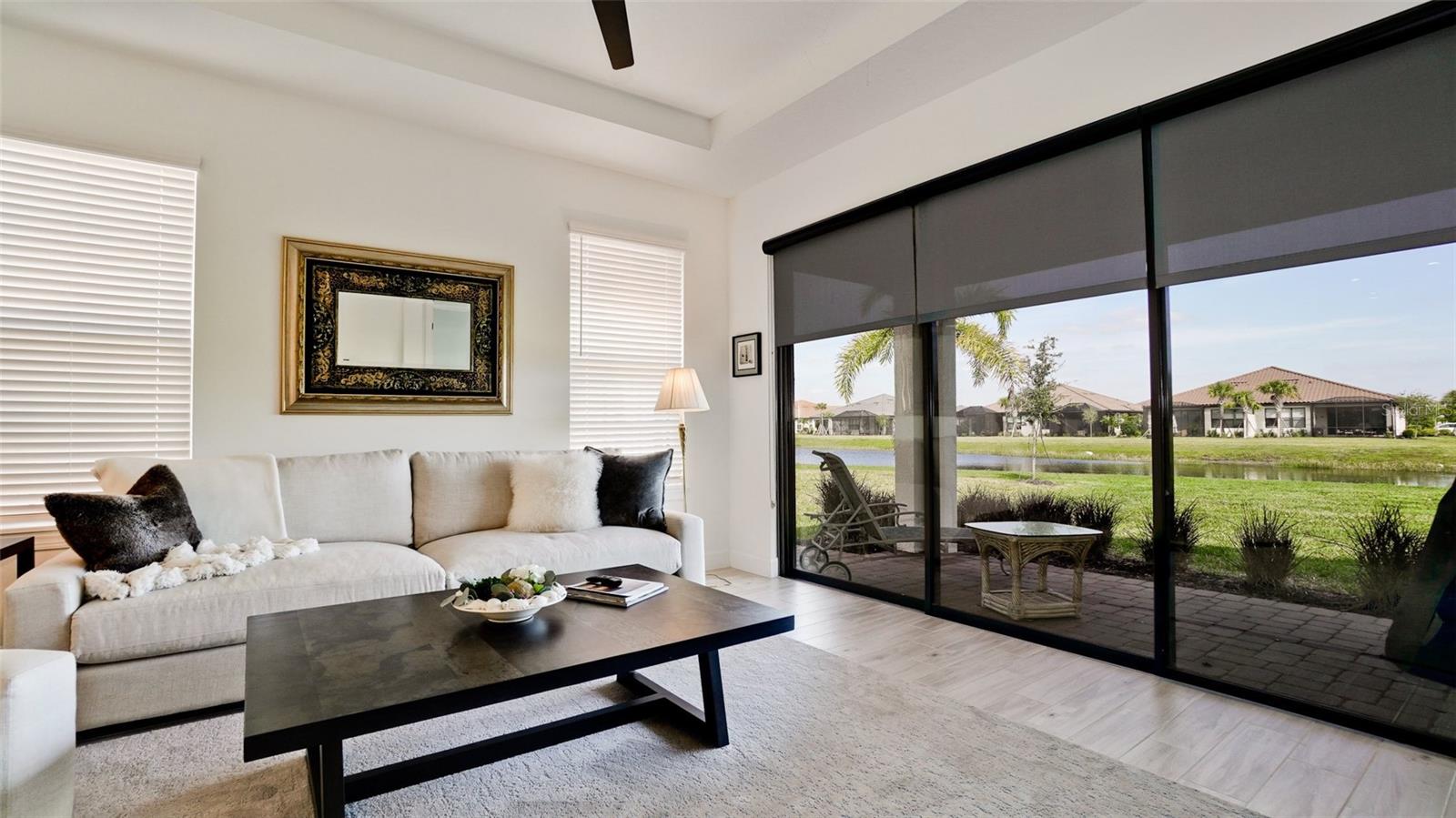 Single family villa w/ water views, on a cul-de-sac, DEEDED GOLF. Front door is iron inlay. 10’ ceilings and 8’ doors, open concept living with tray ceiling package. Three panel glass sliders appointed with privacy shades leads to the enclosed lanai prepped for an outdoor kitchen. Ceramic plank floors throughout. Upgraded SS GE Café appliances, microwave with convection option, center griddle gas range. Quartz counters are complemented with glass stacked tile backsplash and under cabinet lighting. Primary suite w bay providing additional square footage The ensuite with double sinks and center vanity triple upgrade includes frameless glass shower and pebble stone shower floor. This floorplan offers the guest bedroom with second bath access on the opposite side of the home. Walk in closets. French doors lead to the study/flex room. Also, this hallway leads to the 2-car garage and laundry/mud room fully equipped with like new washer and dryer. Exterior upgrades include epoxy 2 car garage floor, radiant barrier in attic, professional landscaping, and cement barrel tile roof. Upgrades: bronze designer finishes, fixtures and lighting, blinds throughout. Amenities: Resort Heated Pool & Spa, Bahama Grille/Bar, 18-Hole Golf Course, Driving Range, Lighted Pickle Ball and Tennis Courts, Bocce Courts, Activity Center w/ Fitness Center, Luxurious Wellness Center, Hair Salon, Coffee Café, 15,000 square foot Culinary Center with fine dining and Italian eatery w pizza station.