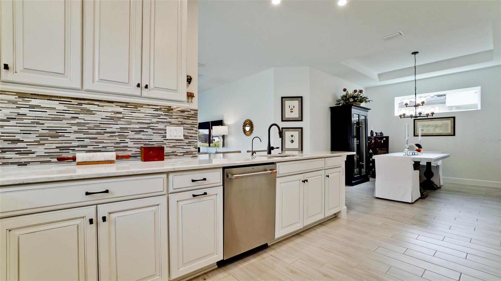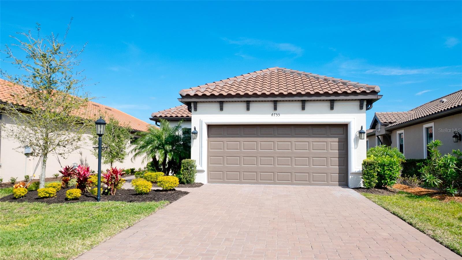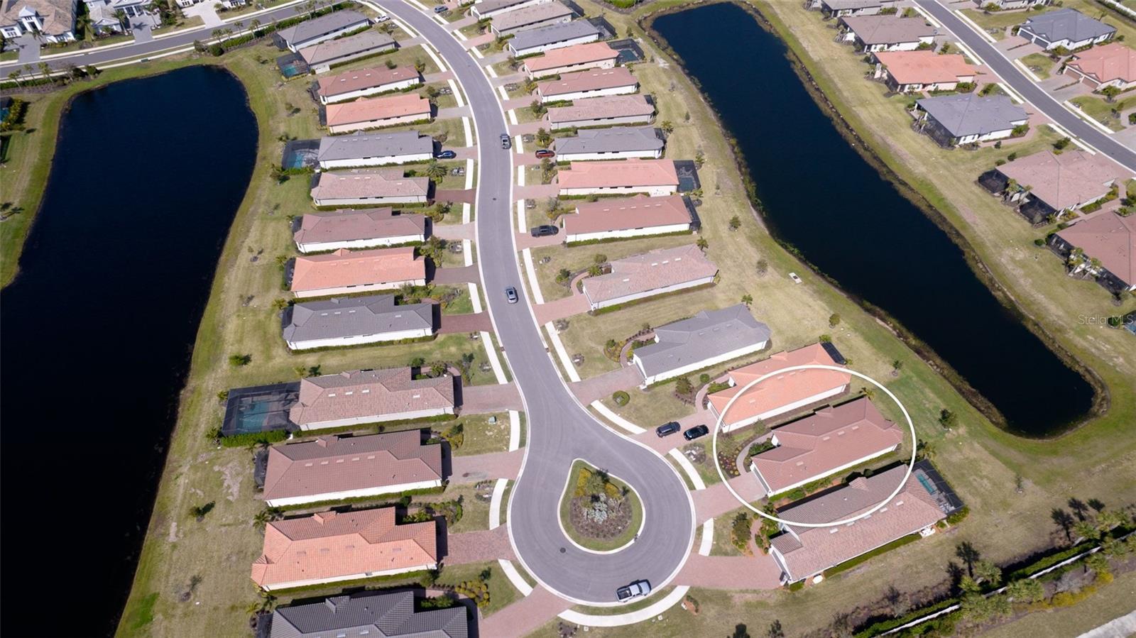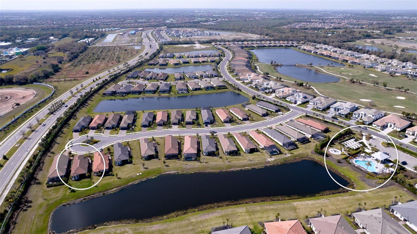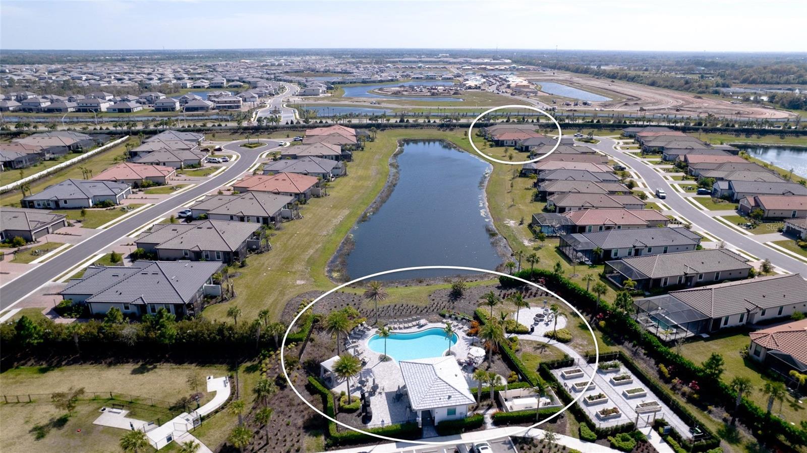 Single family villa w/ water views, on a cul-de-sac, DEEDED GOLF. Front door is iron inlay. 10’ ceilings and 8’ doors, open concept living with tray ceiling package. Three panel glass sliders appointed with privacy shades leads to the enclosed lanai prepped for an outdoor kitchen. Ceramic plank floors throughout. Upgraded SS GE Café appliances, microwave with convection option, center griddle gas range. Quartz counters are complemented with glass stacked tile backsplash and under cabinet lighting. Primary suite w bay providing additional square footage The ensuite with double sinks and center vanity triple upgrade includes frameless glass shower and pebble stone shower floor. This floorplan offers the guest bedroom with second bath access on the opposite side of the home. Walk in closets. French doors lead to the study/flex room. Also, this hallway leads to the 2-car garage and laundry/mud room fully equipped with like new washer and dryer. Exterior upgrades include epoxy 2 car garage floor, radiant barrier in attic, professional landscaping, and cement barrel tile roof. Upgrades: bronze designer finishes, fixtures and lighting, blinds throughout. Amenities: Resort Heated Pool & Spa, Bahama Grille/Bar, 18-Hole Golf Course, Driving Range, Lighted Pickle Ball and Tennis Courts, Bocce Courts, Activity Center w/ Fitness Center, Luxurious Wellness Center, Hair Salon, Coffee Café, 15,000 square foot Culinary Center with fine dining and Italian eatery w pizza station.