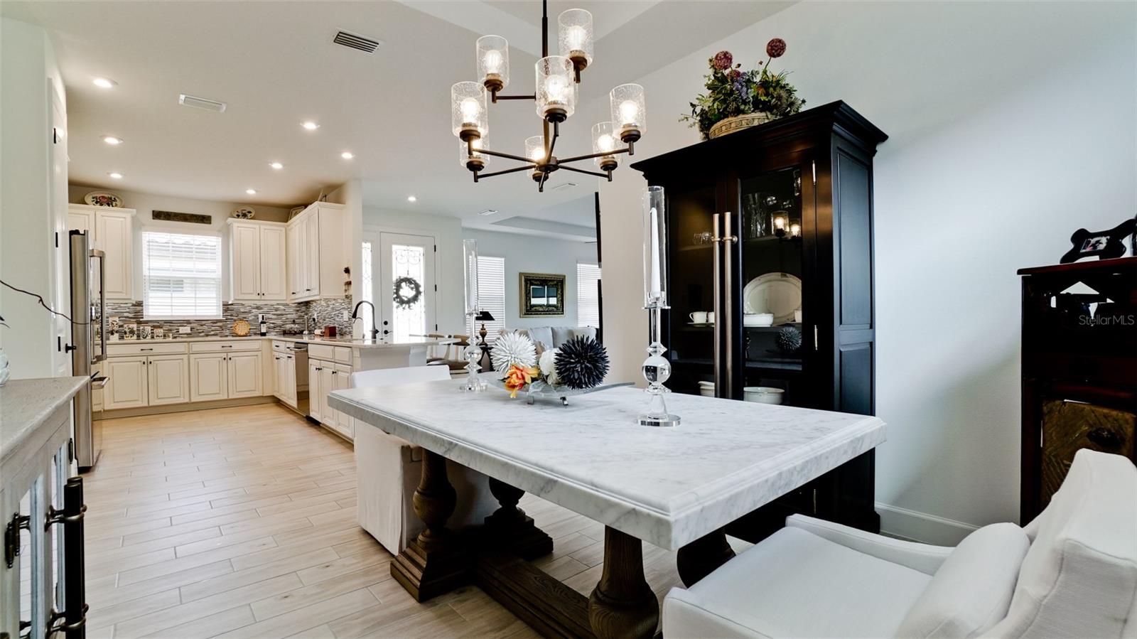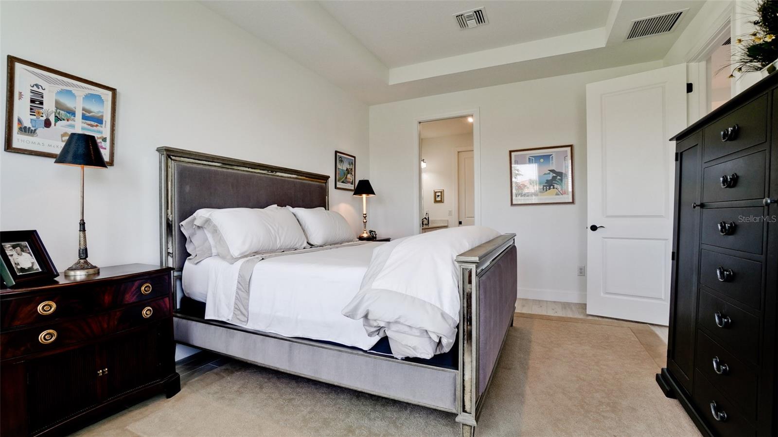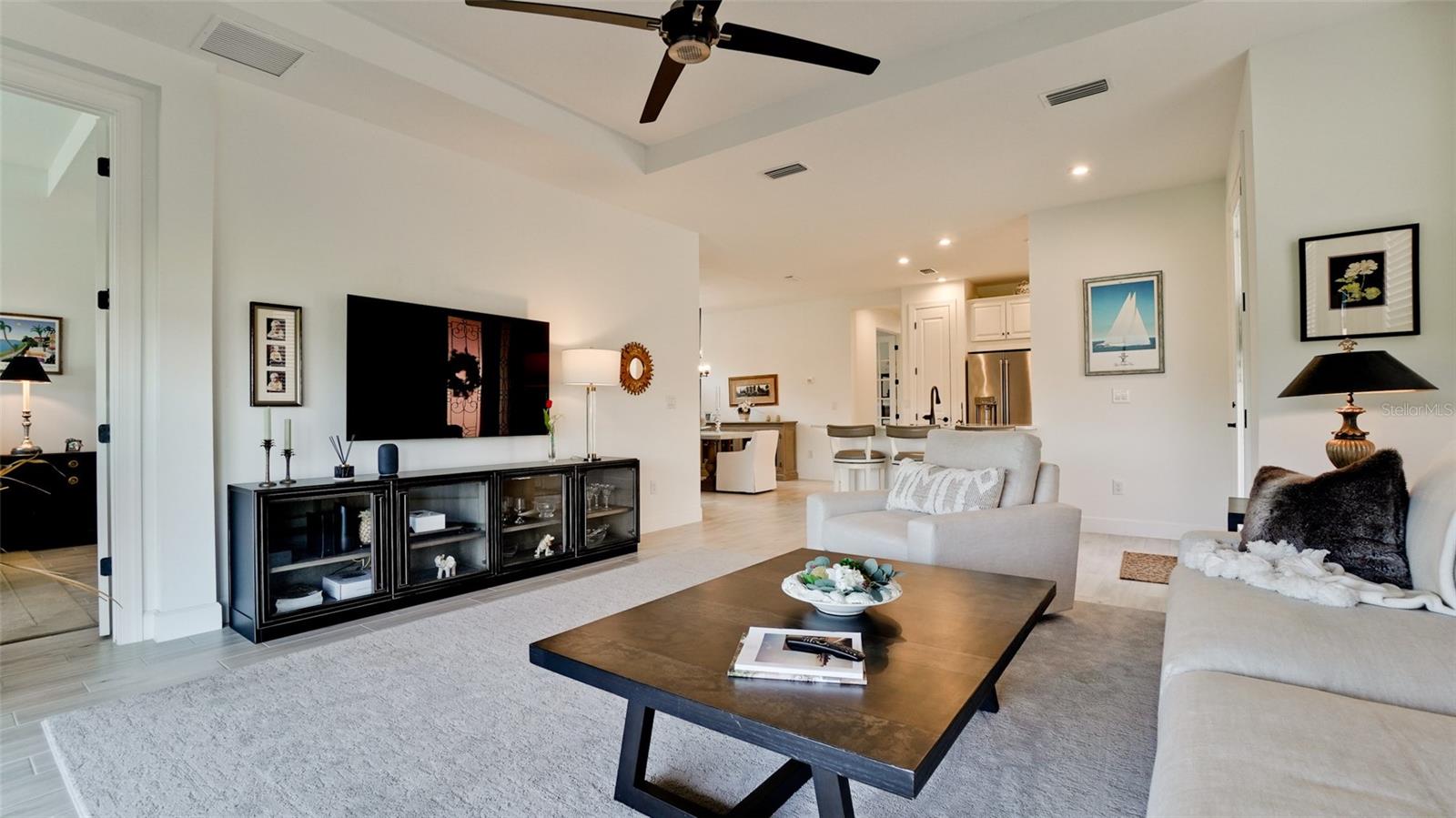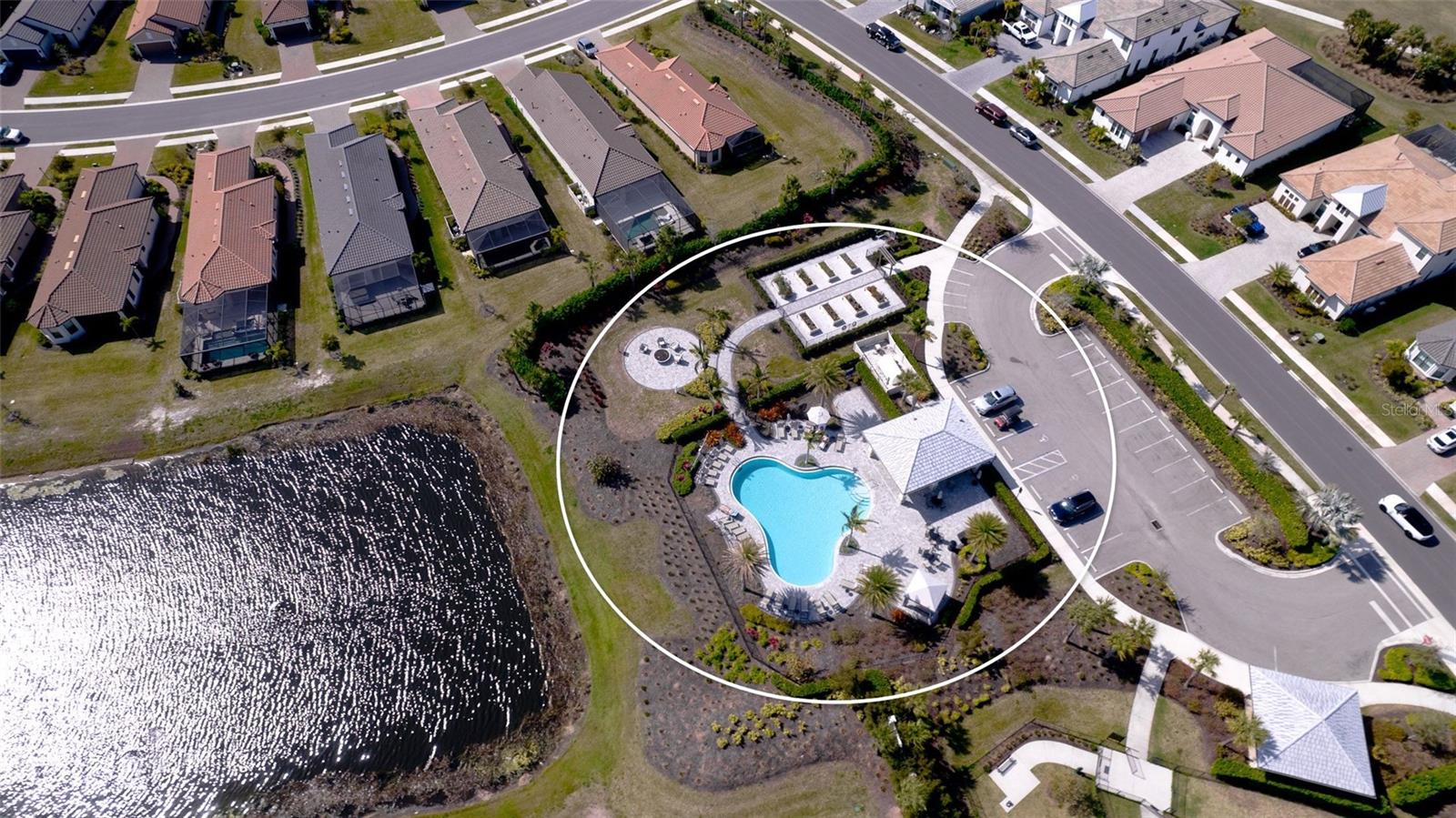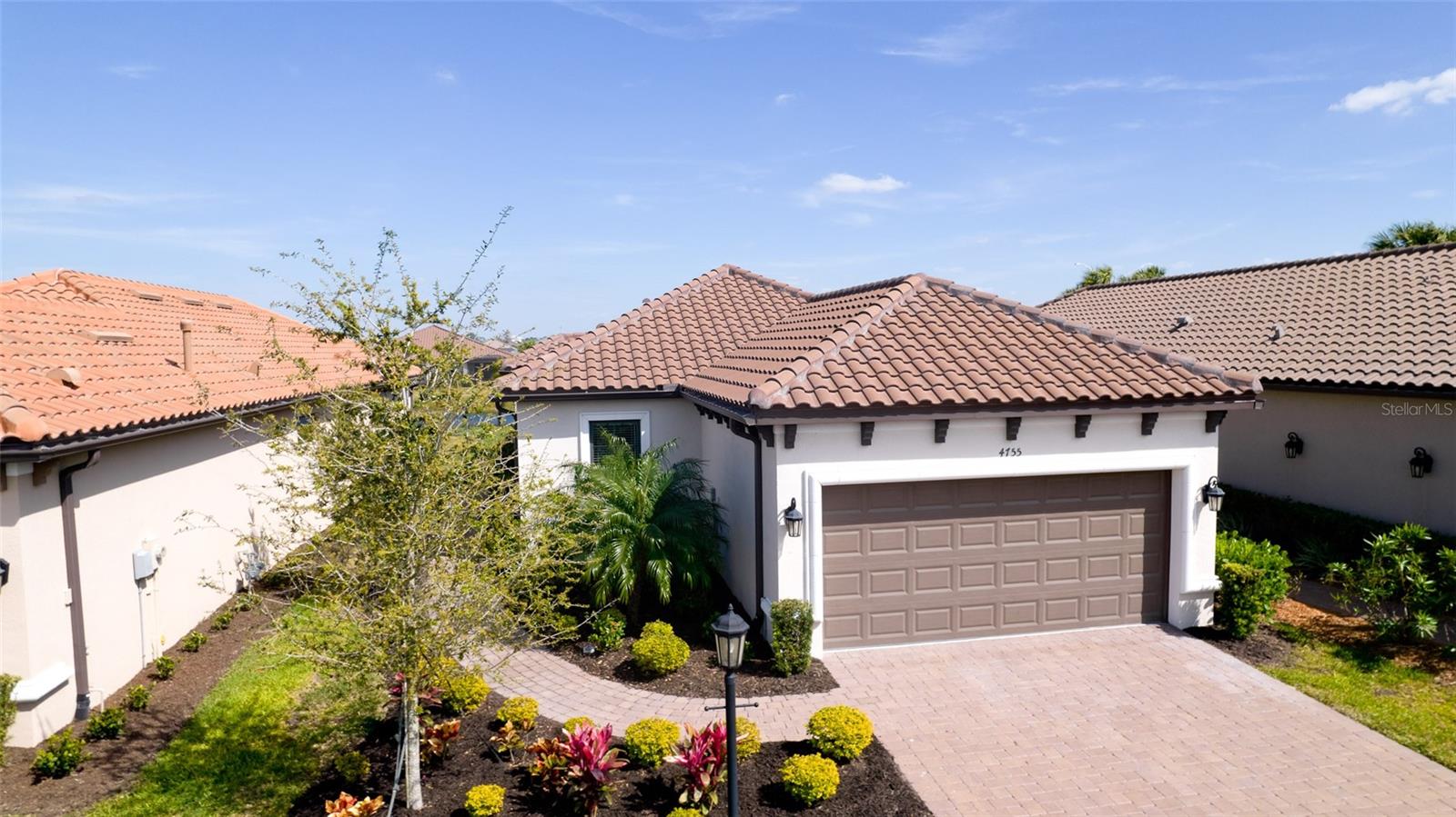 Single family villa w/ water views, on a cul-de-sac, DEEDED GOLF. Front door is iron inlay. 10’ ceilings and 8’ doors, open concept living with tray ceiling package. Three panel glass sliders appointed with privacy shades leads to the enclosed lanai prepped for an outdoor kitchen. Ceramic plank floors throughout. Upgraded SS GE Café appliances, microwave with convection option, center griddle gas range. Quartz counters are complemented with glass stacked tile backsplash and under cabinet lighting. Primary suite w bay providing additional square footage The ensuite with double sinks and center vanity triple upgrade includes frameless glass shower and pebble stone shower floor. This floorplan offers the guest bedroom with second bath access on the opposite side of the home. Walk in closets. French doors lead to the study/flex room. Also, this hallway leads to the 2-car garage and laundry/mud room fully equipped with like new washer and dryer. Exterior upgrades include epoxy 2 car garage floor, radiant barrier in attic, professional landscaping, and cement barrel tile roof. Upgrades: bronze designer finishes, fixtures and lighting, blinds throughout. Amenities: Resort Heated Pool & Spa, Bahama Grille/Bar, 18-Hole Golf Course, Driving Range, Lighted Pickle Ball and Tennis Courts, Bocce Courts, Activity Center w/ Fitness Center, Luxurious Wellness Center, Hair Salon, Coffee Café, 15,000 square foot Culinary Center with fine dining and Italian eatery w pizza station.