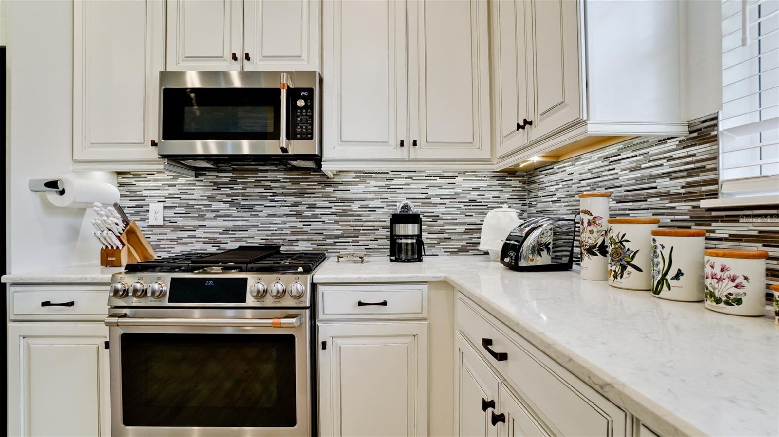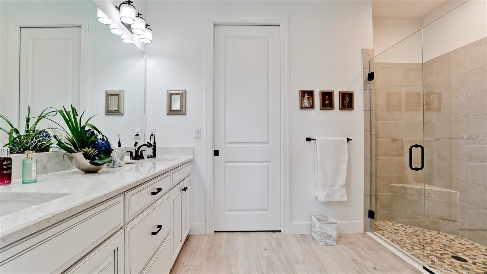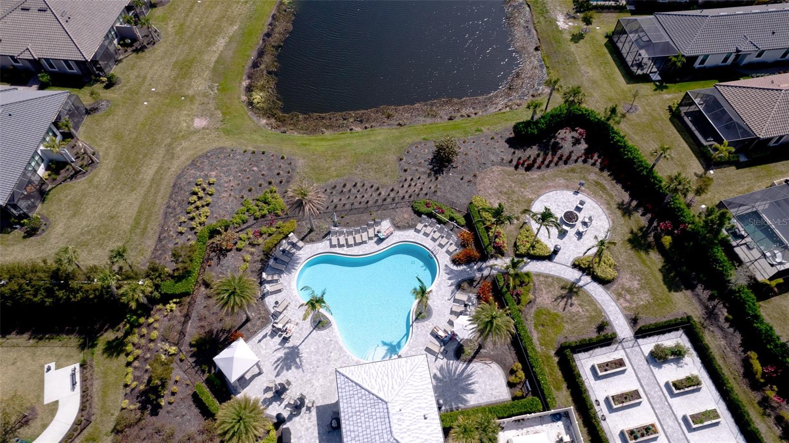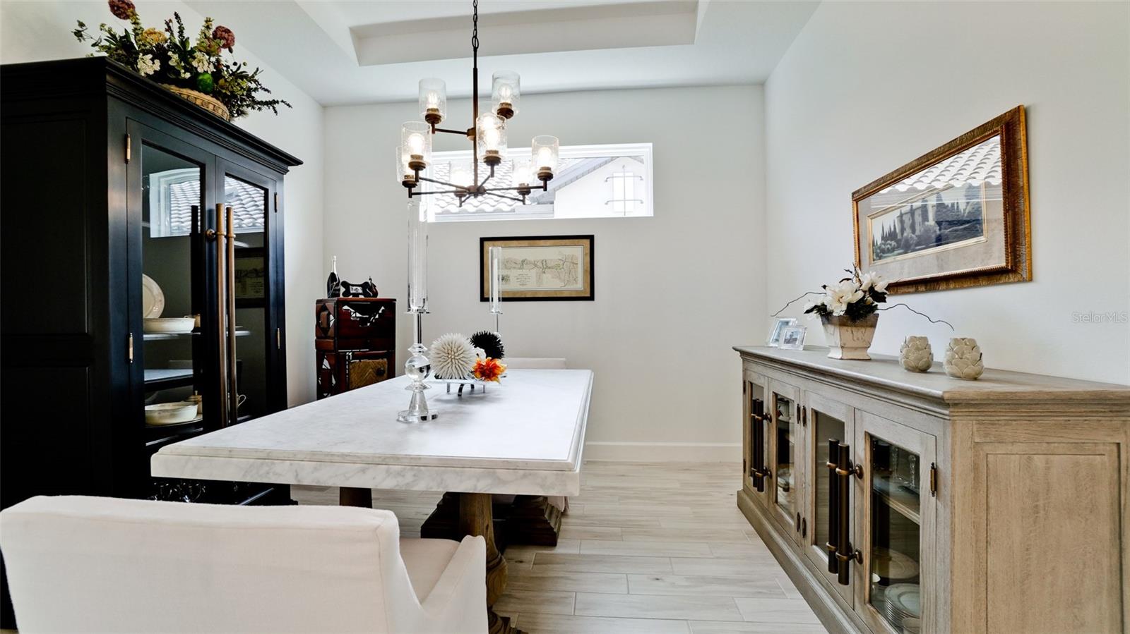 Single family villa w/ water views, on a cul-de-sac, DEEDED GOLF. Front door is iron inlay. 10’ ceilings and 8’ doors, open concept living with tray ceiling package. Three panel glass sliders appointed with privacy shades leads to the enclosed lanai prepped for an outdoor kitchen. Ceramic plank floors throughout. Upgraded SS GE Café appliances, microwave with convection option, center griddle gas range. Quartz counters are complemented with glass stacked tile backsplash and under cabinet lighting. Primary suite w bay providing additional square footage The ensuite with double sinks and center vanity triple upgrade includes frameless glass shower and pebble stone shower floor. This floorplan offers the guest bedroom with second bath access on the opposite side of the home. Walk in closets. French doors lead to the study/flex room. Also, this hallway leads to the 2-car garage and laundry/mud room fully equipped with like new washer and dryer. Exterior upgrades include epoxy 2 car garage floor, radiant barrier in attic, professional landscaping, and cement barrel tile roof. Upgrades: bronze designer finishes, fixtures and lighting, blinds throughout. Amenities: Resort Heated Pool & Spa, Bahama Grille/Bar, 18-Hole Golf Course, Driving Range, Lighted Pickle Ball and Tennis Courts, Bocce Courts, Activity Center w/ Fitness Center, Luxurious Wellness Center, Hair Salon, Coffee Café, 15,000 square foot Culinary Center with fine dining and Italian eatery w pizza station.