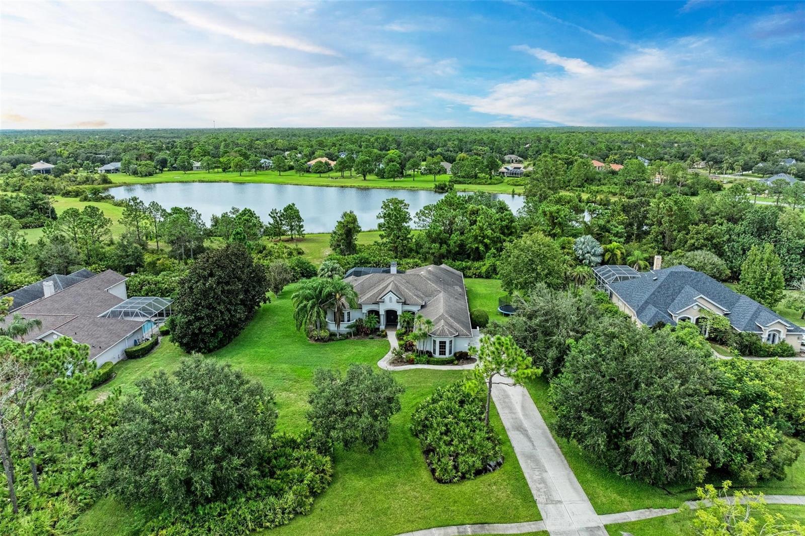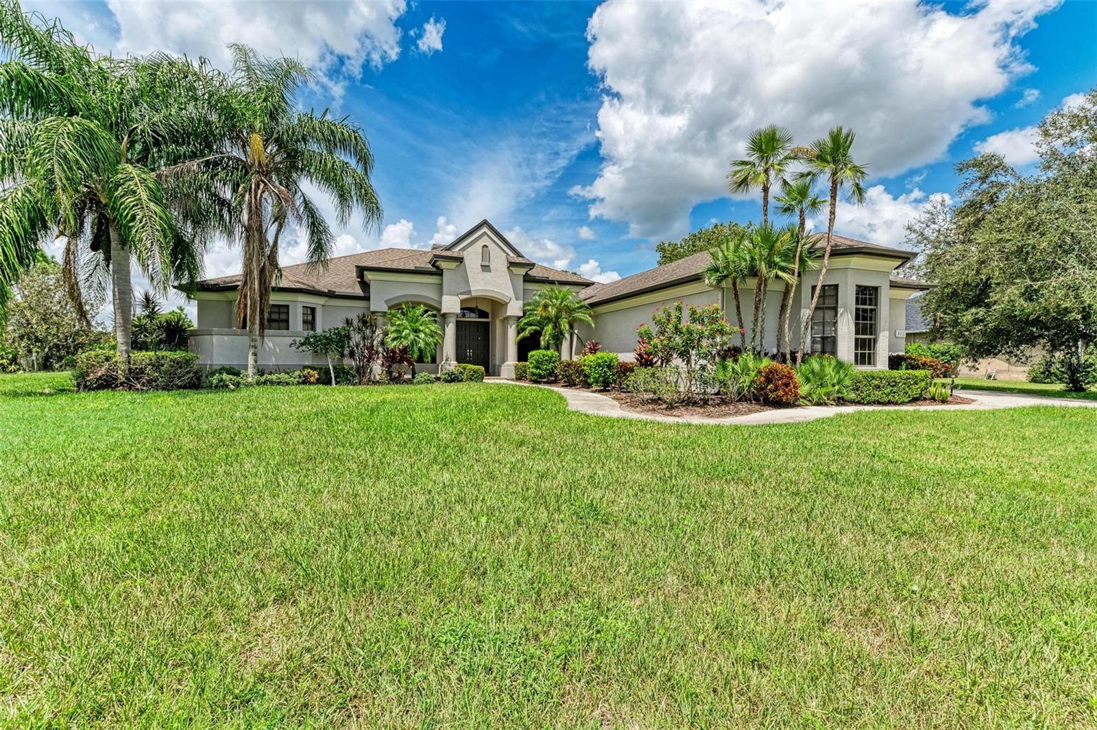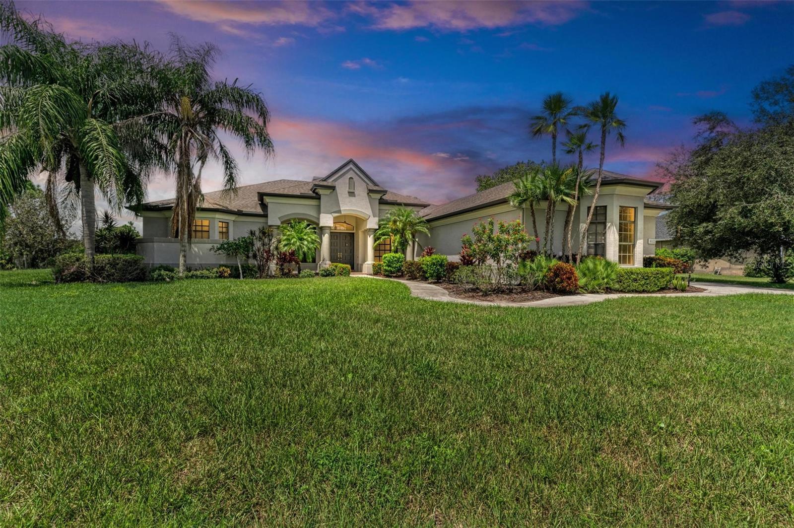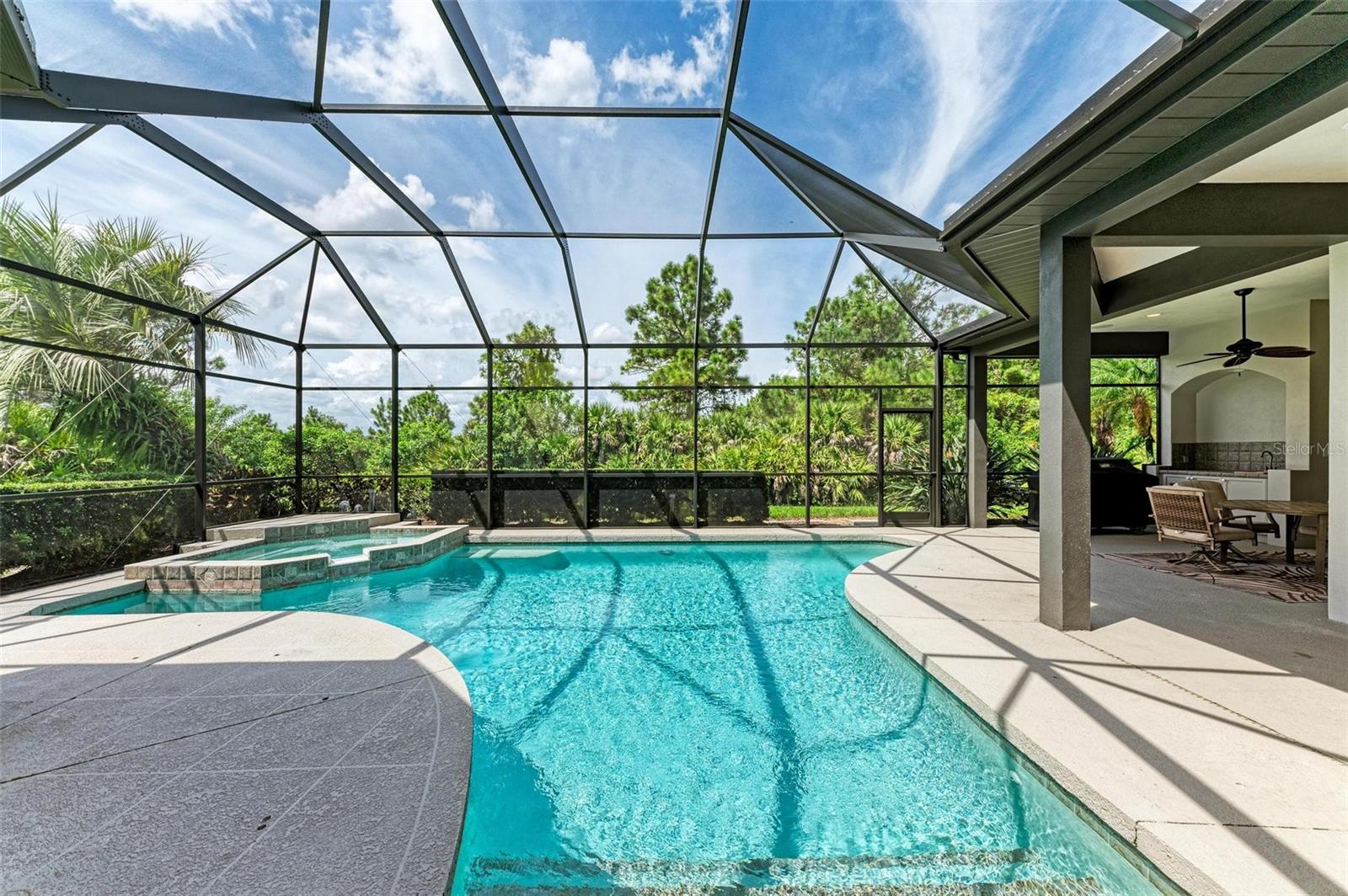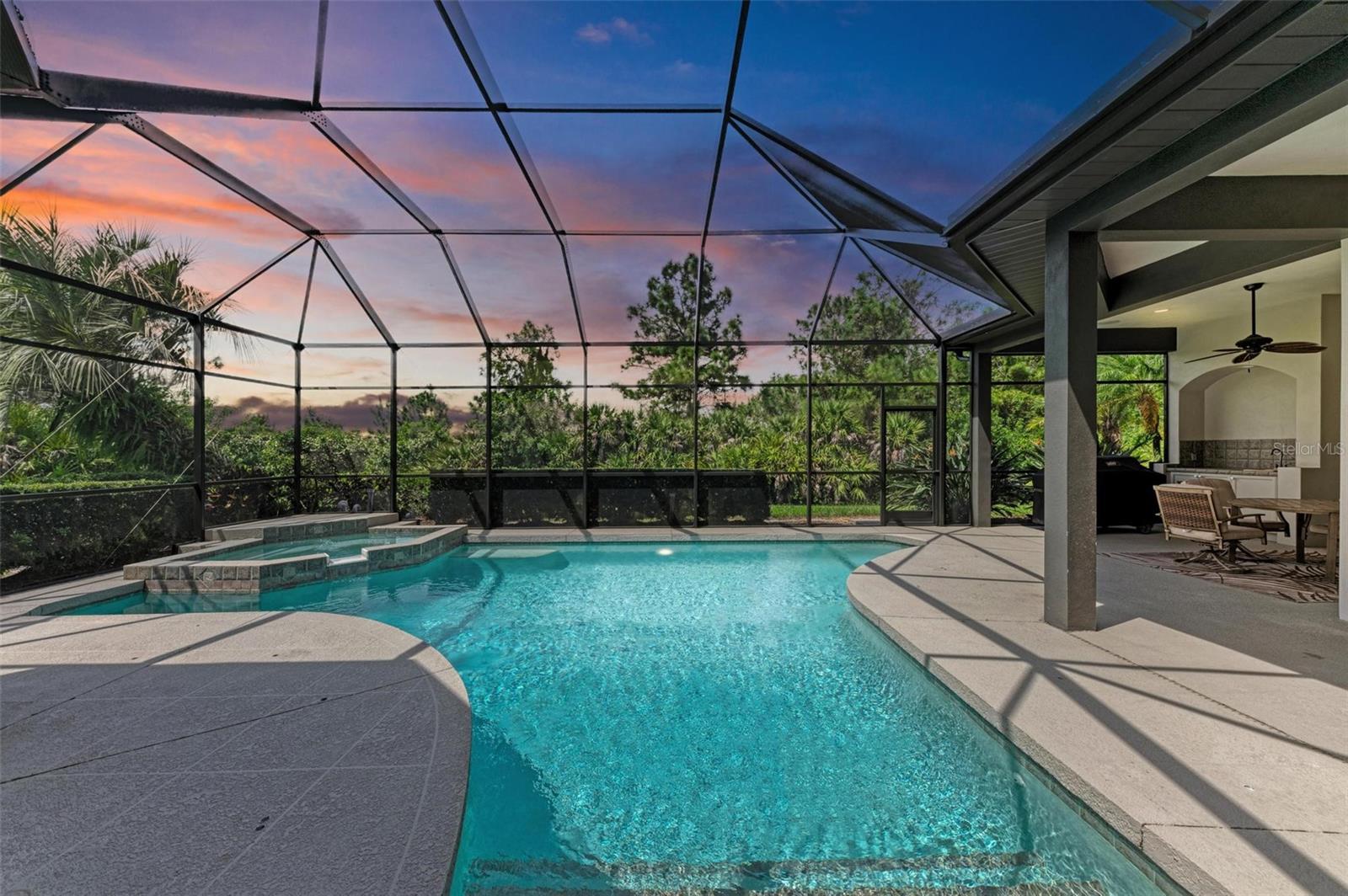 This stunning custom home in the Preserve at Panther Ridge is situated on a 1.8-acre lot, offering a high level of privacy with a water view in the front, a large pond in the back, and natural vegetation that enhances the seclusion of the property. The home features high ceilings throughout. The bright dining room has large windows, and the living room is adorned with large sliders and a gas fireplace. The kitchen, which shares one side of the fireplace, is spacious and open, with upgraded quartz countertops and backsplash. The center island provides plenty of space for bar seating, and the appliances are all dark stainless steel. The kitchen eating area boasts a large aquarium window. The family room offers stunning views of the beautiful pool. Additionally, the home includes a large bonus room, and the office features floor-to-ceiling glass walls. The property includes a spacious primary bedroom with two walk-in closets, large sliders leading into the pool area, and large windows. The primary bathroom is a true retreat with a garden tub, walk-in shower, two sinks, and a central seating area. Three additional bedrooms and two full bathrooms are located on the other side of the home, creating a split-plan layout. The home has a three car garage with epoxy flooring and built in storage shelving. There are two large covered seating areas surrounding the pool area which is great for entertaining or just relaxing outside. The pool is a tranquil retreat with a large spa and total privacy. Additionally, there is a full bathroom that leads out to the pool for easy access when you are outside. All the lanai screens are new. UPCOMING, SCHEDULED NEW ROOF SCHEDULED. Added features, installed new A/C unit 2024, new water treatment system (2024), including a new softener, sulfur filter, pressure tank, pump, and sub-drive. The Preserve at Panther Ridge community offers 15 miles of nature trails, park, playground, tennis court, and basketball court. The neighborhood provides a quiet and luxurious lifestyle but is only minutes away from shopping, restaurants, A-rated schools, and the famous Southwest Florida beaches.