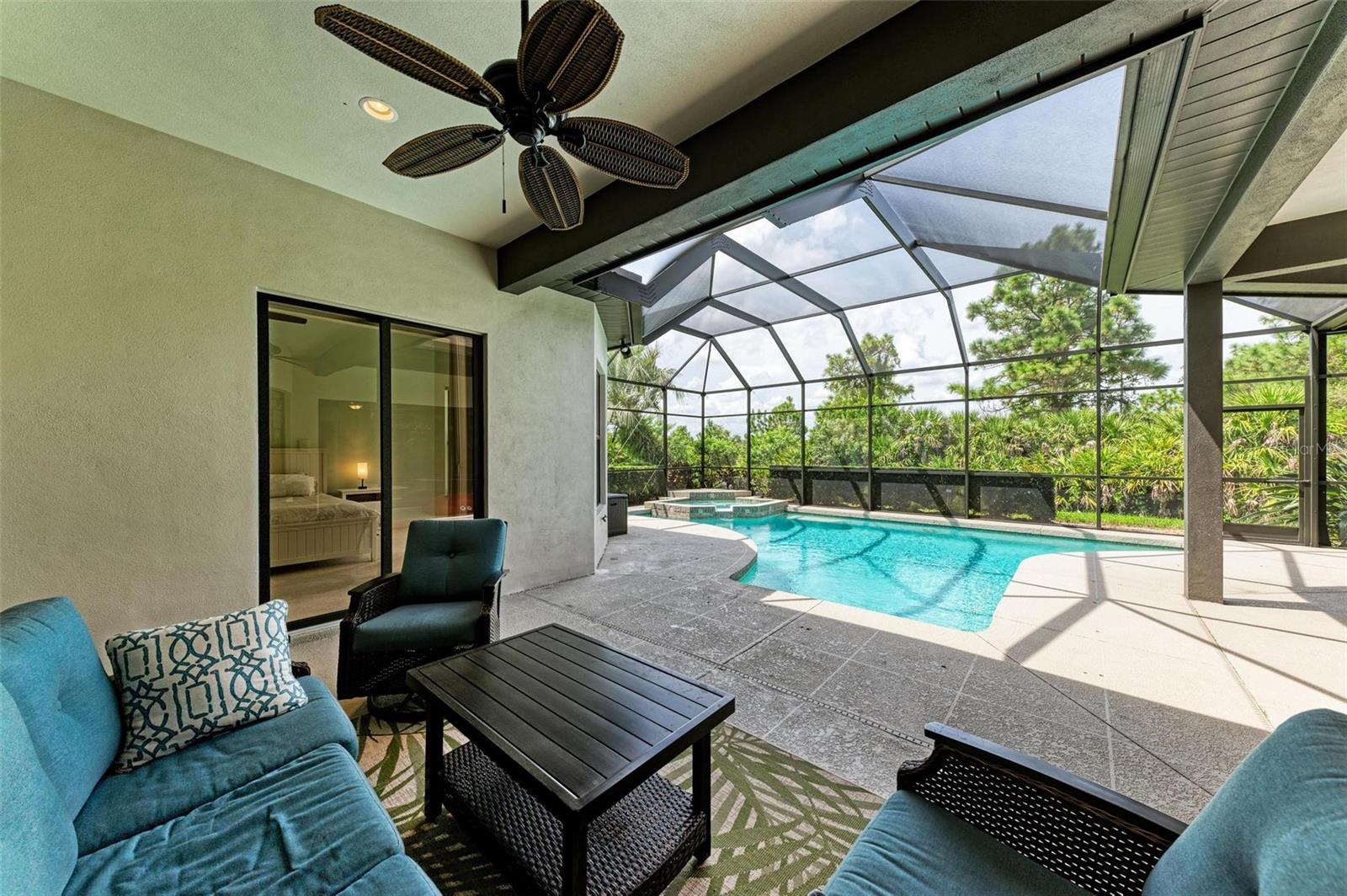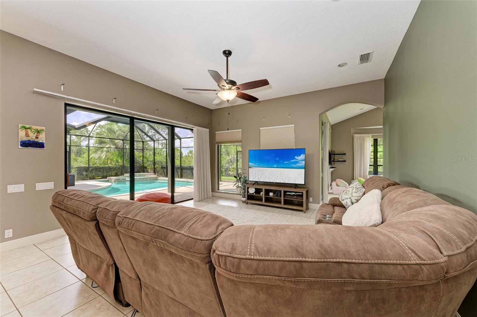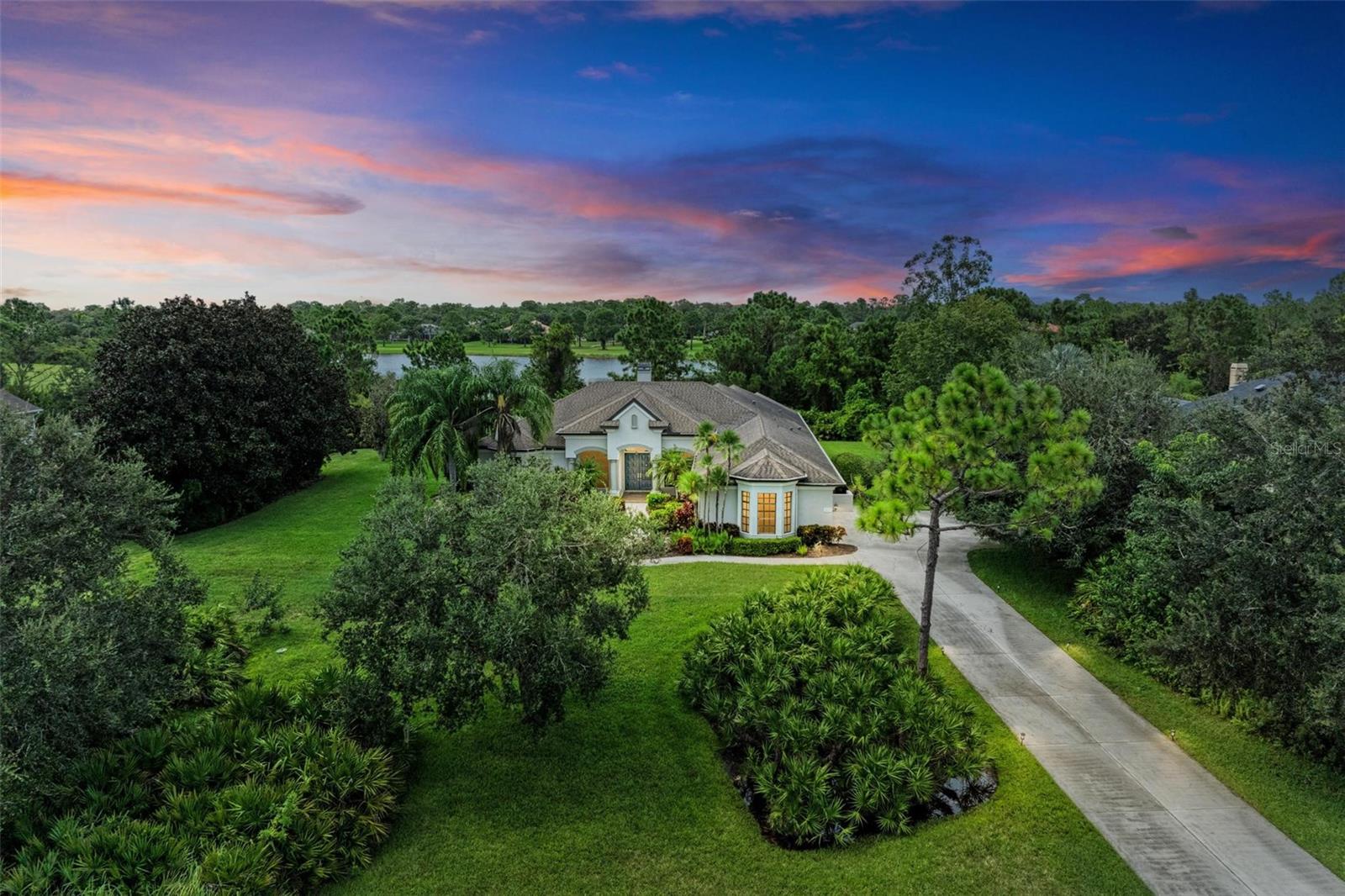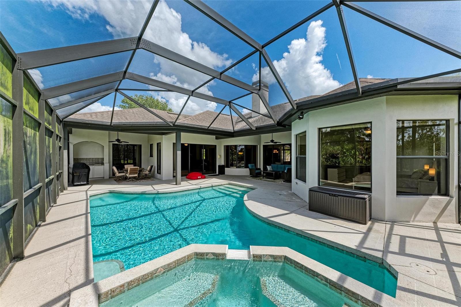 This stunning custom home in the Preserve at Panther Ridge is situated on a 1.8-acre lot, offering a high level of privacy with a water view in the front, a large pond in the back, and natural vegetation that enhances the seclusion of the property. The home features high ceilings throughout. The bright dining room has large windows, and the living room is adorned with large sliders and a gas fireplace. The kitchen, which shares one side of the fireplace, is spacious and open, with upgraded quartz countertops and backsplash. The center island provides plenty of space for bar seating, and the appliances are all dark stainless steel. The kitchen eating area boasts a large aquarium window. The family room offers stunning views of the beautiful pool. Additionally, the home includes a large bonus room, and the office features floor-to-ceiling glass walls. The property includes a spacious primary bedroom with two walk-in closets, large sliders leading into the pool area, and large windows. The primary bathroom is a true retreat with a garden tub, walk-in shower, two sinks, and a central seating area. Three additional bedrooms and two full bathrooms are located on the other side of the home, creating a split-plan layout. The home has a three car garage with epoxy flooring and built in storage shelving. There are two large covered seating areas surrounding the pool area which is great for entertaining or just relaxing outside. The pool is a tranquil retreat with a large spa and total privacy. Additionally, there is a full bathroom that leads out to the pool for easy access when you are outside. All the lanai screens are new. UPCOMING, SCHEDULED NEW ROOF SCHEDULED. Added features, installed new A/C unit 2024, new water treatment system (2024), including a new softener, sulfur filter, pressure tank, pump, and sub-drive. The Preserve at Panther Ridge community offers 15 miles of nature trails, park, playground, tennis court, and basketball court. The neighborhood provides a quiet and luxurious lifestyle but is only minutes away from shopping, restaurants, A-rated schools, and the famous Southwest Florida beaches.