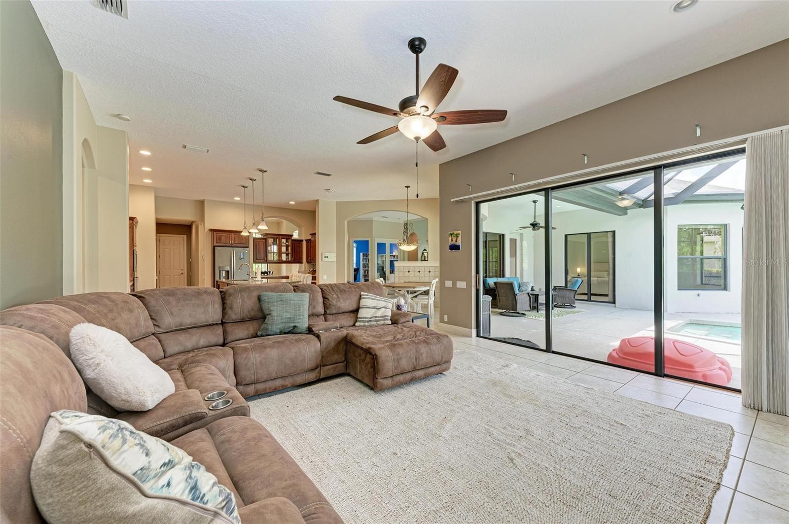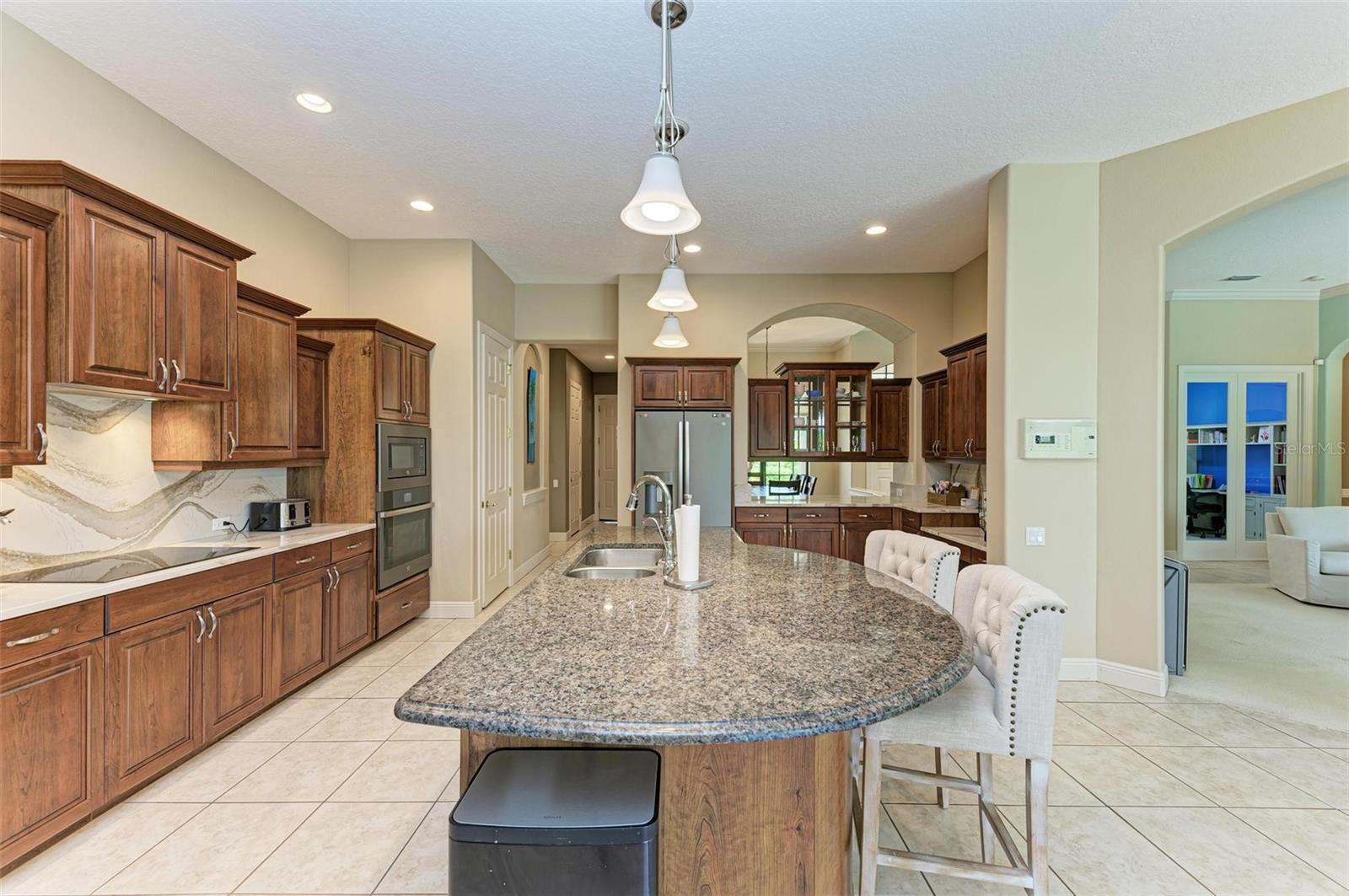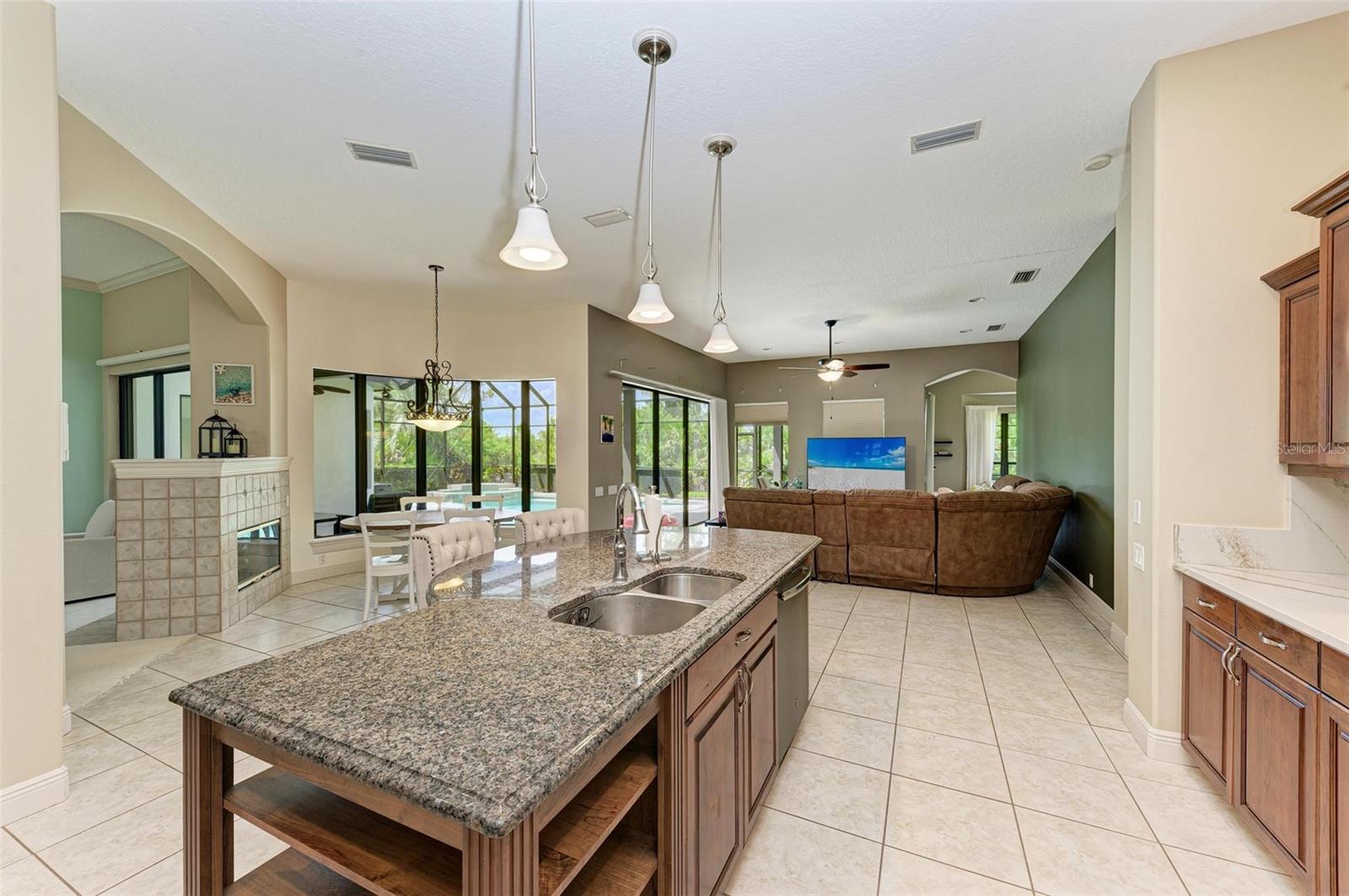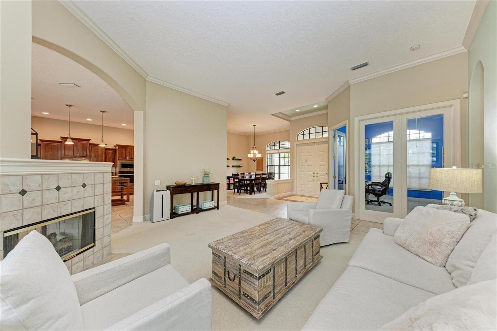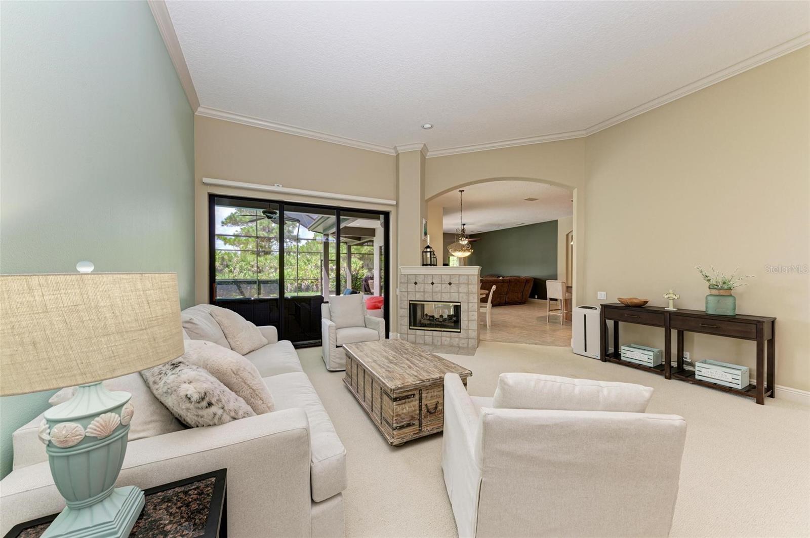This stunning custom home in the Preserve at Panther Ridge is situated on a 1.8-acre lot, offering a high level of privacy with a water view in the front, a large pond in the back, and natural vegetation that enhances the seclusion of the property. The home features high ceilings throughout. The bright dining room has large windows, and the living room is adorned with large sliders and a gas fireplace. The kitchen, which shares one side of the fireplace, is spacious and open, with upgraded quartz countertops and backsplash. The center island provides plenty of space for bar seating, and the appliances are all dark stainless steel. The kitchen eating area boasts a large aquarium window. The family room offers stunning views of the beautiful pool. Additionally, the home includes a large bonus room, and the office features floor-to-ceiling glass walls. The property includes a spacious primary bedroom with two walk-in closets, large sliders leading into the pool area, and large windows. The primary bathroom is a true retreat with a garden tub, walk-in shower, two sinks, and a central seating area. Three additional bedrooms and two full bathrooms are located on the other side of the home, creating a split-plan layout. The home has a three car garage with epoxy flooring and built in storage shelving. There are two large covered seating areas surrounding the pool area which is great for entertaining or just relaxing outside. The pool is a tranquil retreat with a large spa and total privacy. Additionally, there is a full bathroom that leads out to the pool for easy access when you are outside. All the lanai screens are new. UPCOMING, SCHEDULED NEW ROOF SCHEDULED. Added features, installed new A/C unit 2024, new water treatment system (2024), including a new softener, sulfur filter, pressure tank, pump, and sub-drive. The Preserve at Panther Ridge community offers 15 miles of nature trails, park, playground, tennis court, and basketball court. The neighborhood provides a quiet and luxurious lifestyle but is only minutes away from shopping, restaurants, A-rated schools, and the famous Southwest Florida beaches.