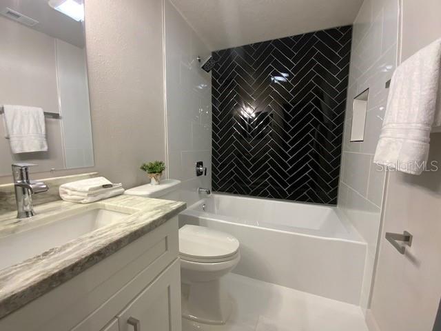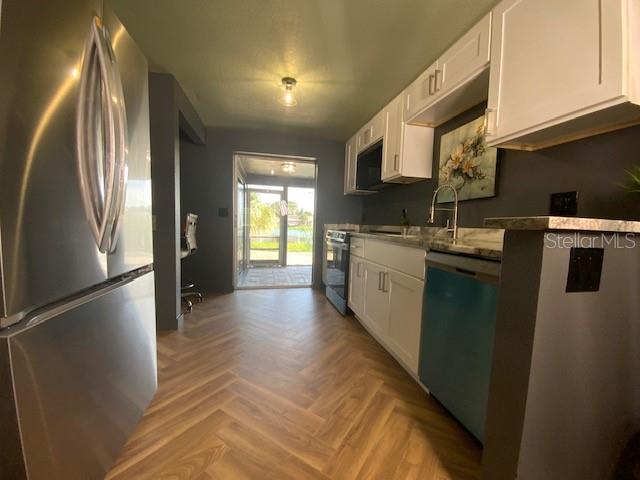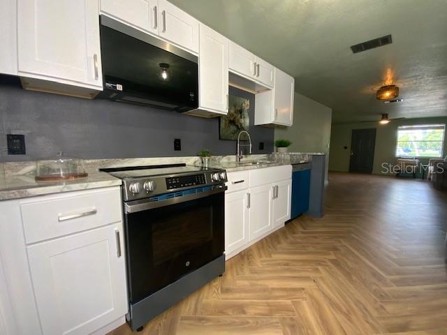 This waterfront home is fully move-in ready! Check out the tour video link, but this is a MUST SEE in person! Brand new in 2024: roof, contiguous vinyl flooring (with waterproofing also added), kitchen cabinets, granite countertops, all kitchen appliances, both bathrooms fully, water heater, garbage disposal, landscaping, paint (interior and exterior), lighting, and fans. A/C was replaced in 2020, and routine maintenance done twice a year. The property is not in an HOA, so there are no deed restrictions or lease restrictions. The large roof-covered lanai in the back views the serene lake, and the master bedroom has sliding glass doors that also overlook the lake view. Built to last with block construction. Public water, sewer, electricity, and trash pick-up.