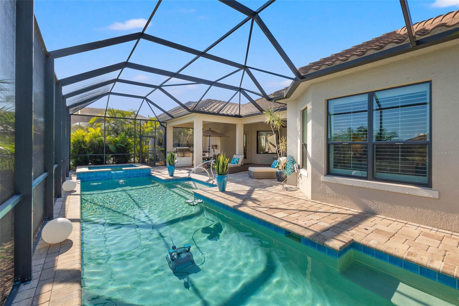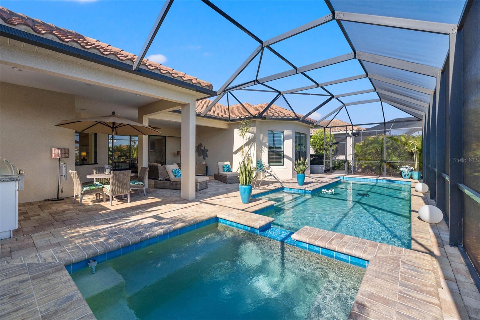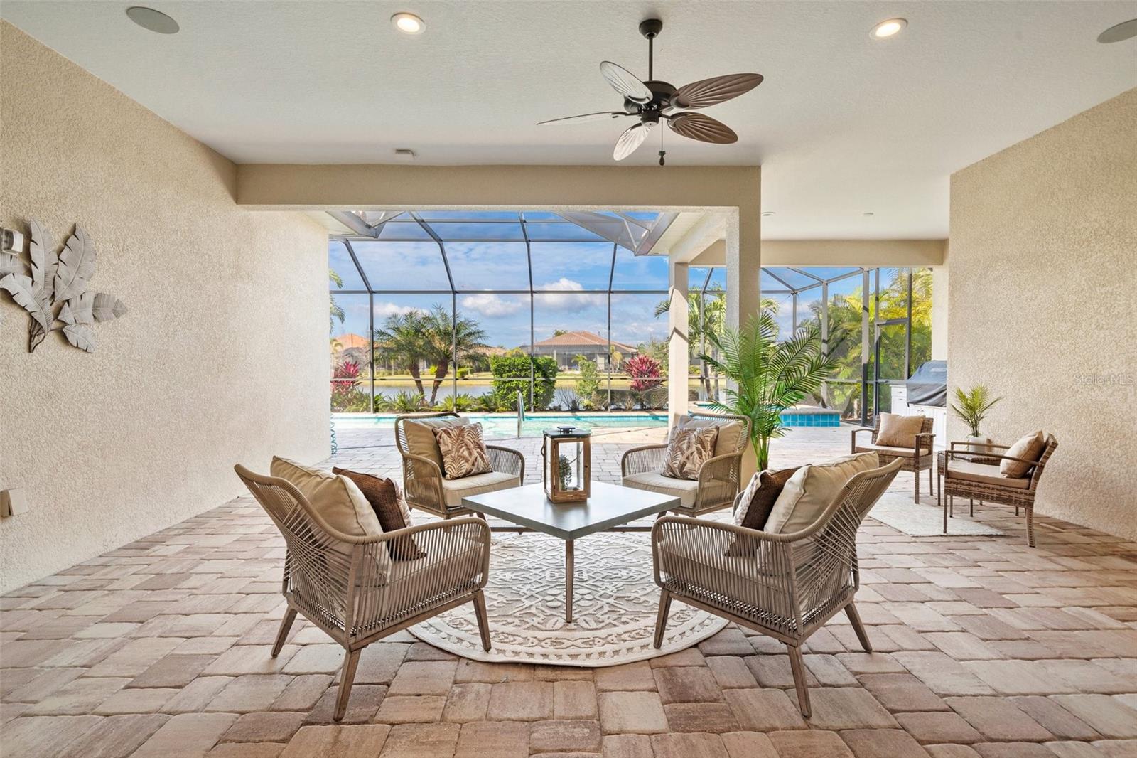 Enjoy the comfort of knowing seller has already prepaid the HOA fees and Property Taxes for the year! Discover the epitome of luxury living at this stunning property in Country Club East, nestled within a resort-style gated community. Dive into relaxation with a saltwater pool that's heated and cooled, perfect for year-round enjoyment. Step inside to find plantation shutters, auto sun shades, a meticulously designed Palmavera floor plan, and a water filtration system. Over $200k in upgrades, including a generator, built-in garage cabinets, an electric fireplace and hardwood engineered floor showcase attention to detail. Entertain effortlessly with a full outdoor kitchen and enjoy the convenience of a full-size laundry room. The kitchen boasts an island/breakfast bar and seamlessly integrates with the open floor plan living area. Enjoy quartz counter tops and ample storage space. The HOA makes for a all around maintenance free lifestyle covering landscaping, side walk and the common grounds. Retreat to the primary bedroom with its expansive walk-in closet and luxurious ensuite featuring a Roman tub and dual sinks. This home offers unparalleled comfort and style, ready to welcome you home. Situated in close proximity to the University Town Center, residents have access to a myriad of shopping and dining options. Nearby, Nathan Benderson Park offers a sprawling 600-acre community park with premier rowing facilities. Excitingly, the new Mote Science Education Aquarium is slated to open in 2023, enhancing the area's appeal. Additionally, residents enjoy easy access to some of the nation's best beaches and a regional airport, offering convenient access to national airlines, easy drop-off, and ample parking.