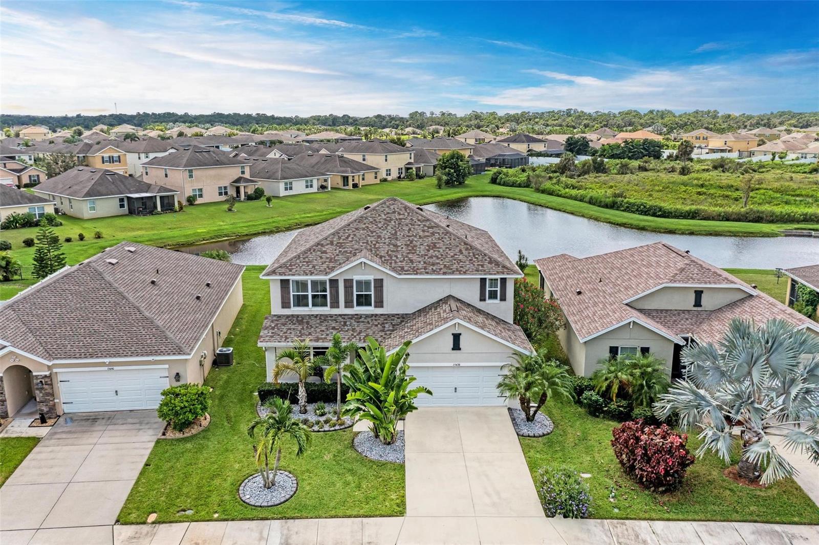 Beautiful backyard oasis, lush tropical landscaping on a premium waterfront lot! This luxurious two-story home is certain to meet all the requirements of a busy, active family and provides just the right layout for everyone to enjoy their own space. Welcome home to this well-maintained piece of paradise, with over $60K of owner updates, offering 2,889 square feet, five bedrooms, two and a half baths, office/den, a two-car garage with epoxy flooring, nestled in the desirable gated Del Tierra community. This popular Elle model by DR Horton has such a great floor plan with an abundance of natural light throughout, the primary bedroom on the first floor, a large loft area upstairs plus four bedrooms providing plenty of space for the entire family and guests. This spotless home includes many owner updates including a new roof (Nov. 2022), new luxury vinyl plank flooring, added canned/recessed lighting throughout, updated sink fixtures and quartz counters in kitchen and full bath, new AC components, extended pavers in the backyard and pergola, curbside edging in the front yard, salt and pepper stones added to the flower beds, expensive landscaping, palm trees and solar lights added and outside garage lights added. You will find the heart of the home in the spacious chef's kitchen - beautiful and functional - with newly updated quartz counters, new pendant lighting, an island with a new large stainless steel sink with a gooseneck faucet and soap dispenser, new energy-efficient stainless steel appliances and cabinet fixtures, new Samsung refrigerator and stove, new Whirlpool dishwasher and walk-in pantry. The kitchen, living and dining areas all flow together as one, making for open living to enjoy the whole family being together. The downstairs owner's suite is separate from the other bedrooms, providing privacy and tranquility, with luxury vinyl flooring, an en-suite bath with dual sinks and quartz counters, a walk-in shower, a private toilet closet and two walk-in closets. The large office/den is a perfect setting for your home business, reading or relaxation. Upstairs, enjoy family gatherings in the oversized loft that can be used as a playroom, entertainment area or additional office space. All four upstairs bedrooms provide plenty of space with two bedrooms having walk-in closets. Outside, the covered lanai has a fantastic upgraded extended paver area for extra space for cookouts, family gatherings and relaxing with a cup of coffee to enjoy the breathtaking water view. The fabulous oversized yard is great for fun activities and has a gorgeous long lake view; plus there is plenty of space to add a swimming pool. This home was built with energy-efficient windows and includes hurricane shutters and an irrigation system. The HOA fee is only $100/month! No CDD Fees. This gated community features plenty of amenities, including private streets and sidewalks to walk your pets, a resort-style pool with covered outdoor dining space and cabana-style seating, a state-of-the-art fitness room, playground, soccer field and covered pavilions for entertaining. This community is conveniently located near highly rated schools, grocery shopping, restaurants, arts, Manatee River and Lake Manatee for freshwater boating/fishing, Bradenton Motorsports Park, the Gulf of Mexico for saltwater boating/fishing, Sarasota and Tampa airports, I-75 and world-renowned beaches within only 30 minutes. Call today to schedule your showing to view this amazing home!