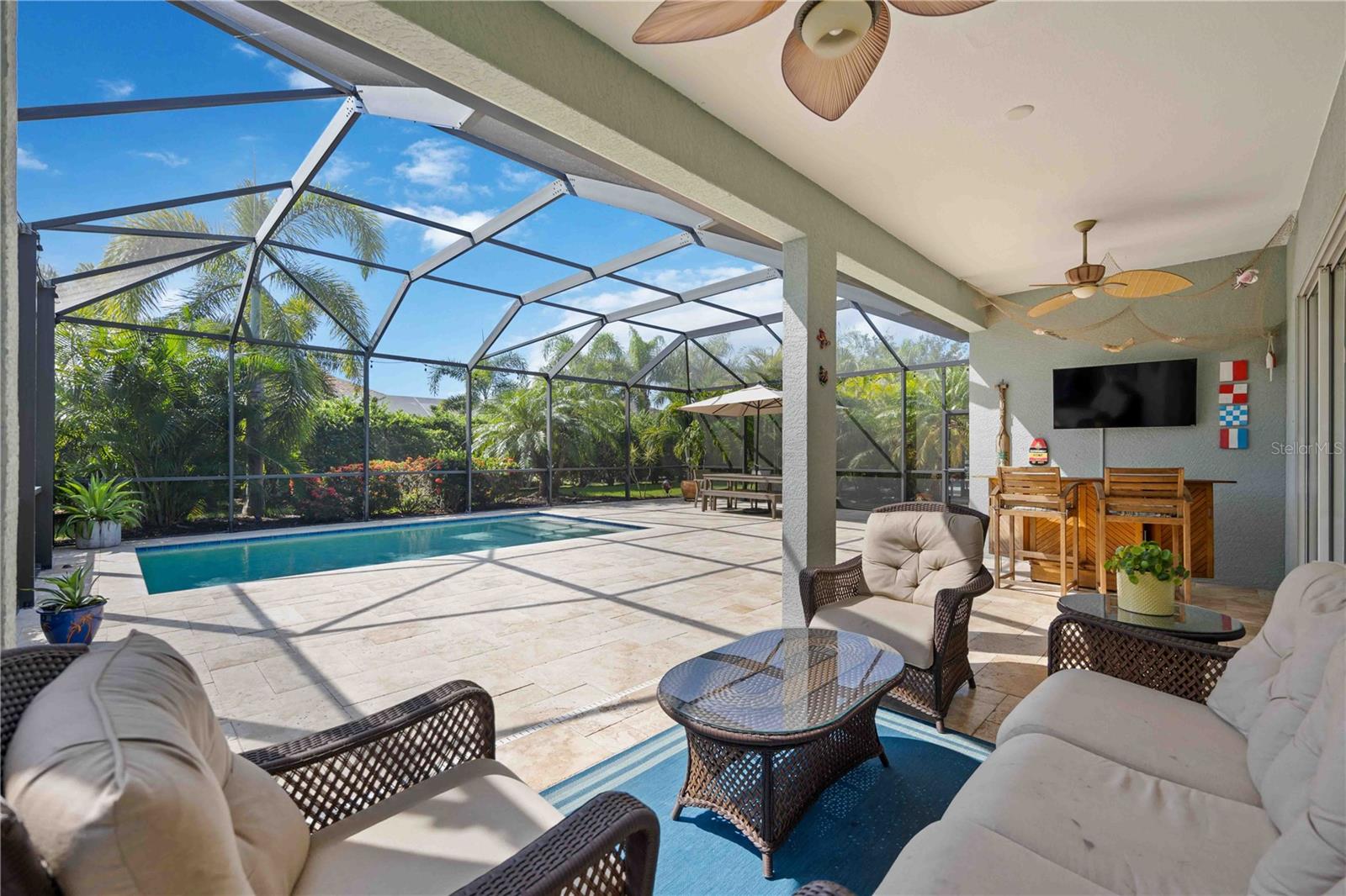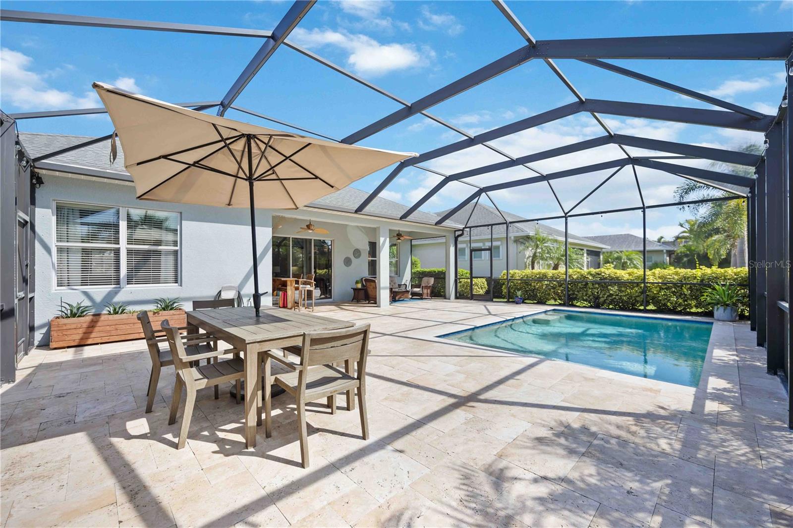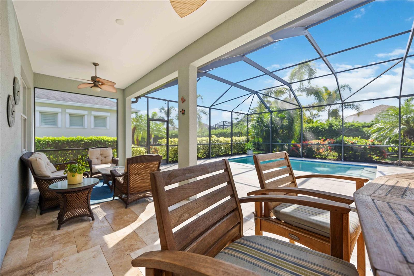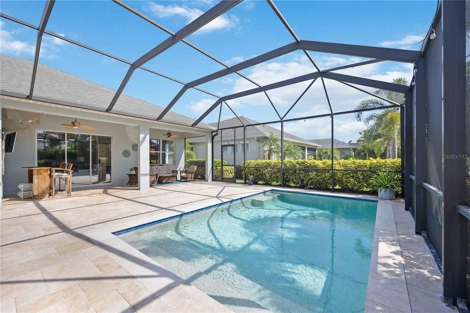 Welcome to 11410 Griffith Park Terrace, located in the highly sought-after Lakewood Ranch community. This elegant home offers a perfect blend of style and functionality with an open floor plan, modern finishes, and abundant natural light throughout. The highlight of this property is the extended oversized lanai, featuring stunning travertine tile and a sleek rectangular pool, creating an ideal outdoor retreat for entertaining or relaxing. Situated in a prime location with access to top-rated schools, parks, golf courses, and shopping, this home provides a unique opportunity to experience Florida living at its finest. **HOA includes a community pool & spa, and fitness center that only Claremont residents have access to. **LAWN MAINTENANCE PROVIDED – mowing, trimming, blowing, weeding, fertilization, and mulching. Central Park offers 2 dog parks, a 10 acre park, tennis/PICKLEBALL courts, baseball field, covered pavilion, playground, splash pad.