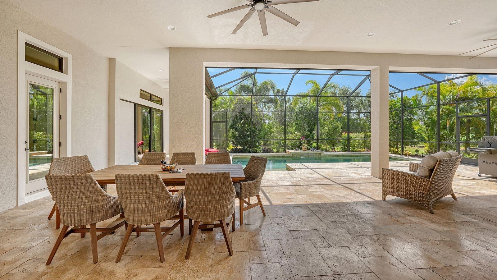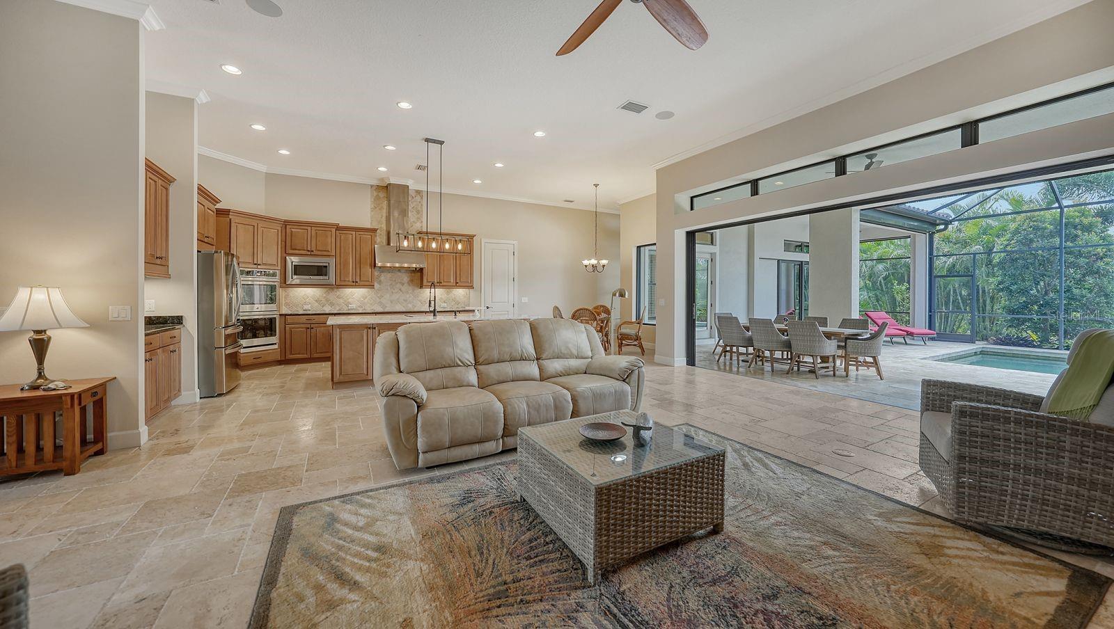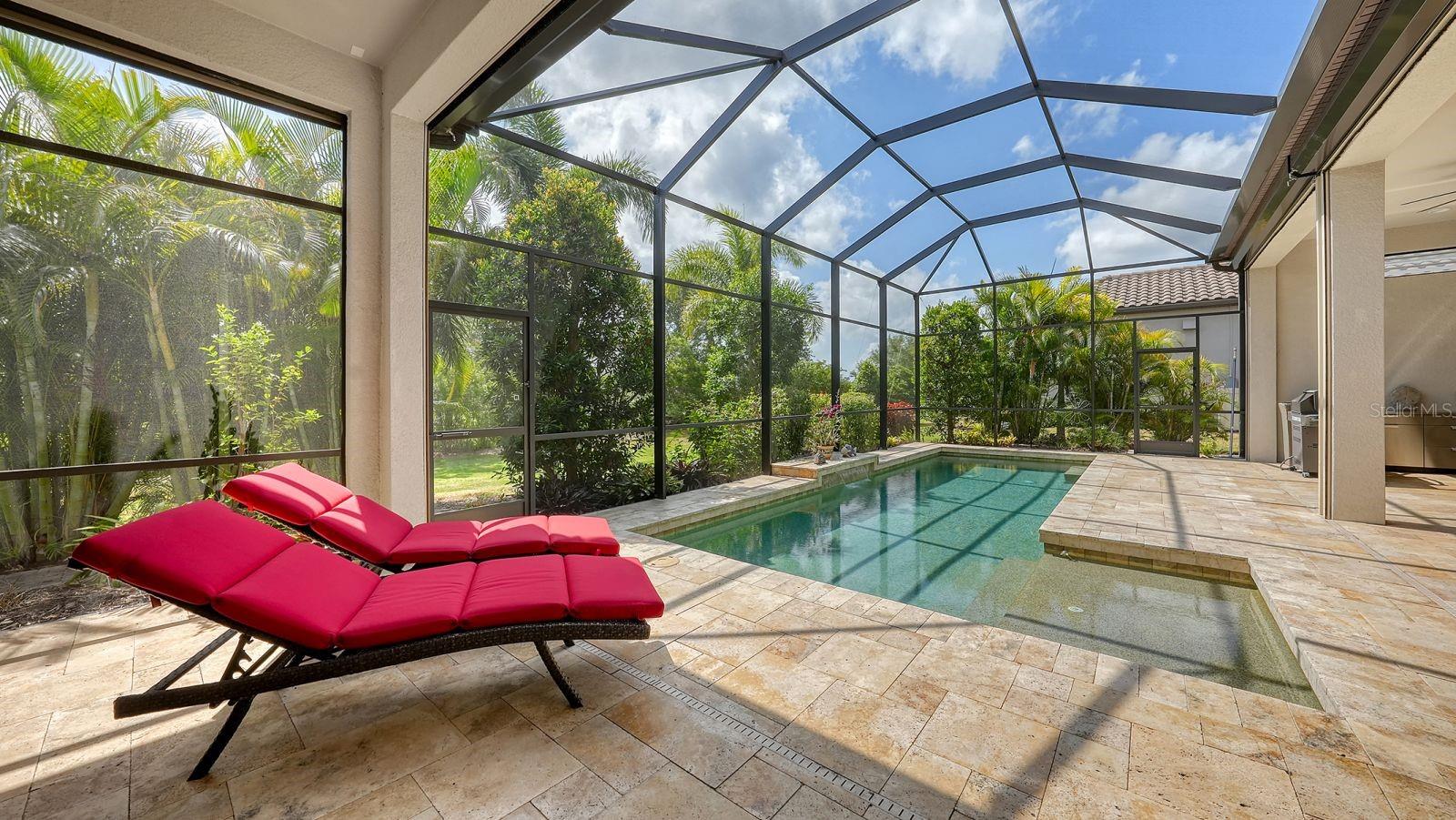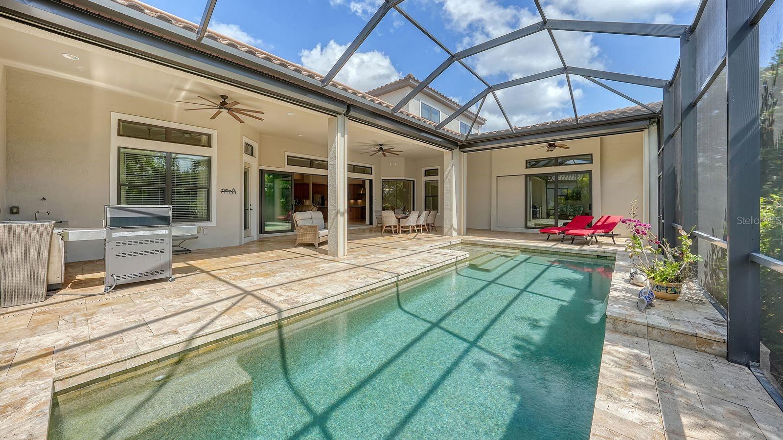This expanded Mercedes model seamlessly combines luxury and versatility, making it an ideal choice for your dream home. Boasting four bedrooms with en suites and two spacious flex rooms, the home is ideal for hosting extended-stay guests. Each level includes a flex room connected to one of the en-suite bedrooms, creating a private suite where the flex space serves as an adjacent living area. Whether you're working from home, indulging in a hobby, setting up a personal gym or enjoying a private entertainment space, this home offers limitless possibilities. On a private golf lot in the prestigious Esplanade Golf and Country Club, one of Lakewood Ranch's most amenity-rich communities, this 4,850-square-foot home features a 31-foot, three-car garage with an EV charger, a 22,000-kilowatt Generac whole-house generator and a solar-heated 31-foot saltwater pool with a heat pump backup. The home also includes a three-zone HVAC system with UV lights, insulated impact-resistant windows and doors, and remote-controlled hurricane screens for added protection and convenience. Additionally, an enhanced security system ensures peace of mind. The large utility room offers abundant cabinetry, counter space, and space for a full-size refrigerator. Outdoors, the east-facing screened lanai features a travertine surface, an outdoor kitchen and a solar-heated pool with water features, creating a serene space for relaxation and entertainment. Four-panel, eight-foot sliding doors fully retract, allowing for seamless indoor-outdoor living with beautiful views of the pool and lanai. Inside, the home is elegantly appointed with wood cabinetry, granite and quartz countertops, travertine flooring in the main areas, and newly installed wood flooring throughout. The chef’s kitchen features a large island, new refrigerator, two wall ovens, and an induction cooktop with a professional-grade stainless steel hood. Volume ceilings and transom windows, and a second set of lanai-facing sliding doors flood the home with natural light, enhancing its open, airy feel. As a resident of Esplanade, you'll enjoy a wide range of resort-style amenities, including access to the Troon Privé-managed private golf course. This home comes with a deeded golf membership, offering reciprocity with other Troon Privé courses across the country. Community amenities also include two large resort-style pools with cabanas, a resistance pool, two clubhouses, fitness classes, the Koquina Salon and Spa, six lighted Har-Tru tennis courts and six pickleball courts. Dining options such as the Bahama Bar, the Barrel House Bistro and the Culinary Center's main dining room are ideal for socializing with friends and neighbors. A dedicated lifestyle director organizes a variety of social events to enhance the community experience. Additionally, the home is just a short drive from downtown Sarasota and world-class beaches, offering plenty of opportunities for fun and relaxation.