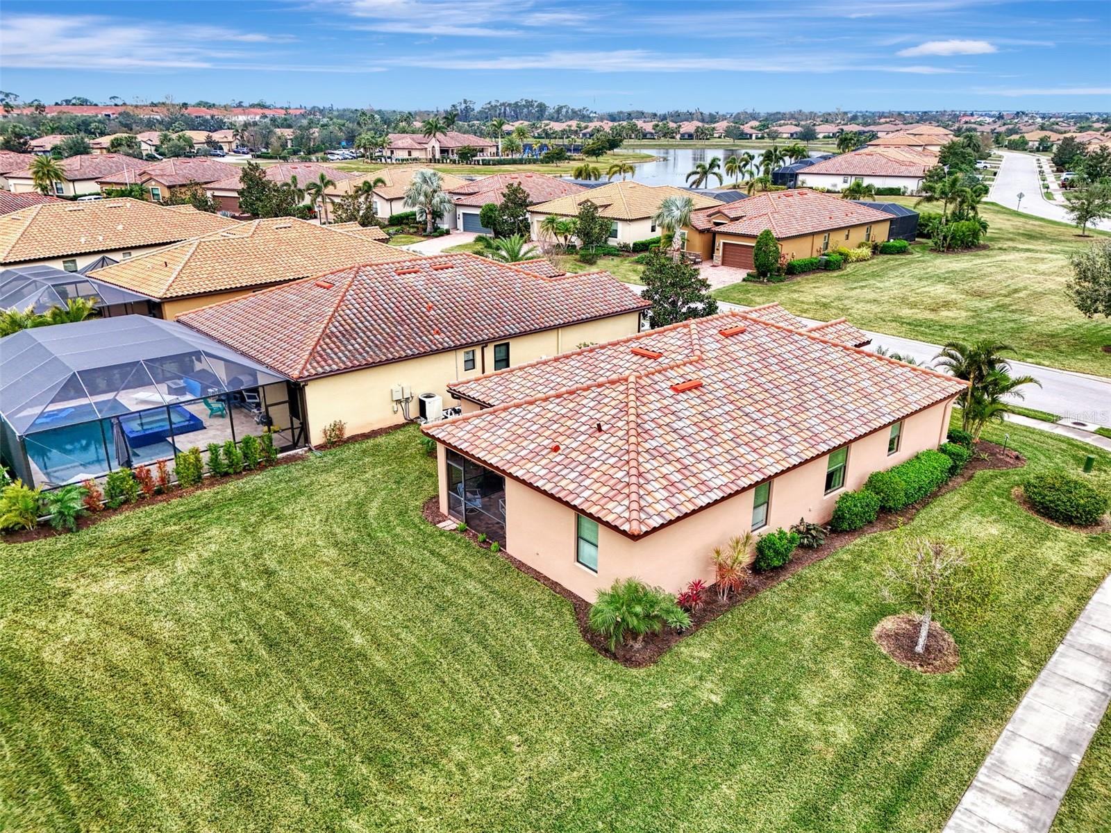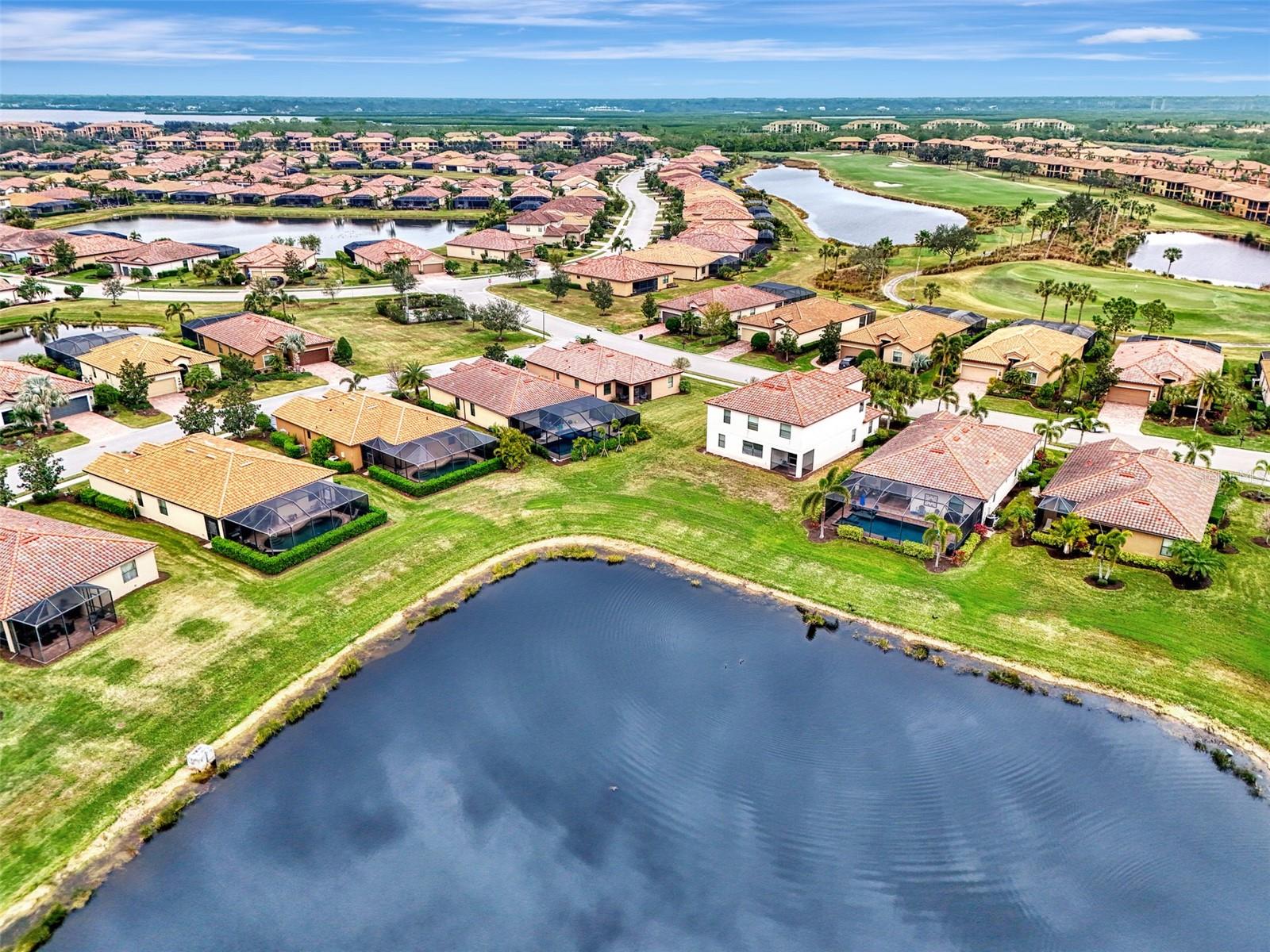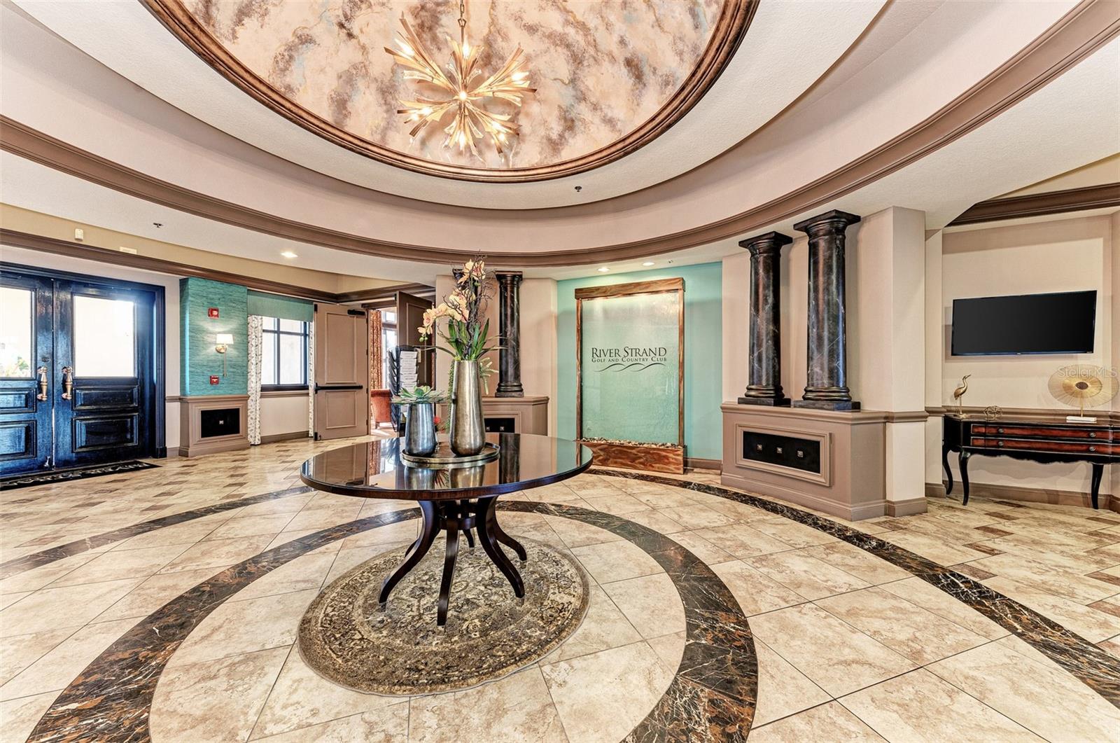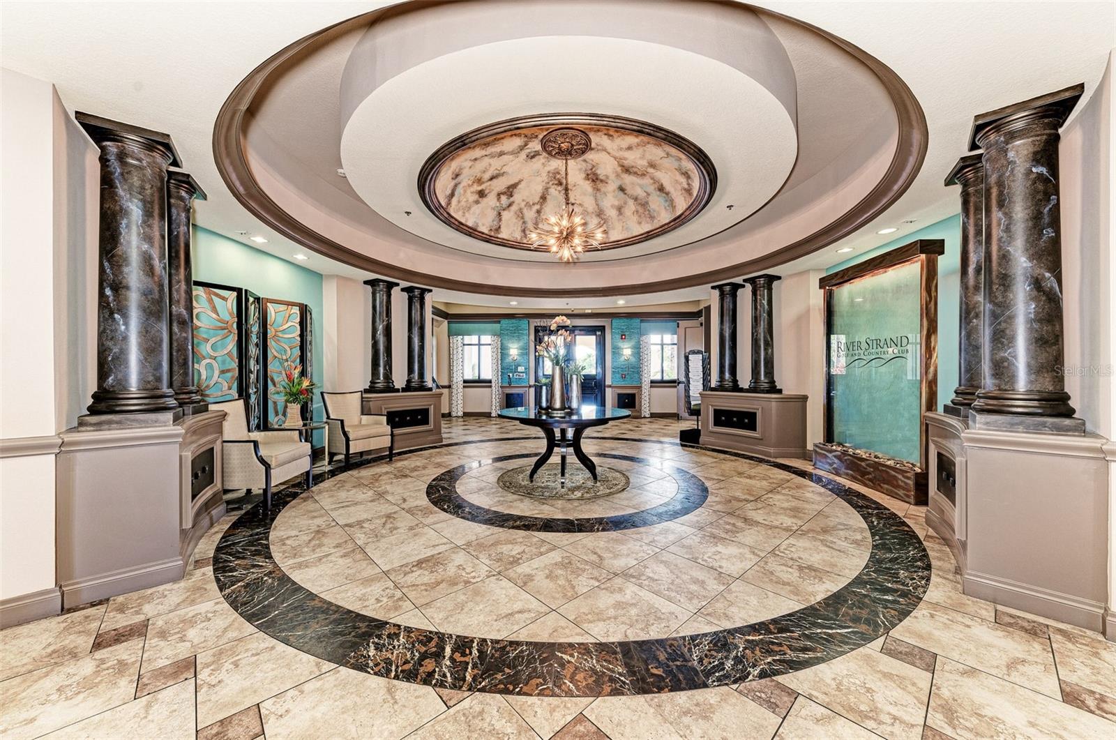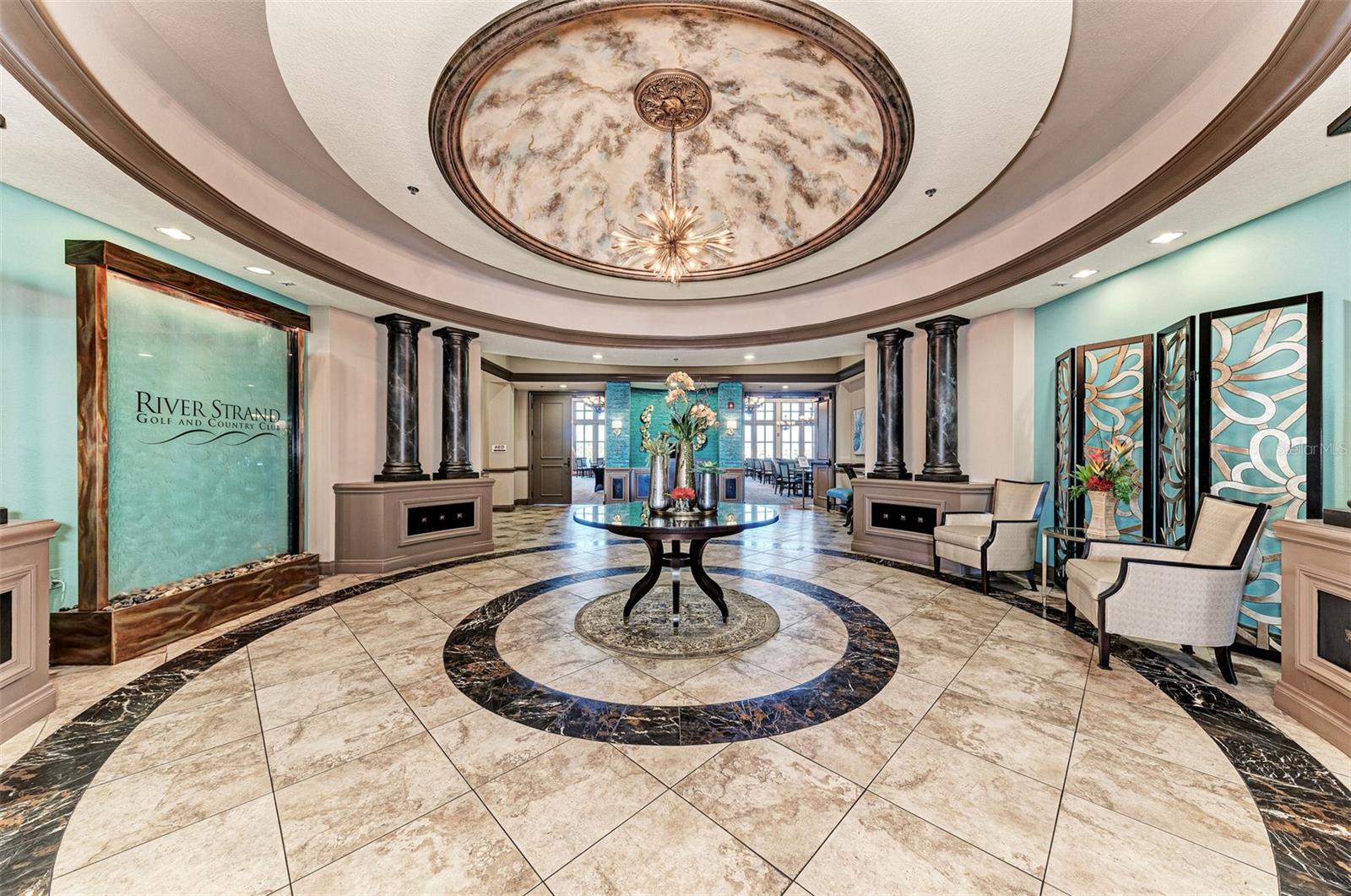 NO DAMAGE OR FLOODING FROM HURRICANE MILTON or Helene. WELCOME to this Stunning and IMMACULATELY maintained move-in ready home features an over abundance of natural light. This single story home is located in the highly sought after River Strand Golf and Country Club with 1628 sqft of living space and plenty of room for a pool. As you begin your tour you will notice the gorgeous tile floors and volume ceilings as you enter through the inviting foyer, passing through the foyer you will enter into the dining room which opens to both the kitchen and living room giving the home that open spacious floor plan. If cooking is your passion you will not be disappointed, this kitchen is equipped with stainless steel appliances, and gorgous gleaming stone countertops with plenty of space to move around with comfort, a large breakfast bar completes the space. The roomy master bedroom has an en-suite bathroom with dual sinks, a large garden soaking tub, separate shower and large walk-in closet. Additionally, you will find two spacious guest bedrooms and a guest bath with lanai access, upgraded fans and lighting throughout. Step outside into the cozy screened in outdoor space and relax as you take in the beautiful water views. FRESHLY PAINTED EXTERIOR 2024. Your life at River Strand is like being on vacation every day. Your social membership offers you access to the clubhouse/ restaurant, 2 community pools and spas, Tiki Bar, 6 satellite pools, 2 fitness centers, tennis, pickle-ball, and year-round social activities. HOA Fee includes Lawn Care, Cable, Internet and security of a Gated Community. Convenient to I-75, dining, shopping, Costco and our Beautiful Gulf coast beaches.