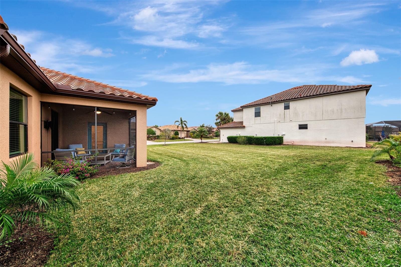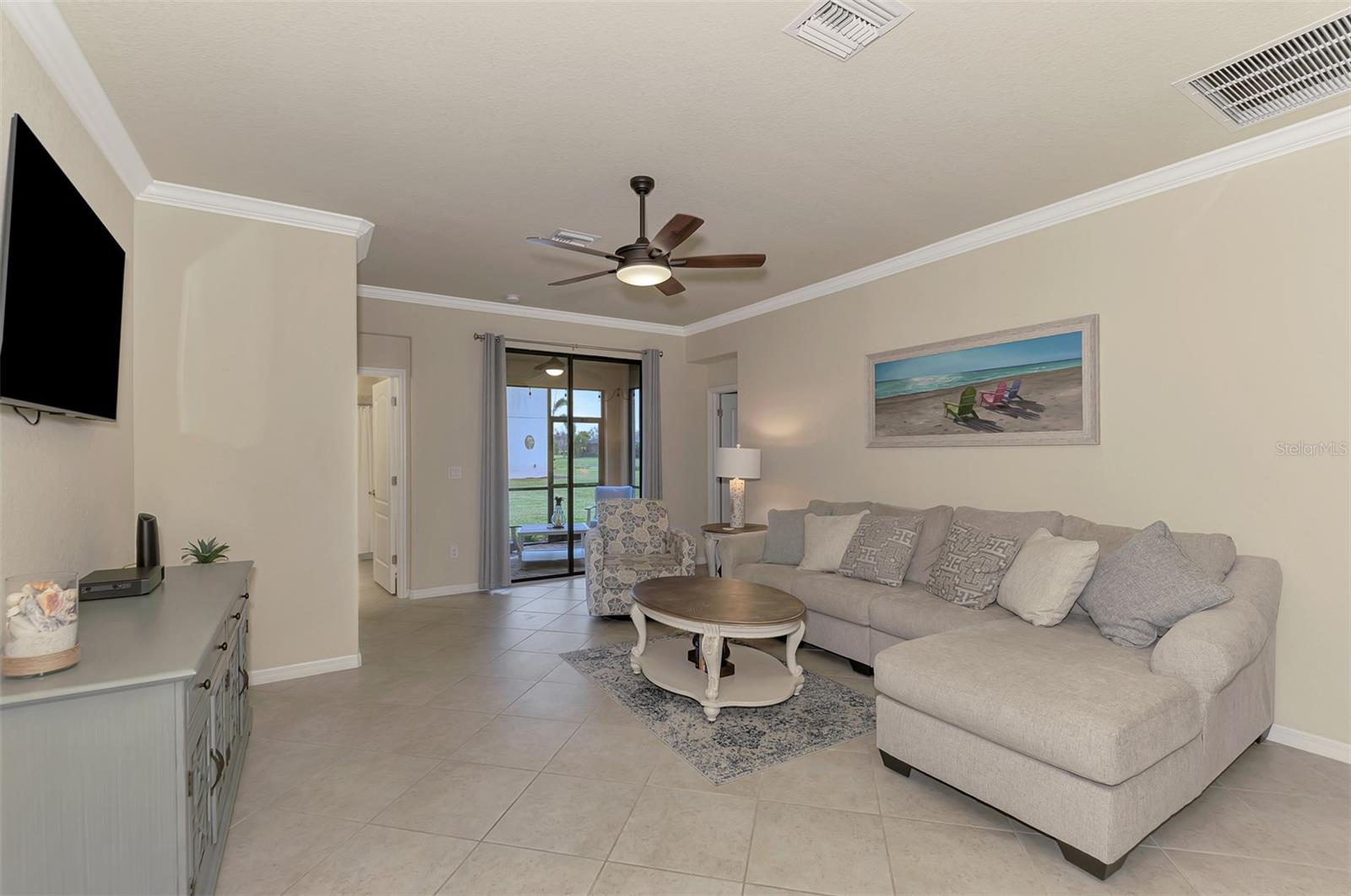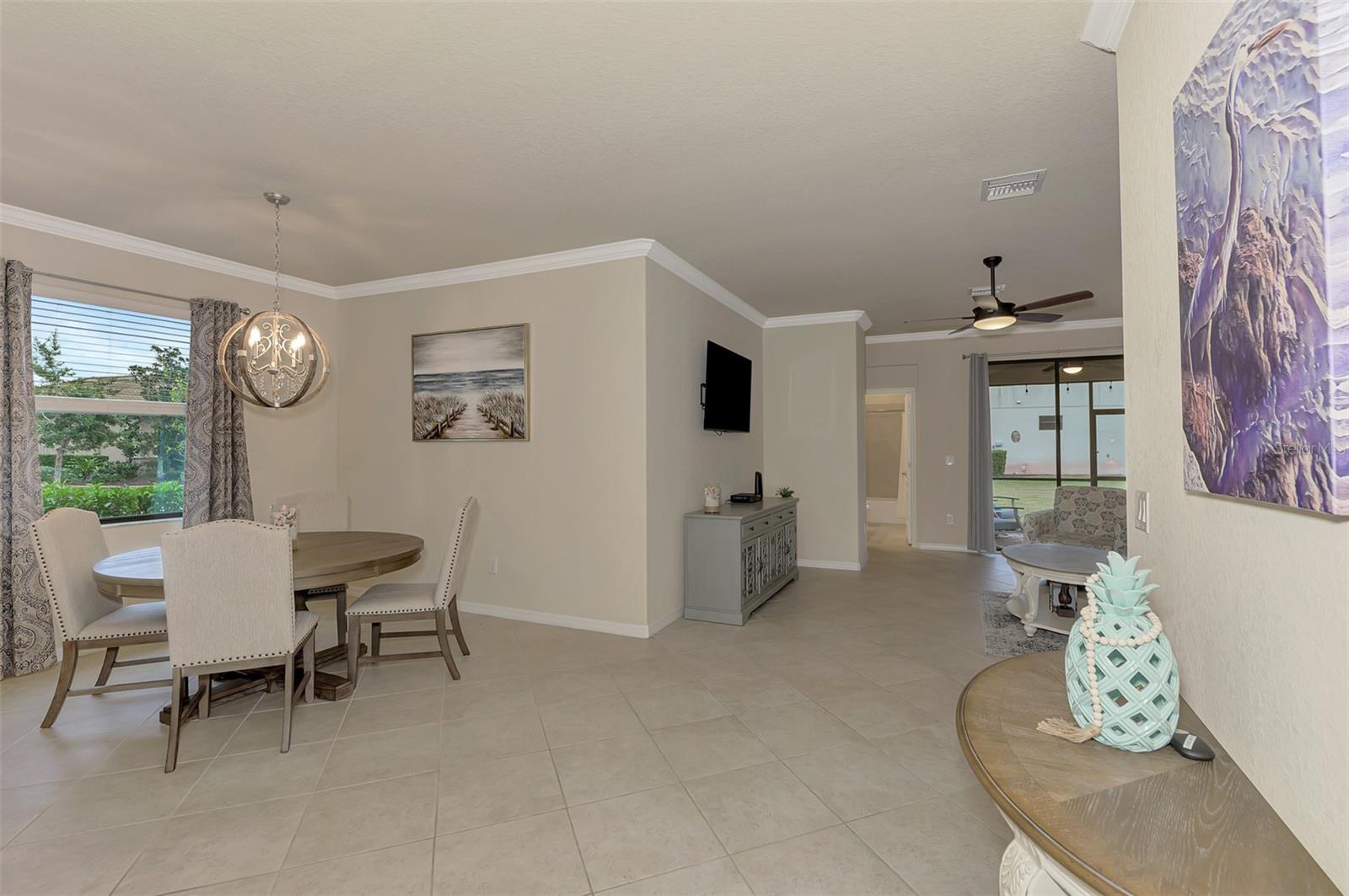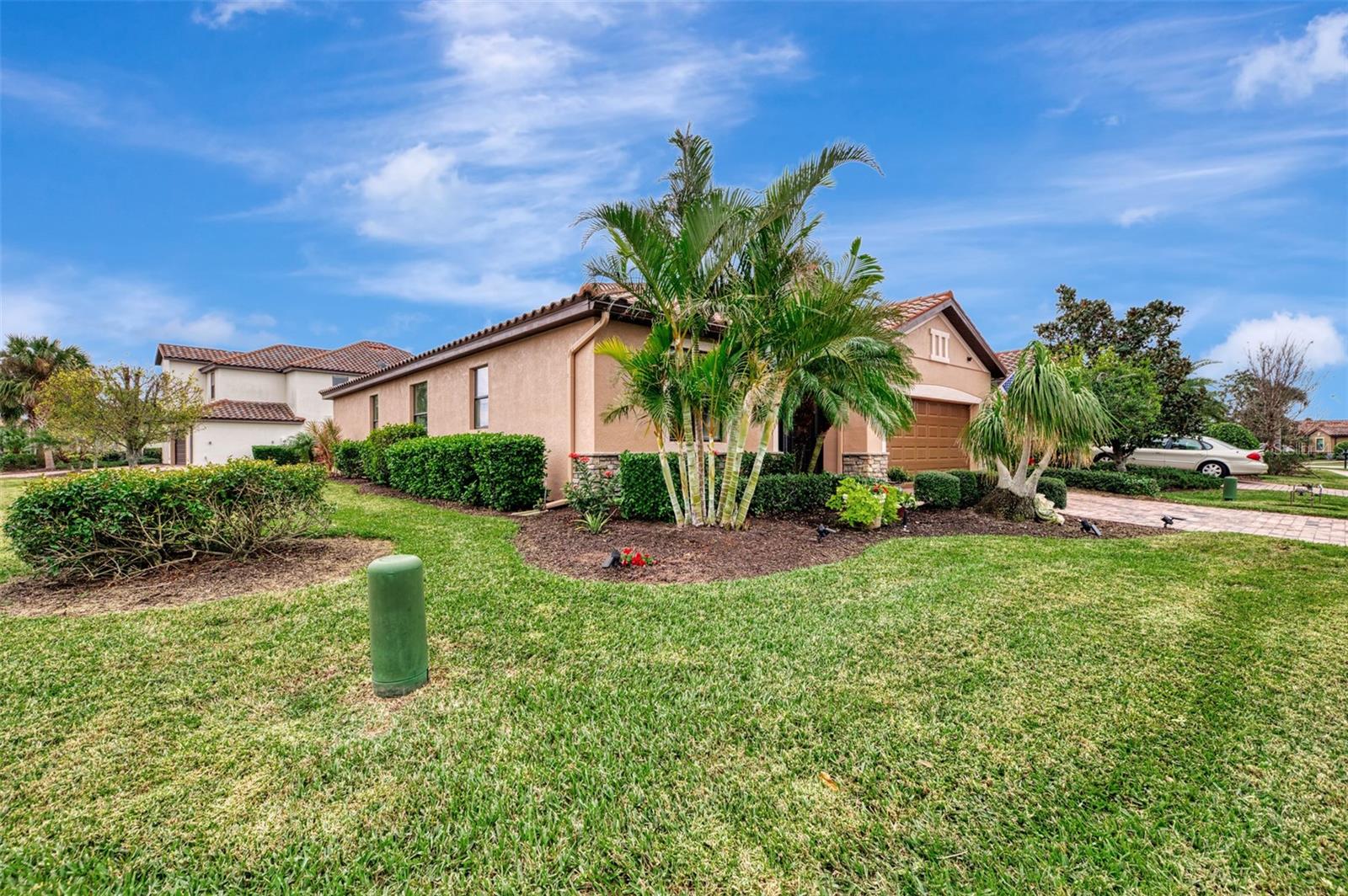 NO DAMAGE OR FLOODING FROM HURRICANE MILTON or Helene. WELCOME to this Stunning and IMMACULATELY maintained move-in ready home features an over abundance of natural light. This single story home is located in the highly sought after River Strand Golf and Country Club with 1628 sqft of living space and plenty of room for a pool. As you begin your tour you will notice the gorgeous tile floors and volume ceilings as you enter through the inviting foyer, passing through the foyer you will enter into the dining room which opens to both the kitchen and living room giving the home that open spacious floor plan. If cooking is your passion you will not be disappointed, this kitchen is equipped with stainless steel appliances, and gorgous gleaming stone countertops with plenty of space to move around with comfort, a large breakfast bar completes the space. The roomy master bedroom has an en-suite bathroom with dual sinks, a large garden soaking tub, separate shower and large walk-in closet. Additionally, you will find two spacious guest bedrooms and a guest bath with lanai access, upgraded fans and lighting throughout. Step outside into the cozy screened in outdoor space and relax as you take in the beautiful water views. FRESHLY PAINTED EXTERIOR 2024. Your life at River Strand is like being on vacation every day. Your social membership offers you access to the clubhouse/ restaurant, 2 community pools and spas, Tiki Bar, 6 satellite pools, 2 fitness centers, tennis, pickle-ball, and year-round social activities. HOA Fee includes Lawn Care, Cable, Internet and security of a Gated Community. Convenient to I-75, dining, shopping, Costco and our Beautiful Gulf coast beaches.