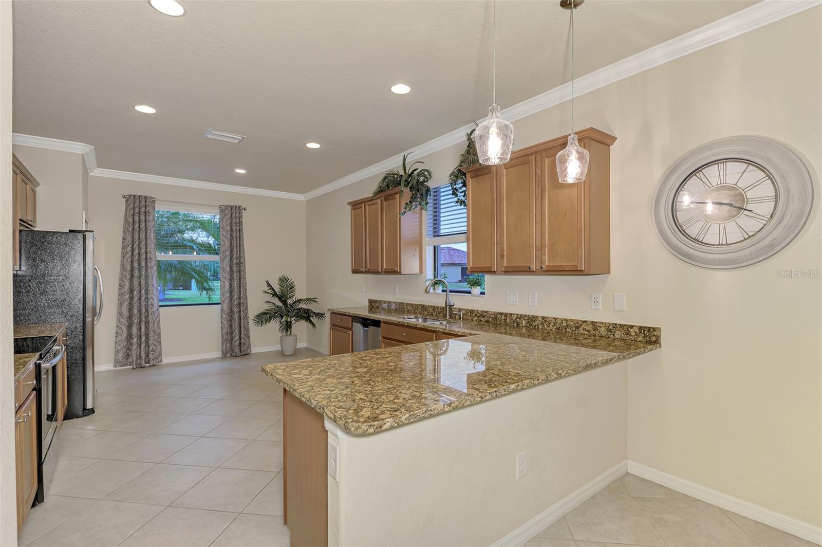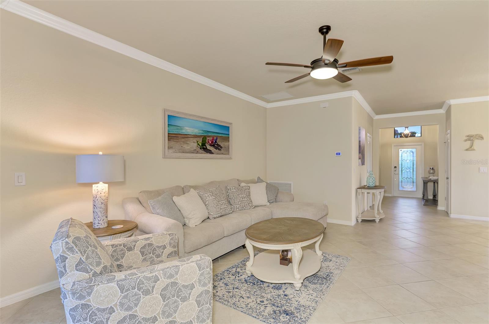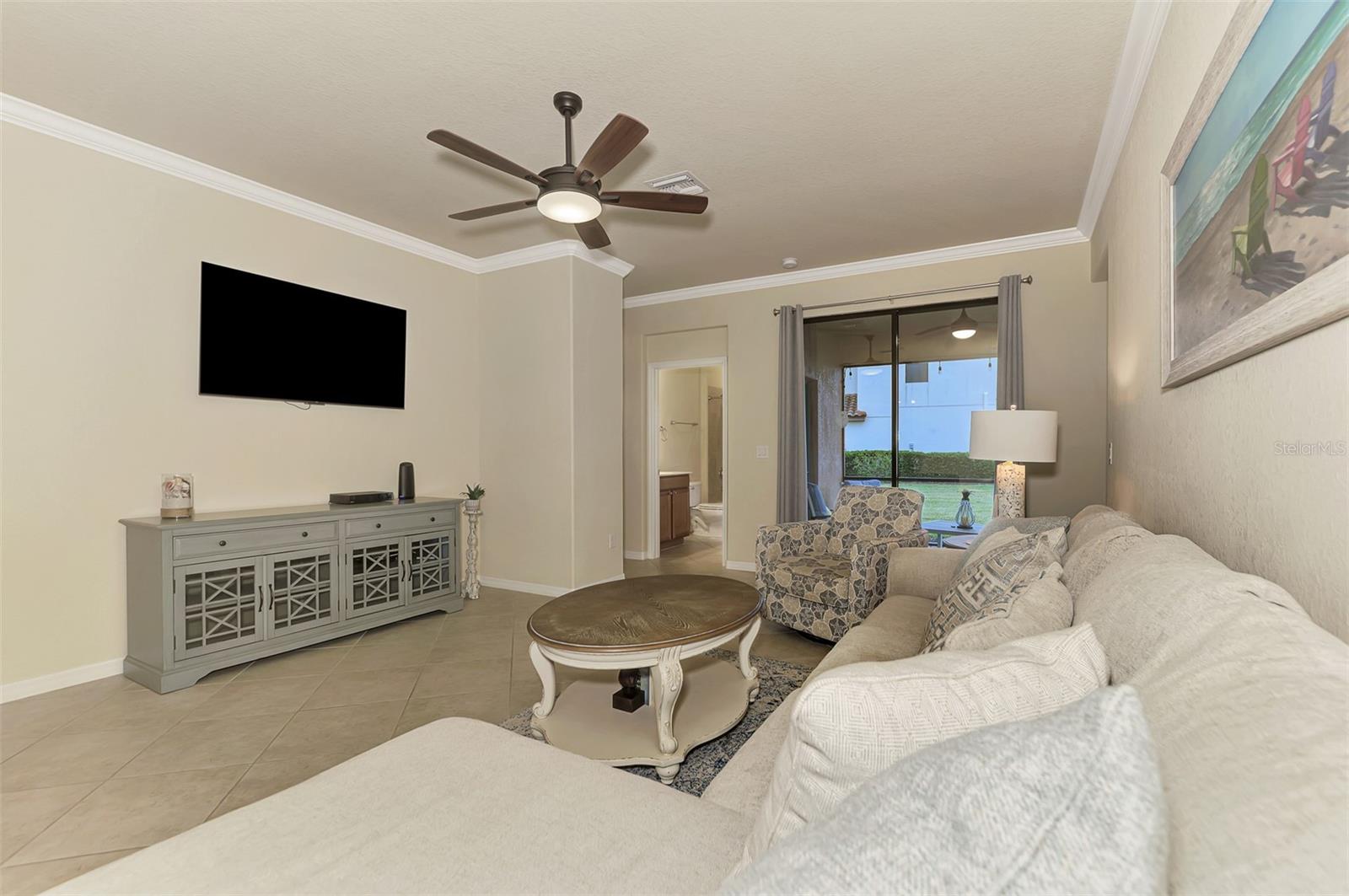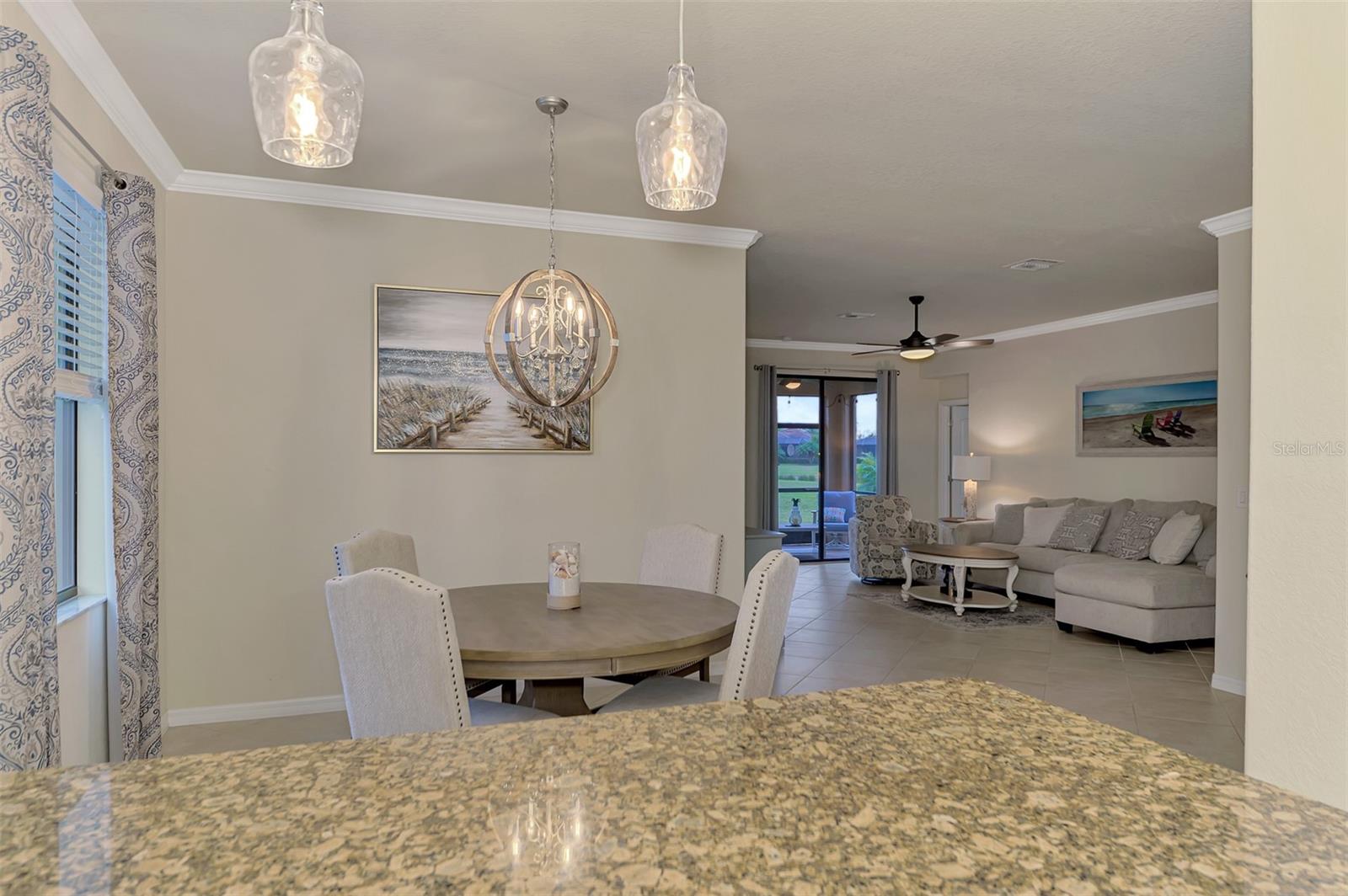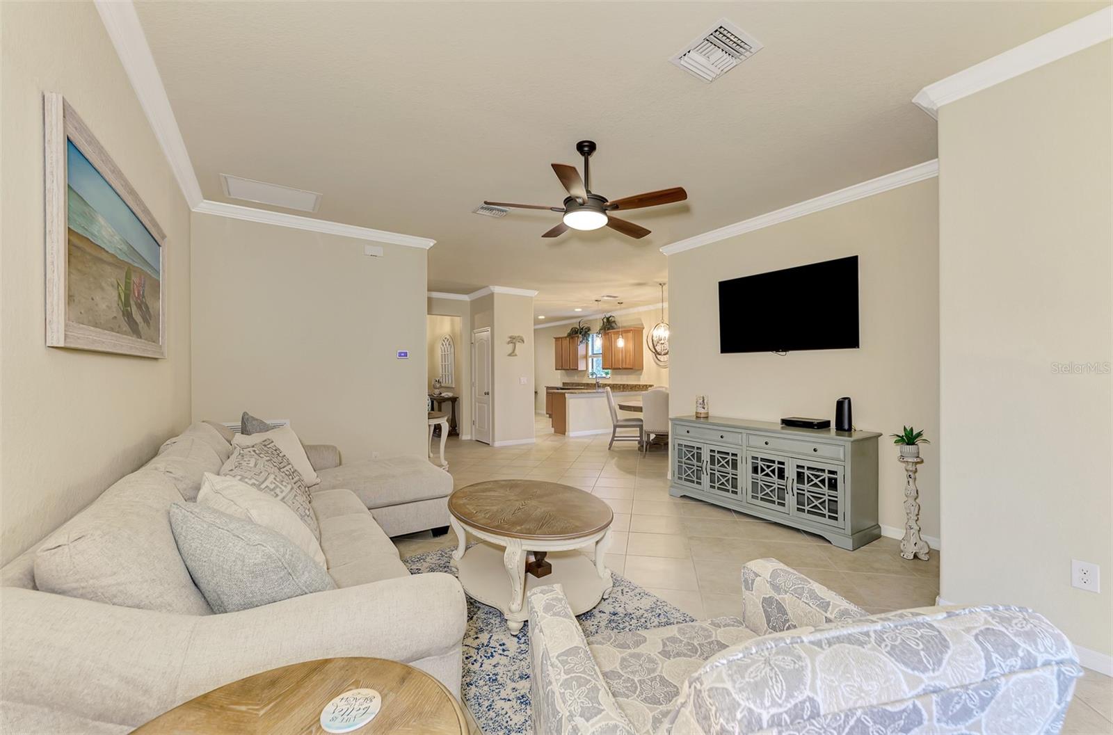 NO DAMAGE OR FLOODING FROM HURRICANE MILTON or Helene. WELCOME to this Stunning and IMMACULATELY maintained move-in ready home features an over abundance of natural light. This single story home is located in the highly sought after River Strand Golf and Country Club with 1628 sqft of living space and plenty of room for a pool. As you begin your tour you will notice the gorgeous tile floors and volume ceilings as you enter through the inviting foyer, passing through the foyer you will enter into the dining room which opens to both the kitchen and living room giving the home that open spacious floor plan. If cooking is your passion you will not be disappointed, this kitchen is equipped with stainless steel appliances, and gorgous gleaming stone countertops with plenty of space to move around with comfort, a large breakfast bar completes the space. The roomy master bedroom has an en-suite bathroom with dual sinks, a large garden soaking tub, separate shower and large walk-in closet. Additionally, you will find two spacious guest bedrooms and a guest bath with lanai access, upgraded fans and lighting throughout. Step outside into the cozy screened in outdoor space and relax as you take in the beautiful water views. FRESHLY PAINTED EXTERIOR 2024. Your life at River Strand is like being on vacation every day. Your social membership offers you access to the clubhouse/ restaurant, 2 community pools and spas, Tiki Bar, 6 satellite pools, 2 fitness centers, tennis, pickle-ball, and year-round social activities. HOA Fee includes Lawn Care, Cable, Internet and security of a Gated Community. Convenient to I-75, dining, shopping, Costco and our Beautiful Gulf coast beaches.