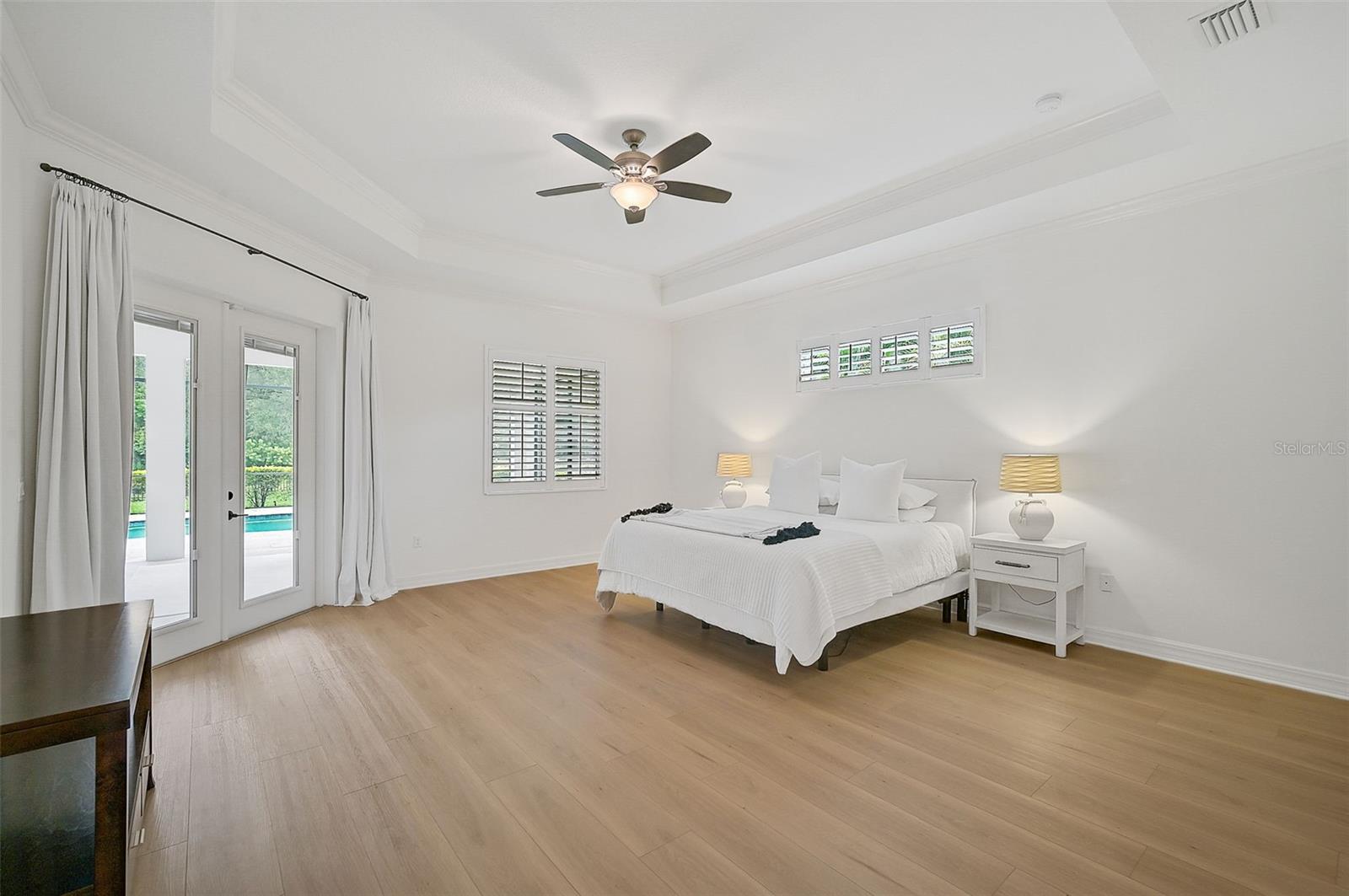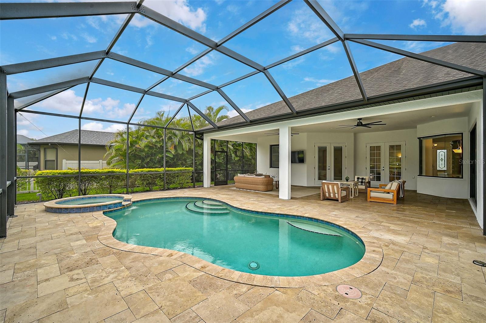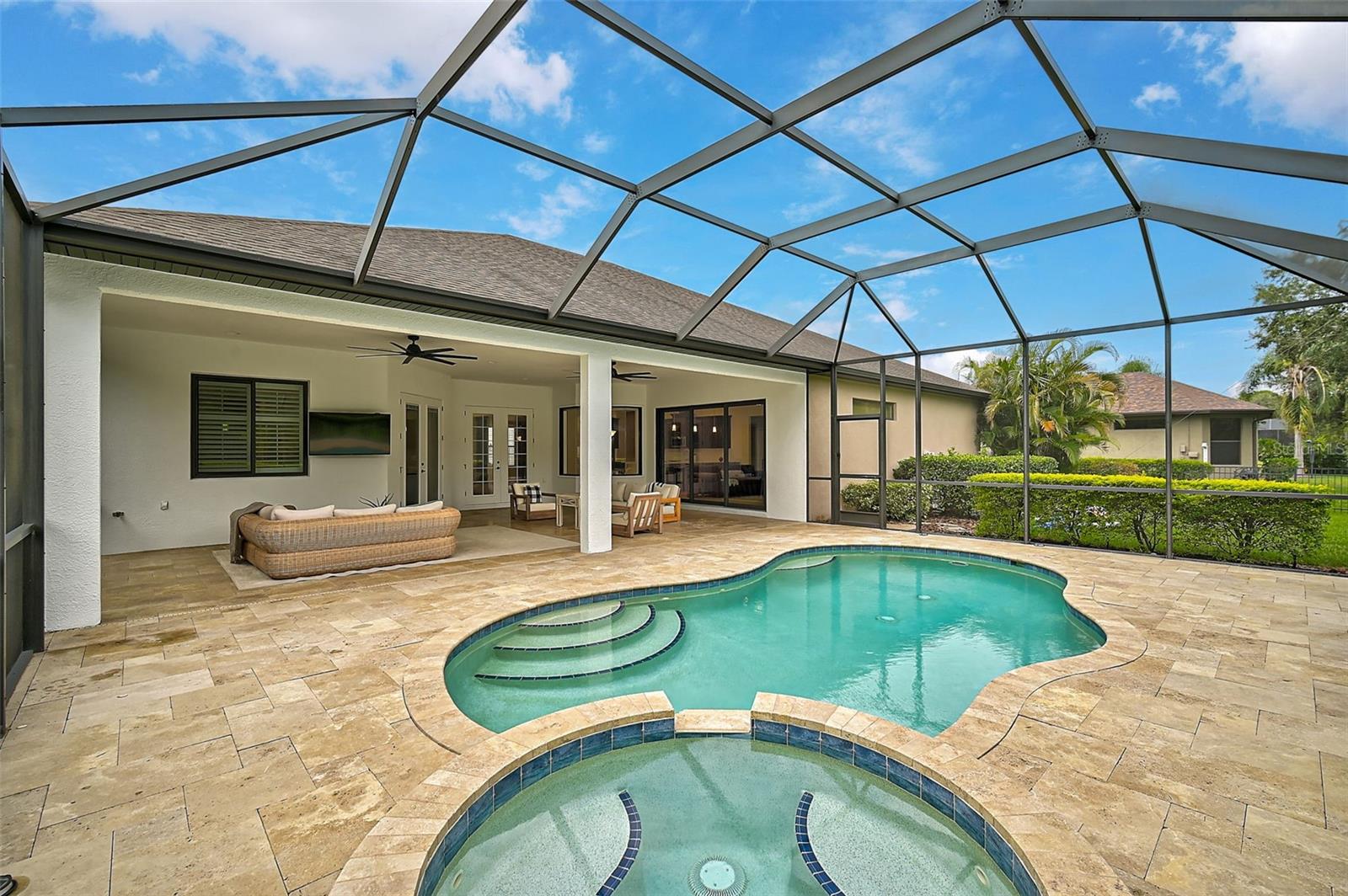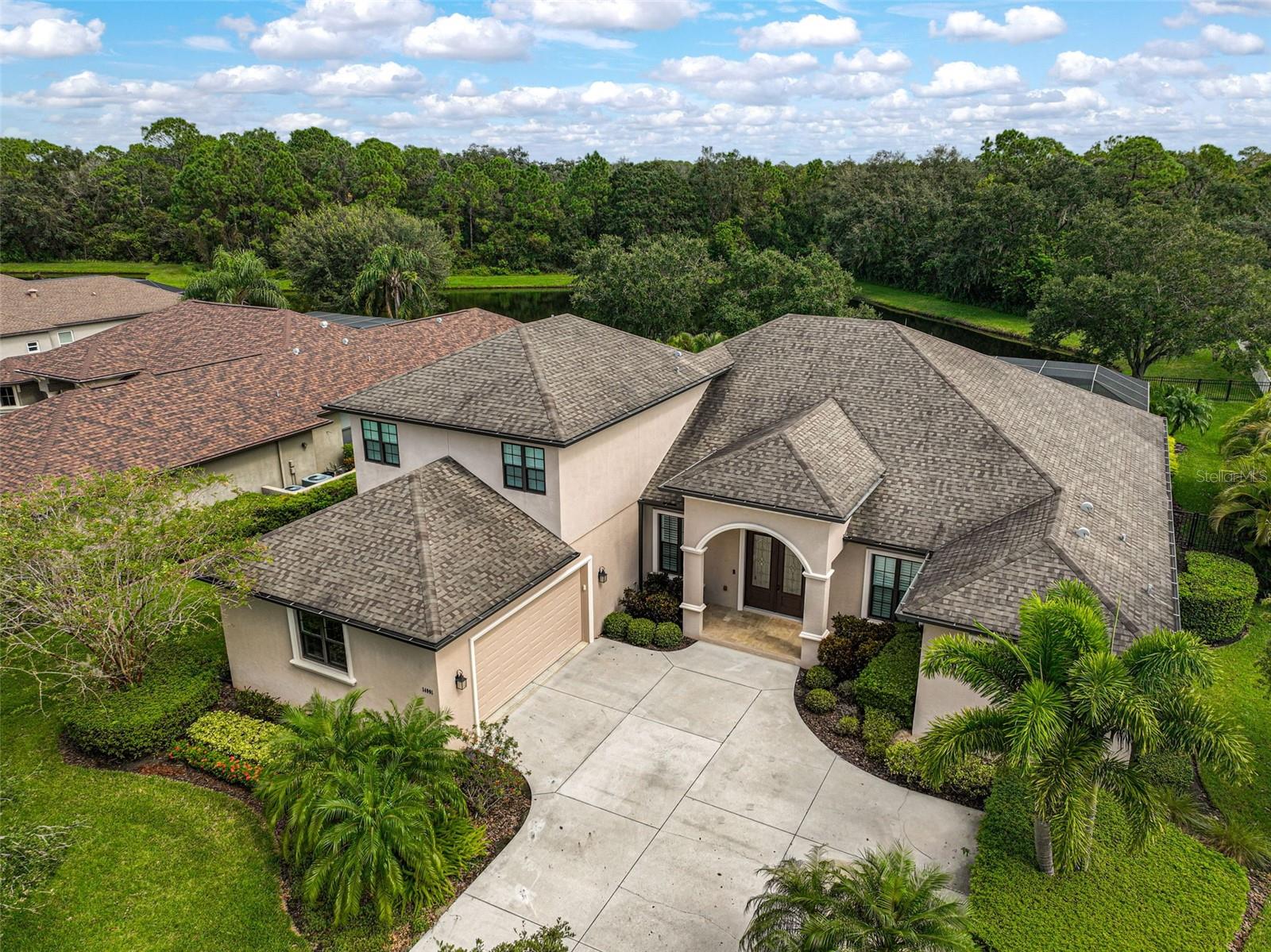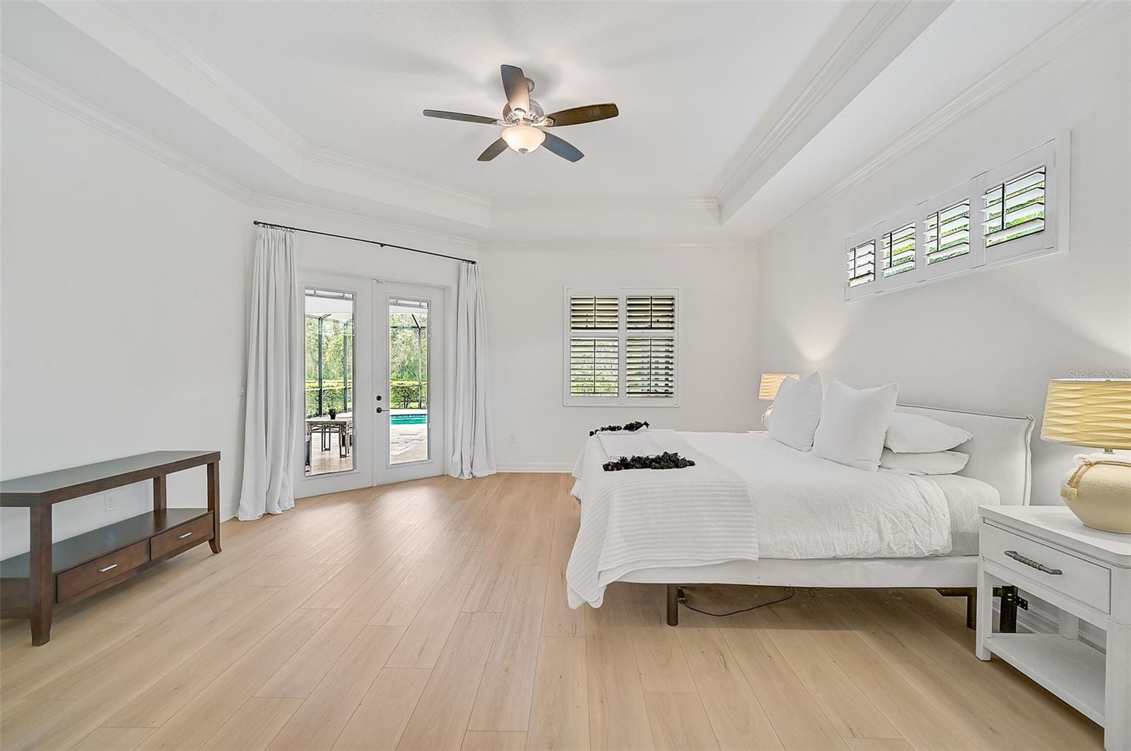 This stunning, updated POOL home is located in the highly sought-after Mill Creek neighborhood and offers nearly 3,900 square feet of living space. With 4 bedrooms, 3.5 baths, and an office/den, this home is perfect for those seeking both style and functionality. Inside, you'll find tray ceilings, new luxury vinyl plank floors, updated fixtures, and impact windows adorned with plantation shutters. The split-bedroom plan ensures privacy, while the magnificent owner's suite boasts French doors leading to the lanai and custom California closet systems. The kitchen is beautifully upgraded with stainless steel appliances, quartz countertops, and abundant natural light. The family room is equipped with surround sound, and in-ceiling stereo speakers extend to the lanai, creating the perfect ambiance for indoor and outdoor entertaining. The saltwater pool features a fountain, hot tub, and a picturesque view of the beautifully landscaped and fenced backyard. Additional highlights include under-stair storage, an expansive laundry room, and a versatile bonus room/4th bedroom upstairs with a full bath, ideal for a media room, private gym, or playroom. The 2.5-car garage offers epoxy floors and overhead storage for added convenience. Don’t miss the chance to live in one of Bradenton's most desirable neighborhoods with a low HOA and proximity to shopping, dining, entertainment, beaches, and more.