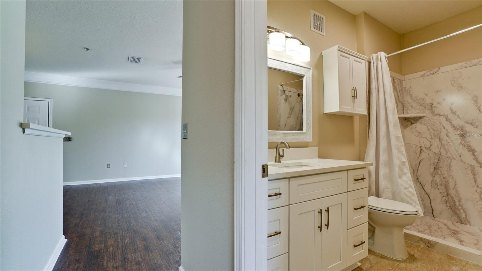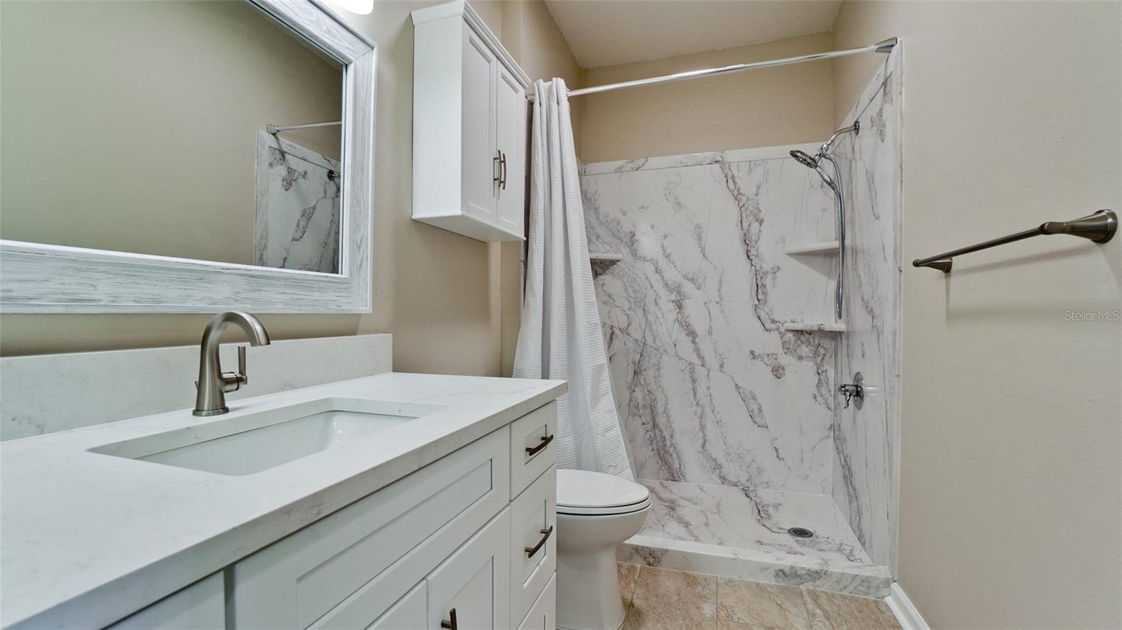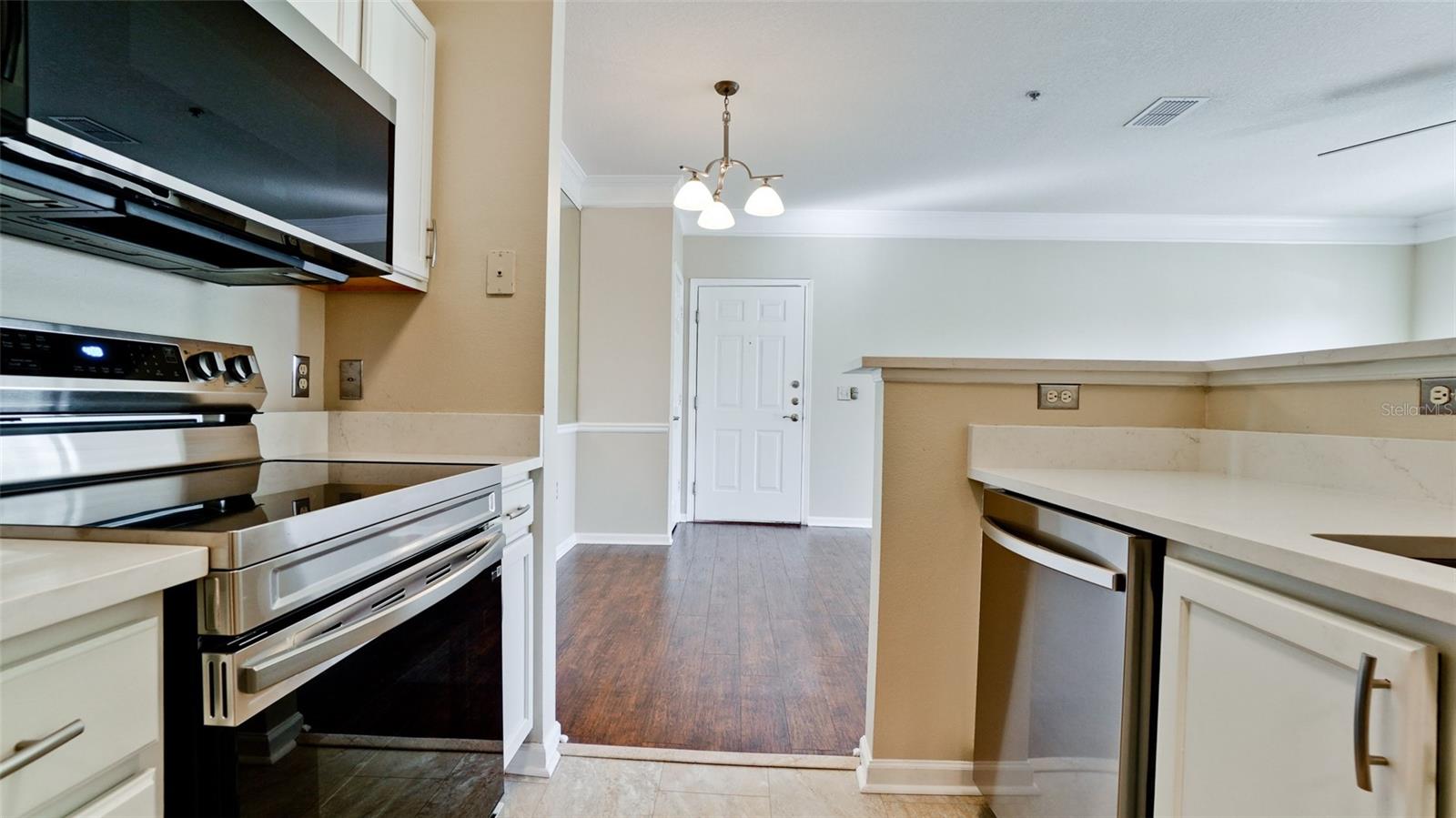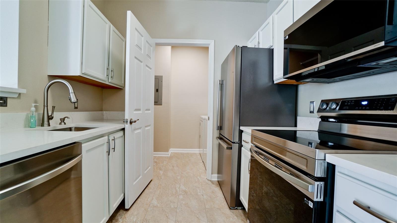One or more photo(s) has been virtually staged. Completely updated (Sept 2024) 2 bedroom 1 bathroom WITH A GARAGE. All new Stainless Steel kitchen appliances, upgraded quartz counters, undermount deep SS sink & Insinkerator with pull-out Delta faucet. Total bathroom renovation includes solid wood vanity with soft close doors/drawers, quartz countertop, under-mount sink, Delta faucet, toilet, above toilet storage cabinet, mirrored medicine cabinet, framed vanity mirror & LED light bar with custom oversized walk-in shower (garden tubs found in all other units). All undersink plumbing and shut-off valves have been replaced. New bedroom carpet and luxury vinyl plank flooring in kitchen, laundry room, and bathroom. Freshly painted walls, doors, trim, and porch flooring. New door & cabinet hardware, switchplates, lighting fixtures, Hunter Fans, and a/c vents. Lots of storage in the master walk-in closet, hallway linen closet, entry closet, and extra large utility room with shelving. The large screened front porch overlooks tranquil green space and includes a bonus storage closet for beach equipment. The adjacent garage has a newly installed garage door opener with one remote control and an exterior keypad. The a/c unit is 3 years old and has been serviced every 6 months. The scraped wood laminate flooring in the main living and hallway was installed in 2016. An older model washer & dryer in excellent condition are included. This condo development is gated and conveniently located 5 miles from the beautiful beaches of Anna Maria Island. Walmart and shopping/restaurants are minutes away. Distance to Sarasota Bradenton International Airport (SRQ) is 8 miles and Tampa International Airport (TPA) is 48 miles. This unit was damage-free from Hurricane Helene and Hurricane Milton (Sept/Oct 2024).
