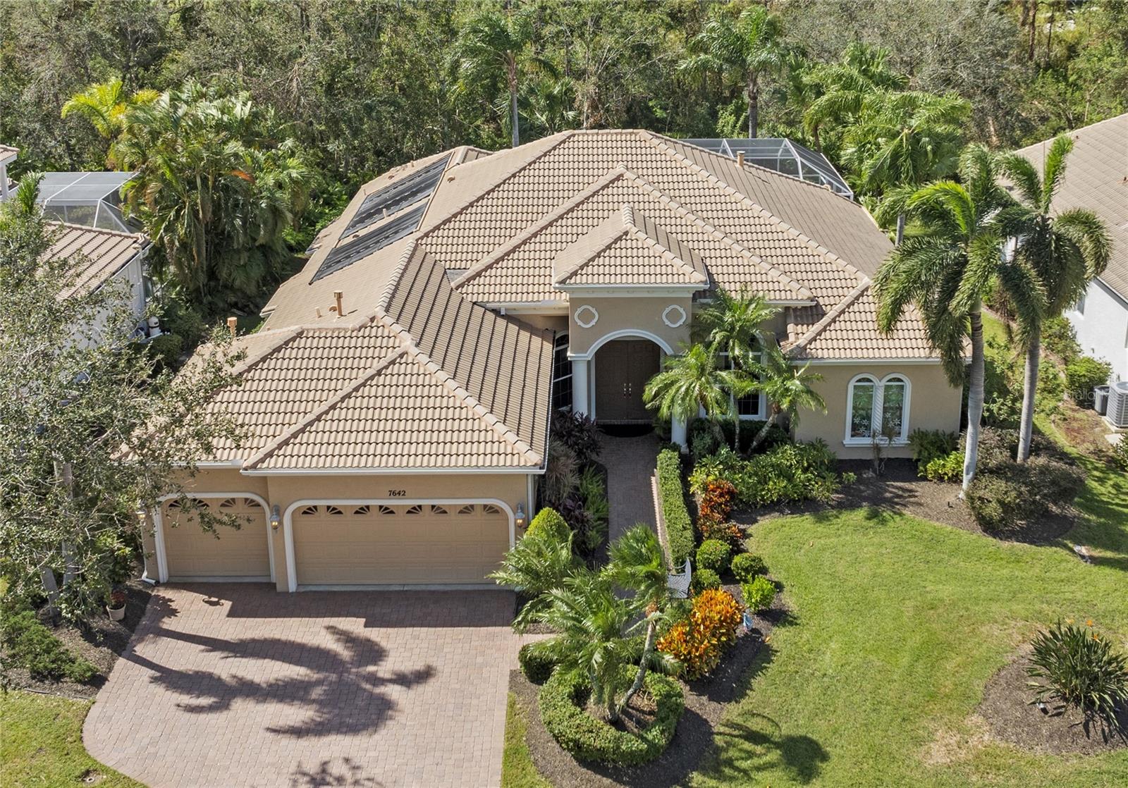Step into luxury in this 3 bedroom, 3 bath home plus a private office. Located in the highly coveted Sanctuary neighborhood of River club, with a paver driveway and walkway, this residence embodies elegance at every turn. High ceilings, crown moldings, designer fans and architectural features elevate the living experience. As you enter through the impressive double door foyer, you are greeted by the expansive great room which boasts a stunning wall of sliders offering breathtaking views of the lanai and beautiful tropical landscaping beyond. Read a good book or watch TV in front of a cozy fireplace with built-in shelfing. The dining room, featuring a tray ceiling, adds a touch of sophistication. The heart of the home, an island kitchen with stepped wood cabinets, built in pantry, stainless steel appliances, undercounter lighting and a convenient desk open to a charming breakfast room with access to the verandah-perfect for morning coffee or casual dining. The primary suite is a Sanctuary of its own. The bedroom includes a sitting area with bright windows and a door opening onto the lanai, dual closet and linen closet. The bathroom offers a walk-in shower and separate jetted tub, linen closet, dual vanities, a makeup vanity, and window seat. The colorful cut glass windows add a custom touch with the option of remove them to reveal clear glass. On the other side of the home there are 2 bedrooms. The front bedroom has 2 closets, a built-in desk and an adjacent bathroom. The back bedroom opens onto the lanai and has an adjacent bathroom. Practicality meets luxury in the spacious laundry room, complete with sink, ample storage, built-in ironing board, and gas access. A central vacuum system lightens your housework load. Across the hall there is a separate storage room great for all your seasonal or entertaining needs. Adding to the homes allure is an extensive built-in sound system with speakers in the great room, primary bedroom & bath, lanai and sun patio. A new HVAC system was installed in 2024.The lanai features a large saltwater, solar heated pool and spa. A covered verandah includes an outdoor kitchen with built-in bar, sink, refrigerator, and grill with exhaust fan. For sun lovers there is a separate sun patio off the lanai. Beyond the lanai escape with nature with a wooded view, lush palm trees, flowering shrubs, and night lighting contributing to a serene, private oasis-perfect for entertaining or unwinding in your personal paradise. This home comes with the confidence of an American Home Shield Warranty. Don't miss the opportunity to make this exceptional home yours! Please contact the listing agent for information on an optional New Tile Roof.