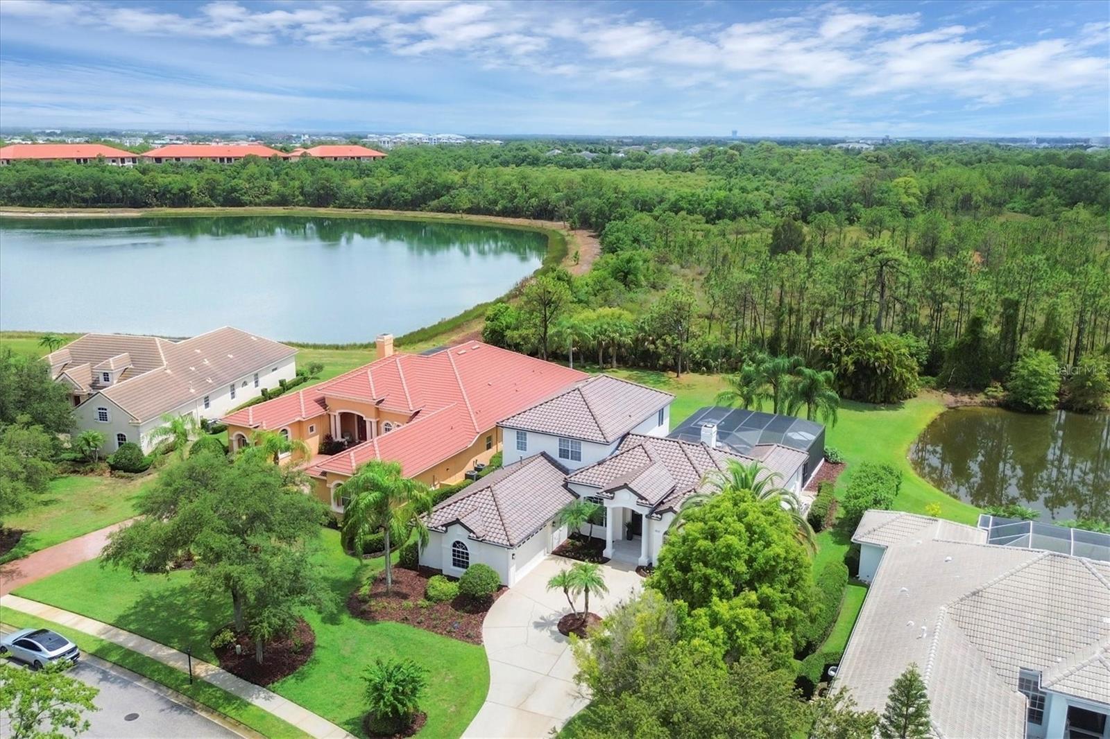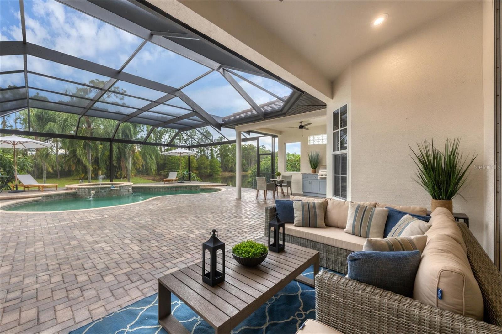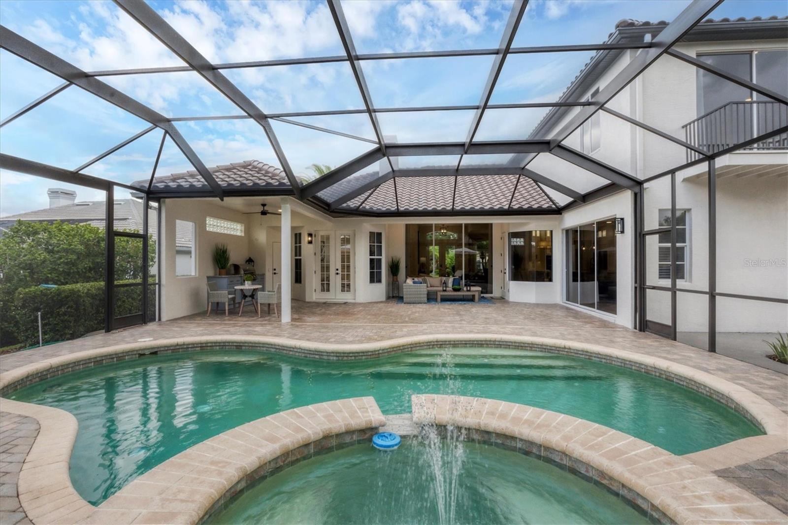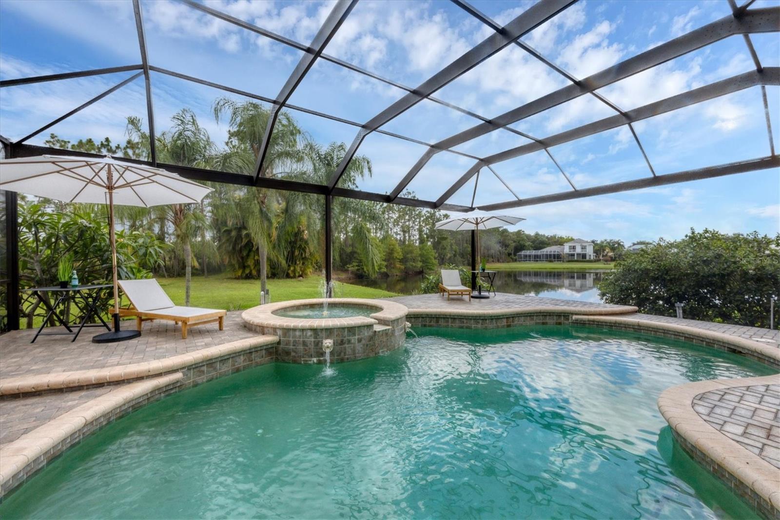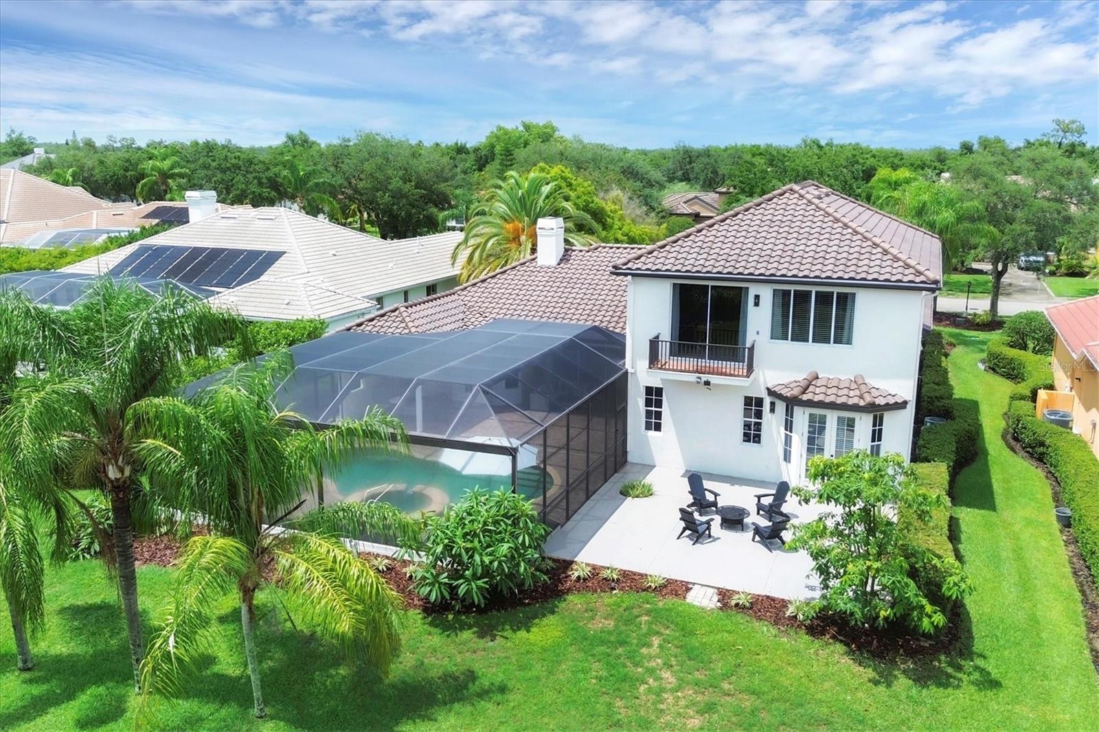 Totally remodeled Family Home with NEW TILE ROOF is now available in The Sanctuary of River Club! The is exquisite family home built by Todd Johnston offers 4 spacious bedrooms and 3 remodeled bathrooms! Located on a quiet cul-de-sac, this family home is loaded with upgrades and won’t last long! Step inside and be prepared to be amazed and the open floorplan with brand new kitchen! Don’t miss the gorgeous new cabinets, quartz countertops, beautiful backsplash and all new appliances and lighting! The first floor is adorned with gorgeous new engineered wood wide plank flooring! The living room overlooks the enormous lanai and spectacular saltwater pool and spa! The summer kitchen has a brand-new gas grill and plenty of outdoor cabinetry for all your entertaining needs. The pool cage is freshly painted with all new screens with panoramic views of the serene pond! Families will love the split floorplan with primary wing one side with fantastic primary bathroom with dual sinks, glamourous new shower with dual shower heads, free standing tub, new cabinets with quartz cabinets and separate water closet! The primary closet is fit for royalty with exceptional built-ins! The dining room has new wine wall and stunning new lighting that will impress the most discerning buyer! The family room opens to the outdoor space and allows for daily views of sunset skies! The generous size lot boats nearly a half-acre for furry friends and more! The generous size office is conveniently located in the rear of the home offering quiet space away from the heart of the home and private door to the exterior. A guest bedroom is located on the first floor adjacent to a remodeled full bath. Travel up the stairs to massive bonus room with a built-in workspace and viewing balcony for a breath of fresh air or taking in the sunset! Two additional guest rooms share a hall bath that has been remodeled with timeless choices! Buyers have peace of mind with two newer AC’s, freshly painted exterior and interior, new lighting inside and out and so much more! River Club is an optional golf community with NO CDD’s and minutes to Lakewood Ranch Main Street, Waterside and University Town Center! River Club has low HOA’s and located in between State Road 70 and University Parkway! The garage is an oversized 2 car, side load garage with room for a third car or extra storage space! This home has it all and ready for occupancy! Book your tour today and move in before the school year gets started!