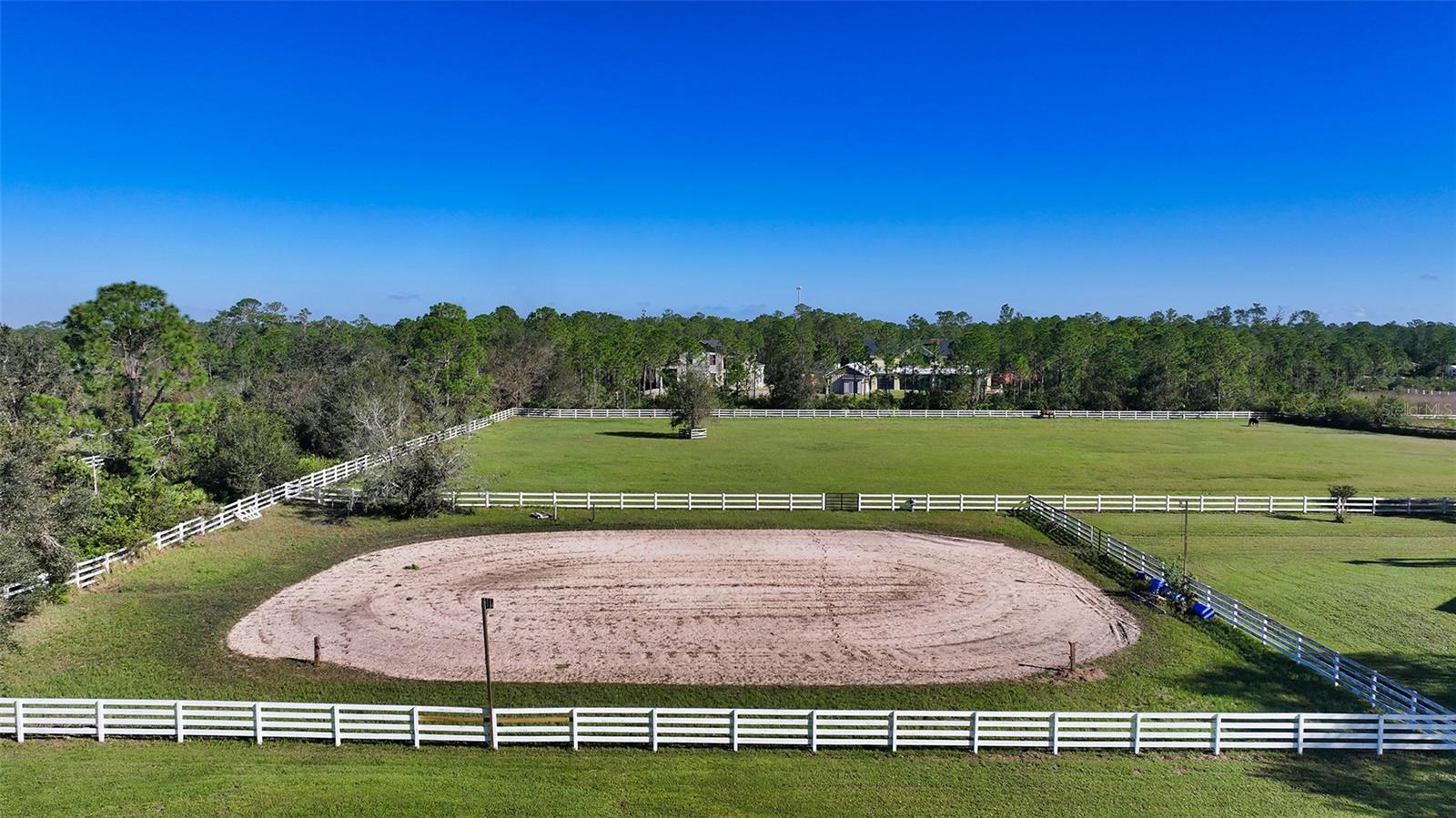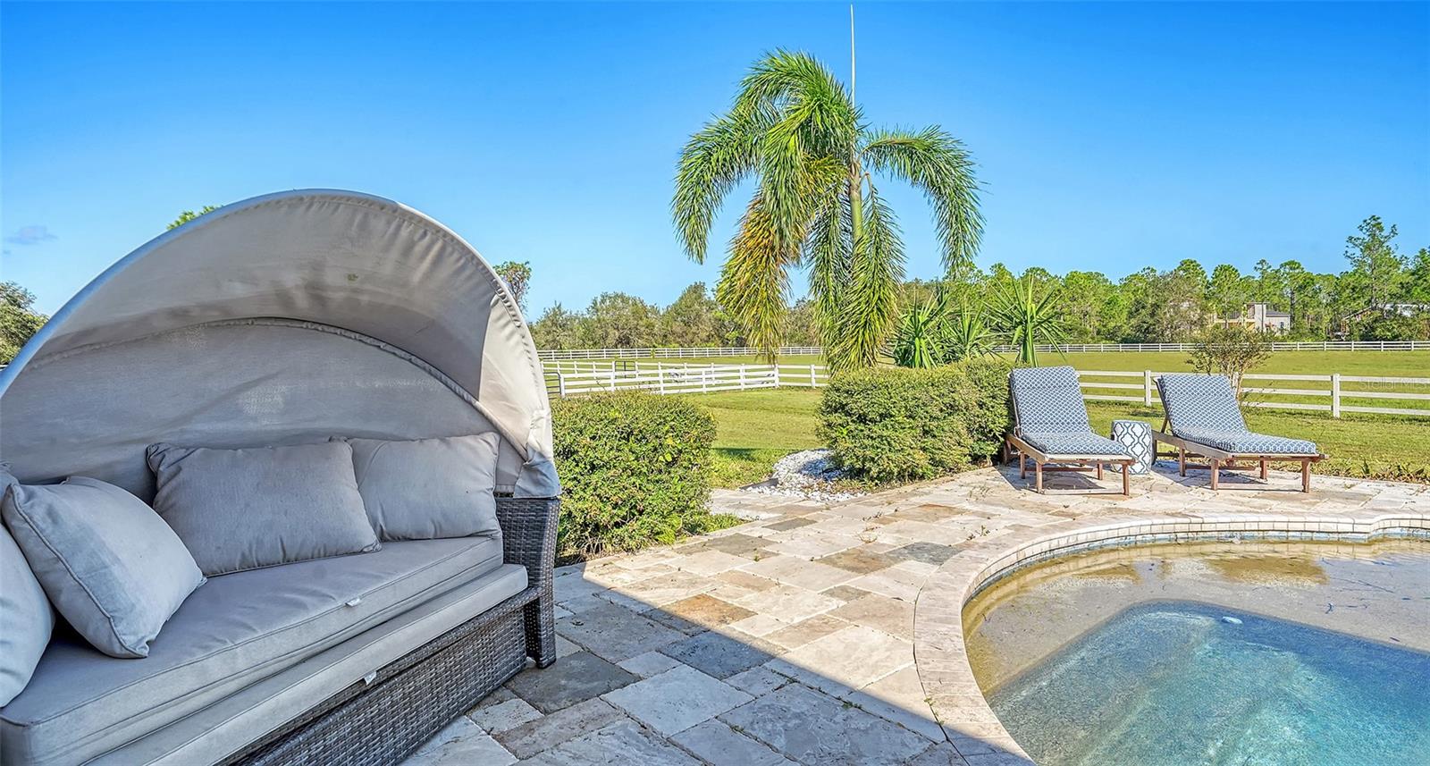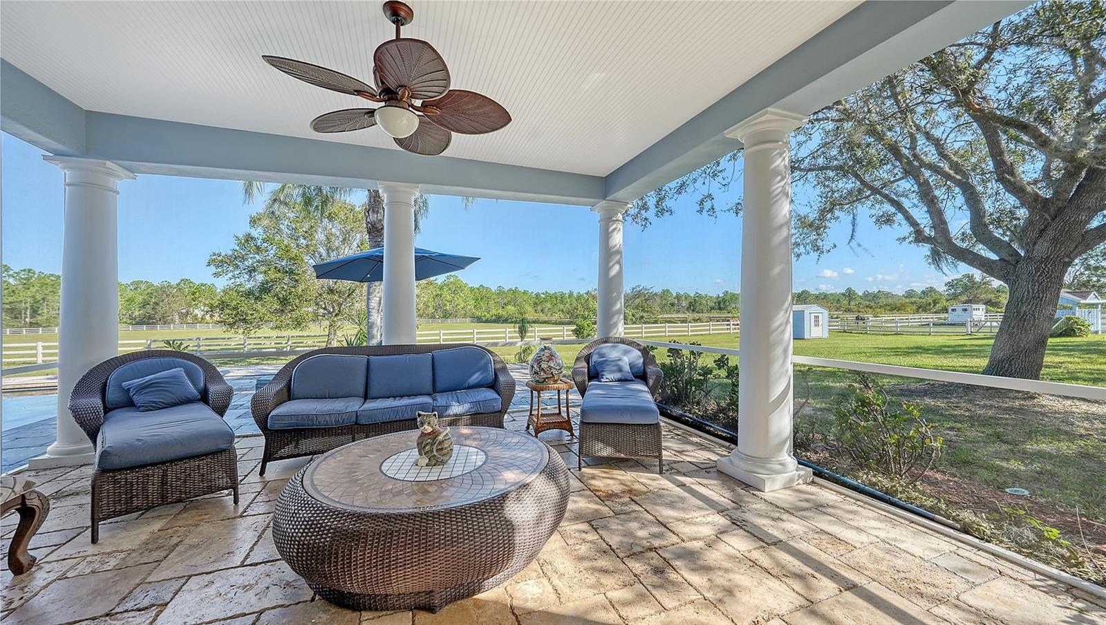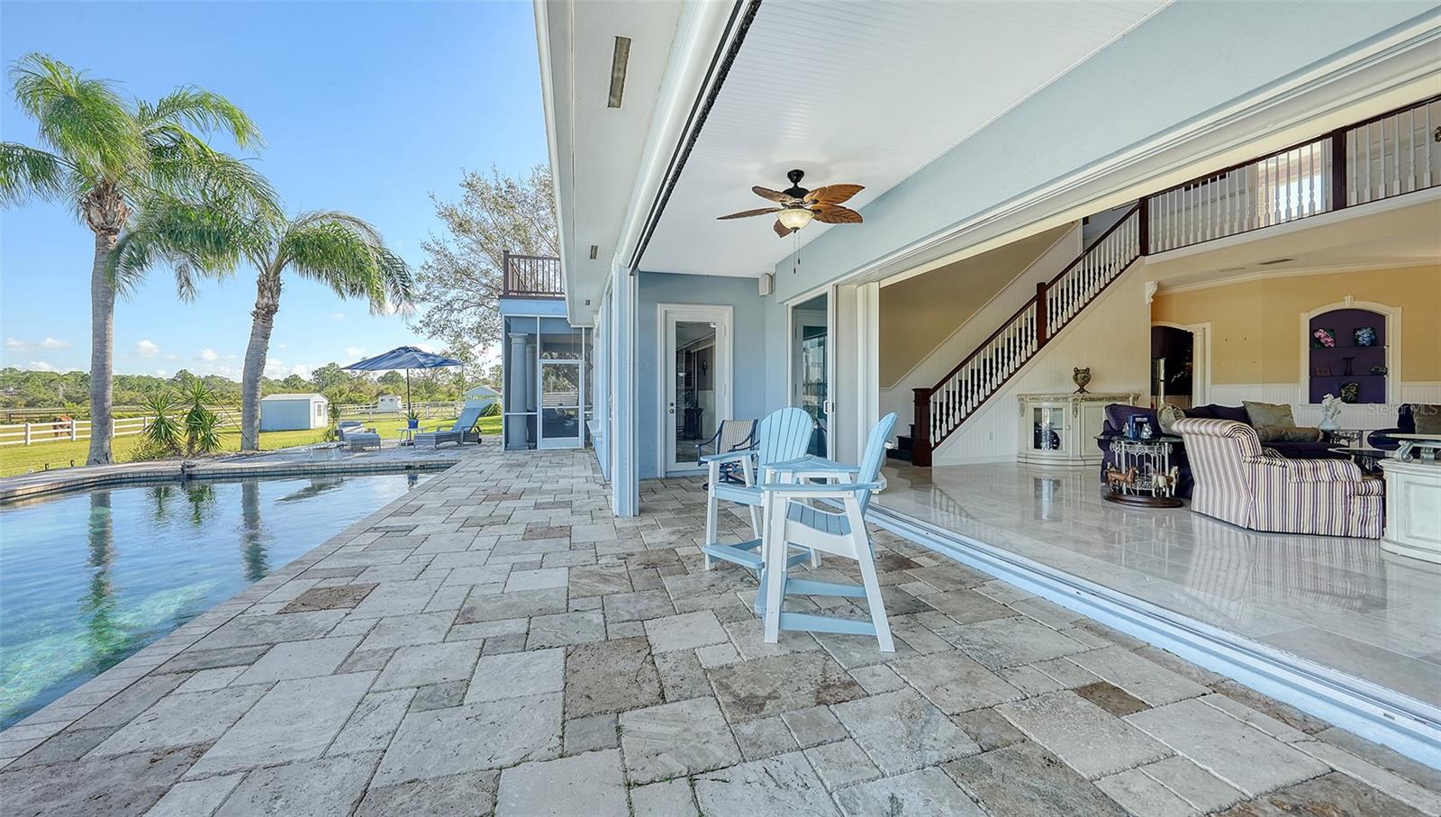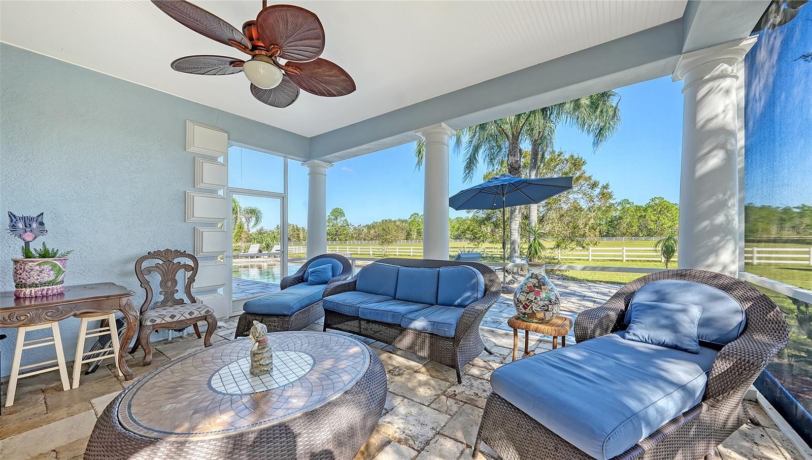 Discover 9+ acres of gated equestrian elegance in this storm-ready Panther Ridge estate, nestled in Foxwood—one of the most elite neighborhoods in this acreage enclave of Lakewood Ranch, America’s fastest-growing master-planned community. Here, luxury meets peace of mind, with Miami-Dade hurricane-rated windows, doors, and Martin garage doors throughout the home and barn, plus a 30 KW Generac generator powering essentials in both—ensuring comfort through any season. Even after three big hurricanes swept the area, this home stands strong in Zone X (no flood insurance required) at one of Manatee County’s highest elevations. Enter through the automatic gated entrance and wind past mature oaks and lush, fenced pastures to discover a masterpiece of style and function. The gourmet kitchen dazzles with handcrafted cherry cabinets, Cambria quartz counters, a 6-burner DACOR gas stove, Sub-Zero refrigerator, and Miele dishwasher—perfect for culinary enthusiasts who demand elegance and efficiency. The first-floor primary suite, with wood floors, gas fireplace, and surround sound, flows into a spa-inspired bath featuring travertine tile, a Mr. Steam shower, and a brass clawfoot tub, complemented by custom closets with locking cabinetry. The great room steals the show with 20-ft ceilings, polished marble floors, bespoke poplar built-ins, and a gas fireplace, opening to a lanai with an automatic screen for effortless indoor-outdoor living. Upstairs, a bonus room with a built-in bar spills onto a 1,000 sq ft TREX deck, offering stunning views of the barn, heated saltwater pool, and Jacuzzi. Two spacious bedrooms with walk-in closets and an equestrian-themed bath round out the upper level, all accented by solid cherry cabinetry and California shutters. Outside, entertain in style with a renovated summer kitchen on the second screened lanai, featuring granite counters, a Fire Magic grill, and a mini fridge. For equestrians and those seeking versatile space, the concrete barn offers four 12x12 stalls with an automatic fly system, RV outlets, potential for A/C with existing ductwork, and a mini bathroom. A tack room with marble floors, multiple wash racks, mats in all stalls, and a hurricane-rated automatic garage door complete this incredible space, which is also wired for internet, cable, and surround sound. The barn can also be converted into a workshop, guest residence, or parking for ATVs, cars, and more. Smart features like whole-home surround sound and a Control 4 system elevate the experience, while 15 miles of equestrian trails and proximity to Lakewood Ranch’s booming amenities—top schools, shopping, dining, and entertainment—make this location unbeatable. Just minutes from Lakewood Ranch’s vibrant town centers, this Foxwood gem offers the best of acreage living in a community that’s redefining growth in the USA. Best of all, it’s directly contiguous to The Concession Golf & Country Club, a prestigious Jack Nicklaus-designed championship course, where you can drive your own golf cart for a round of world-class golf. Watch the Panther Ridge Community video (https://pix360.com/vtour/9765/) to see why this estate blends storm-ready resilience with timeless elegance—a rare find ready to be your forever home.