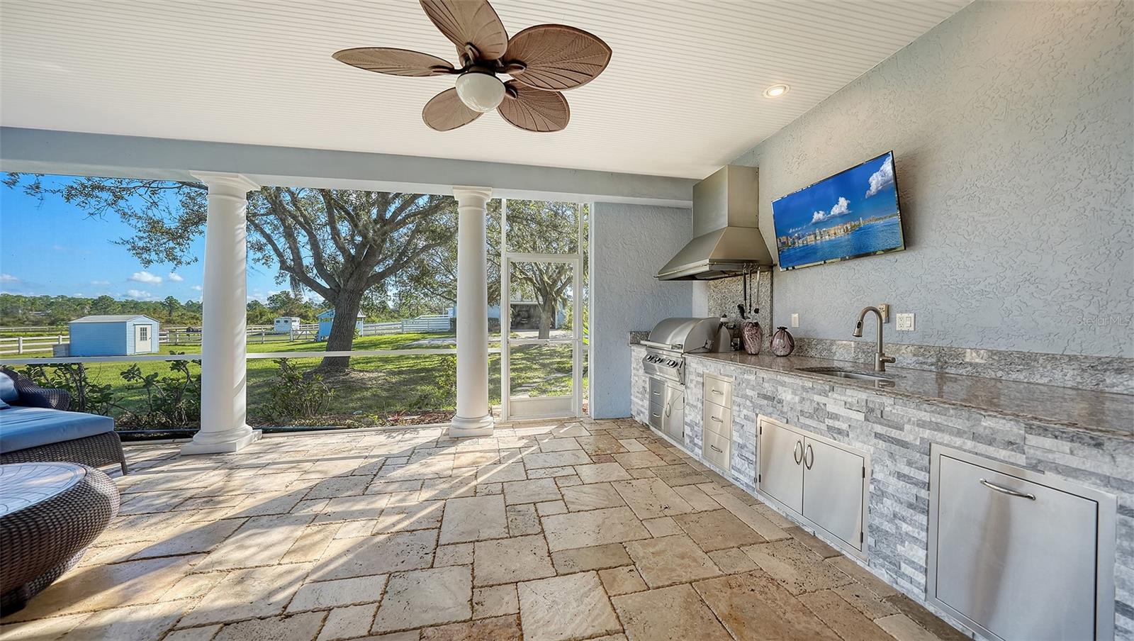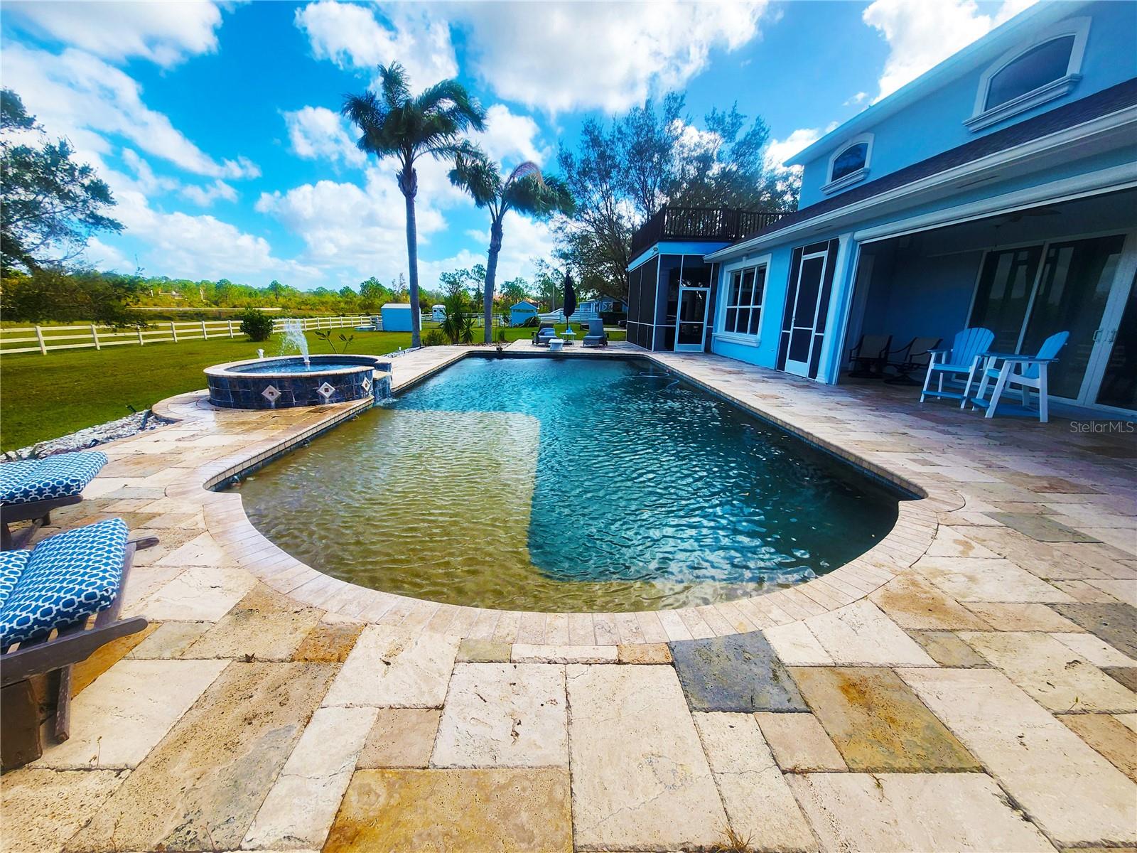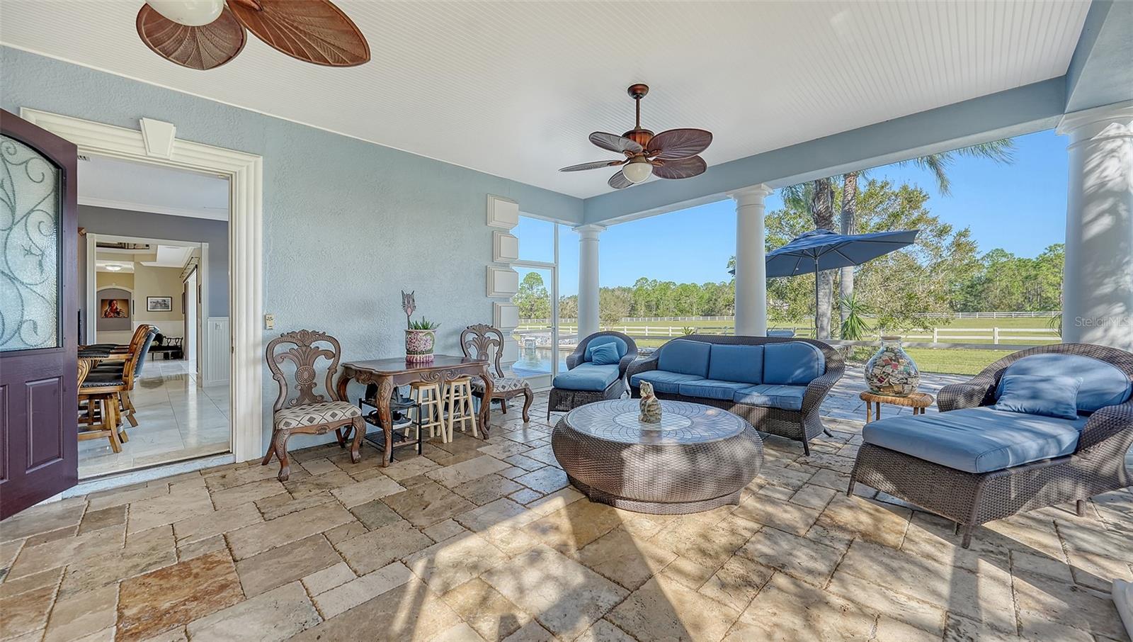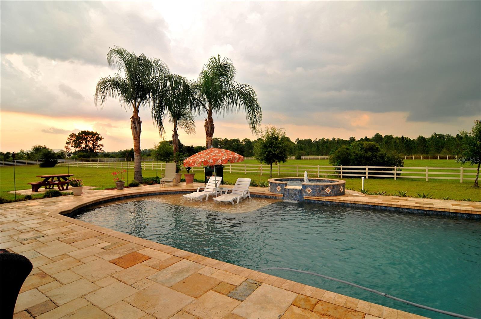 Discover 9+ acres of gated equestrian elegance in this storm-ready Panther Ridge estate, nestled in Foxwood—one of the most elite neighborhoods in this acreage enclave of Lakewood Ranch, America’s fastest-growing master-planned community. Here, luxury meets peace of mind, with Miami-Dade hurricane-rated windows, doors, and Martin garage doors throughout the home and barn, plus a 30 KW Generac generator powering essentials in both—ensuring comfort through any season. Even after three big hurricanes swept the area, this home stands strong in Zone X (no flood insurance required) at one of Manatee County’s highest elevations. Enter through the automatic gated entrance and wind past mature oaks and lush, fenced pastures to discover a masterpiece of style and function. The gourmet kitchen dazzles with handcrafted cherry cabinets, Cambria quartz counters, a 6-burner DACOR gas stove, Sub-Zero refrigerator, and Miele dishwasher—perfect for culinary enthusiasts who demand elegance and efficiency. The first-floor primary suite, with wood floors, gas fireplace, and surround sound, flows into a spa-inspired bath featuring travertine tile, a Mr. Steam shower, and a brass clawfoot tub, complemented by custom closets with locking cabinetry. The great room steals the show with 20-ft ceilings, polished marble floors, bespoke poplar built-ins, and a gas fireplace, opening to a lanai with an automatic screen for effortless indoor-outdoor living. Upstairs, a bonus room with a built-in bar spills onto a 1,000 sq ft TREX deck, offering stunning views of the barn, heated saltwater pool, and Jacuzzi. Two spacious bedrooms with walk-in closets and an equestrian-themed bath round out the upper level, all accented by solid cherry cabinetry and California shutters. Outside, entertain in style with a renovated summer kitchen on the second screened lanai, featuring granite counters, a Fire Magic grill, and a mini fridge. For equestrians and those seeking versatile space, the concrete barn offers four 12x12 stalls with an automatic fly system, RV outlets, potential for A/C with existing ductwork, and a mini bathroom. A tack room with marble floors, multiple wash racks, mats in all stalls, and a hurricane-rated automatic garage door complete this incredible space, which is also wired for internet, cable, and surround sound. The barn can also be converted into a workshop, guest residence, or parking for ATVs, cars, and more. Smart features like whole-home surround sound and a Control 4 system elevate the experience, while 15 miles of equestrian trails and proximity to Lakewood Ranch’s booming amenities—top schools, shopping, dining, and entertainment—make this location unbeatable. Just minutes from Lakewood Ranch’s vibrant town centers, this Foxwood gem offers the best of acreage living in a community that’s redefining growth in the USA. Best of all, it’s directly contiguous to The Concession Golf & Country Club, a prestigious Jack Nicklaus-designed championship course, where you can drive your own golf cart for a round of world-class golf. Watch the Panther Ridge Community video (https://pix360.com/vtour/9765/) to see why this estate blends storm-ready resilience with timeless elegance—a rare find ready to be your forever home.