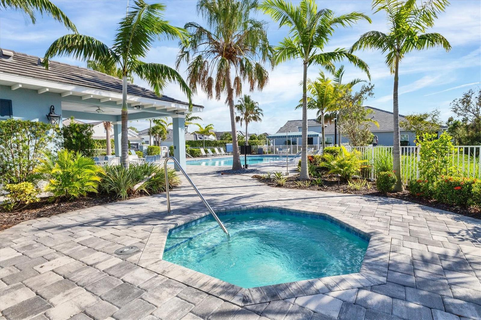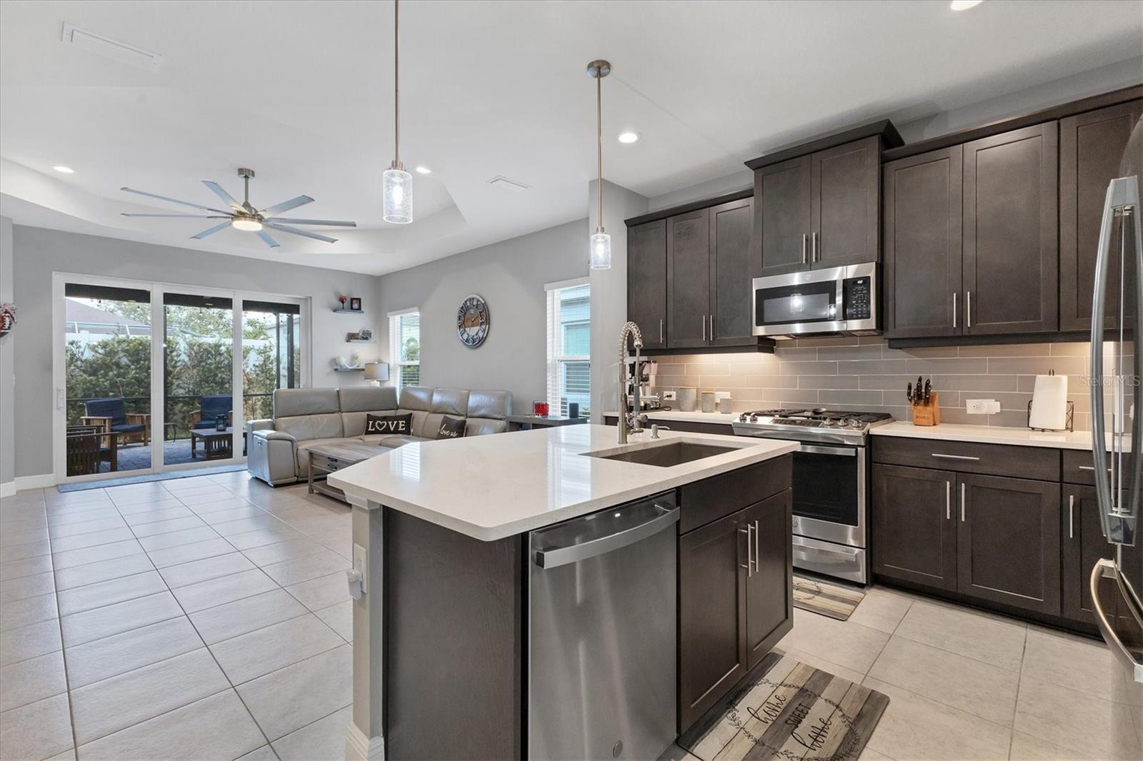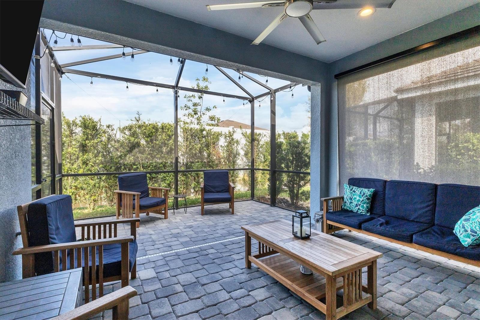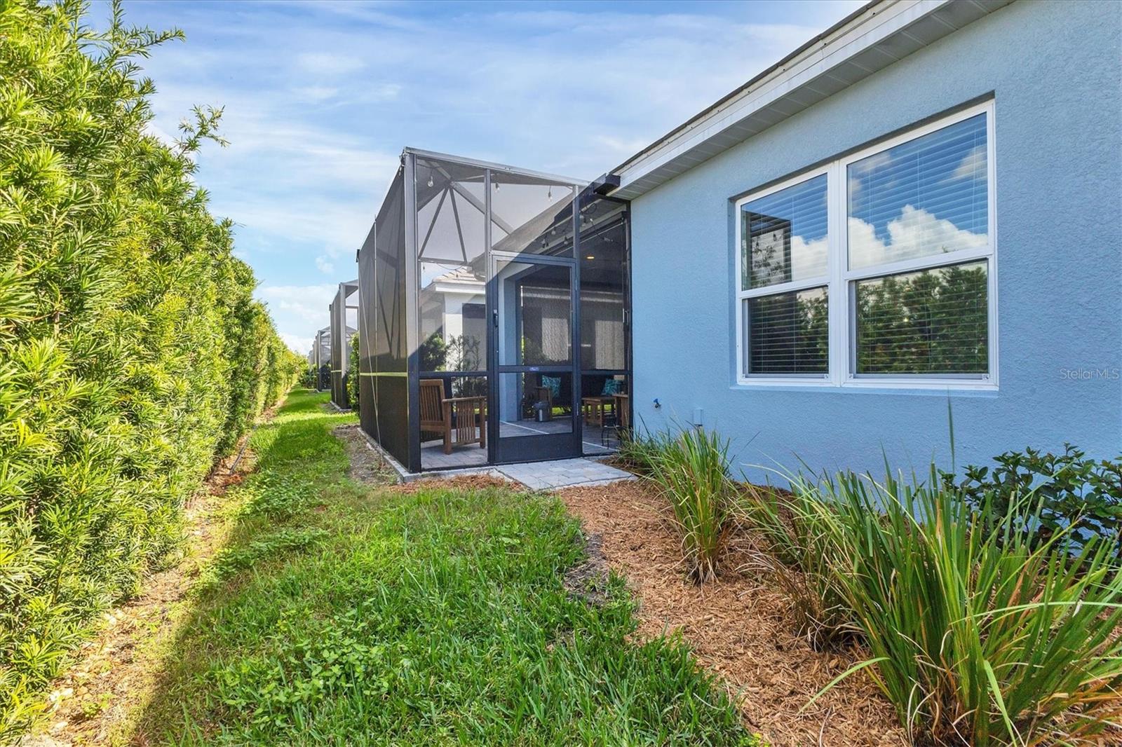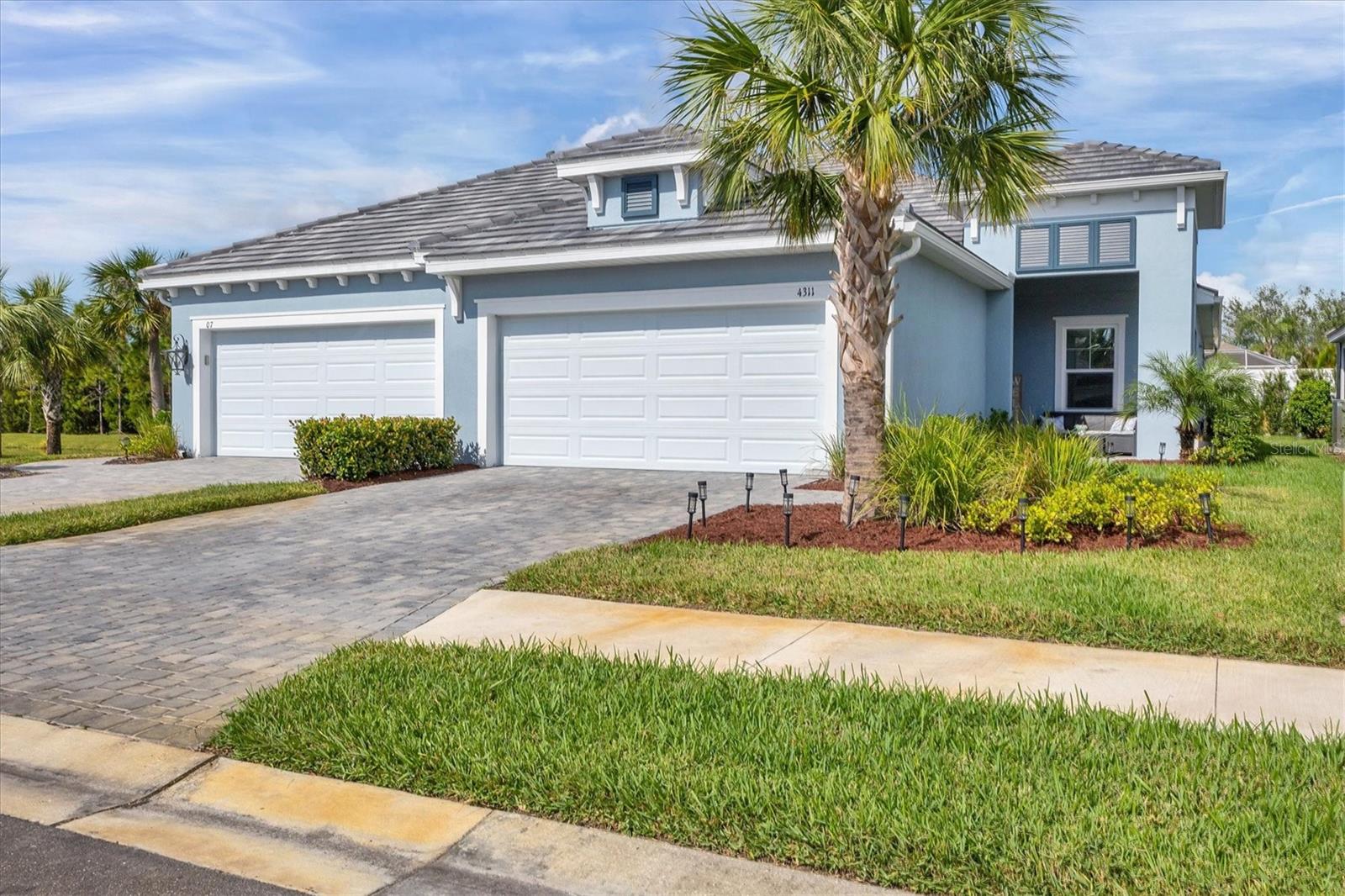 The recent PRICE IMPROVEMENT, makes this gorgeous home 2 years young home extremely affordable. Not only is it in a beautiful boutique development of only 88 homesites (Poinciana between University Parkway and State Road 70) it is in a cul-de-sac bordered by a pond, with no traffic noise from the busy street north of the subdivision. This villa offers 2 bedrooms with a den/office which is big enough to add a chifforobe if the 3rd bedroom is needed. This home sets on a premium lot with over $50,000.00 builder upgrades including impact windows and doors, upgraded gutters, an extended screen porch, tile floors throughout, gas appliances, (range, dryer, outdoor grill, and water heater) just to name a few. The entire list of thoughtful upgrades is attached to this listing in the many attachments. The kitchen has beautiful quartz countertops with a center island, tall shaker wood cabinets and stainless appliances. The great room has a tray ceiling adorned with a huge ceiling fan as it opens onto the extended screened in lanai. Soon after purchasing the owners added custom lighting and ceiling fans. The staggered build of the villas on each side provides extra privacy and quiet while cooking on the grill or enjoying morning or evening coffee. The primary bedroom and en-suite are appointed with two large walk-in closets, dual vanities, floor-to-ceiling tile in the expansive shower, and a private water closet. This home comes with the usual builders' warranties in addition to a complimentary 1-year Home-Tech warranty. Furnishings are negotiable.