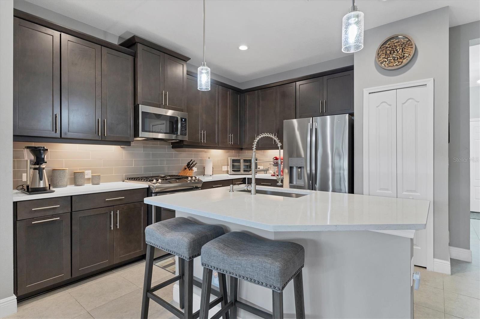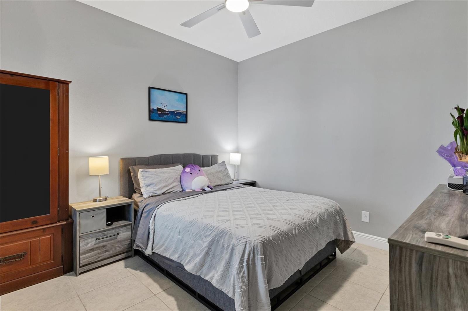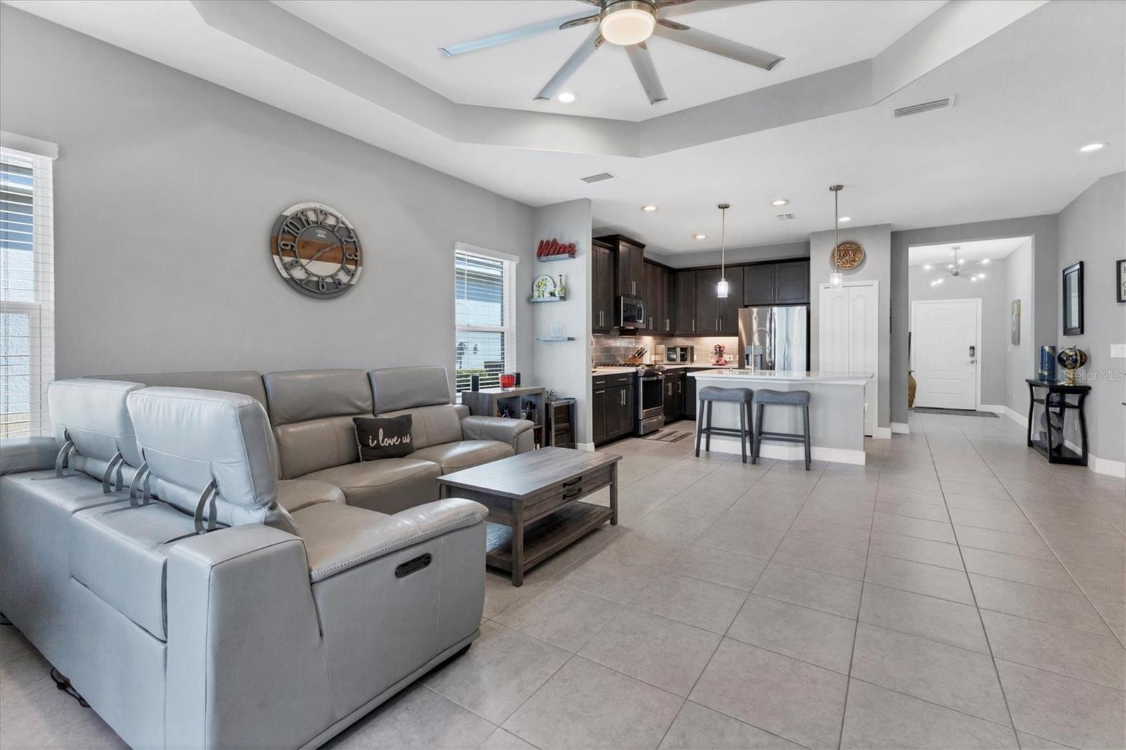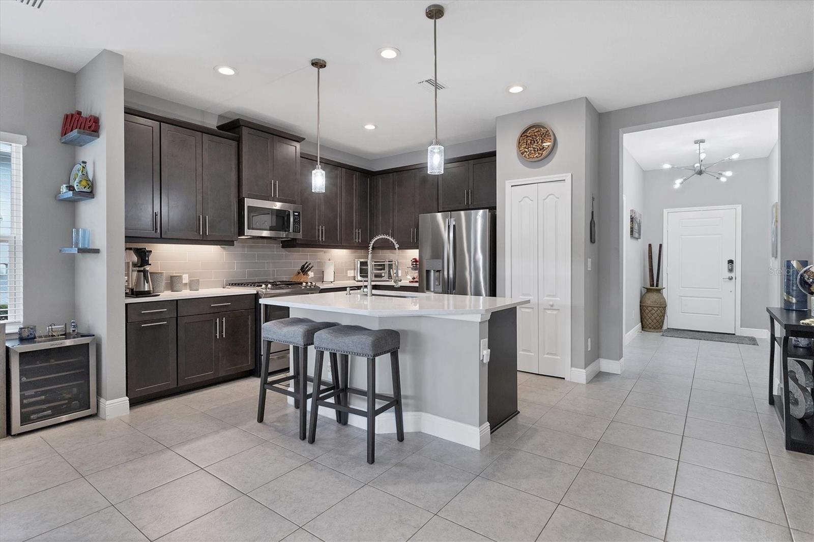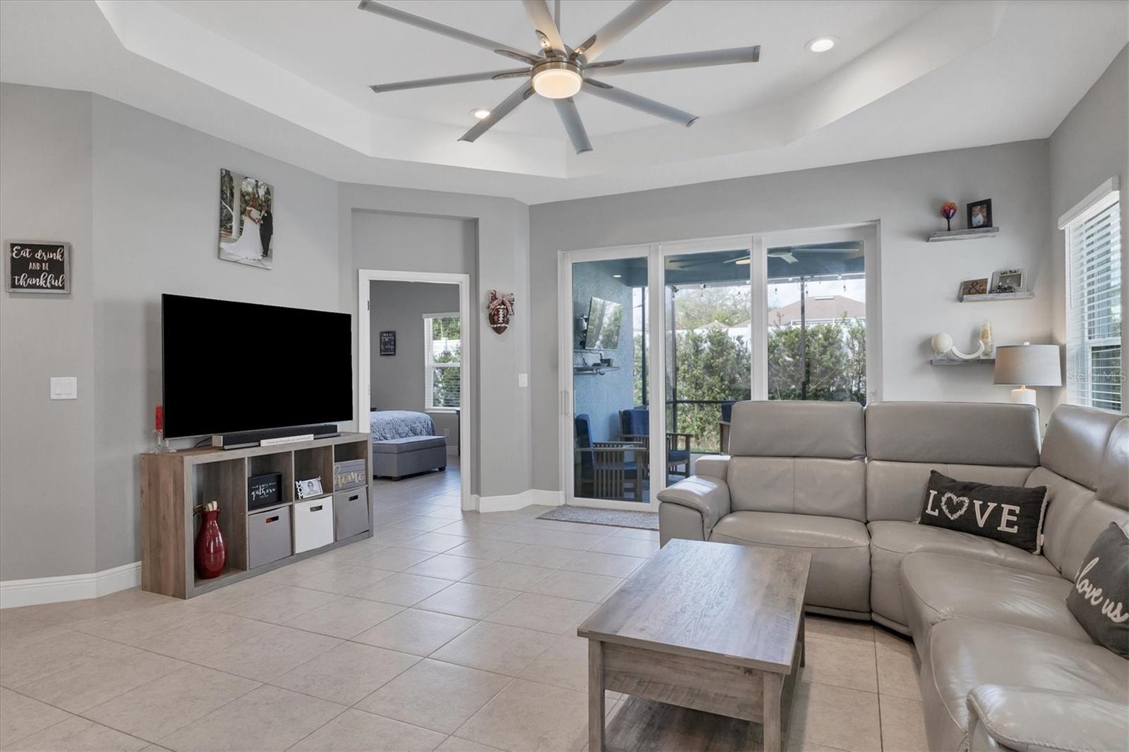 The recent PRICE IMPROVEMENT, makes this gorgeous home 2 years young home extremely affordable. Not only is it in a beautiful boutique development of only 88 homesites (Poinciana between University Parkway and State Road 70) it is in a cul-de-sac bordered by a pond, with no traffic noise from the busy street north of the subdivision. This villa offers 2 bedrooms with a den/office which is big enough to add a chifforobe if the 3rd bedroom is needed. This home sets on a premium lot with over $50,000.00 builder upgrades including impact windows and doors, upgraded gutters, an extended screen porch, tile floors throughout, gas appliances, (range, dryer, outdoor grill, and water heater) just to name a few. The entire list of thoughtful upgrades is attached to this listing in the many attachments. The kitchen has beautiful quartz countertops with a center island, tall shaker wood cabinets and stainless appliances. The great room has a tray ceiling adorned with a huge ceiling fan as it opens onto the extended screened in lanai. Soon after purchasing the owners added custom lighting and ceiling fans. The staggered build of the villas on each side provides extra privacy and quiet while cooking on the grill or enjoying morning or evening coffee. The primary bedroom and en-suite are appointed with two large walk-in closets, dual vanities, floor-to-ceiling tile in the expansive shower, and a private water closet. This home comes with the usual builders' warranties in addition to a complimentary 1-year Home-Tech warranty. Furnishings are negotiable.