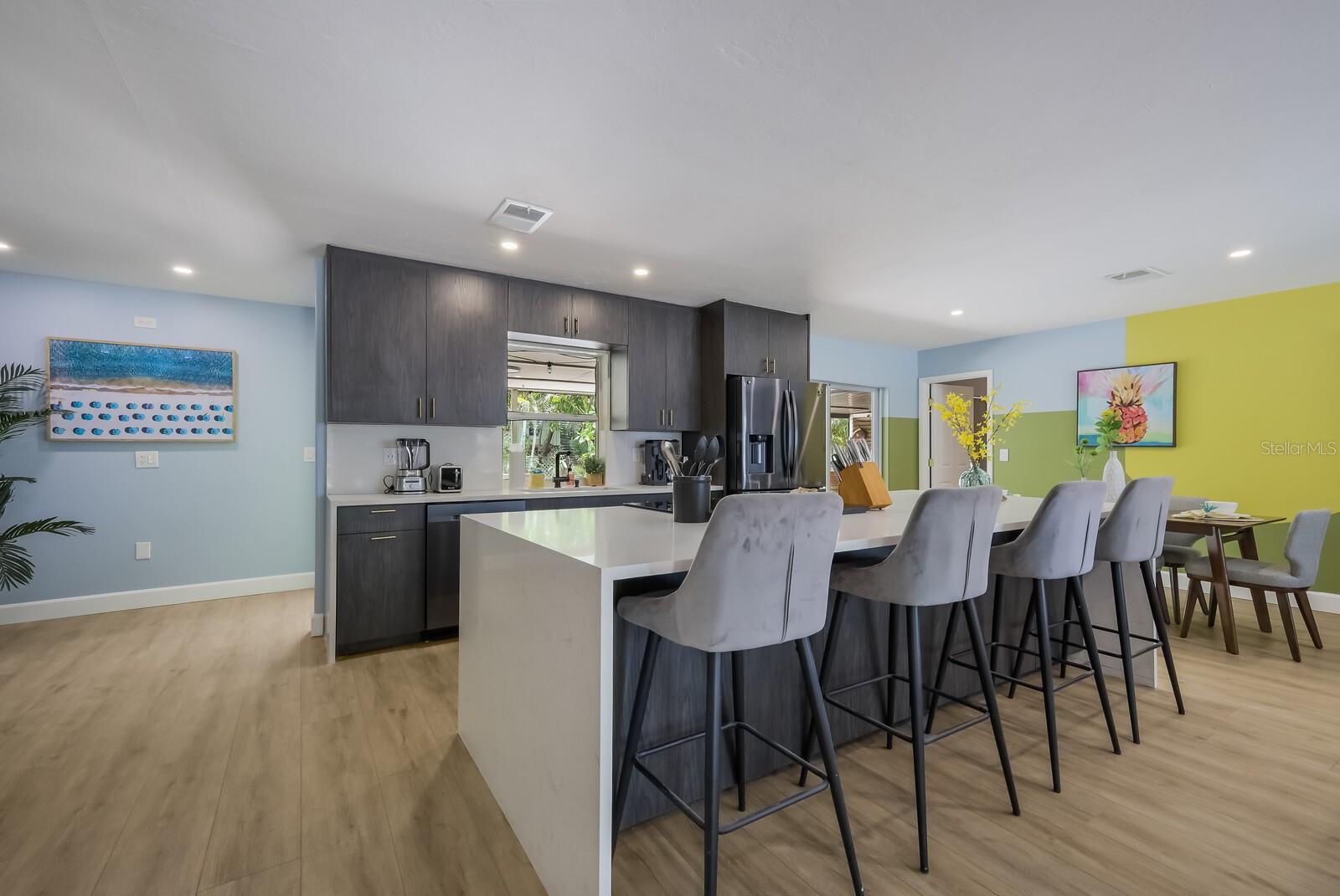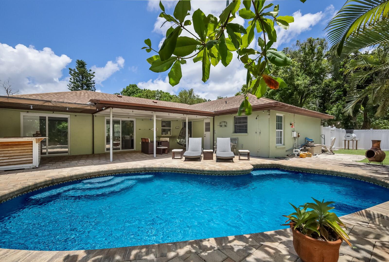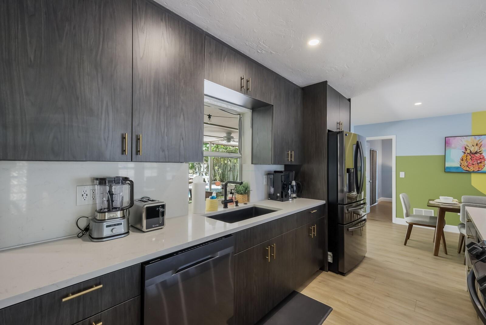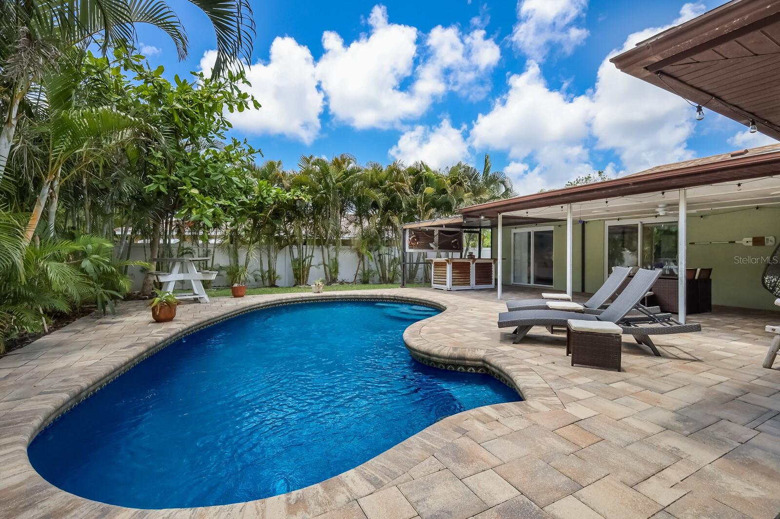 Located just five miles from our famous crystal sand beaches of Anna Maria Island you will find this stunning and newly renovated home in the sought-after neighborhood of Village Green. As you walk in the front door you will notice the wide-open split floor plan with the kitchen at the center of the home. With new cabinets, beautiful quartz countertops, and new sleek matte stainless-steel appliances, this is anybody's dream kitchen. You will find waterproof luxury vinyl flooring throughout, as well as a fresh coat of paint. As you step outside to the fully fenced backyard you will find yourself in your very own Florida oasis. Surrounding the newly resurfaced pool you will notice gorgeous pavers, and tons of lush greenery including a papaya tree, lemon tree, and an almond tree. You will also notice an adorable tree house! The roof was done in 2014, and there are no lease restrictions. Make this home your little slice of paradise before it gets snatched up! tree house has been removed due to the hurricane damage.