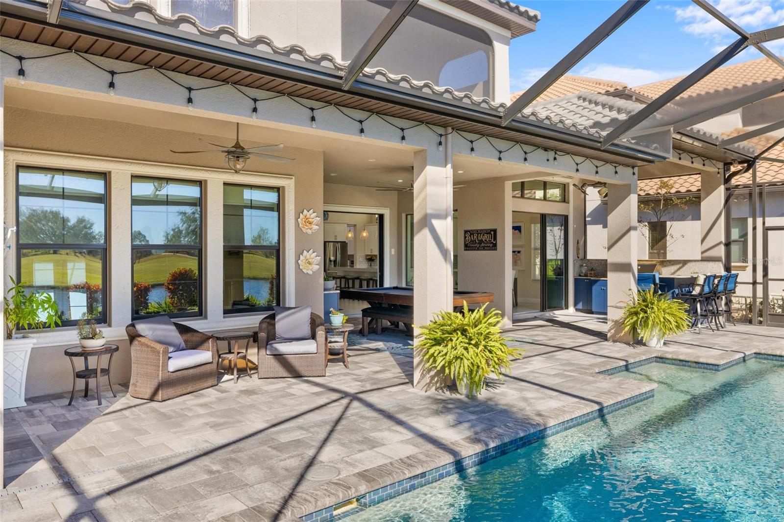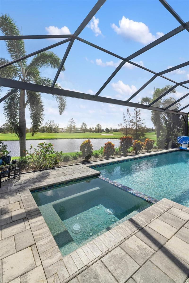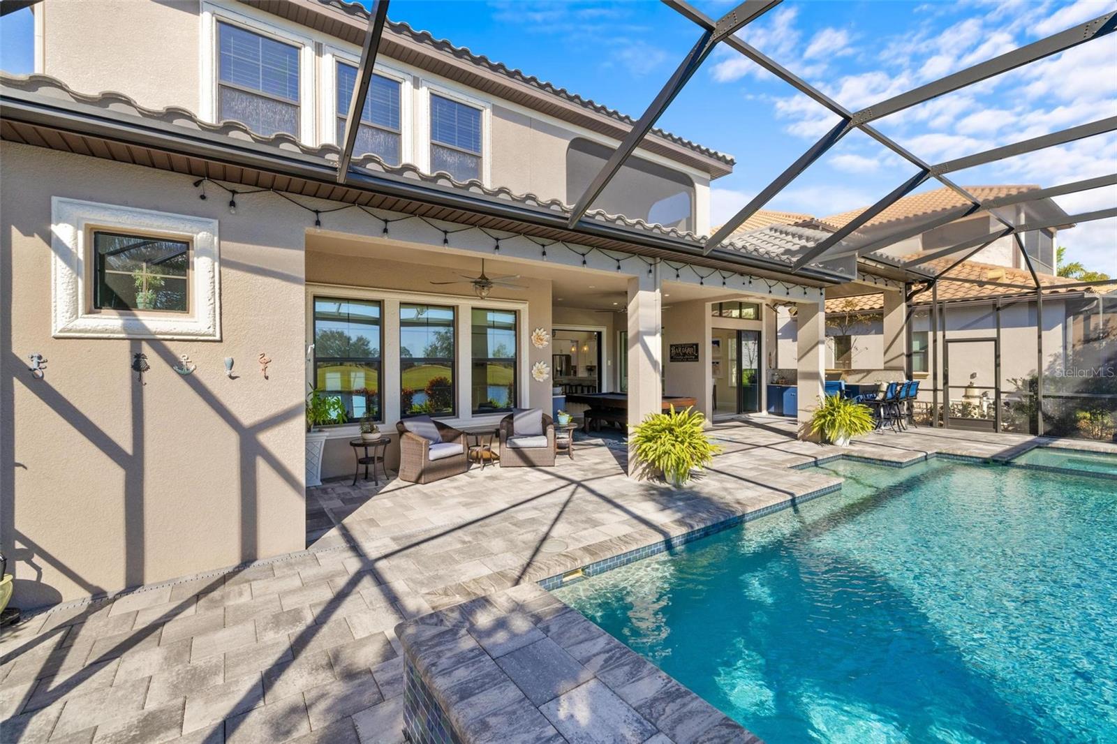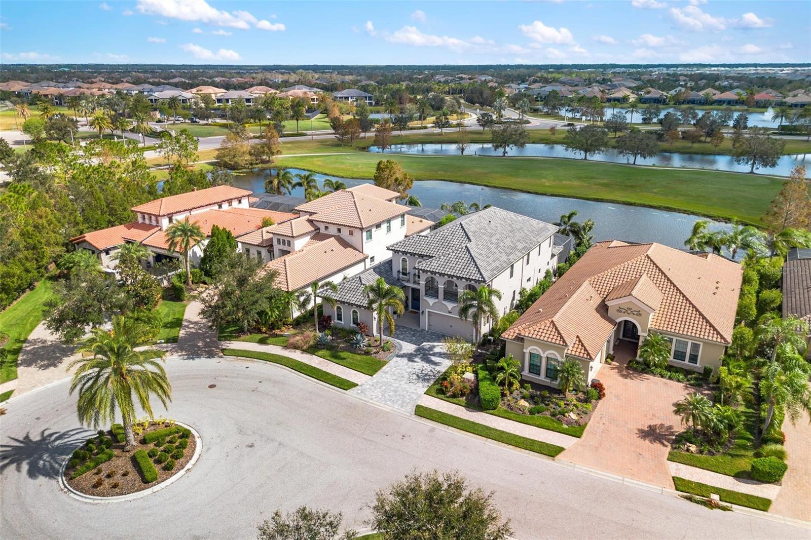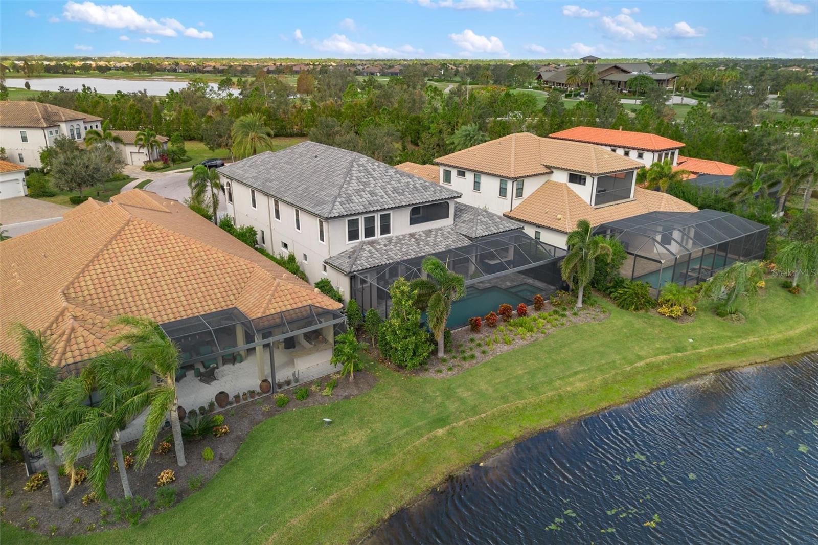 Discover an exceptional lifestyle in this breathtaking 5-bedroom, 3.5-bathroom estate located within the exclusive gated community of Lakewood Ranch Country Club East. Combining timeless elegance with modern comforts, this custom-built home is set on a breathtaking cul-de-sac lot with expansive lake and golf course views. Step inside and be welcomed by an open floor plan with soaring 20-foot ceilings in the family room, allowing natural light to flood the space. The gourmet kitchen is a chef’s paradise, complete with custom white cabinetry, extra-thick quartz countertops, high-end Wolf stainless steel appliances, and a massive walk-in pantry with coffee bar. A spacious island and extended breakfast bar provide ample seating and gathering space, while the large dining area offers an ideal spot for intimate meals with stunning views. Perfect for both entertaining and relaxation, the living area flows seamlessly to the extended covered lanai for true indoor - outdoor living. This oasis features a fully equipped grill, kitchen and bar, perfect for alfresco dining or summer gatherings. The saltwater pool and spa, set within a panoramic screened enclosure, overlook pristine lake and golf course views, creating a resort-style ambiance. The convenient pool bath and expansive outdoor area make it an entertainer’s dream. Lawn care and landscaping included in fees. The main level hosts the luxurious and spacious primary suite, a private retreat complete with wood flooring and serene lake views. The ensuite bath features dual vanities with center glam-station, a large walk-in shower, and dual walk-in closets with custom built-ins, providing a spa-like experience at home. A guest suite and spacious home office/formal dining, both with wood floors, round out the main floor. Upstairs, an oversized bonus room offers endless possibilities for a media room, gym, or playroom, adding versatility to the floor plan, with a wet bar and balcony offering additional entertainment options. Three additional guest bedrooms with walk-in closets provide ample accommodation for family or visitors, with one featuring a private front balcony. Additional highlights include a split garage, 2-car and a single, with ample storage, a tankless water heater, gas appliances for energy efficiency, and elegant tile flooring throughout the common areas. The wood floors in the primary bedroom, guest suite, and office add warmth and elegance, underscoring the home’s attention to detail. Countless options and upgrades are included in this 2020 Cardel-built Palazo floor plan. Living in Lakewood Ranch Country Club East offers a wealth of amenities beyond your doorstep. Residents enjoy exclusive access to amenities including The Retreat, with a resort-style pool, clubhouse and fitness center. Club members enjoy easy access to The Lodge just steps away by cart path, known for its rustic-ranch style architecture and casual yet sleek bar and dining scene. It houses an open concept kitchen, a private dining room, second pro shop, and an outdoor patio with a view of the Royal Lakes Golf Course.Country Club East’s prime location within Lakewood Ranch provides convenient access to Main Street and Waterside shopping, dining, and entertainment options. Sarasota’s award-winning beaches, cultural venues, and attractions offer even more to explore.