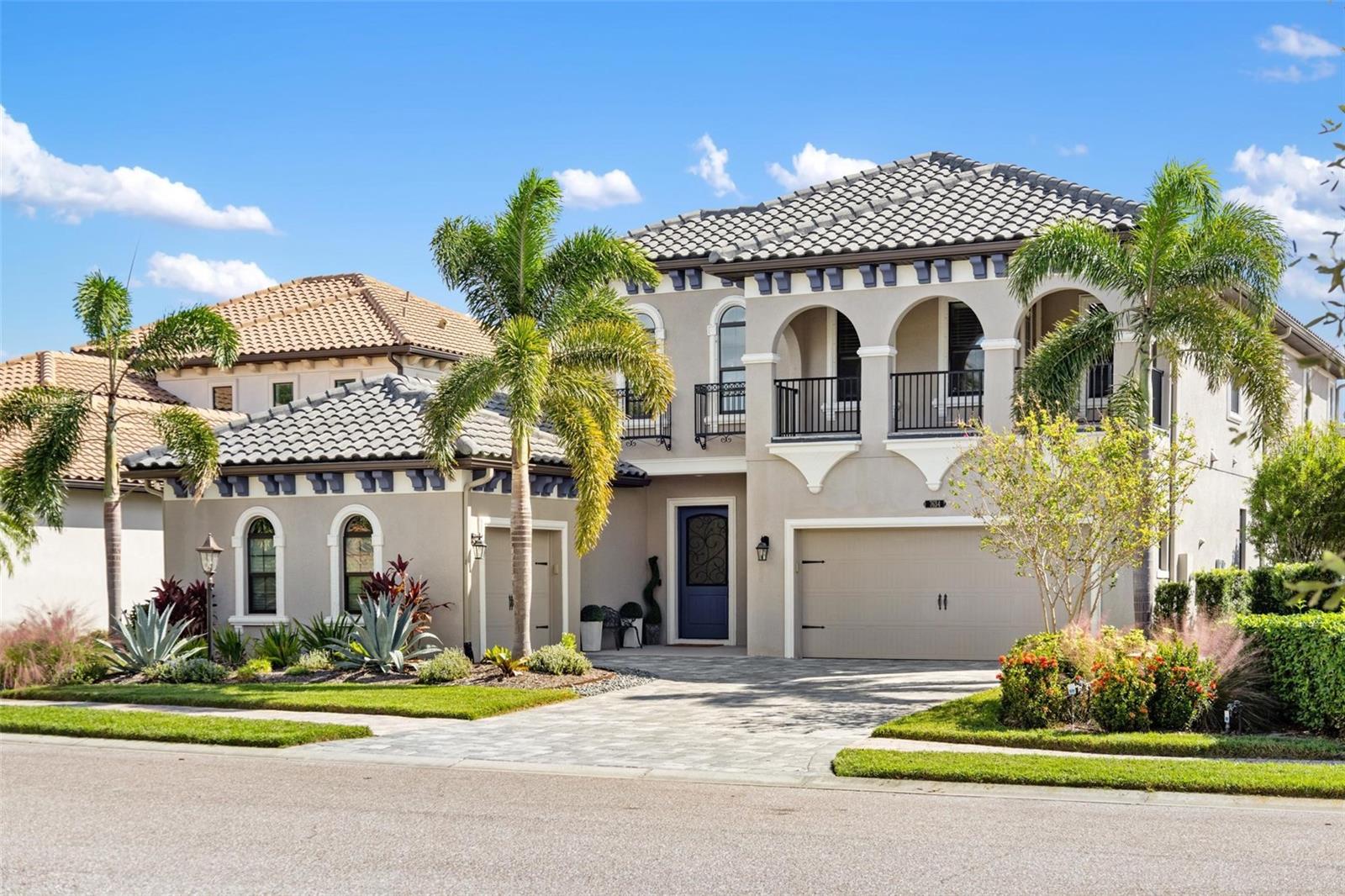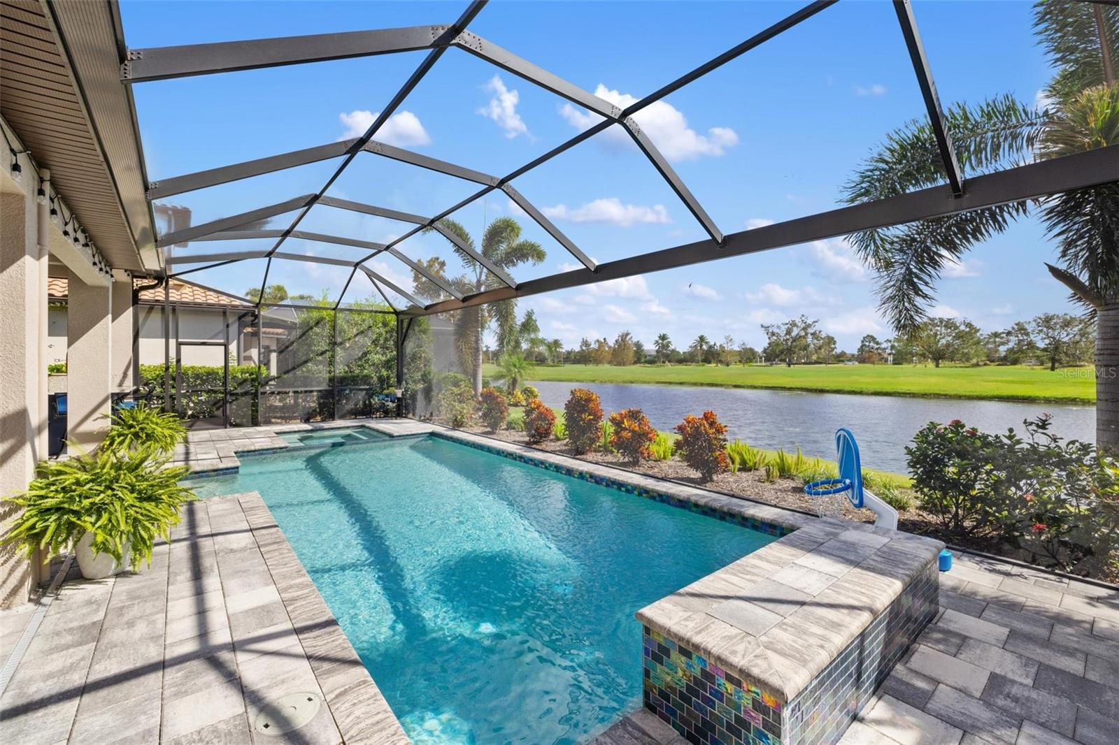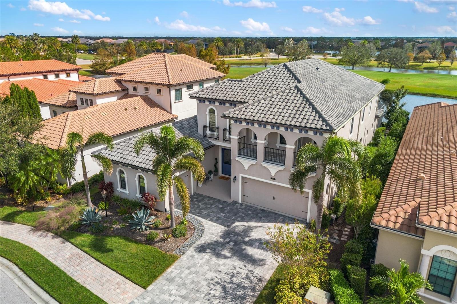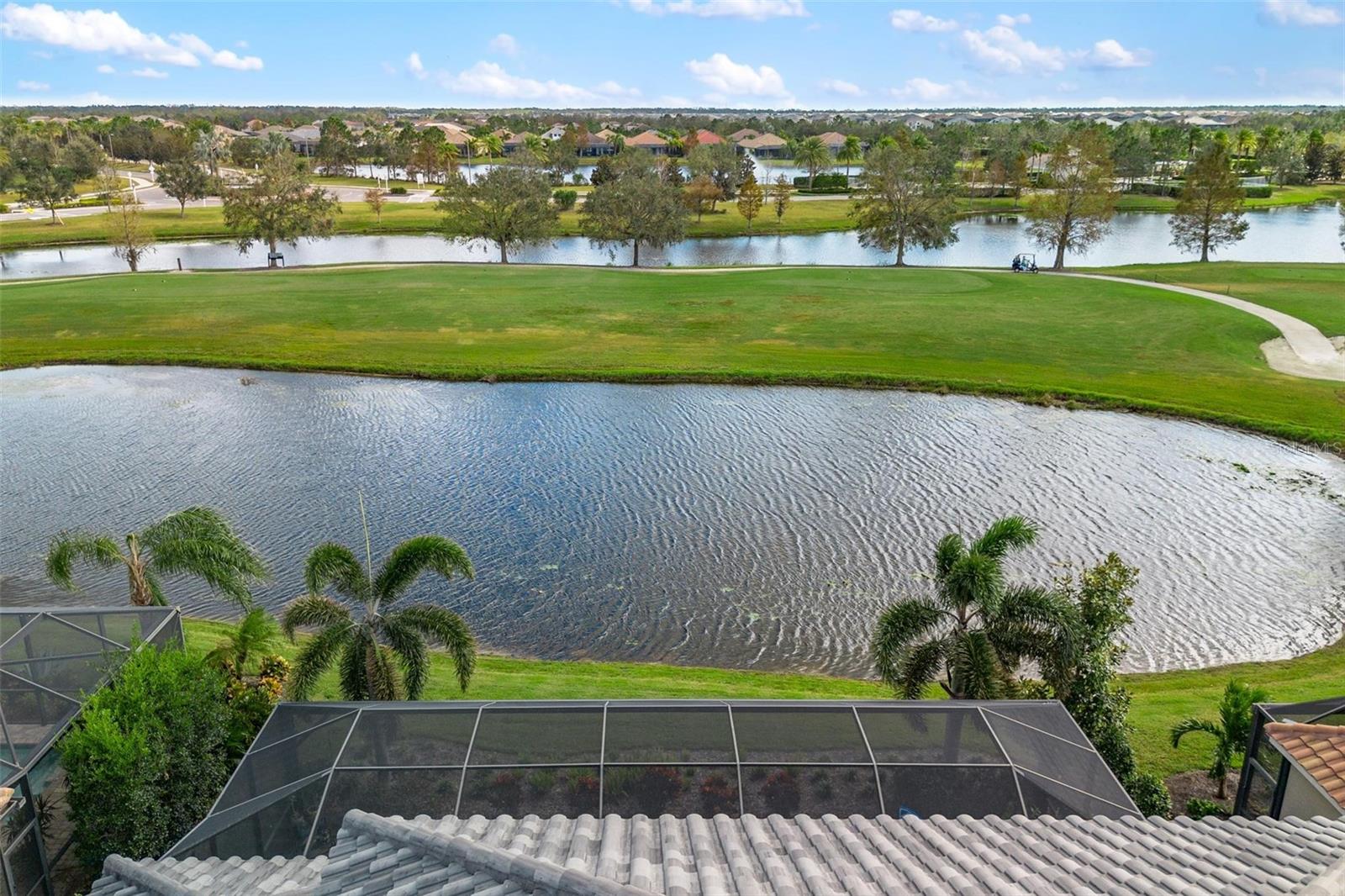 Discover an exceptional lifestyle in this breathtaking 5-bedroom, 3.5-bathroom estate located within the exclusive gated community of Lakewood Ranch Country Club East. Combining timeless elegance with modern comforts, this custom-built home is set on a breathtaking cul-de-sac lot with expansive lake and golf course views. Step inside and be welcomed by an open floor plan with soaring 20-foot ceilings in the family room, allowing natural light to flood the space. The gourmet kitchen is a chef’s paradise, complete with custom white cabinetry, extra-thick quartz countertops, high-end Wolf stainless steel appliances, and a massive walk-in pantry with coffee bar. A spacious island and extended breakfast bar provide ample seating and gathering space, while the large dining area offers an ideal spot for intimate meals with stunning views. Perfect for both entertaining and relaxation, the living area flows seamlessly to the extended covered lanai for true indoor - outdoor living. This oasis features a fully equipped grill, kitchen and bar, perfect for alfresco dining or summer gatherings. The saltwater pool and spa, set within a panoramic screened enclosure, overlook pristine lake and golf course views, creating a resort-style ambiance. The convenient pool bath and expansive outdoor area make it an entertainer’s dream. Lawn care and landscaping included in fees. The main level hosts the luxurious and spacious primary suite, a private retreat complete with wood flooring and serene lake views. The ensuite bath features dual vanities with center glam-station, a large walk-in shower, and dual walk-in closets with custom built-ins, providing a spa-like experience at home. A guest suite and spacious home office/formal dining, both with wood floors, round out the main floor. Upstairs, an oversized bonus room offers endless possibilities for a media room, gym, or playroom, adding versatility to the floor plan, with a wet bar and balcony offering additional entertainment options. Three additional guest bedrooms with walk-in closets provide ample accommodation for family or visitors, with one featuring a private front balcony. Additional highlights include a split garage, 2-car and a single, with ample storage, a tankless water heater, gas appliances for energy efficiency, and elegant tile flooring throughout the common areas. The wood floors in the primary bedroom, guest suite, and office add warmth and elegance, underscoring the home’s attention to detail. Countless options and upgrades are included in this 2020 Cardel-built Palazo floor plan. Living in Lakewood Ranch Country Club East offers a wealth of amenities beyond your doorstep. Residents enjoy exclusive access to amenities including The Retreat, with a resort-style pool, clubhouse and fitness center. Club members enjoy easy access to The Lodge just steps away by cart path, known for its rustic-ranch style architecture and casual yet sleek bar and dining scene. It houses an open concept kitchen, a private dining room, second pro shop, and an outdoor patio with a view of the Royal Lakes Golf Course.Country Club East’s prime location within Lakewood Ranch provides convenient access to Main Street and Waterside shopping, dining, and entertainment options. Sarasota’s award-winning beaches, cultural venues, and attractions offer even more to explore.