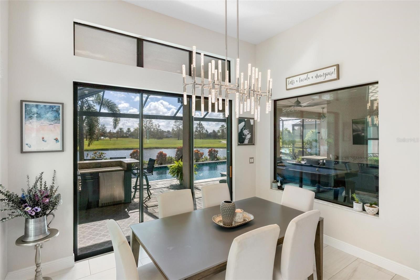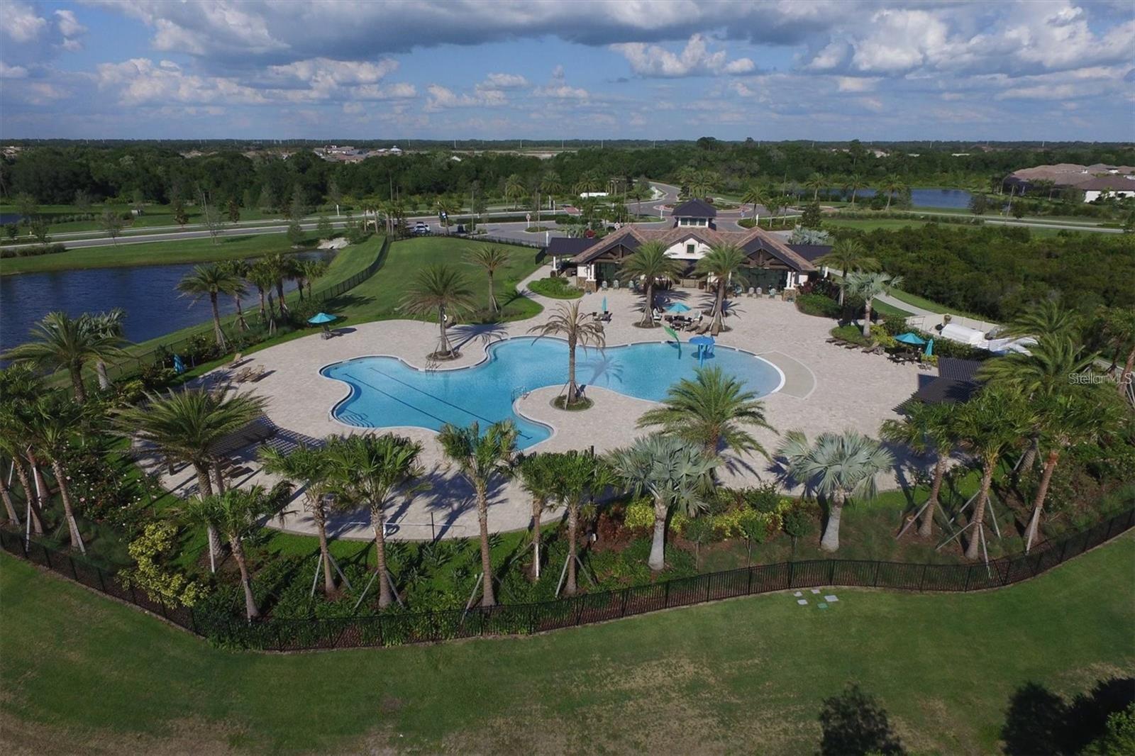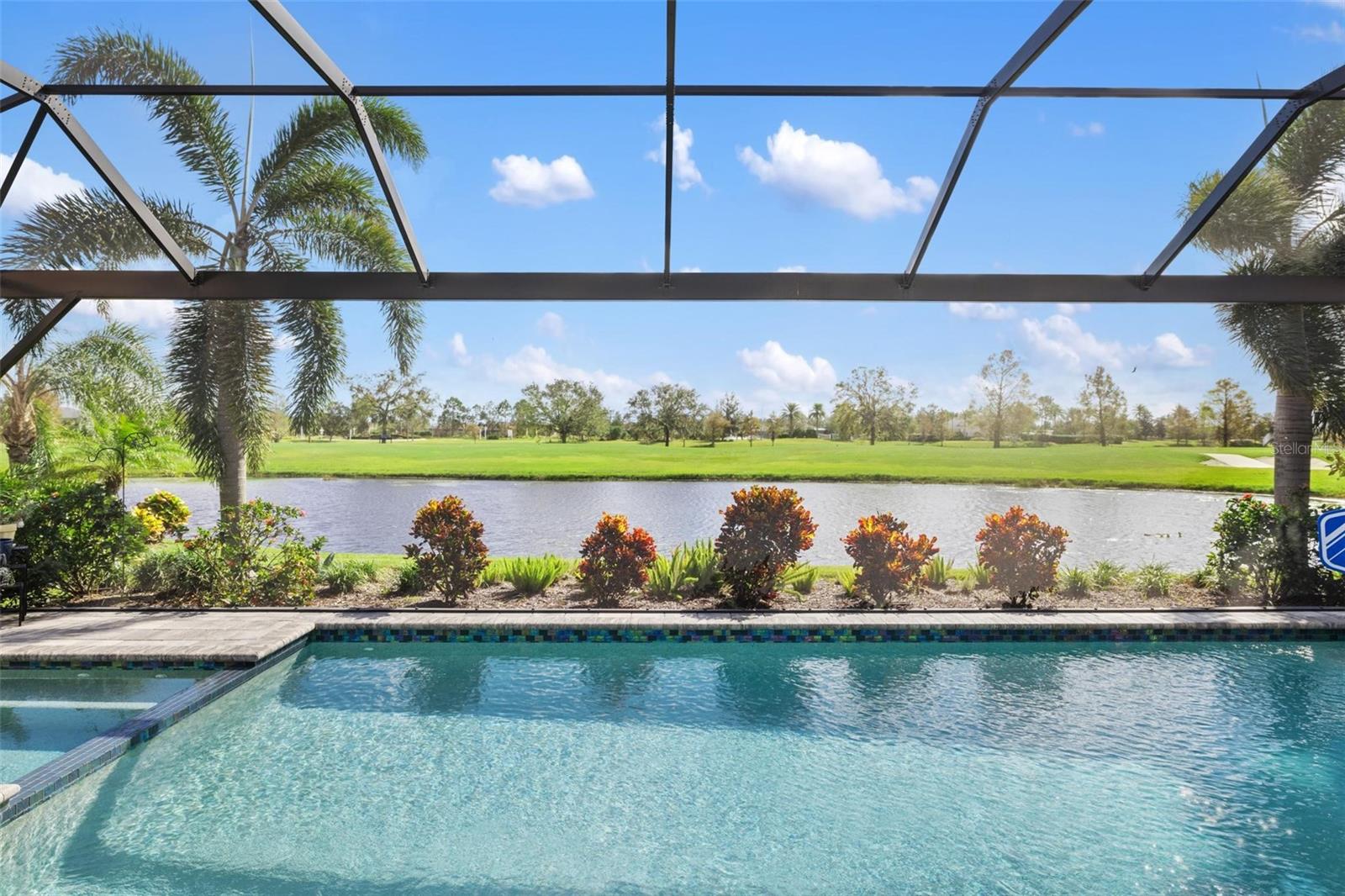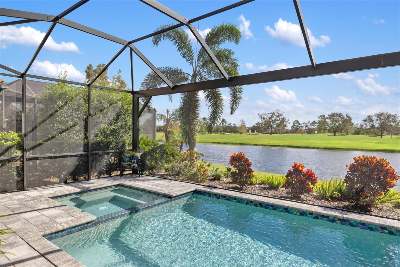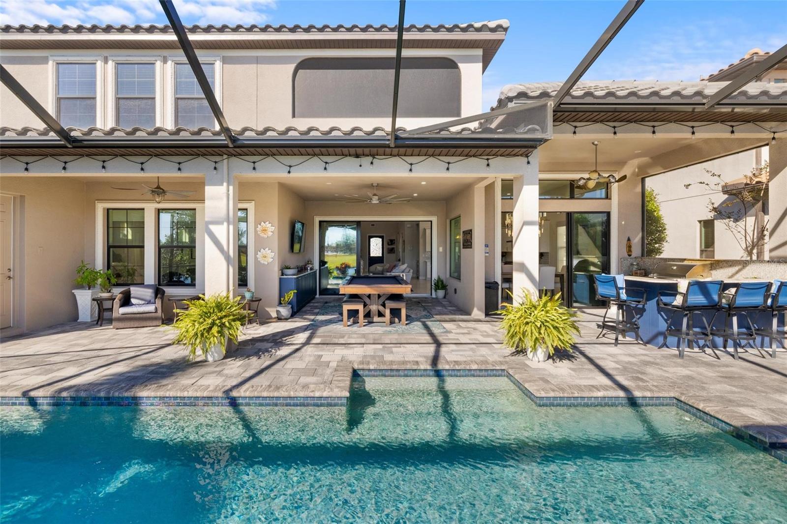 Discover an exceptional lifestyle in this breathtaking 5-bedroom, 3.5-bathroom estate located within the exclusive gated community of Lakewood Ranch Country Club East. Combining timeless elegance with modern comforts, this custom-built home is set on a breathtaking cul-de-sac lot with expansive lake and golf course views. Step inside and be welcomed by an open floor plan with soaring 20-foot ceilings in the family room, allowing natural light to flood the space. The gourmet kitchen is a chef’s paradise, complete with custom white cabinetry, extra-thick quartz countertops, high-end Wolf stainless steel appliances, and a massive walk-in pantry with coffee bar. A spacious island and extended breakfast bar provide ample seating and gathering space, while the large dining area offers an ideal spot for intimate meals with stunning views. Perfect for both entertaining and relaxation, the living area flows seamlessly to the extended covered lanai for true indoor - outdoor living. This oasis features a fully equipped grill, kitchen and bar, perfect for alfresco dining or summer gatherings. The saltwater pool and spa, set within a panoramic screened enclosure, overlook pristine lake and golf course views, creating a resort-style ambiance. The convenient pool bath and expansive outdoor area make it an entertainer’s dream. Lawn care and landscaping included in fees. The main level hosts the luxurious and spacious primary suite, a private retreat complete with wood flooring and serene lake views. The ensuite bath features dual vanities with center glam-station, a large walk-in shower, and dual walk-in closets with custom built-ins, providing a spa-like experience at home. A guest suite and spacious home office/formal dining, both with wood floors, round out the main floor. Upstairs, an oversized bonus room offers endless possibilities for a media room, gym, or playroom, adding versatility to the floor plan, with a wet bar and balcony offering additional entertainment options. Three additional guest bedrooms with walk-in closets provide ample accommodation for family or visitors, with one featuring a private front balcony. Additional highlights include a split garage, 2-car and a single, with ample storage, a tankless water heater, gas appliances for energy efficiency, and elegant tile flooring throughout the common areas. The wood floors in the primary bedroom, guest suite, and office add warmth and elegance, underscoring the home’s attention to detail. Countless options and upgrades are included in this 2020 Cardel-built Palazo floor plan. Living in Lakewood Ranch Country Club East offers a wealth of amenities beyond your doorstep. Residents enjoy exclusive access to amenities including The Retreat, with a resort-style pool, clubhouse and fitness center. Club members enjoy easy access to The Lodge just steps away by cart path, known for its rustic-ranch style architecture and casual yet sleek bar and dining scene. It houses an open concept kitchen, a private dining room, second pro shop, and an outdoor patio with a view of the Royal Lakes Golf Course.Country Club East’s prime location within Lakewood Ranch provides convenient access to Main Street and Waterside shopping, dining, and entertainment options. Sarasota’s award-winning beaches, cultural venues, and attractions offer even more to explore.