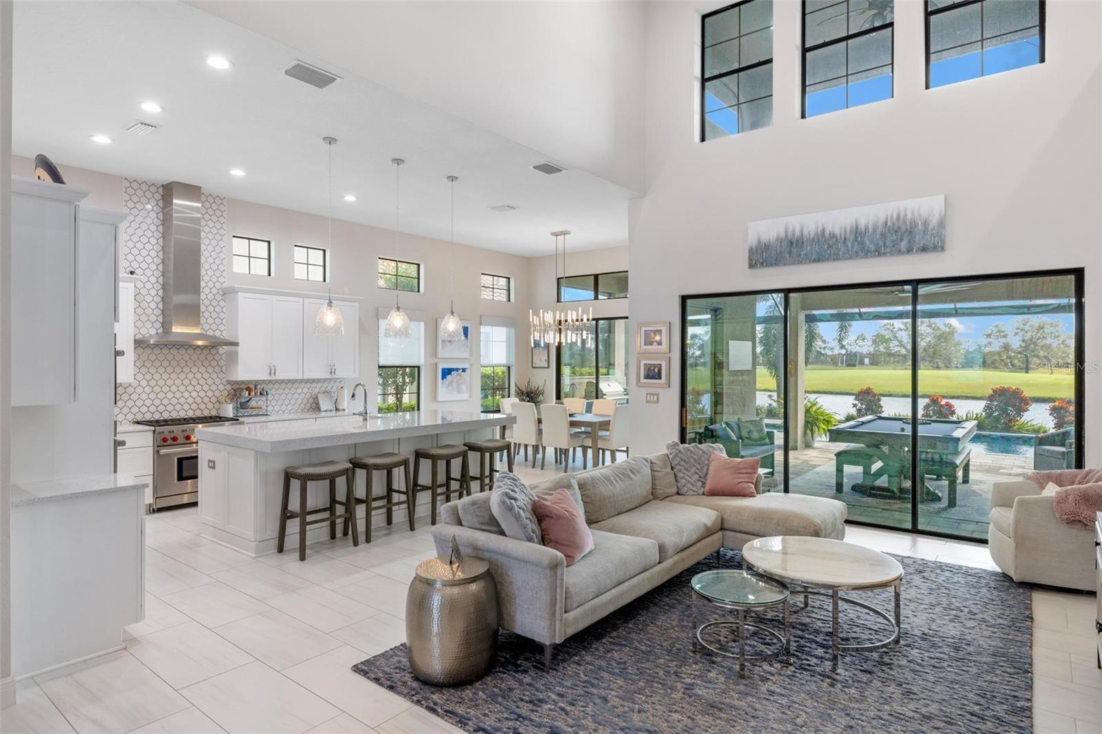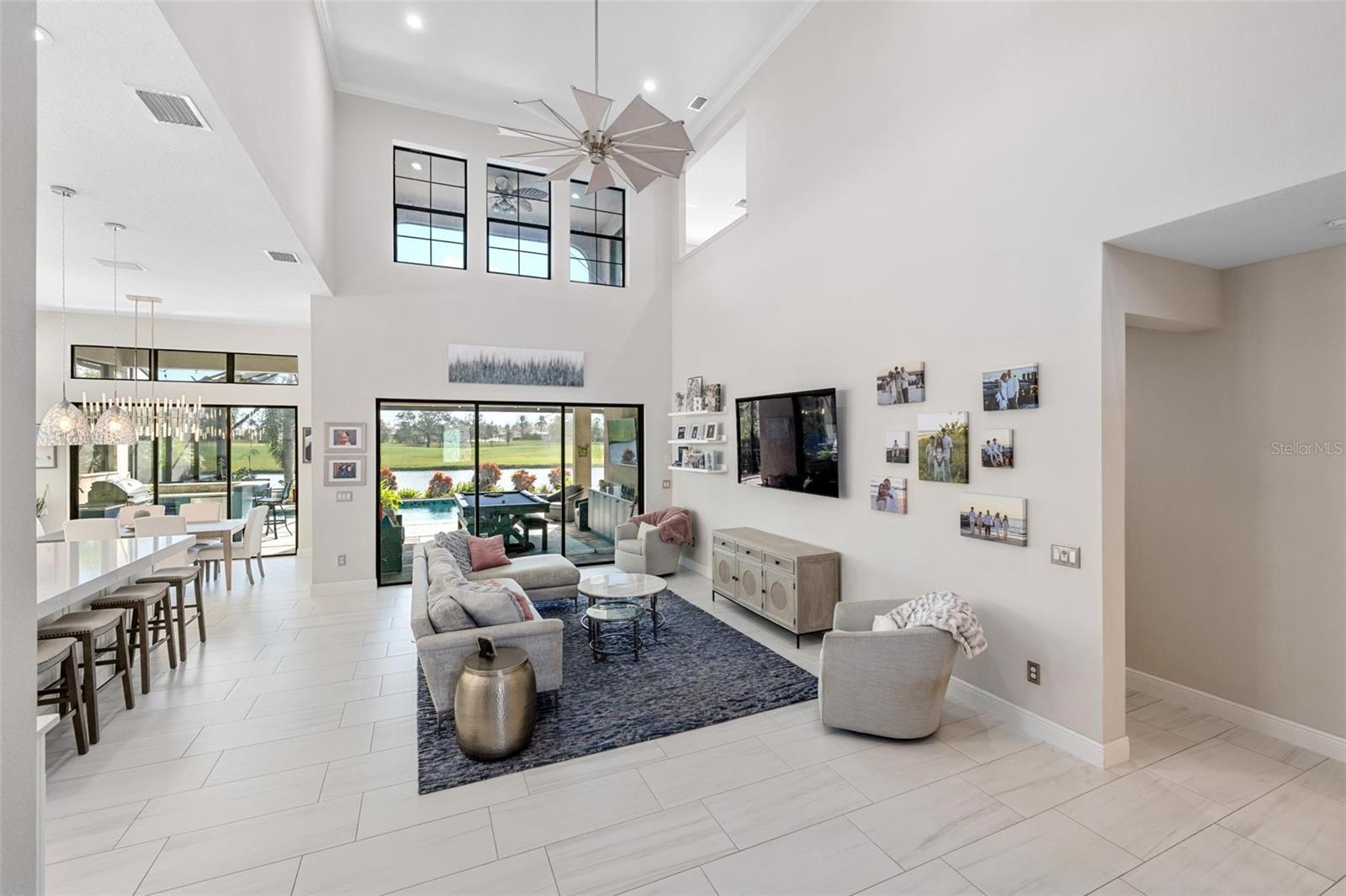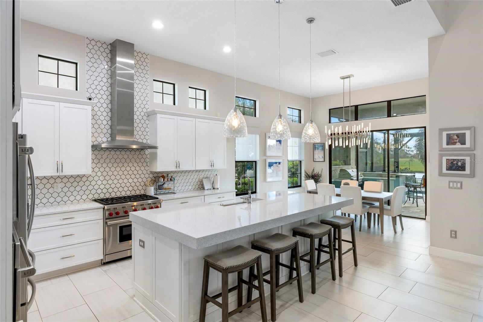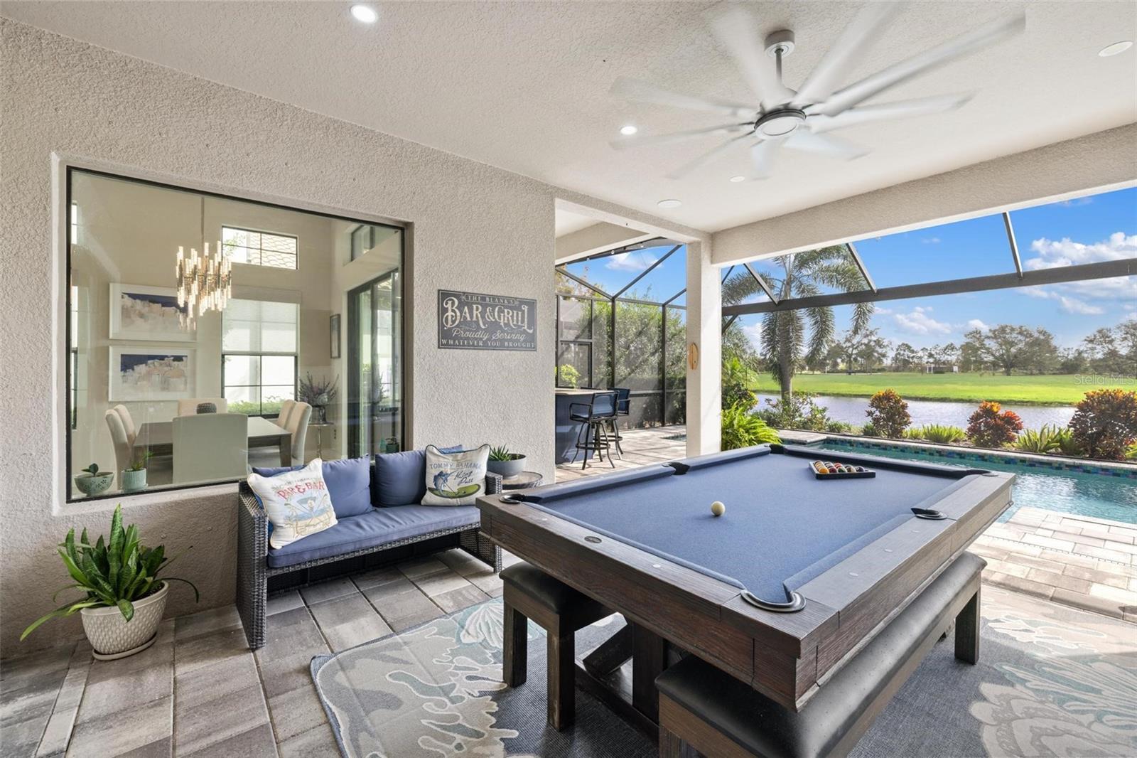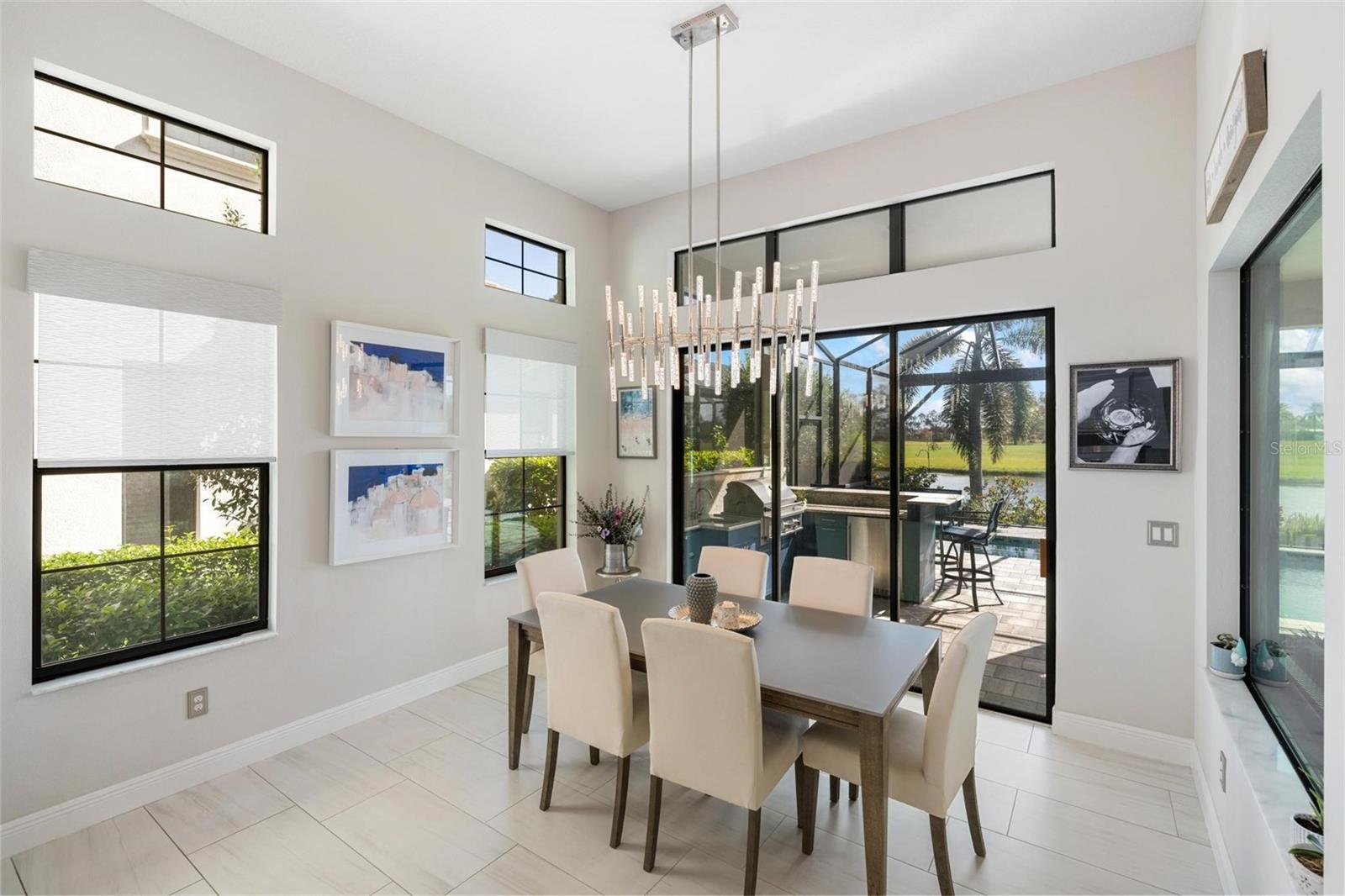 Discover an exceptional lifestyle in this breathtaking 5-bedroom, 3.5-bathroom estate located within the exclusive gated community of Lakewood Ranch Country Club East. Combining timeless elegance with modern comforts, this custom-built home is set on a breathtaking cul-de-sac lot with expansive lake and golf course views. Step inside and be welcomed by an open floor plan with soaring 20-foot ceilings in the family room, allowing natural light to flood the space. The gourmet kitchen is a chef’s paradise, complete with custom white cabinetry, extra-thick quartz countertops, high-end Wolf stainless steel appliances, and a massive walk-in pantry with coffee bar. A spacious island and extended breakfast bar provide ample seating and gathering space, while the large dining area offers an ideal spot for intimate meals with stunning views. Perfect for both entertaining and relaxation, the living area flows seamlessly to the extended covered lanai for true indoor - outdoor living. This oasis features a fully equipped grill, kitchen and bar, perfect for alfresco dining or summer gatherings. The saltwater pool and spa, set within a panoramic screened enclosure, overlook pristine lake and golf course views, creating a resort-style ambiance. The convenient pool bath and expansive outdoor area make it an entertainer’s dream. Lawn care and landscaping included in fees. The main level hosts the luxurious and spacious primary suite, a private retreat complete with wood flooring and serene lake views. The ensuite bath features dual vanities with center glam-station, a large walk-in shower, and dual walk-in closets with custom built-ins, providing a spa-like experience at home. A guest suite and spacious home office/formal dining, both with wood floors, round out the main floor. Upstairs, an oversized bonus room offers endless possibilities for a media room, gym, or playroom, adding versatility to the floor plan, with a wet bar and balcony offering additional entertainment options. Three additional guest bedrooms with walk-in closets provide ample accommodation for family or visitors, with one featuring a private front balcony. Additional highlights include a split garage, 2-car and a single, with ample storage, a tankless water heater, gas appliances for energy efficiency, and elegant tile flooring throughout the common areas. The wood floors in the primary bedroom, guest suite, and office add warmth and elegance, underscoring the home’s attention to detail. Countless options and upgrades are included in this 2020 Cardel-built Palazo floor plan. Living in Lakewood Ranch Country Club East offers a wealth of amenities beyond your doorstep. Residents enjoy exclusive access to amenities including The Retreat, with a resort-style pool, clubhouse and fitness center. Club members enjoy easy access to The Lodge just steps away by cart path, known for its rustic-ranch style architecture and casual yet sleek bar and dining scene. It houses an open concept kitchen, a private dining room, second pro shop, and an outdoor patio with a view of the Royal Lakes Golf Course.Country Club East’s prime location within Lakewood Ranch provides convenient access to Main Street and Waterside shopping, dining, and entertainment options. Sarasota’s award-winning beaches, cultural venues, and attractions offer even more to explore.
