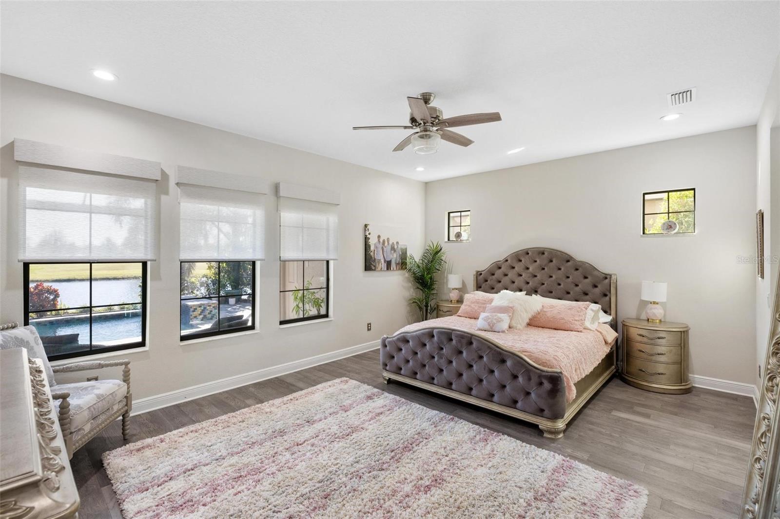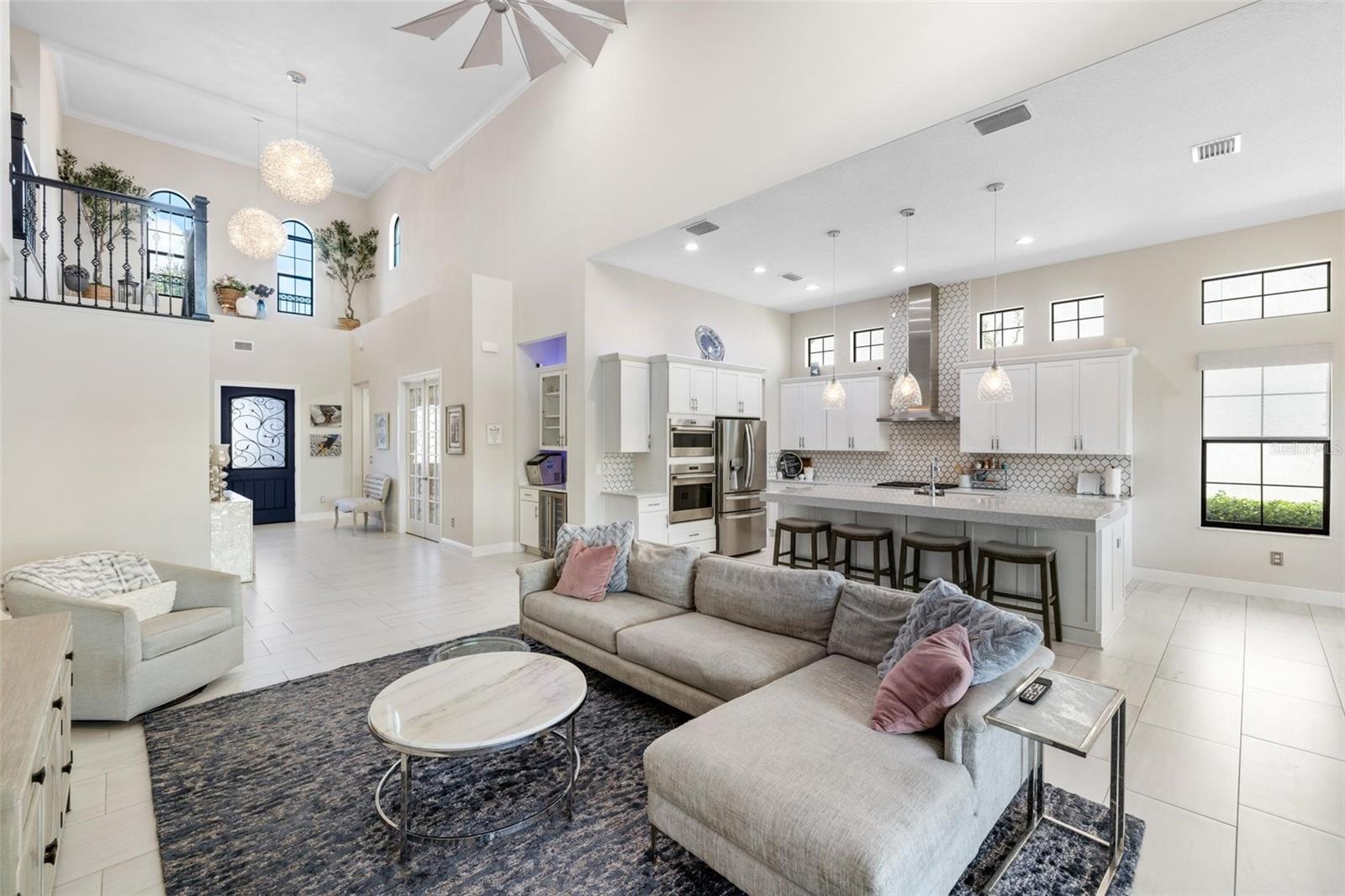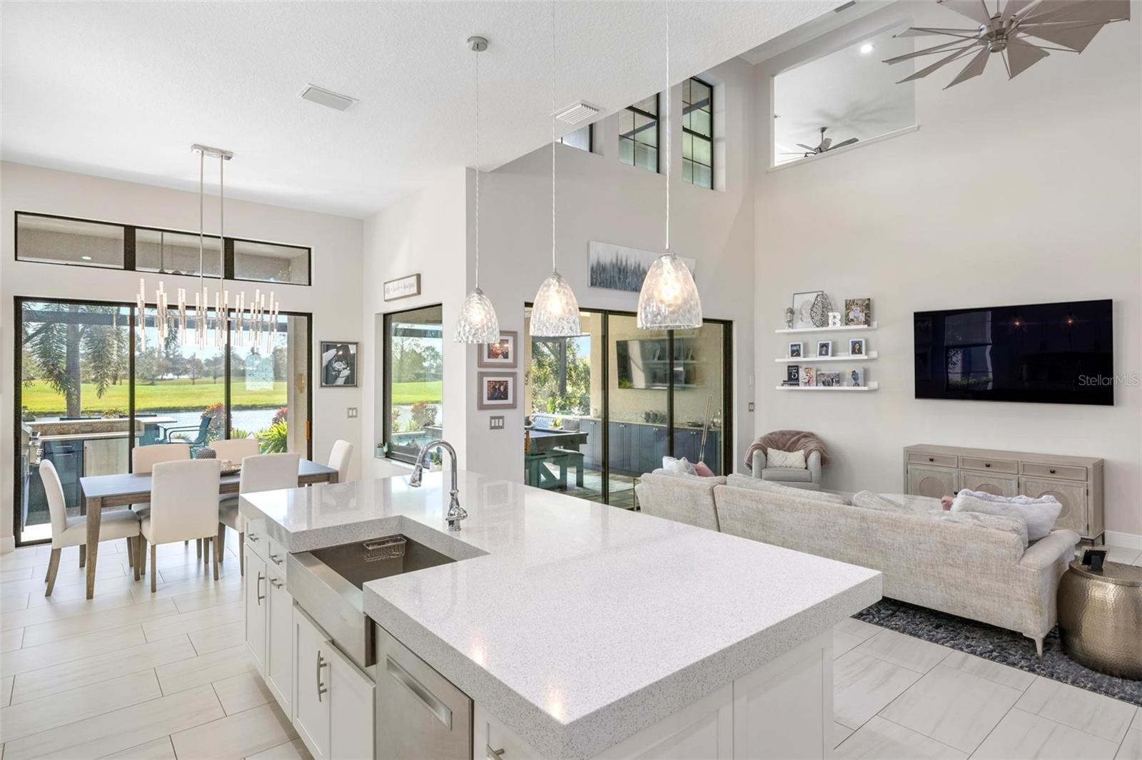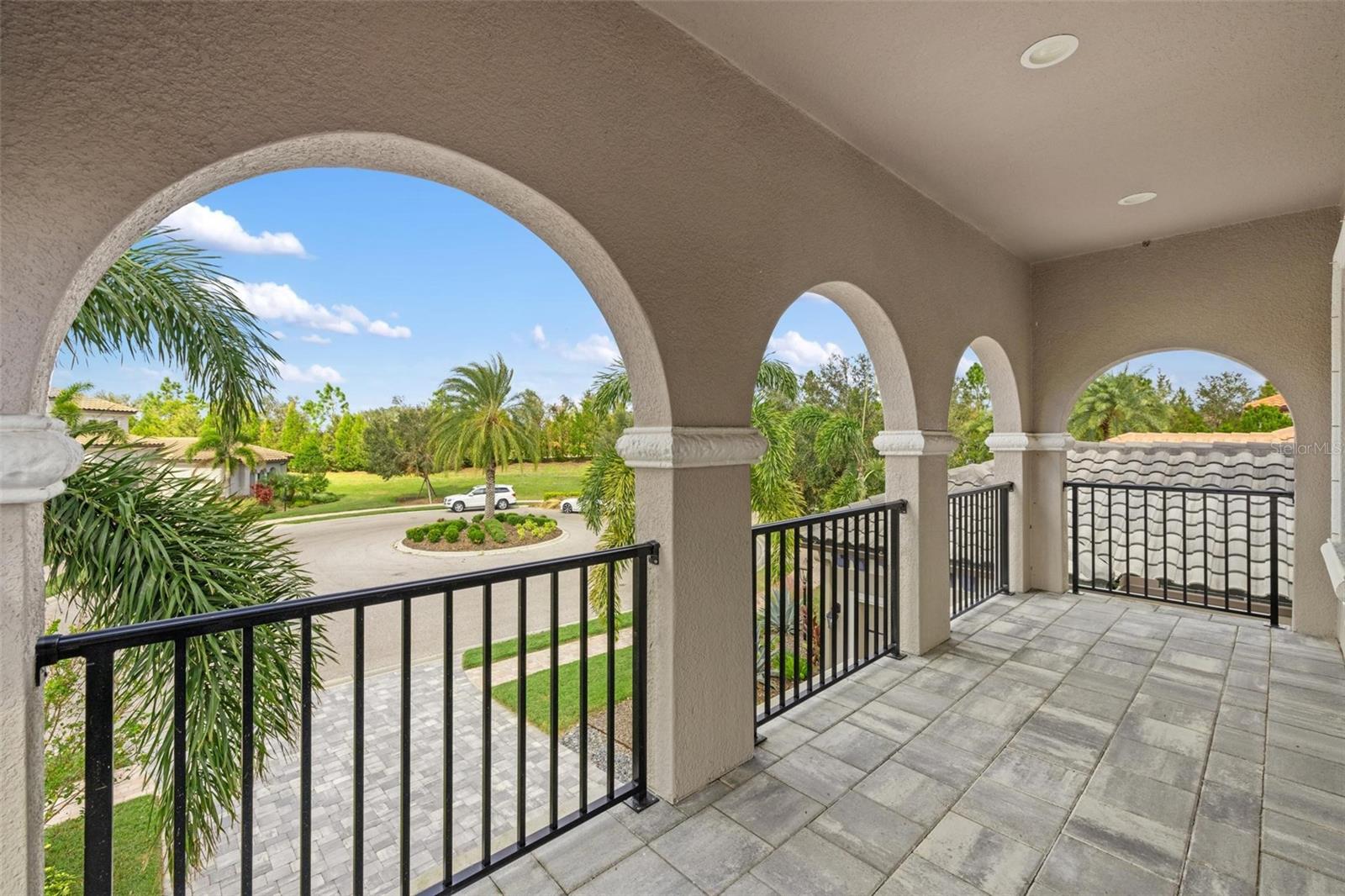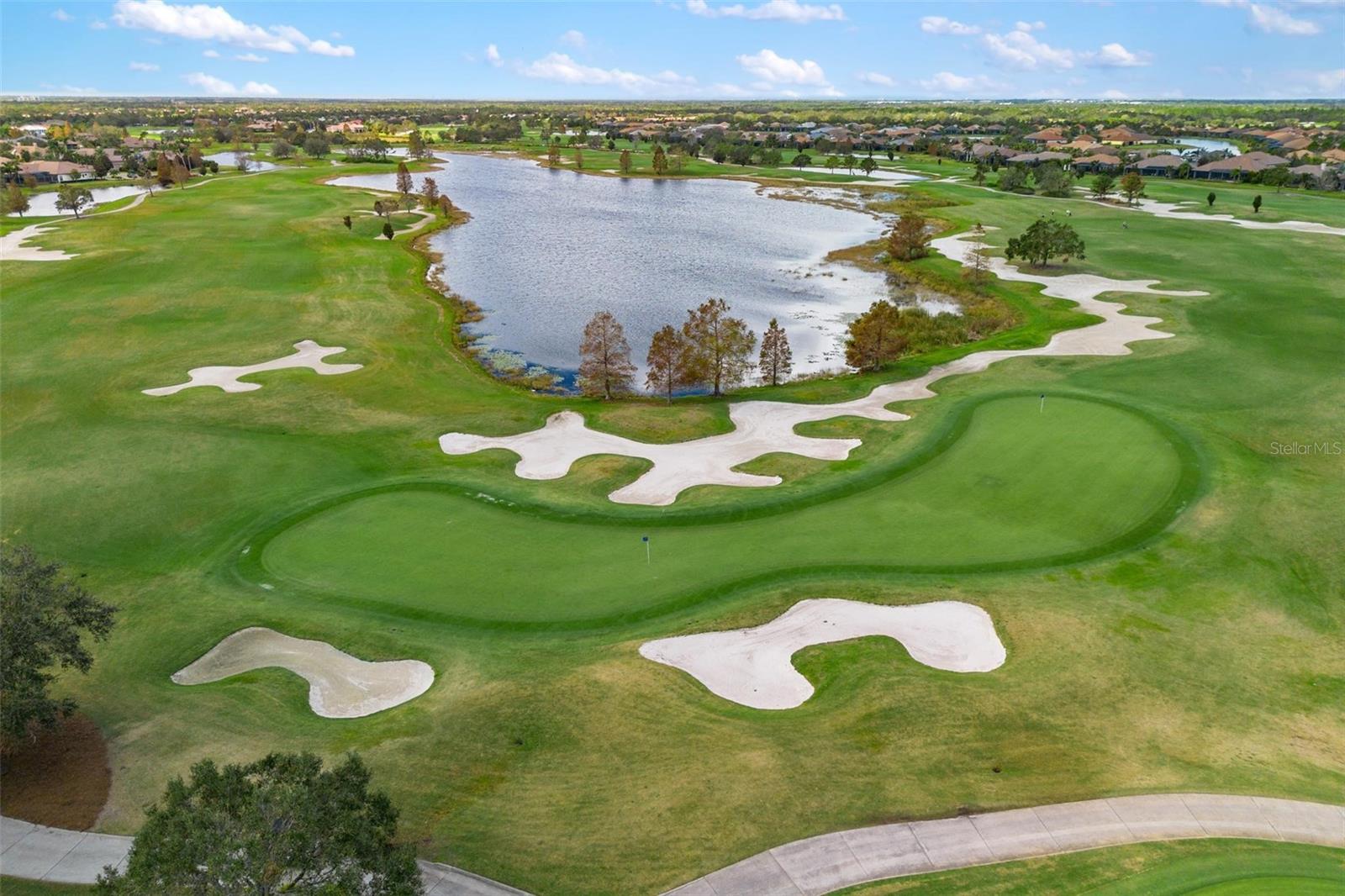 Discover an exceptional lifestyle in this breathtaking 5-bedroom, 3.5-bathroom estate located within the exclusive gated community of Lakewood Ranch Country Club East. Combining timeless elegance with modern comforts, this custom-built home is set on a breathtaking cul-de-sac lot with expansive lake and golf course views. Step inside and be welcomed by an open floor plan with soaring 20-foot ceilings in the family room, allowing natural light to flood the space. The gourmet kitchen is a chef’s paradise, complete with custom white cabinetry, extra-thick quartz countertops, high-end Wolf stainless steel appliances, and a massive walk-in pantry with coffee bar. A spacious island and extended breakfast bar provide ample seating and gathering space, while the large dining area offers an ideal spot for intimate meals with stunning views. Perfect for both entertaining and relaxation, the living area flows seamlessly to the extended covered lanai for true indoor - outdoor living. This oasis features a fully equipped grill, kitchen and bar, perfect for alfresco dining or summer gatherings. The saltwater pool and spa, set within a panoramic screened enclosure, overlook pristine lake and golf course views, creating a resort-style ambiance. The convenient pool bath and expansive outdoor area make it an entertainer’s dream. Lawn care and landscaping included in fees. The main level hosts the luxurious and spacious primary suite, a private retreat complete with wood flooring and serene lake views. The ensuite bath features dual vanities with center glam-station, a large walk-in shower, and dual walk-in closets with custom built-ins, providing a spa-like experience at home. A guest suite and spacious home office/formal dining, both with wood floors, round out the main floor. Upstairs, an oversized bonus room offers endless possibilities for a media room, gym, or playroom, adding versatility to the floor plan, with a wet bar and balcony offering additional entertainment options. Three additional guest bedrooms with walk-in closets provide ample accommodation for family or visitors, with one featuring a private front balcony. Additional highlights include a split garage, 2-car and a single, with ample storage, a tankless water heater, gas appliances for energy efficiency, and elegant tile flooring throughout the common areas. The wood floors in the primary bedroom, guest suite, and office add warmth and elegance, underscoring the home’s attention to detail. Countless options and upgrades are included in this 2020 Cardel-built Palazo floor plan. Living in Lakewood Ranch Country Club East offers a wealth of amenities beyond your doorstep. Residents enjoy exclusive access to amenities including The Retreat, with a resort-style pool, clubhouse and fitness center. Club members enjoy easy access to The Lodge just steps away by cart path, known for its rustic-ranch style architecture and casual yet sleek bar and dining scene. It houses an open concept kitchen, a private dining room, second pro shop, and an outdoor patio with a view of the Royal Lakes Golf Course.Country Club East’s prime location within Lakewood Ranch provides convenient access to Main Street and Waterside shopping, dining, and entertainment options. Sarasota’s award-winning beaches, cultural venues, and attractions offer even more to explore.