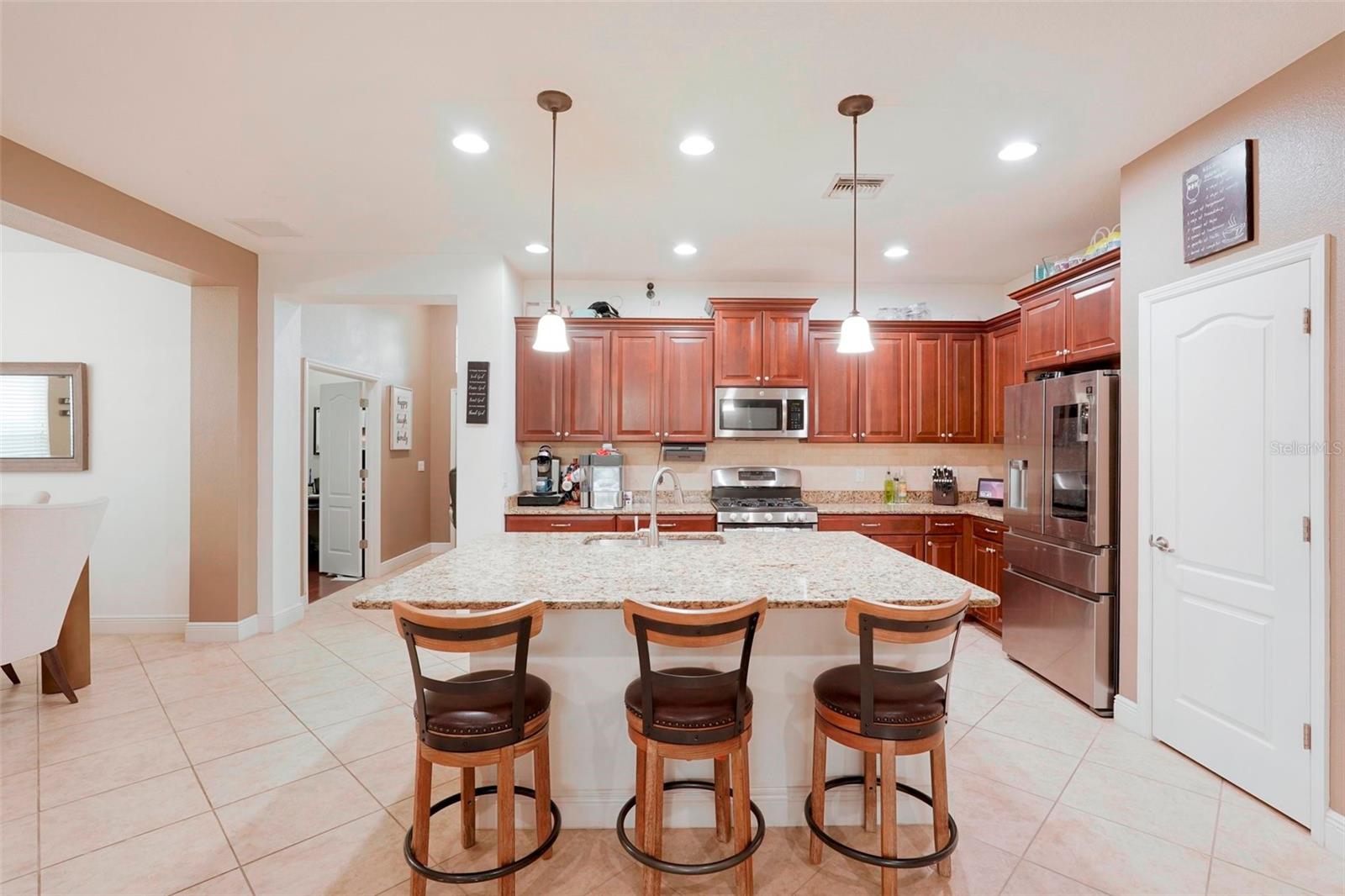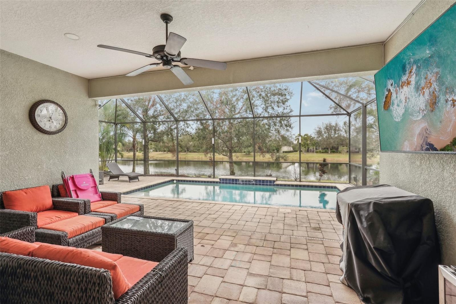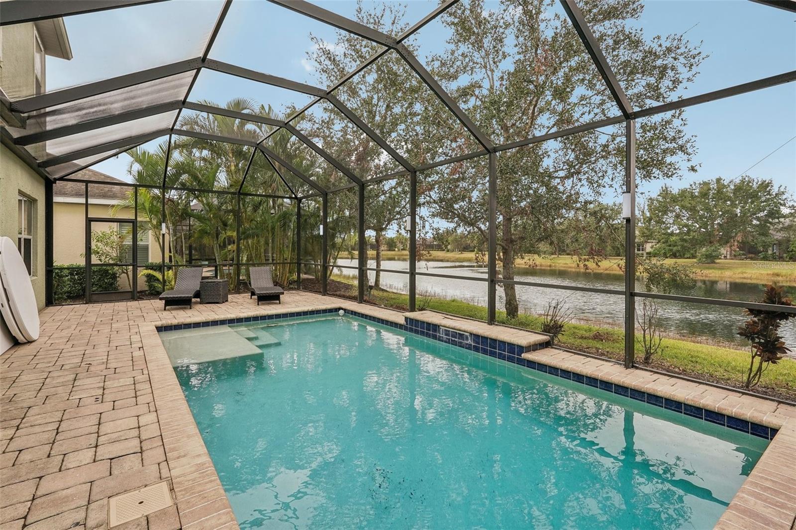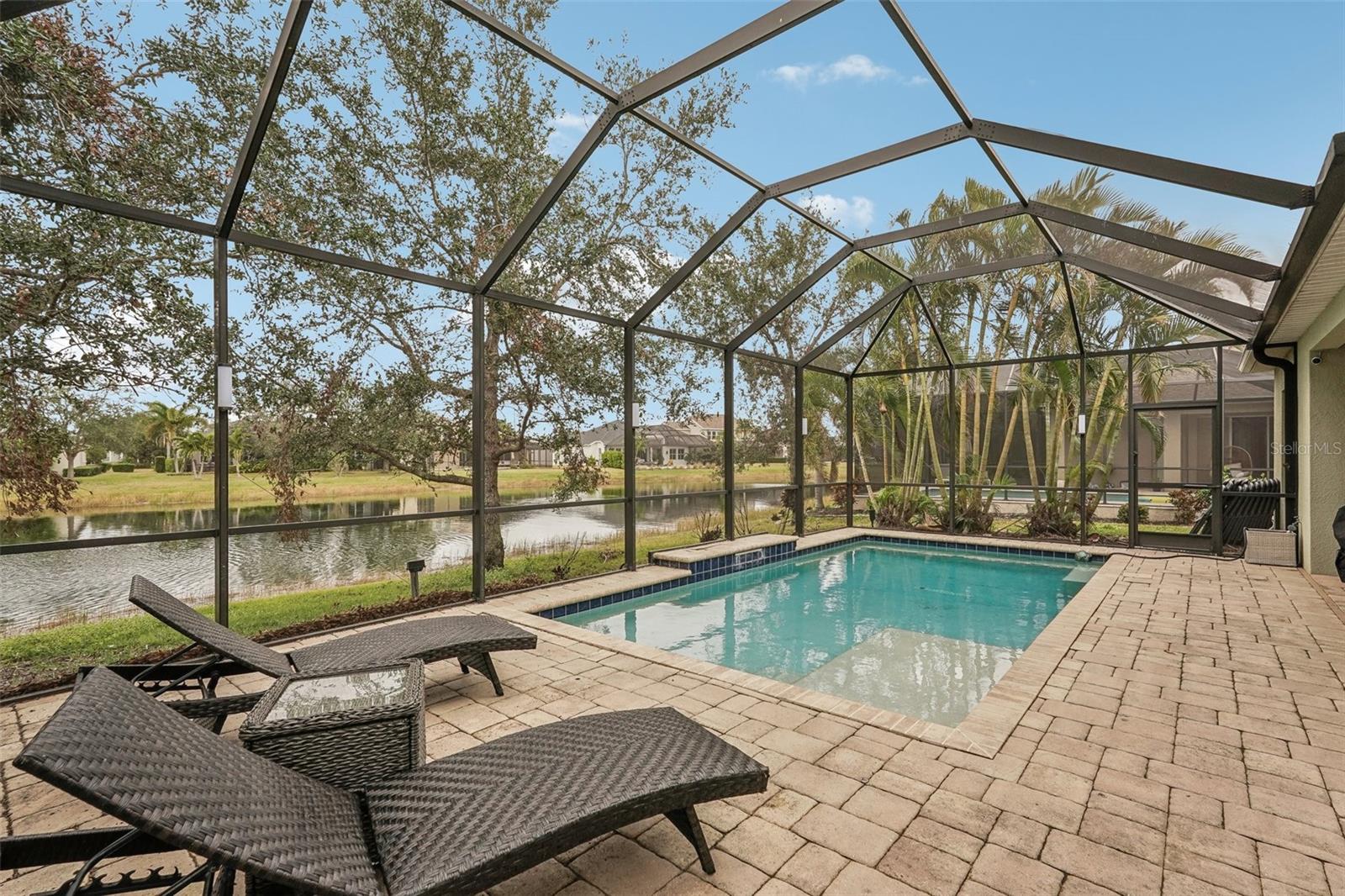 Discover this stunning Lakewood Ranch home with captivating views and the perfect balance of space and sophistication. An impressive layout featuring 5 total bedrooms plus a den/office, complemented by a spacious upstairs suite serving as a second primary bedroom—ideal for hosting guests or creating a private oasis. With 4 full baths and a spacious 3-car garage, this home effortlessly combines style and functionality. The open-concept design centers around a chef’s kitchen that will surely delight culinary lovers. Anchored by a grand breakfast island, the kitchen boasts elegant Cherry Spice cabinetry, gleaming stainless-steel appliances, and stunning Santa Cecilia granite countertops. Stylish 18”x18” tile flooring flows throughout the main living areas, while pocket sliders extend the indoor living space to a beautiful outdoor haven with serene pond views. Nestled within the award-winning Central Park community at Lakewood Ranch, residents experience a vibrant, nature-inspired lifestyle with lush green spaces, nature preserves, and a neighborhood park featuring tennis courts, two dog parks, picnic pavilions, and a splash park. New AC units 2021, New water heater 2024, New pool heater 2024. Located just east of I-75, this community provides easy access to premier golf courses, shopping, dining, medical facilities, and highly rated schools. Experience the extraordinary lifestyle waiting for you at Central Park at Lakewood Ranch.