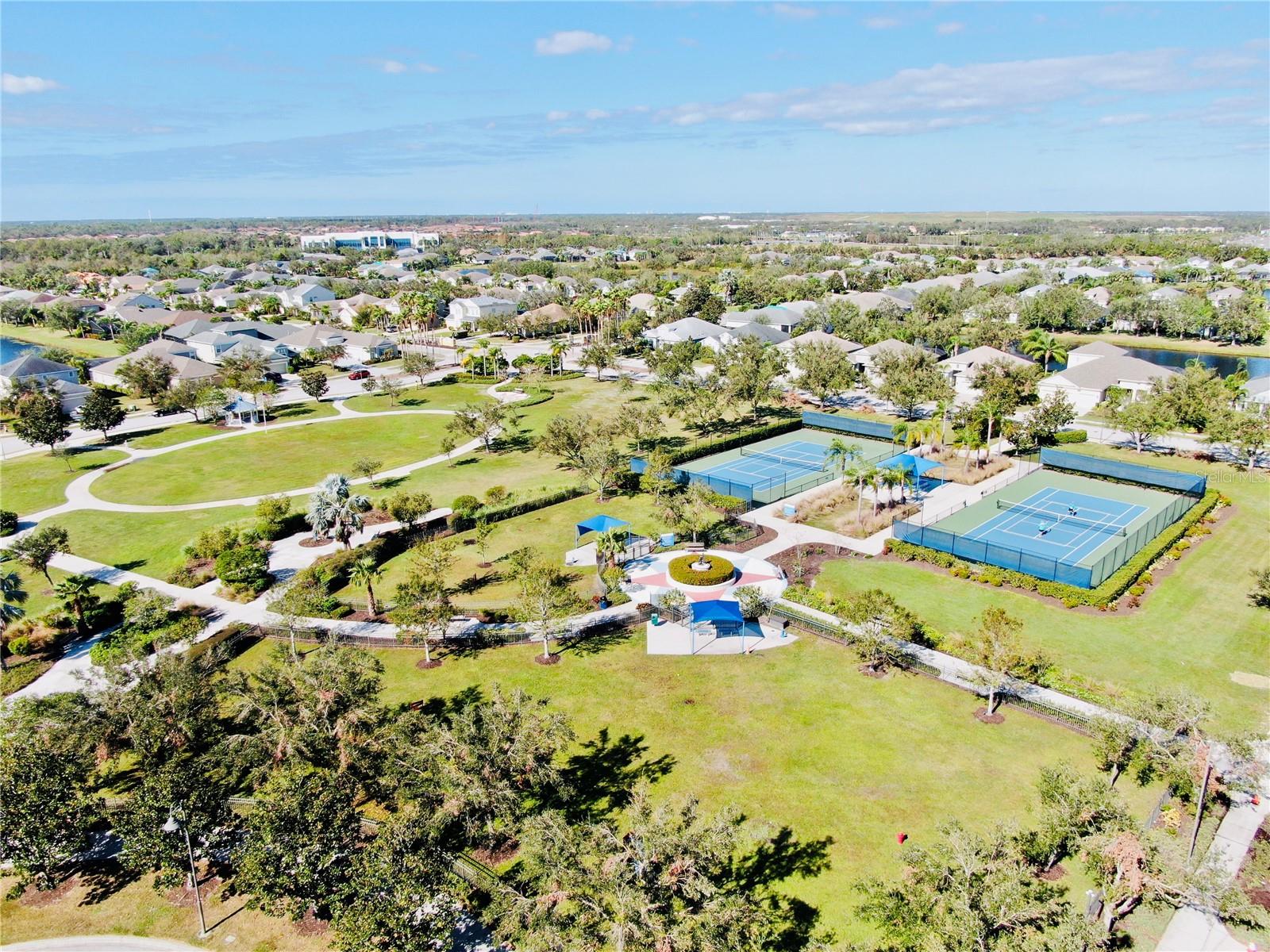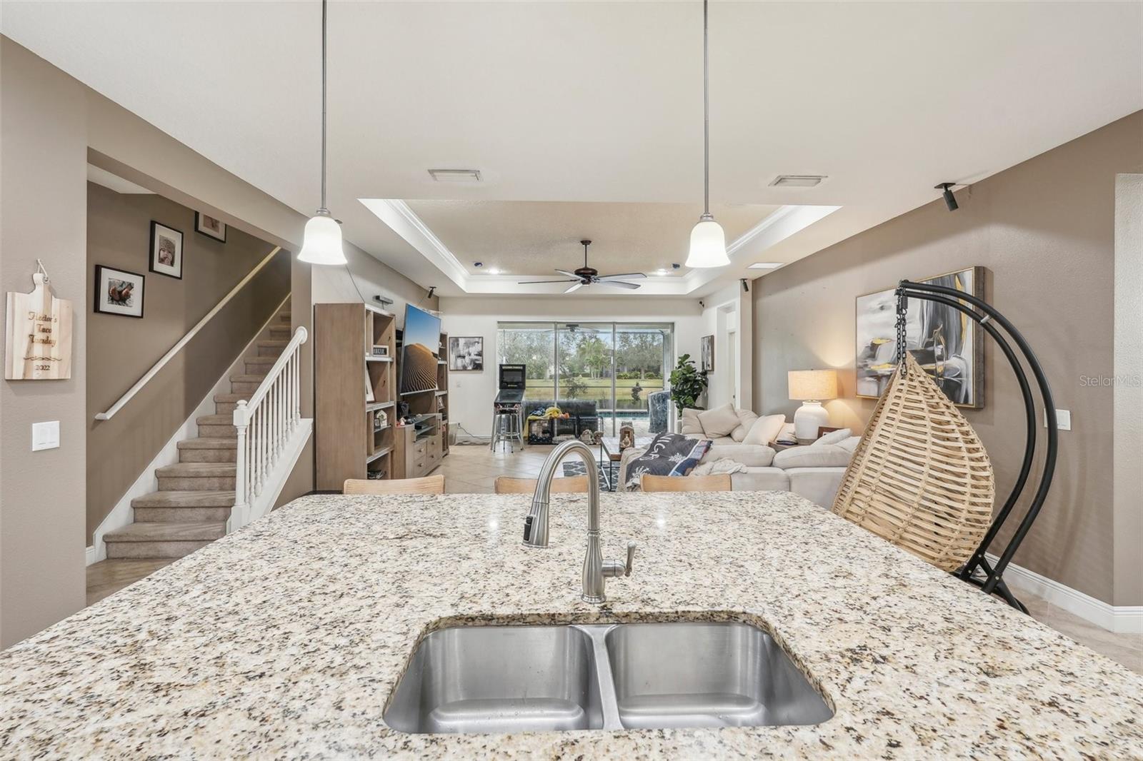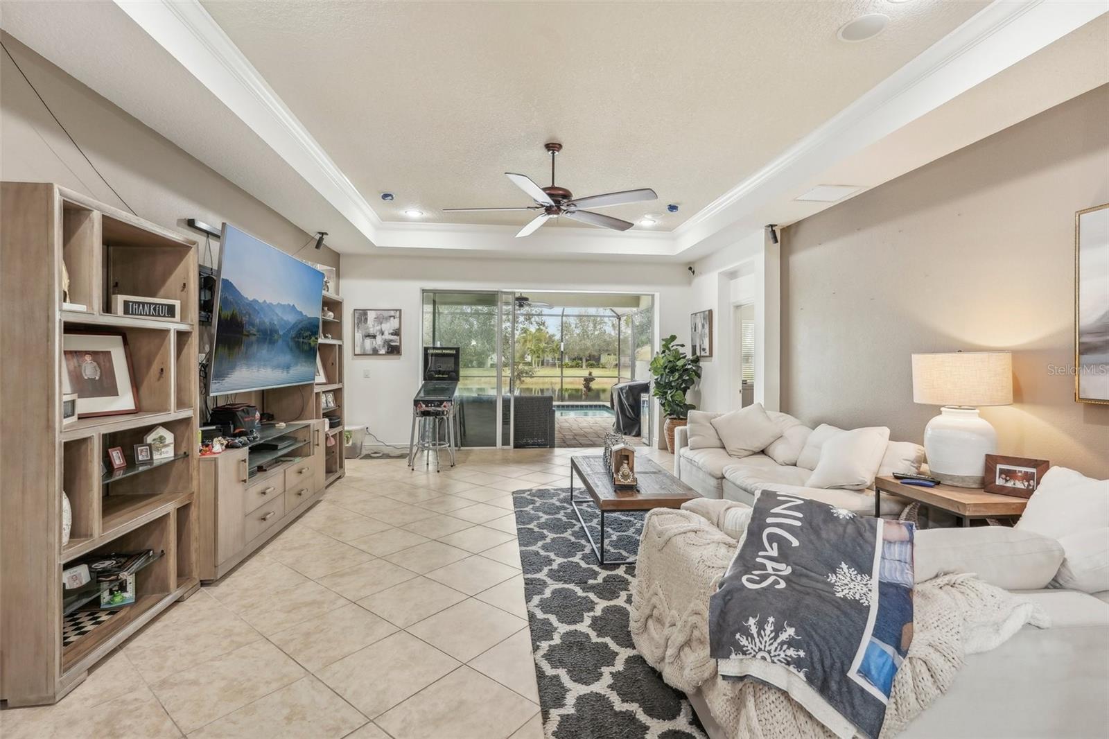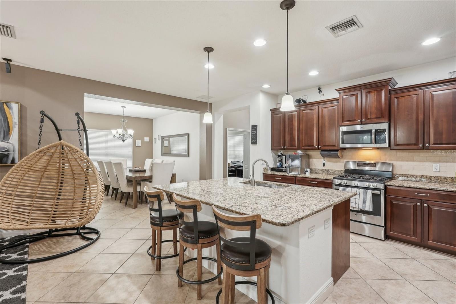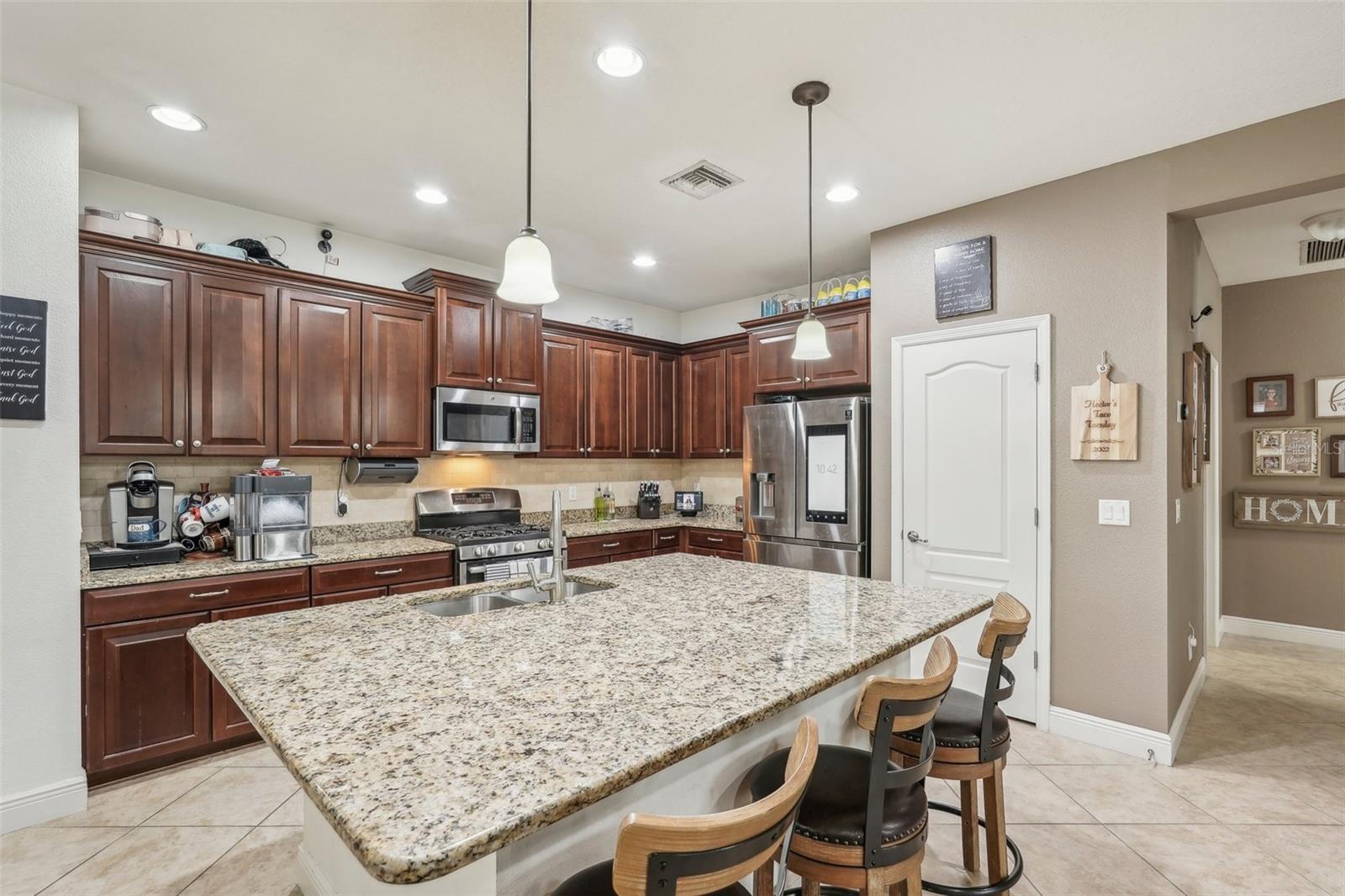 Discover this stunning Lakewood Ranch home with captivating views and the perfect balance of space and sophistication. An impressive layout featuring 5 total bedrooms plus a den/office, complemented by a spacious upstairs suite serving as a second primary bedroom—ideal for hosting guests or creating a private oasis. With 4 full baths and a spacious 3-car garage, this home effortlessly combines style and functionality. The open-concept design centers around a chef’s kitchen that will surely delight culinary lovers. Anchored by a grand breakfast island, the kitchen boasts elegant Cherry Spice cabinetry, gleaming stainless-steel appliances, and stunning Santa Cecilia granite countertops. Stylish 18”x18” tile flooring flows throughout the main living areas, while pocket sliders extend the indoor living space to a beautiful outdoor haven with serene pond views. Nestled within the award-winning Central Park community at Lakewood Ranch, residents experience a vibrant, nature-inspired lifestyle with lush green spaces, nature preserves, and a neighborhood park featuring tennis courts, two dog parks, picnic pavilions, and a splash park. New AC units 2021, New water heater 2024, New pool heater 2024. Located just east of I-75, this community provides easy access to premier golf courses, shopping, dining, medical facilities, and highly rated schools. Experience the extraordinary lifestyle waiting for you at Central Park at Lakewood Ranch.