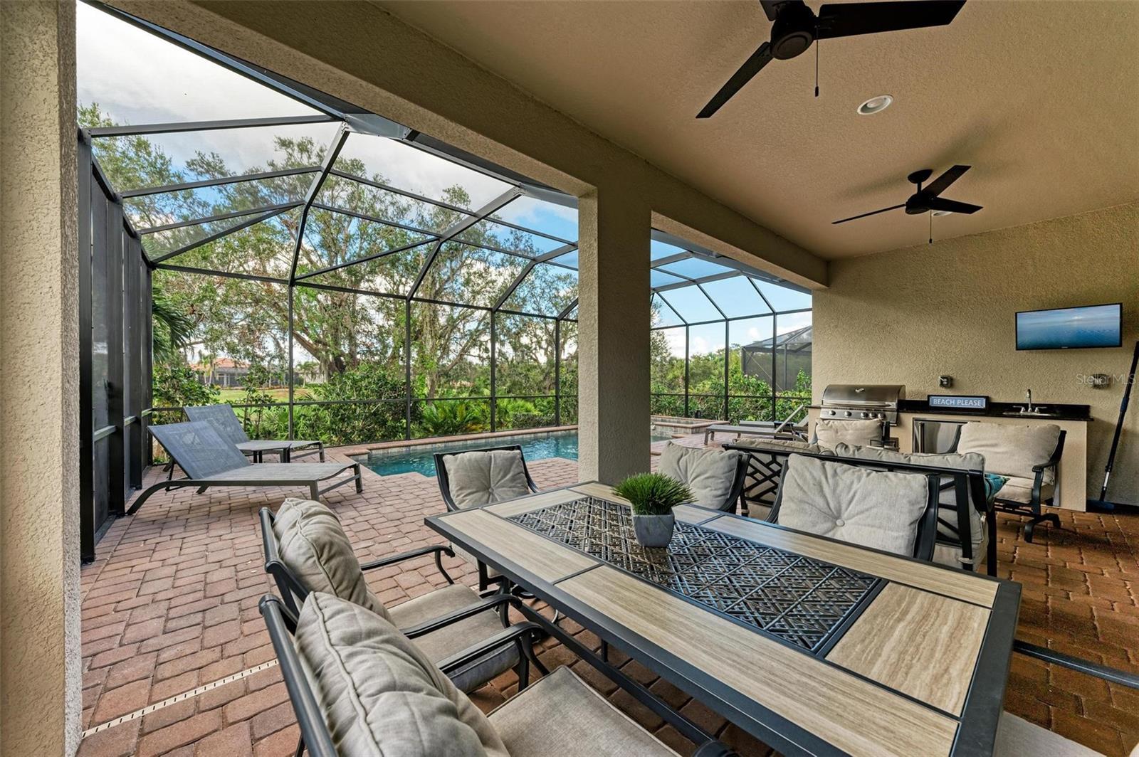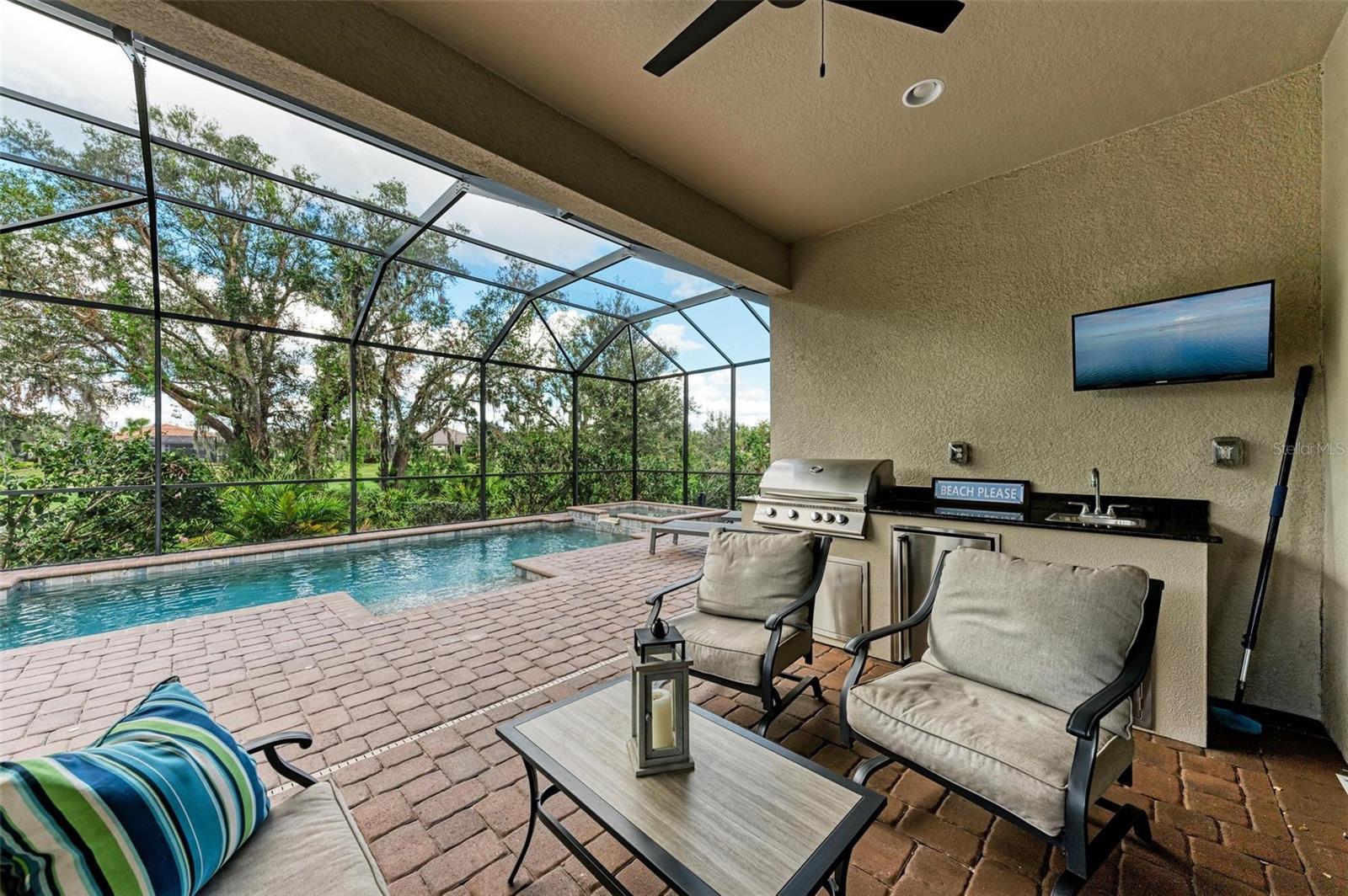 Welcome to 13902 Messina Loop in Esplanade. Relax in the pool and built in spa surrounded by mature landscaping on the golf course! Deeded golf membership included! Your outdoor kitchen is ready for year round use. With 4 bedrooms and 3.5 baths, this home has room for all. The main level features the laundry room, a den/office or flex room, the primary bedroom and 2nd bedroom along with 2 and a half bathrooms. Upstairs features 2 more bedrooms and 1 bath. A 3 car garage gives you ample storage solutions, even a place to park your golf cart should you choose. Esplanade Golf and Country Club at Lakewood Ranch is a premier community with resort-style amenities including golf, tennis, pickle-ball, bocce ball, two amenity centers, fitness centers with resistance pool, lap pool, and resort-style pool along with Bahama bar and Culinary Center. Call today for your appointment to view!