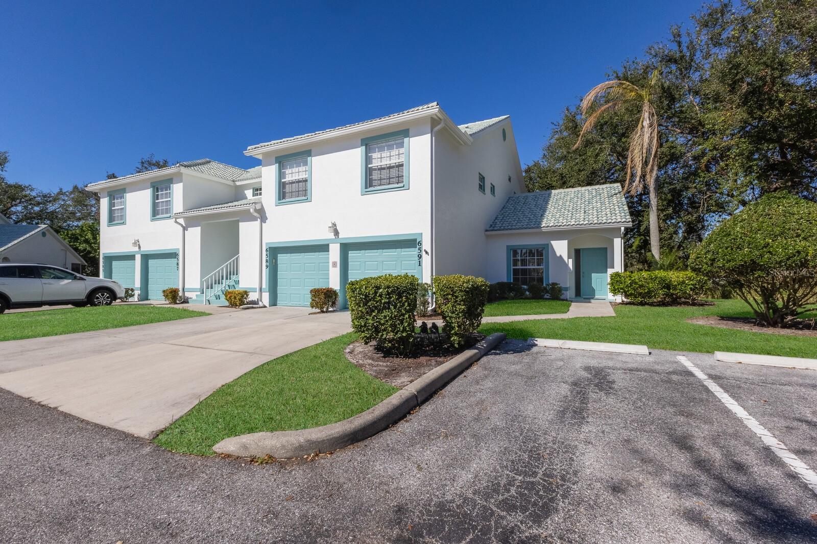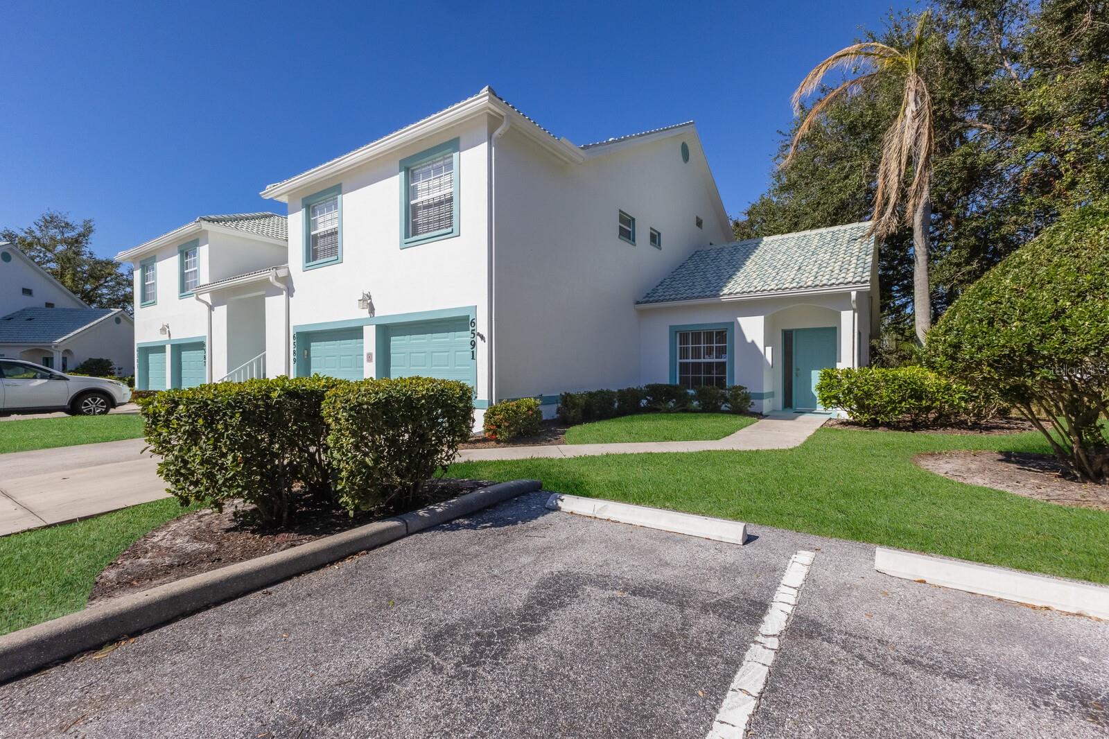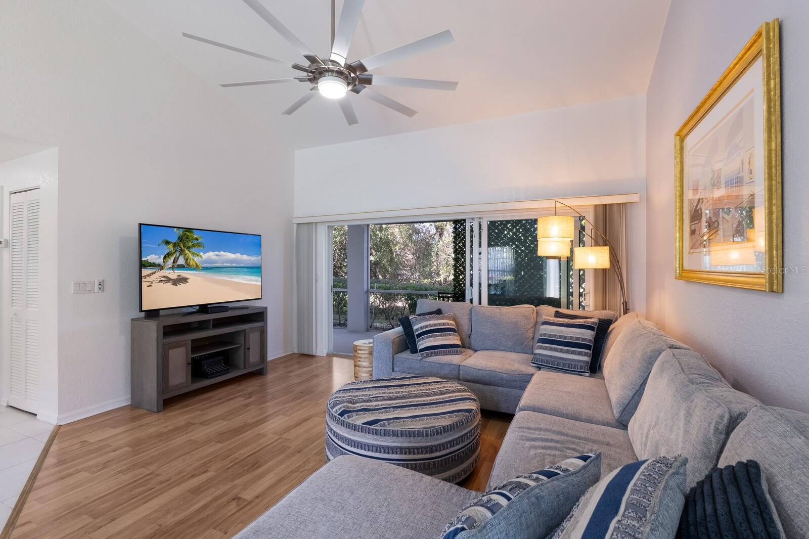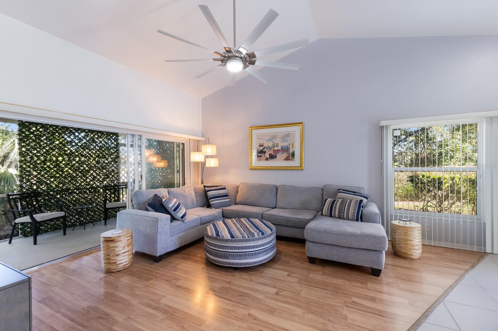 Welcome home to this charming and rare find - a maintenance-free condo nestled in a luxurious boutique golf course community, where membership is optional! This beautifully maintained ground-floor, corner unit offers a perfect blend of privacy and convenience. Step inside this freshly painted 2-bedroom, 2-bath condo, and be welcomed by an open floor plan with soaring cathedral ceilings in the combination great room/dining room, updated with laminate flooring and ceramic tile. The spacious primary suite features an en-suite bath with dual sinks, a walk-in shower, and a built-in closet for ultimate comfort and functionality. Relax and unwind on the large private screened-in lanai, a perfect spot to enjoy your morning coffee or an evening breeze. This furnished home includes valuable upgrades and updates such as a new roof in 2024 and new washer and dryer in 2023, all new ceiling fans and kitchen fandelier installed in 2024, ensuring comfort, efficiency and peace of mind. The spacious one-car garage provides ample storage for all your gear and essentials. Meticulously cared for and move-in ready, this home makes it easy to embrace the stress-free Florida lifestyle. Perfectly located, you'll be just minutes from pristine Gulf of Mexico beaches, fantastic shopping, fine dining, tennis , pickleball all with easy access to everything Sarasota, Bradenton and Lakewood Ranch has to offer.
