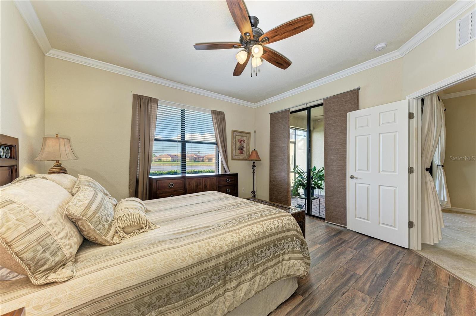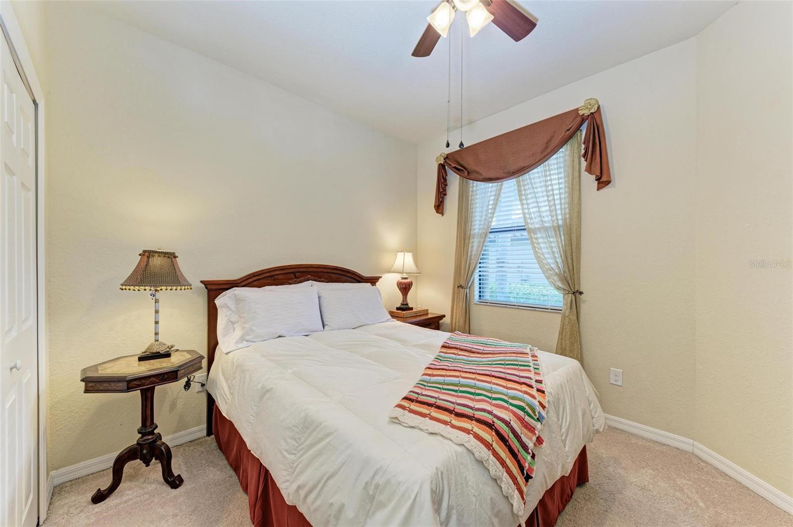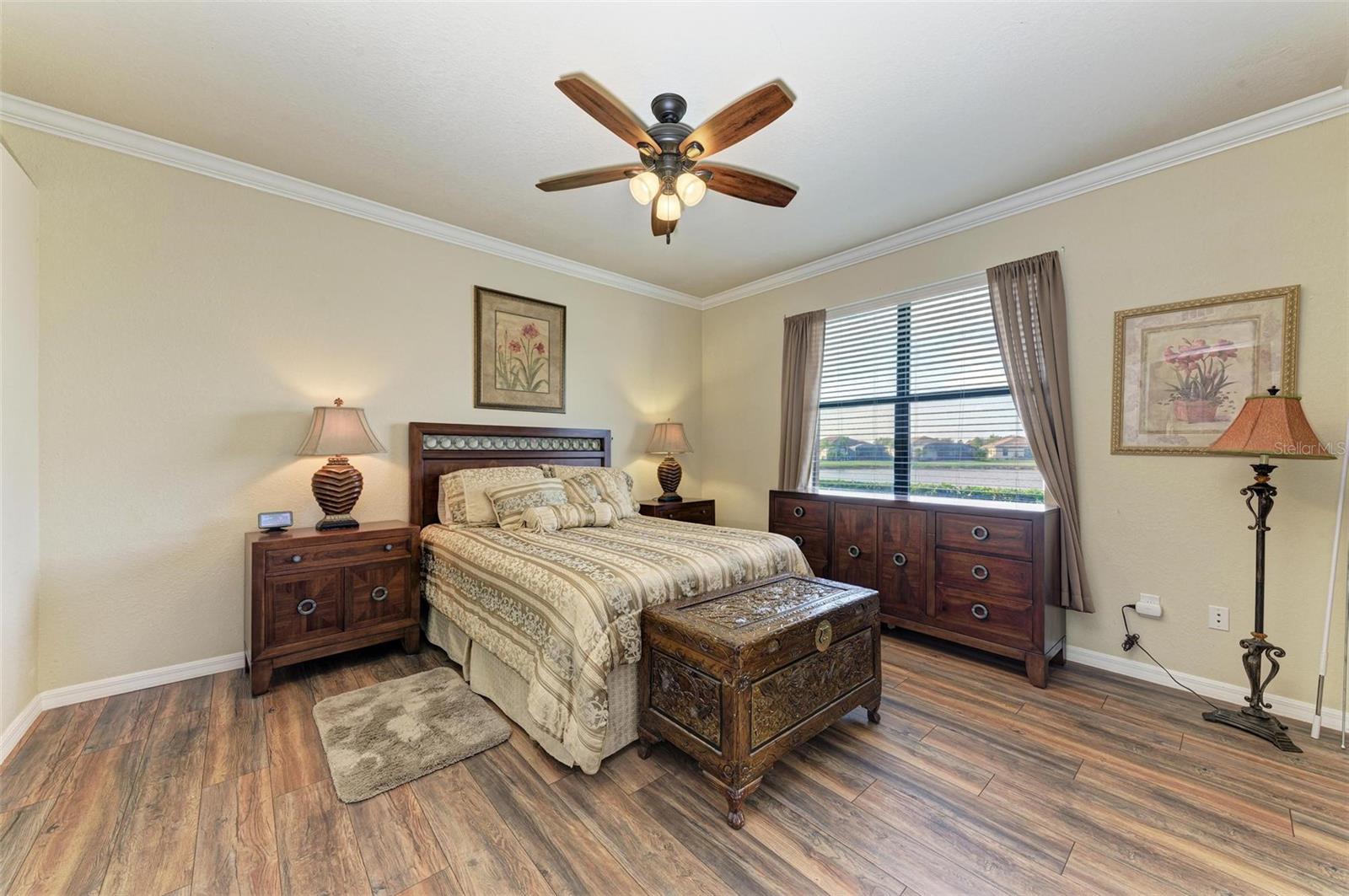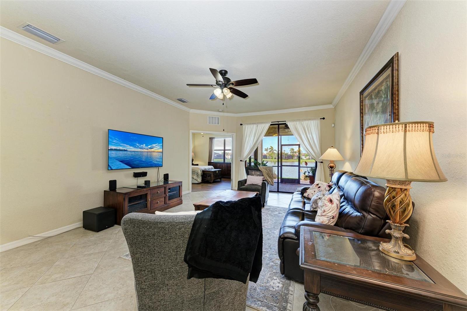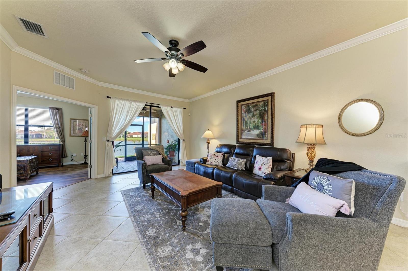 Beautifully furnished villa offers an active, maintenance-free lifestyle and peaceful environment with the serene water views in Bradenton's River Strand Golf and Country Club. The home boasts an open floor plan with two bedrooms, a den/office, two bathrooms and a two-car attached garage. It is designed in a split plan with the primary bedroom in the back and the second bedroom in the front, which provides privacy for your guests and family! The kitchen is appointed with granite counter tops, 42-inch cabinets, stainless steel appliances, breakfast bar and pantry. There is a large dining room that is perfect for entertaining and it is open to the family room, which provides space to relax after a long day at the pool or on the golf course! The den has wood flooring and built-in wood shelving and desks with granite counter tops – perfect for those working from home or the craft enthusiasts. The primary bedroom overlooks the beautiful lake and it is a perfect retreat, complete with wood flooring, two closets with custom organizers and an en-suite bathroom that has a soaking tub, walk-in shower and dual. Enjoy the relaxing views on your screened-in lanai which is equipped with a hurricane screen that is easy to operate during a storm or keeps you dry from the rain! There is an extended patio outside as well for grilling, soaking up the sun or entertaining. The lanai can be extended to expand your outdoor living space as well. There are also accordion hurricane shutters on every window that provide hassle-free peace of mind! The AC was replaced in 2021 and has a UV light for air purification. The laundry room and garage have new cabinetry that provides ample storage! There is no shortage of amenities in River Strand where you can take a swim in one of their two resort style pools, heated spa, 6 satellite pools, or enjoy the tennis courts, 8 pickleball courts, fitness center, or clubhouse complete with onsite restaurant. The 39,000 square foot clubhouse was recently refurbished in Floridian colors and character and offers a semi-formal dining area, a grille room, and a Tiki bar. River Strand hosts several events throughout the year with live entertainment. There is also a golf course where you can pay to play! The HOA fee includes cable tv, exterior maintenance, access to the clubhouse/amenities, lawn care, irrigation. Conveniently located near shopping, such as Costco, Walmart, Publix, UTC Mall, restaurants, and parks, walking trails, and only 30 minutes from the area’s stunning Gulf Coast beaches (Bradenton Beach, Siesta Key, Anna Maria Island). Embrace the perfect balance of comfort, luxury, and active living in this stunning villa. Don’t miss your chance to make it yours—schedule your showing today! *Furniture available on separate bill of sale*