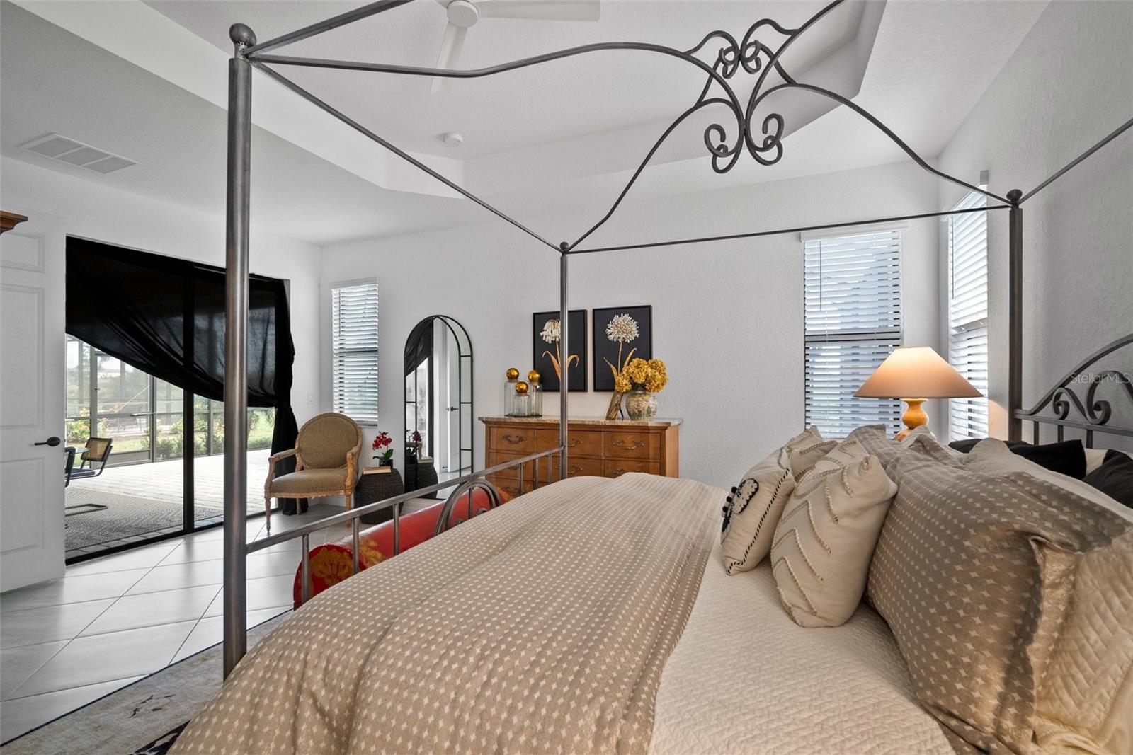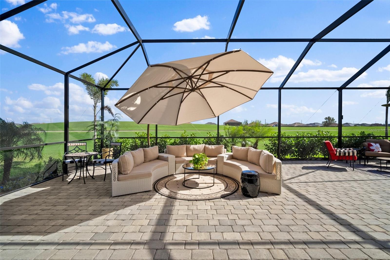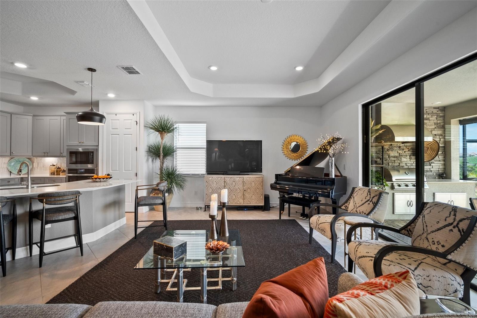 Golf included in HOA featuring two Champion Golf Courses (Featured on The Korn Ferry Tour). Nestled within the prestigious Lakewood National Golf Club community in Lakewood Ranch, this exquisite home offers an unparalleled lifestyle for golf enthusiasts and luxury seekers alike. The open-concept Isabella floor plan features 4 bedrooms and 2 full baths in a split layout for added privacy. Step inside to discover a spacious kitchen featuring elegant quartz countertops, solid wood cabinetry, a stone backsplash, a gas cooktop, a built-in oven, under-cabinet lighting, and an expansive breakfast bar overlooking the living room. The formal dining area is ideal for entertaining, while the living room boasts tray ceilings and large sliding glass doors, opening to the inviting extended lanai. The primary suite is a true sanctuary, complete with dual walk-in California closets, an ensuite bathroom with double sinks, a glass-enclosed walk-in shower, and a luxurious garden tub. Sliding glass doors provide direct access to the lanai, offering a seamless blend of indoor and outdoor living. Three additional bedrooms and a full guest bathroom provide ample space and functionality. The expansive lanai, equipped with hurricane blinds, overlooks the pristine golf course and is perfect for outdoor entertaining, complete with a full outdoor kitchen featuring a built-in grill and hood, a beverage fridge, seating areas, and dining space. Extra touches throughout the home include a 2-car garage with epoxy flooring, California closets in the garage and laundry room, Ring security system, and gutter installations. Ownership includes a full membership to Lakewood National’s 36-hole championship golf course and access to outstanding amenities. Enjoy the heated main pool with waterfalls and lap lanes, a poolside Tiki Bar & Café, a new clubhouse with two on-site restaurants, tennis and pickleball courts, a state-of-the-art fitness center, and more. Lakewood National offers a Lifestyle Director who organizes trivia and karaoke nights, holiday parties, and music/movie nights. Don’t miss the chance to experience this extraordinary home and lifestyle firsthand. Schedule your private showing today and step into the Lakewood National dream!