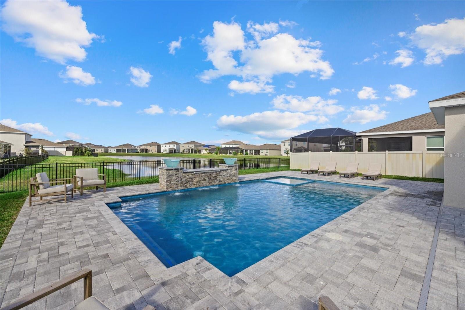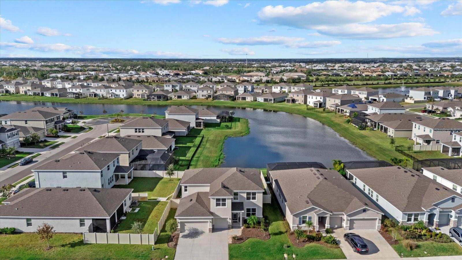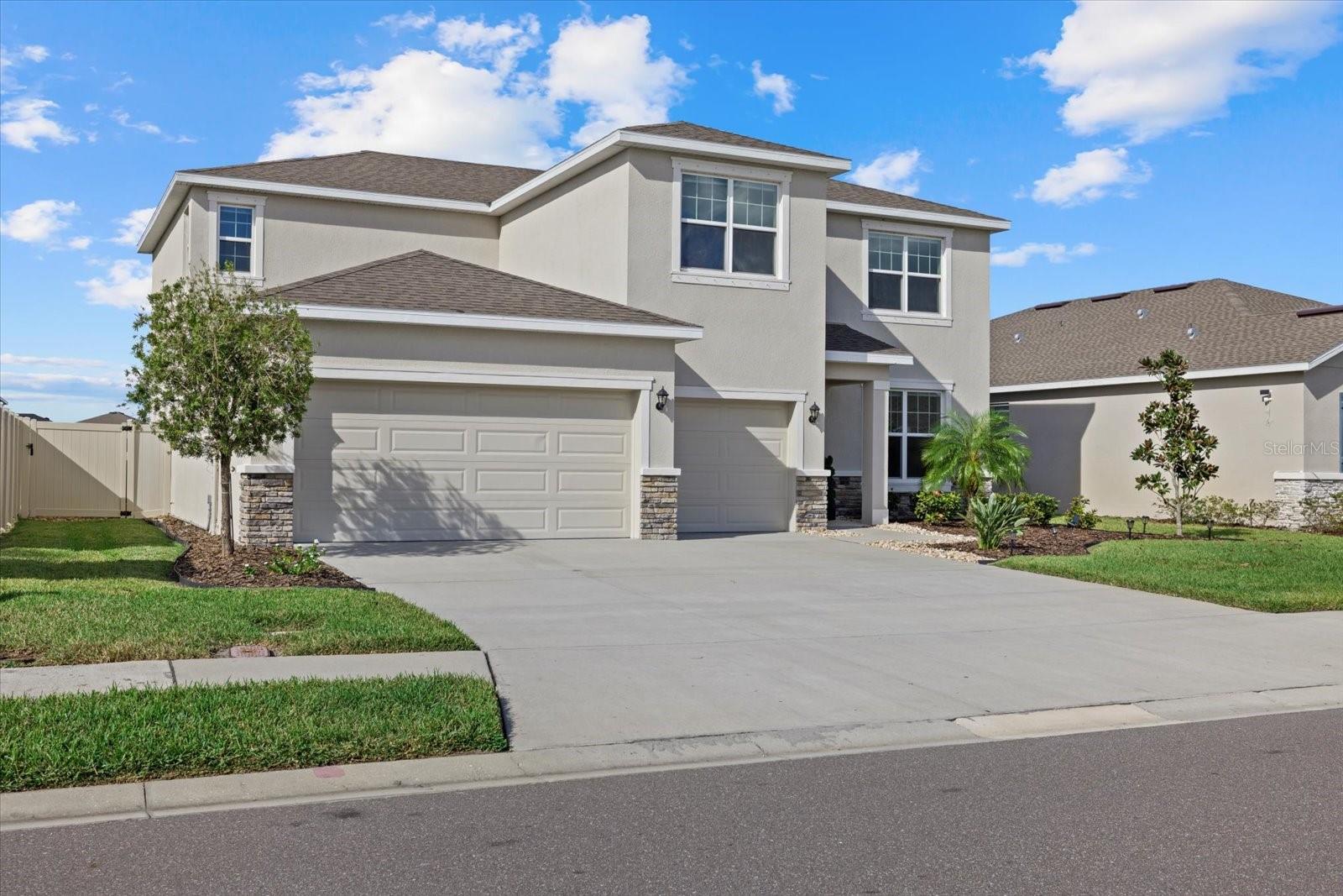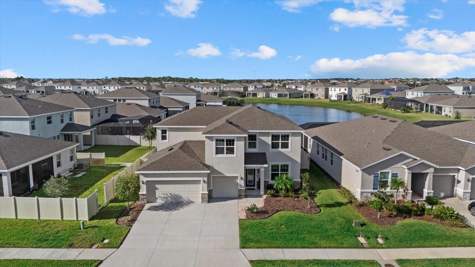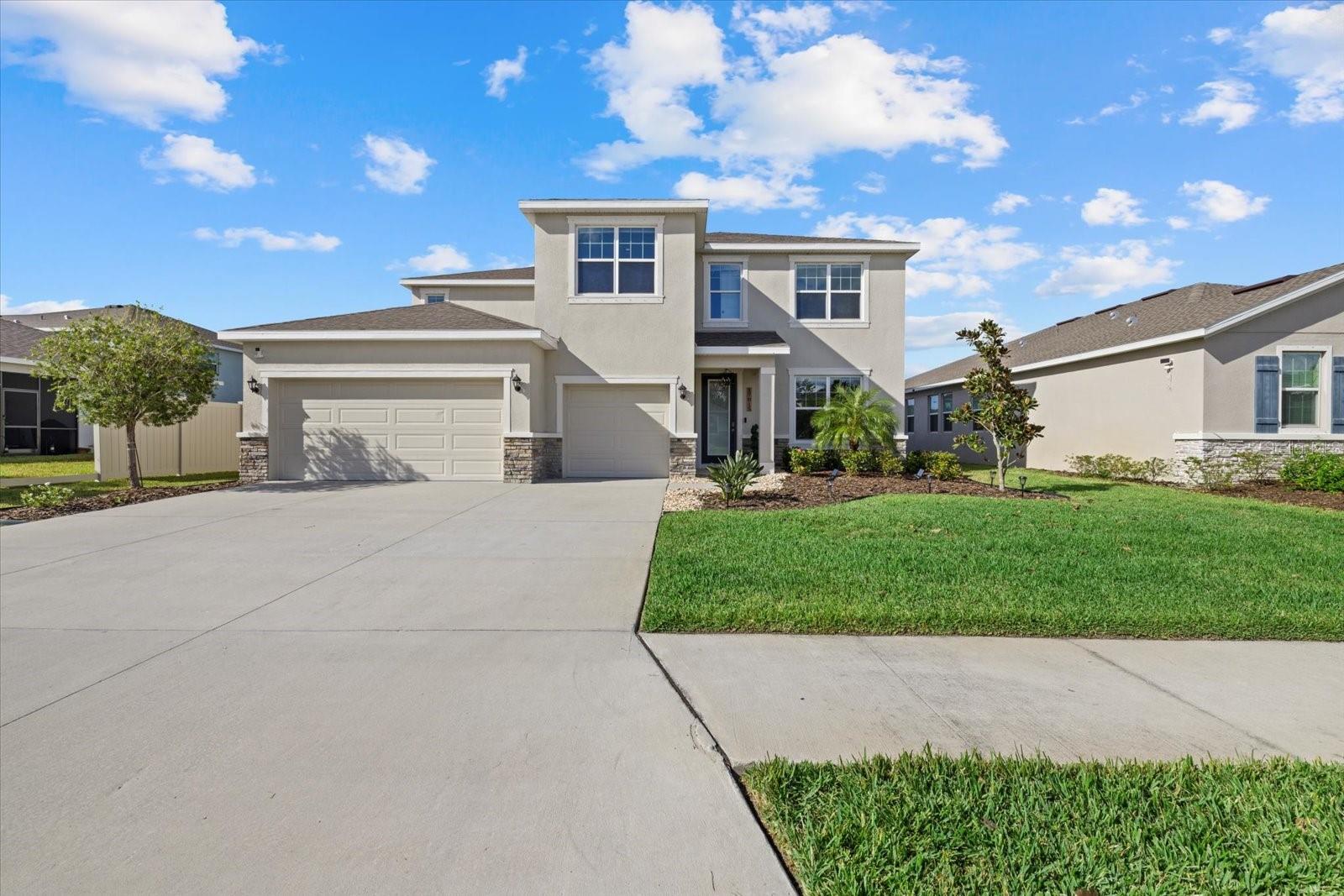Discover the exquisite D.R. Horton's Jordyn Model home in the sought-after Solera community of Lakewood Ranch—the nation's best-selling multi-generational community known for its family-centric charm and modern living. Offering over 3,000 square feet of living space, this meticulously maintained home is ideal for growing families and entertaining. The striking curb appeal and tasteful interior paint reflect the owners' pride of ownership. Upon entry, a showroom-quality epoxy floor in the expansive three-car garage sets the stage for the impressive details inside. The living room features a striking split face stone wall, while the owner's suite is enhanced by a custom board and batten accent wall. The open floor plan offers flexibility, with a bonus room near the foyer for work or leisure. A spacious guest bedroom on the first floor includes a full bathroom, providing privacy and comfort for visitors. The gourmet kitchen blends style and function with granite countertops, a large island, elegant cabinetry, modern light fixtures, and stainless steel appliances—all included. It flows seamlessly into the great room, dining area, and covered lanai, creating an ideal space for entertaining. Upstairs, plush carpeting leads to a versatile loft perfect for a game room or home theater. Each generously sized bedroom offers beautiful views. The luxurious owner's retreat features two walk-in closets, dual sinks, granite countertops, and a garden tub for ultimate relaxation. The highlight of this home is the stunning pool with spa—a private backyard oasis perfect for swimming, relaxing, and outdoor entertaining. The fenced backyard combines PVC and iron fencing, offering privacy while framing breathtaking pond views and picturesque sunrises and sunsets. Situated in a prime location, this home is minutes from upscale shopping, fine dining, scenic parks, top-rated golf courses, and Florida's renowned beaches. With easy access to Sarasota, St. Petersburg, and Tampa, the best of the Sunshine State is within reach. Solera residents enjoy resort-style amenities, including a luxurious pool, elegant clubhouse, top-tier schools, and a charming tot-lot. This community seamlessly blends luxury and comfort, creating an idyllic environment for families to thrive. Don't miss the opportunity to own this extraordinary home. Schedule your private showing today and experience the beauty and sophistication for yourself.