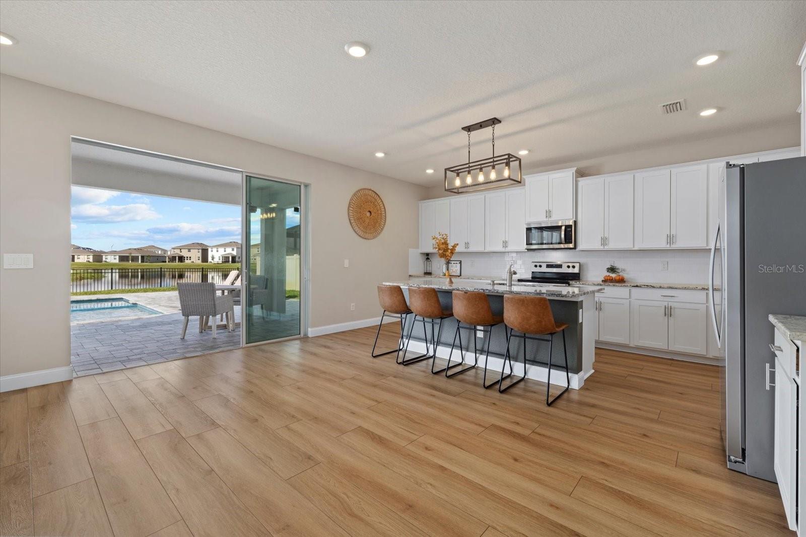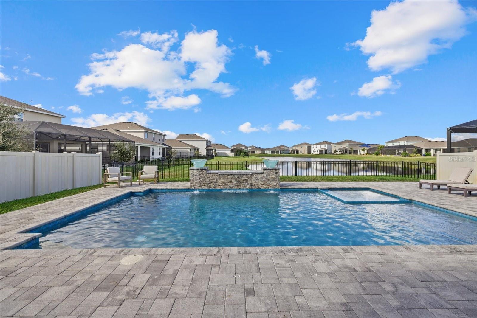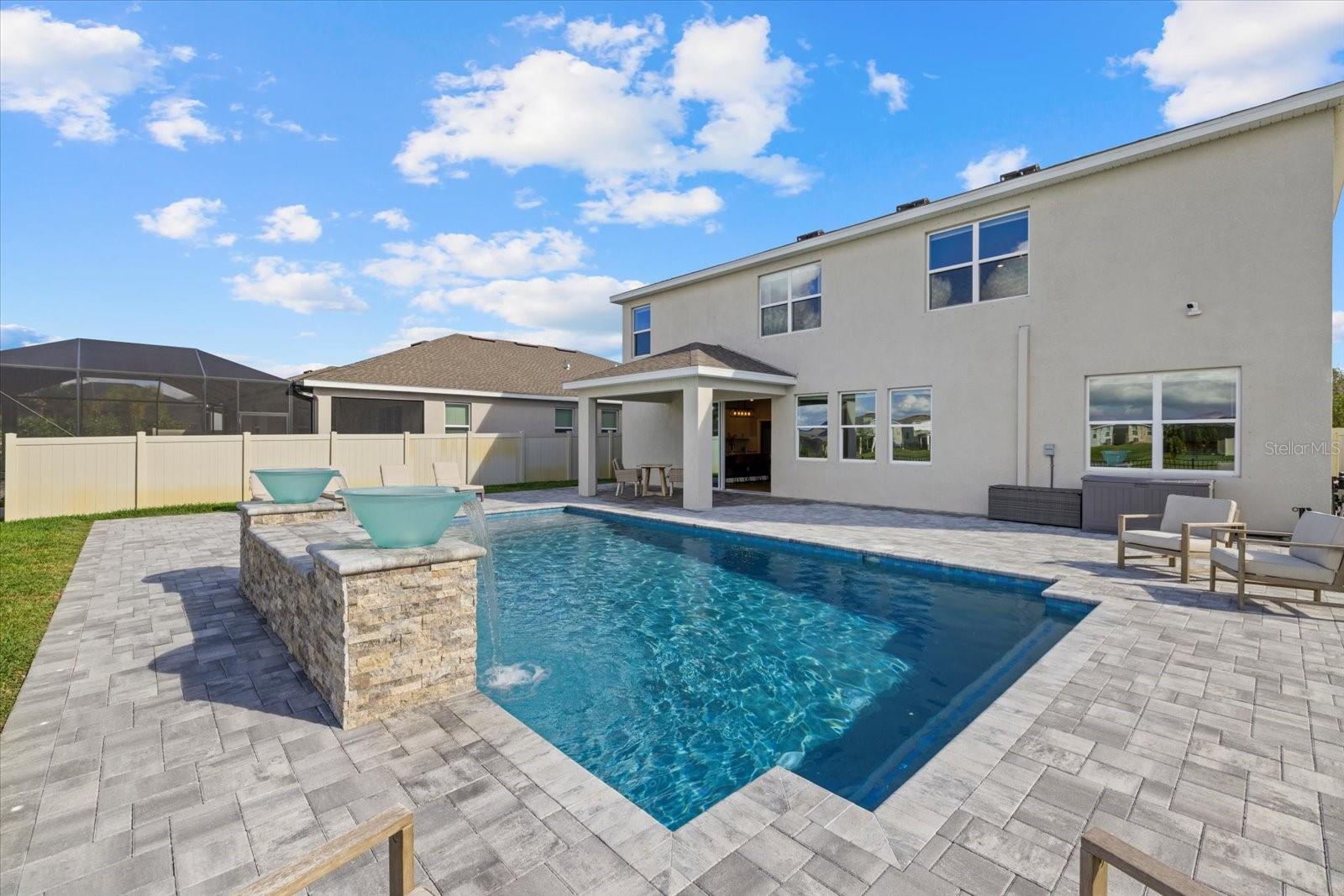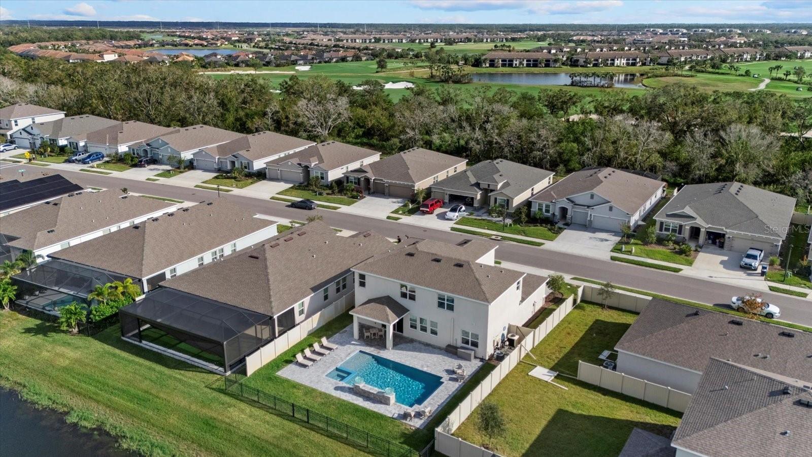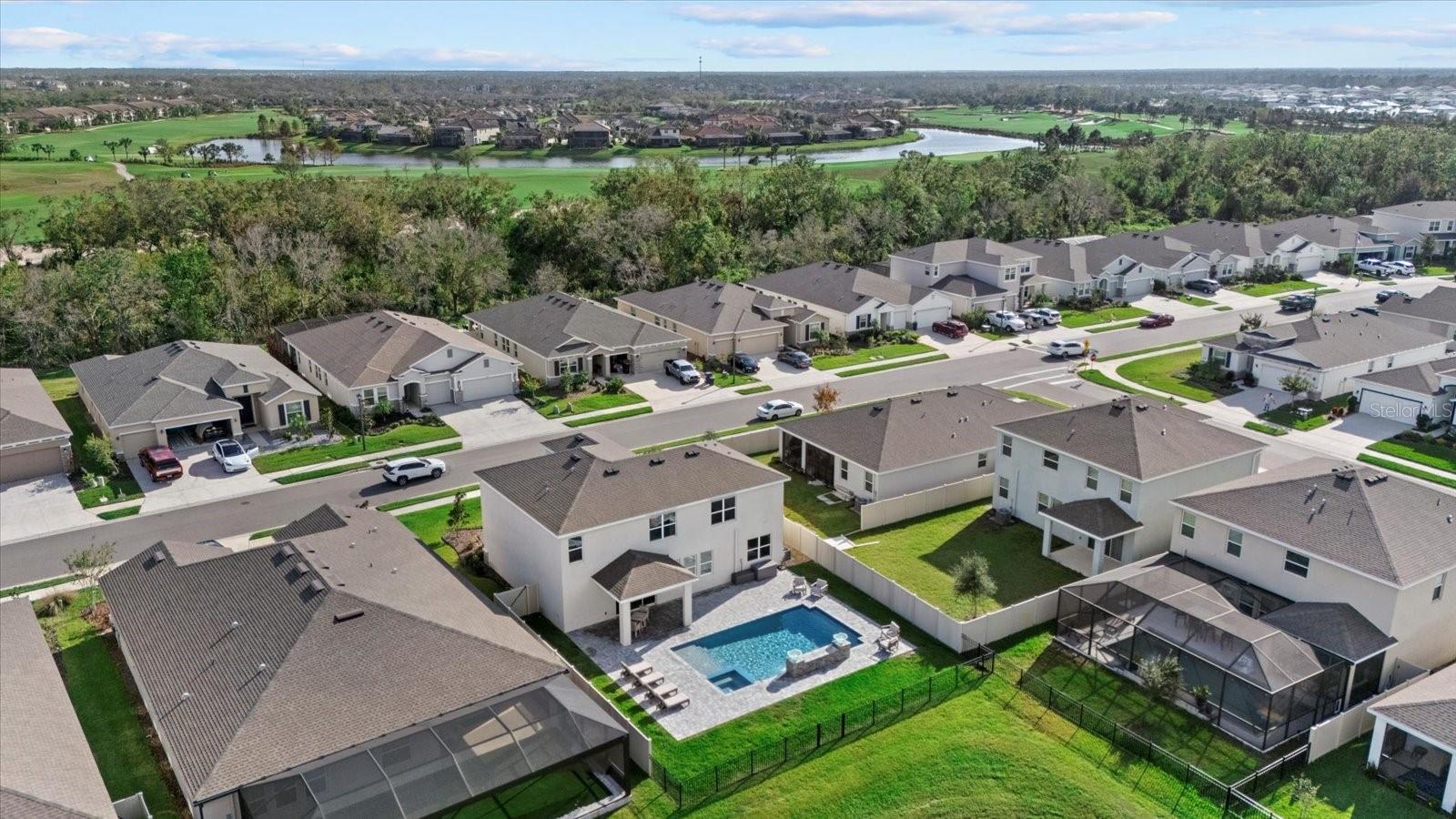 Discover the exquisite D.R. Horton's Jordyn Model home in the sought-after Solera community of Lakewood Ranch—the nation's best-selling multi-generational community known for its family-centric charm and modern living. Offering over 3,000 square feet of living space, this meticulously maintained home is ideal for growing families and entertaining. The striking curb appeal and tasteful interior paint reflect the owners' pride of ownership. Upon entry, a showroom-quality epoxy floor in the expansive three-car garage sets the stage for the impressive details inside. The living room features a striking split face stone wall, while the owner's suite is enhanced by a custom board and batten accent wall. The open floor plan offers flexibility, with a bonus room near the foyer for work or leisure. A spacious guest bedroom on the first floor includes a full bathroom, providing privacy and comfort for visitors. The gourmet kitchen blends style and function with granite countertops, a large island, elegant cabinetry, modern light fixtures, and stainless steel appliances—all included. It flows seamlessly into the great room, dining area, and covered lanai, creating an ideal space for entertaining. Upstairs, plush carpeting leads to a versatile loft perfect for a game room or home theater. Each generously sized bedroom offers beautiful views. The luxurious owner's retreat features two walk-in closets, dual sinks, granite countertops, and a garden tub for ultimate relaxation. The highlight of this home is the stunning pool with spa—a private backyard oasis perfect for swimming, relaxing, and outdoor entertaining. The fenced backyard combines PVC and iron fencing, offering privacy while framing breathtaking pond views and picturesque sunrises and sunsets. Situated in a prime location, this home is minutes from upscale shopping, fine dining, scenic parks, top-rated golf courses, and Florida's renowned beaches. With easy access to Sarasota, St. Petersburg, and Tampa, the best of the Sunshine State is within reach. Solera residents enjoy resort-style amenities, including a luxurious pool, elegant clubhouse, top-tier schools, and a charming tot-lot. This community seamlessly blends luxury and comfort, creating an idyllic environment for families to thrive. Don't miss the opportunity to own this extraordinary home. Schedule your private showing today and experience the beauty and sophistication for yourself.