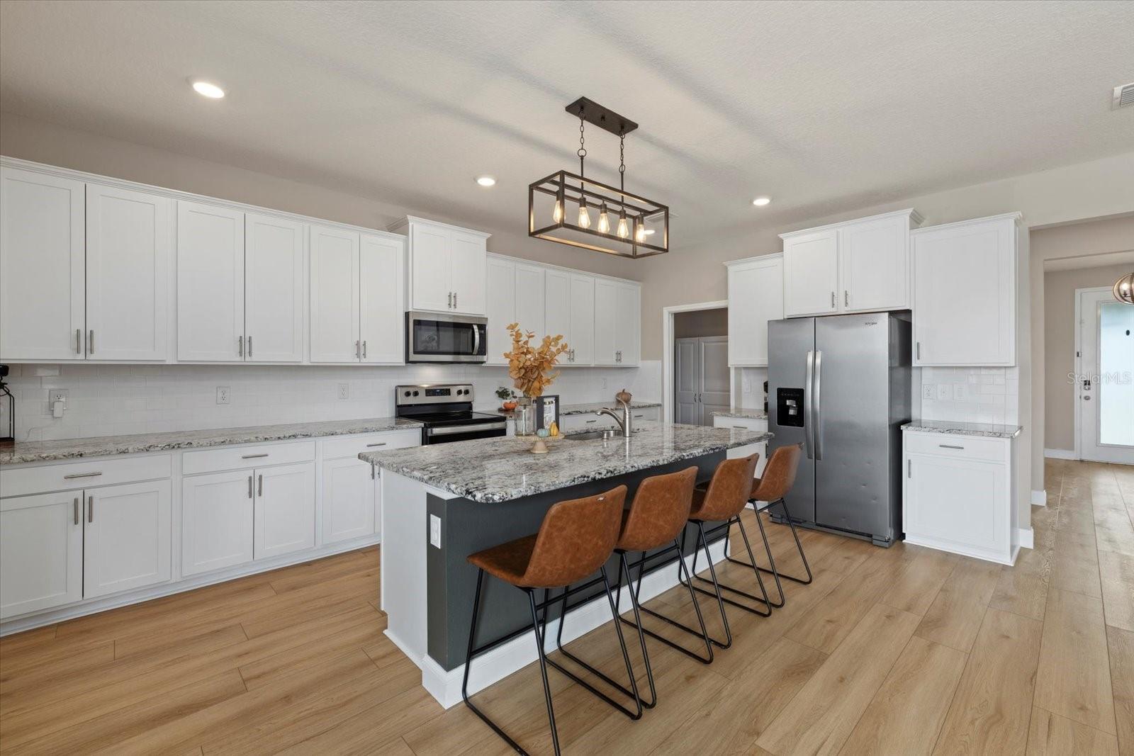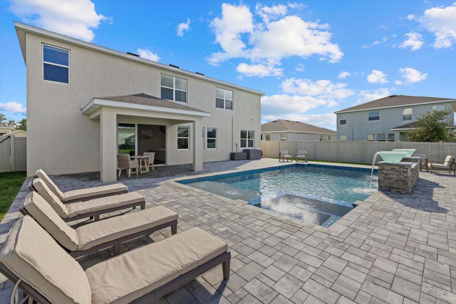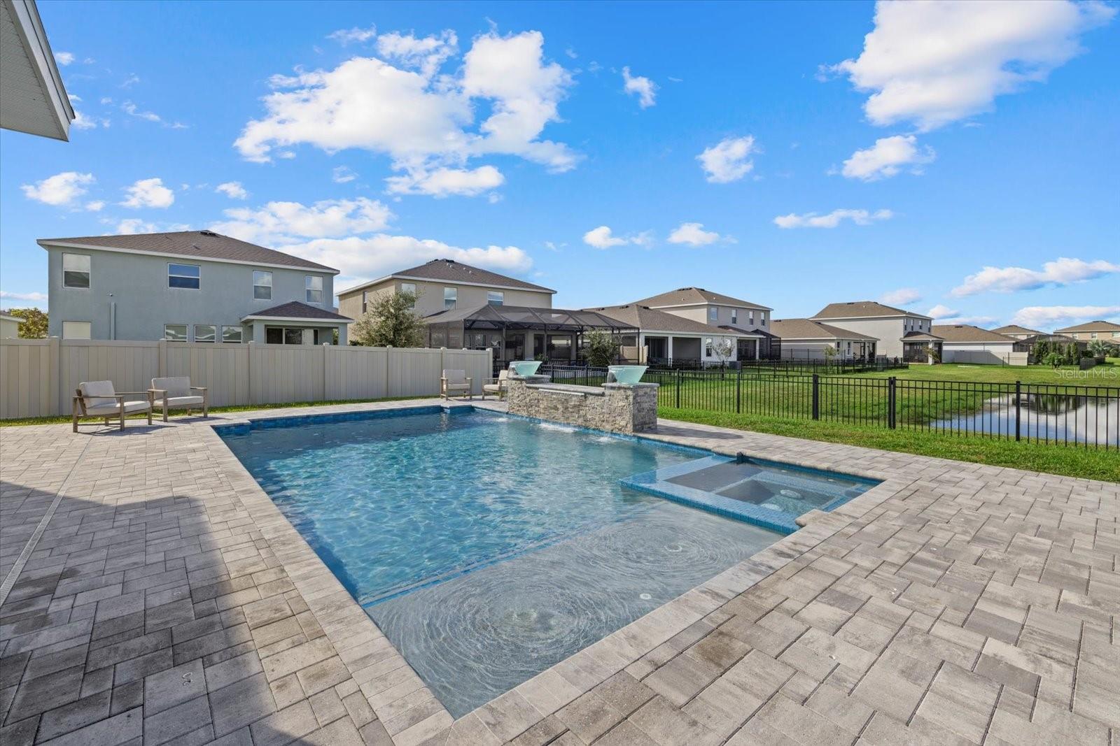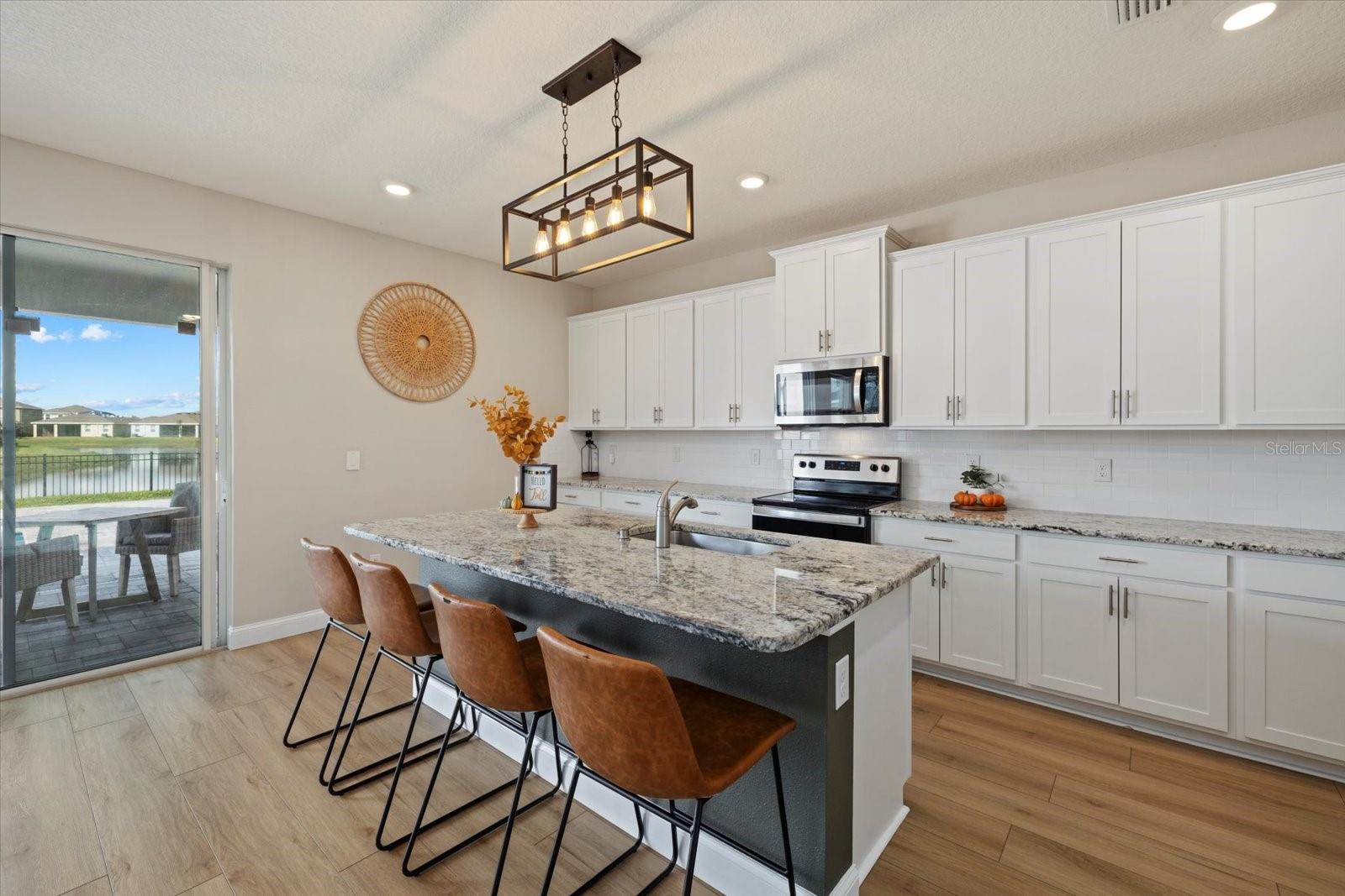 Discover the exquisite D.R. Horton's Jordyn Model home in the sought-after Solera community of Lakewood Ranch—the nation's best-selling multi-generational community known for its family-centric charm and modern living. Offering over 3,000 square feet of living space, this meticulously maintained home is ideal for growing families and entertaining. The striking curb appeal and tasteful interior paint reflect the owners' pride of ownership. Upon entry, a showroom-quality epoxy floor in the expansive three-car garage sets the stage for the impressive details inside. The living room features a striking split face stone wall, while the owner's suite is enhanced by a custom board and batten accent wall. The open floor plan offers flexibility, with a bonus room near the foyer for work or leisure. A spacious guest bedroom on the first floor includes a full bathroom, providing privacy and comfort for visitors. The gourmet kitchen blends style and function with granite countertops, a large island, elegant cabinetry, modern light fixtures, and stainless steel appliances—all included. It flows seamlessly into the great room, dining area, and covered lanai, creating an ideal space for entertaining. Upstairs, plush carpeting leads to a versatile loft perfect for a game room or home theater. Each generously sized bedroom offers beautiful views. The luxurious owner's retreat features two walk-in closets, dual sinks, granite countertops, and a garden tub for ultimate relaxation. The highlight of this home is the stunning pool with spa—a private backyard oasis perfect for swimming, relaxing, and outdoor entertaining. The fenced backyard combines PVC and iron fencing, offering privacy while framing breathtaking pond views and picturesque sunrises and sunsets. Situated in a prime location, this home is minutes from upscale shopping, fine dining, scenic parks, top-rated golf courses, and Florida's renowned beaches. With easy access to Sarasota, St. Petersburg, and Tampa, the best of the Sunshine State is within reach. Solera residents enjoy resort-style amenities, including a luxurious pool, elegant clubhouse, top-tier schools, and a charming tot-lot. This community seamlessly blends luxury and comfort, creating an idyllic environment for families to thrive. Don't miss the opportunity to own this extraordinary home. Schedule your private showing today and experience the beauty and sophistication for yourself.