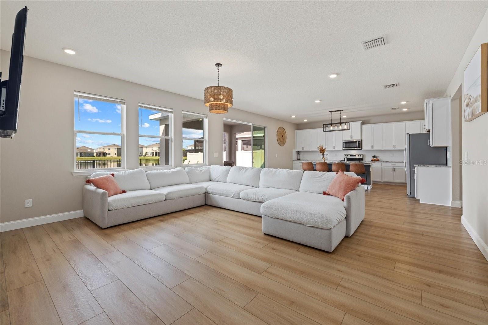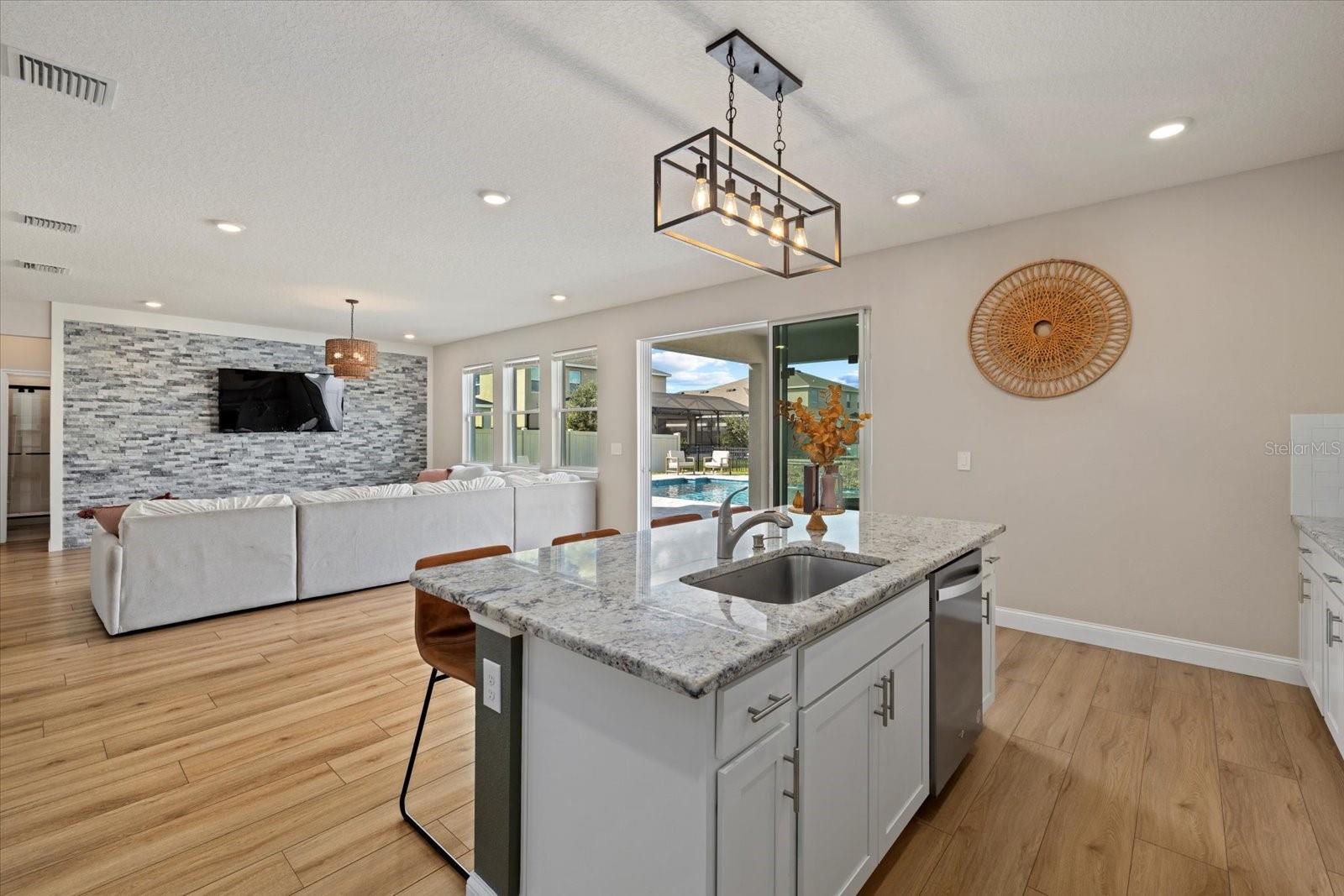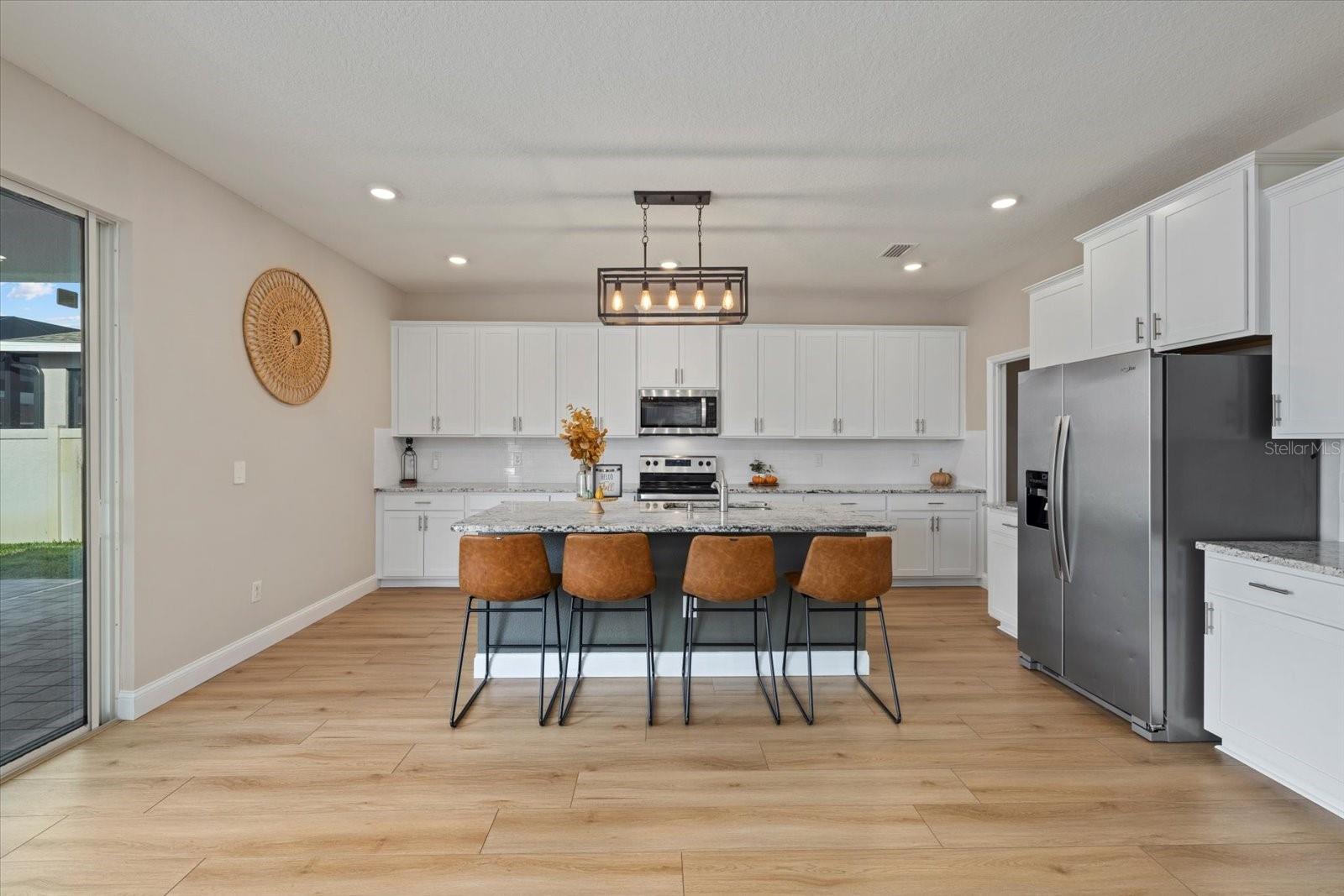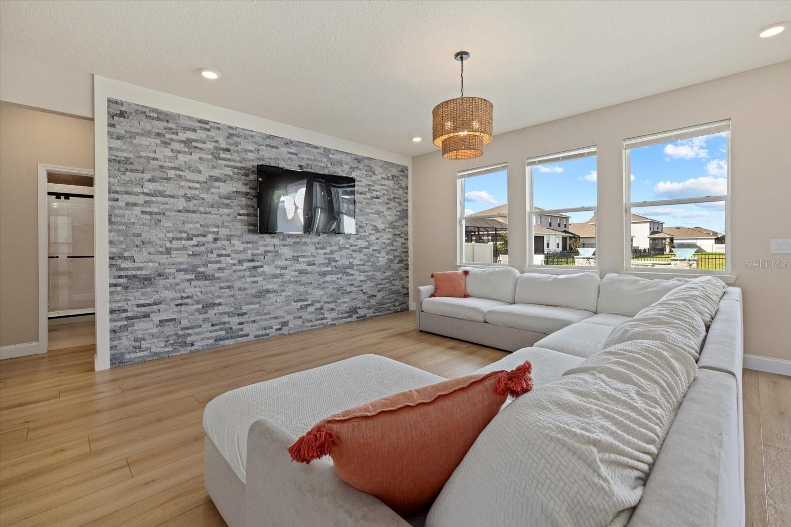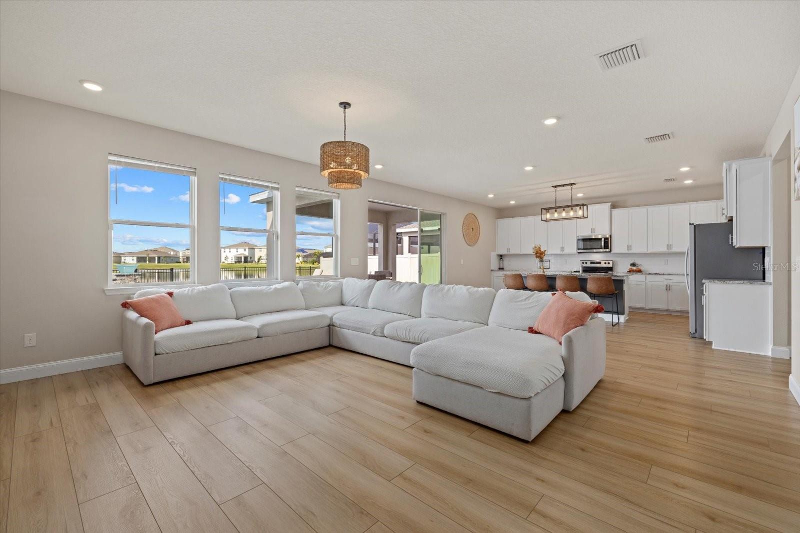Discover the exquisite D.R. Horton's Jordyn Model home in the sought-after Solera community of Lakewood Ranch—the nation's best-selling multi-generational community known for its family-centric charm and modern living. Offering over 3,000 square feet of living space, this meticulously maintained home is ideal for growing families and entertaining. The striking curb appeal and tasteful interior paint reflect the owners' pride of ownership. Upon entry, a showroom-quality epoxy floor in the expansive three-car garage sets the stage for the impressive details inside. The living room features a striking split face stone wall, while the owner's suite is enhanced by a custom board and batten accent wall. The open floor plan offers flexibility, with a bonus room near the foyer for work or leisure. A spacious guest bedroom on the first floor includes a full bathroom, providing privacy and comfort for visitors. The gourmet kitchen blends style and function with granite countertops, a large island, elegant cabinetry, modern light fixtures, and stainless steel appliances—all included. It flows seamlessly into the great room, dining area, and covered lanai, creating an ideal space for entertaining. Upstairs, plush carpeting leads to a versatile loft perfect for a game room or home theater. Each generously sized bedroom offers beautiful views. The luxurious owner's retreat features two walk-in closets, dual sinks, granite countertops, and a garden tub for ultimate relaxation. The highlight of this home is the stunning pool with spa—a private backyard oasis perfect for swimming, relaxing, and outdoor entertaining. The fenced backyard combines PVC and iron fencing, offering privacy while framing breathtaking pond views and picturesque sunrises and sunsets. Situated in a prime location, this home is minutes from upscale shopping, fine dining, scenic parks, top-rated golf courses, and Florida's renowned beaches. With easy access to Sarasota, St. Petersburg, and Tampa, the best of the Sunshine State is within reach. Solera residents enjoy resort-style amenities, including a luxurious pool, elegant clubhouse, top-tier schools, and a charming tot-lot. This community seamlessly blends luxury and comfort, creating an idyllic environment for families to thrive. Don't miss the opportunity to own this extraordinary home. Schedule your private showing today and experience the beauty and sophistication for yourself.