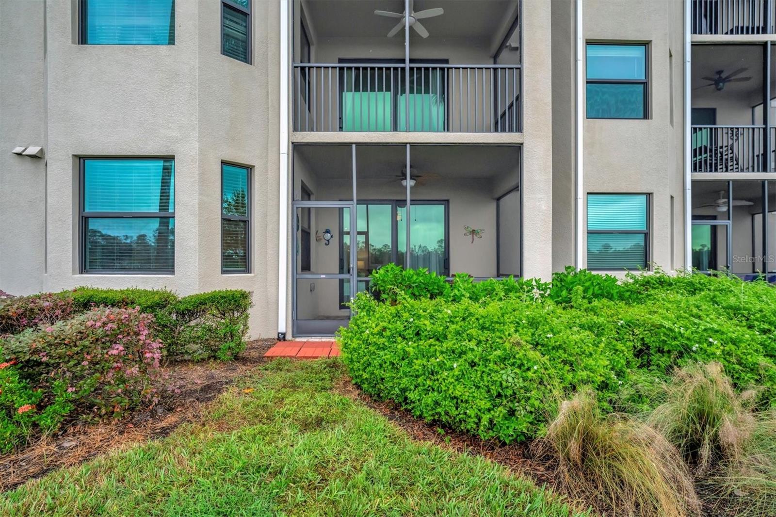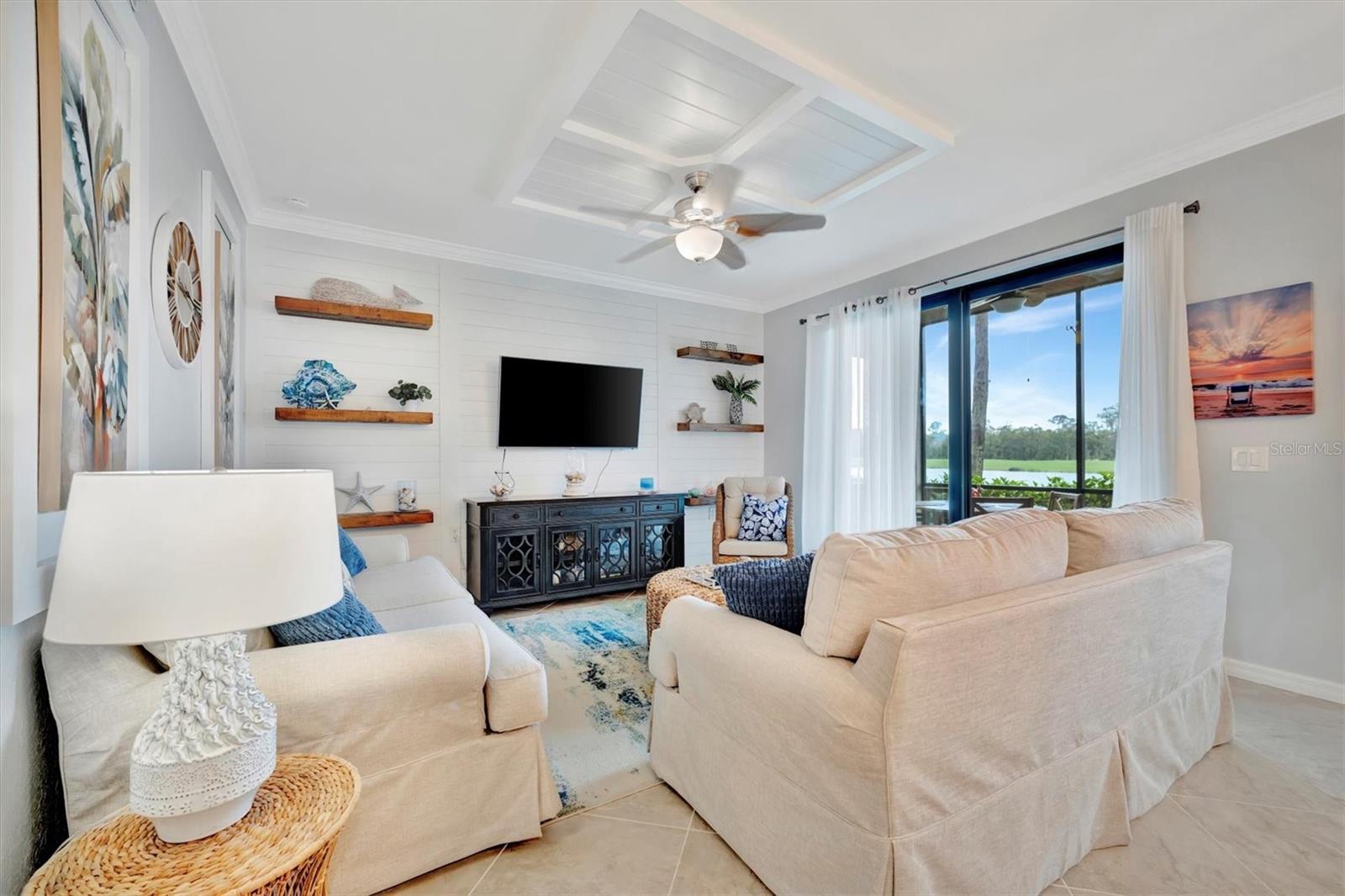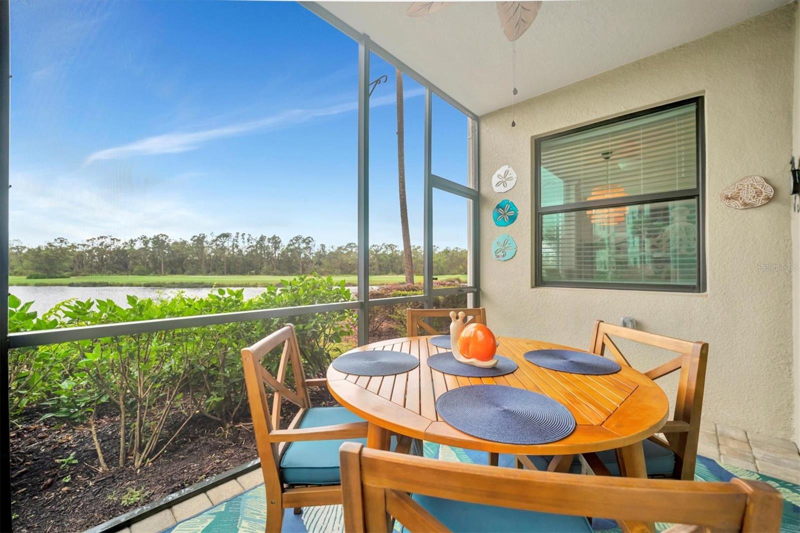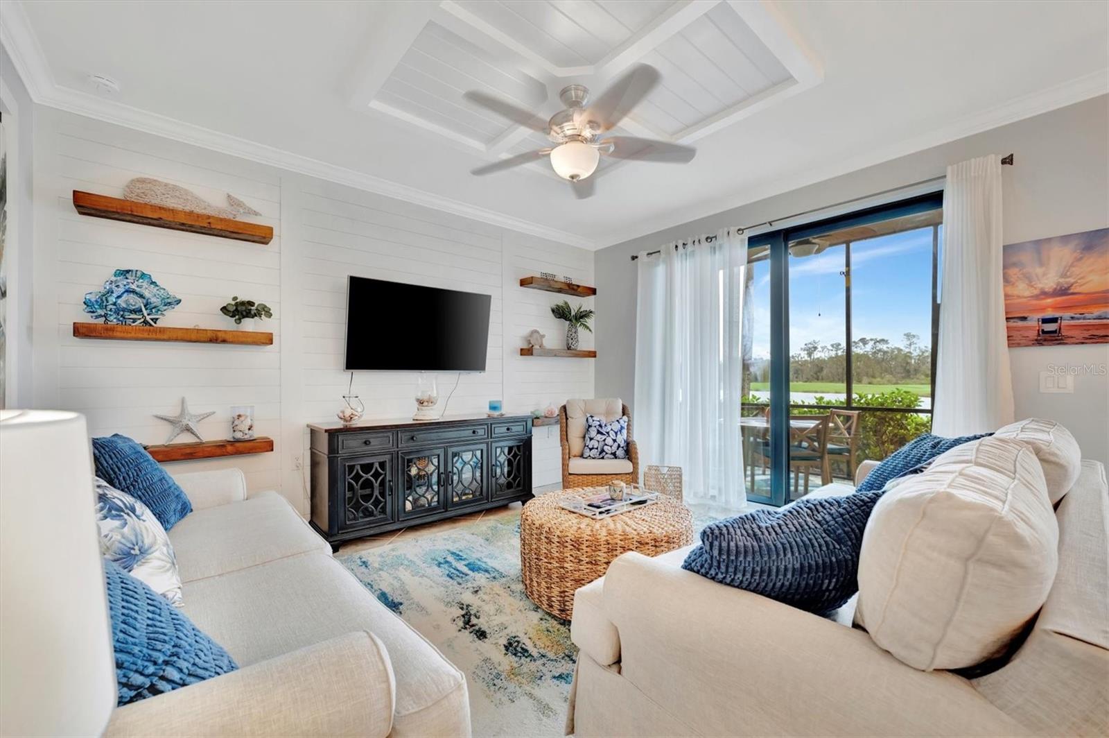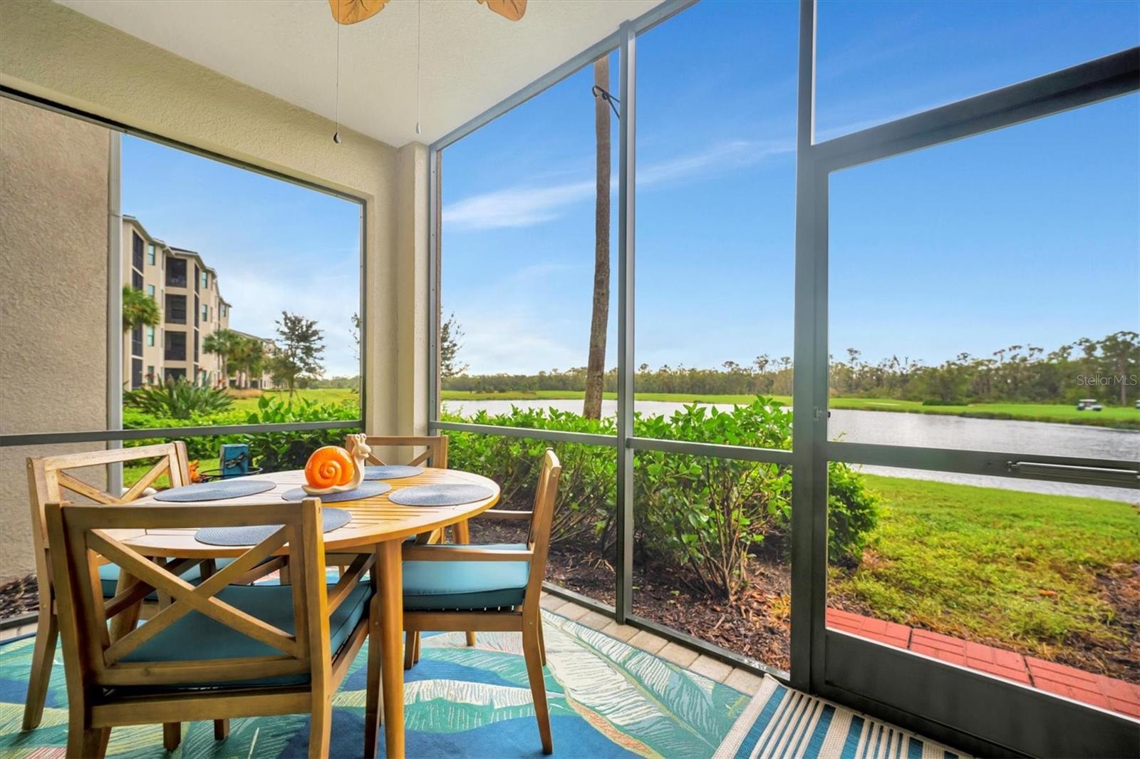 Welcome to paradise! Live in luxury at Lakewood National Golf Club, where residents enjoy membership to the 36-hole Arnold Palmer designed golf community. One of the most beautiful and upgraded units in the community, this custom first floor turnkey home offers a front row seat to the expansive views of hole #16 on the Piper Course. This 2 bedroom/2 bathroom, Birkdale Model features many stylish upgrades including beautiful Board and Batten accented walls, accented living room ceiling, luxury vinyl flooring throughout, custom cupboards and closets, open shelving in living room, upgraded fans in all bedrooms including the lanai, a stunning chandelier, as well as custom shiplap accenting in the living and dining rooms. The kitchen boasts a new full sink and faucet, artfully accented backsplash, beverage cooler, as well as new pendant lighting. The primary suite includes 2 walk-in closets, an en suite bath with a spacious walk-in shower, and granite vanity. This home comes with an assigned covered parking spot and custom shelving in the storage closet for your convenience. With one of the better water views in the community, you will experience wildlife and golf up close and personal from the comfort of your screened-in lanai that is completely sealed, so no visits from geckos or other critters. The brand-new A/C compressor will leave you comfortable, cool and worry free for years to come. Membership boasts access to 36 holes of golf, 24-hour gated security with nightly patrol, a state-of-the-art fitness center with 24-hour access, an onsite fitness director, a TPI certified personal trainer, and a variety of group fitness classes to choose from, saunas in the men’s and women’s locker rooms, 8 lighted Har-Tru tennis courts, 4 pickleball courts, 2 Har-Tru bocce courts, full-service salon/spa, resort-style pool with waterfall features, a spa, and a lap pool. Enjoy dining at the community's 2 restaurants - the poolside Tiki Bar & Grill, and the full service on-site dining experience at Deke’s Grill & Palmer Room located inside the newly finished clubhouse. You will find everything you need within this beautiful gated community.