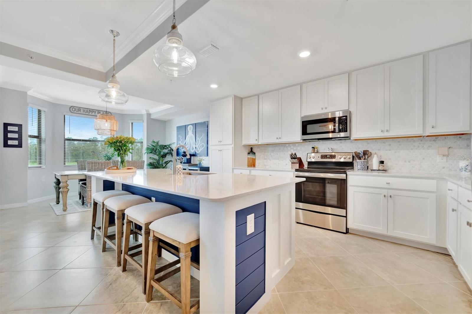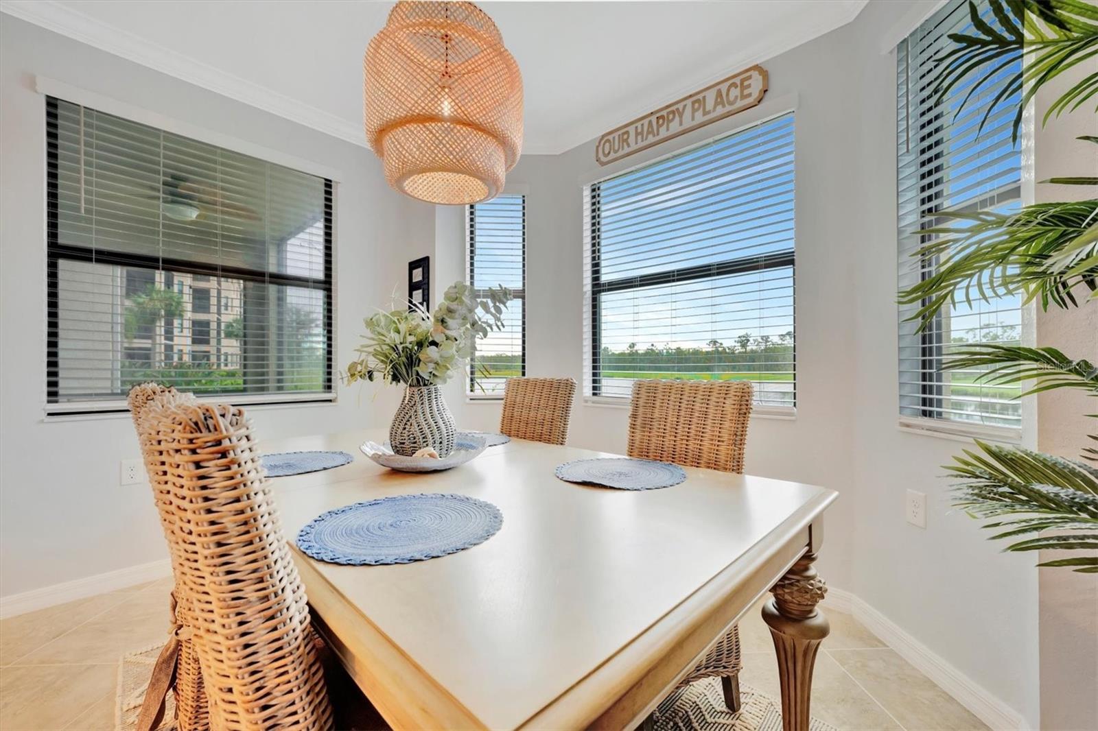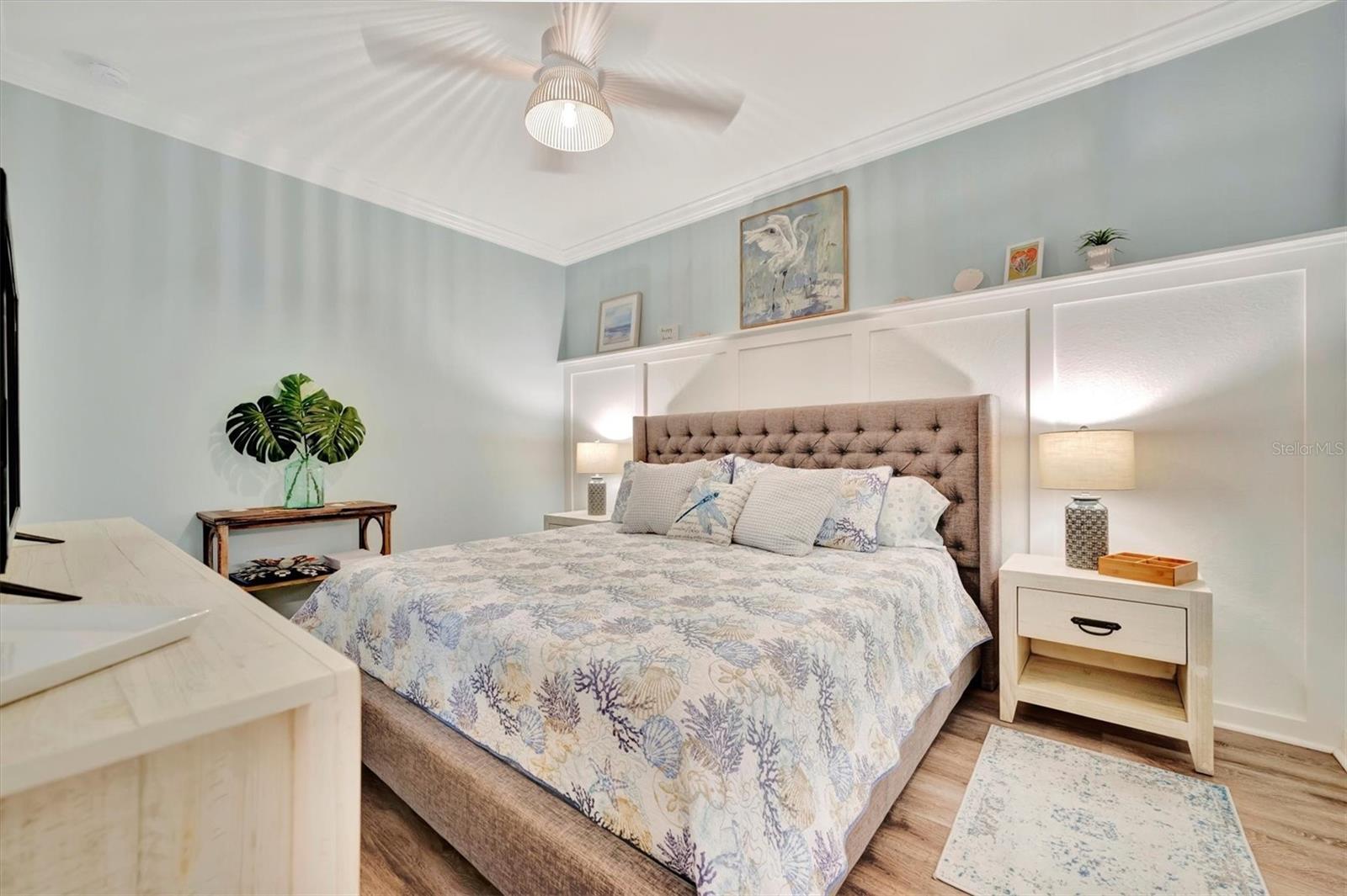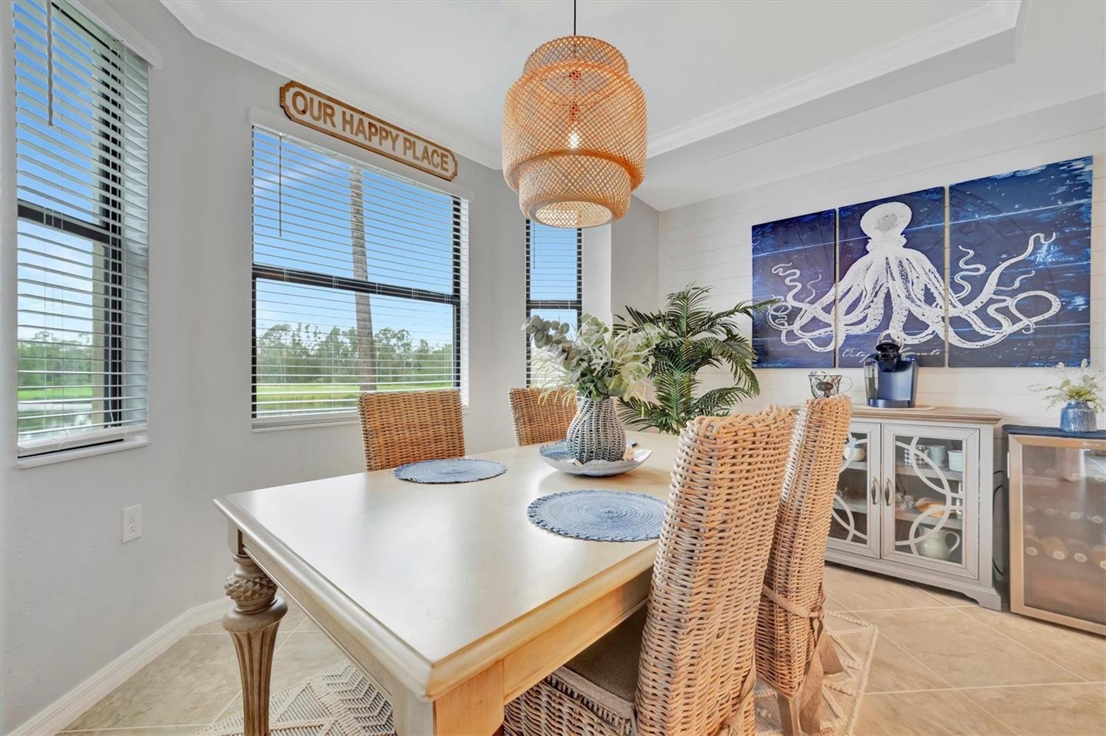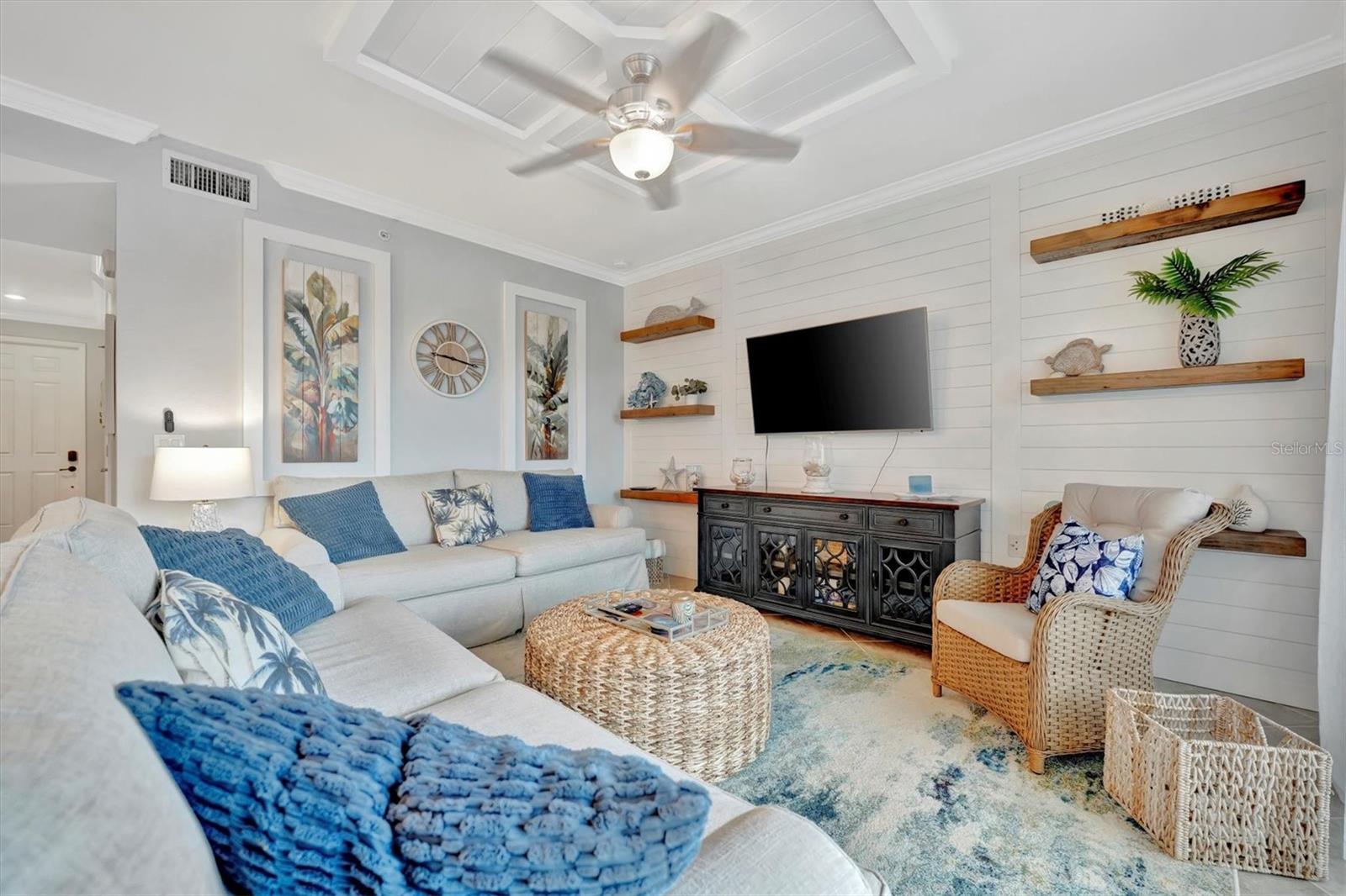 Welcome to paradise! Live in luxury at Lakewood National Golf Club, where residents enjoy membership to the 36-hole Arnold Palmer designed golf community. One of the most beautiful and upgraded units in the community, this custom first floor turnkey home offers a front row seat to the expansive views of hole #16 on the Piper Course. This 2 bedroom/2 bathroom, Birkdale Model features many stylish upgrades including beautiful Board and Batten accented walls, accented living room ceiling, luxury vinyl flooring throughout, custom cupboards and closets, open shelving in living room, upgraded fans in all bedrooms including the lanai, a stunning chandelier, as well as custom shiplap accenting in the living and dining rooms. The kitchen boasts a new full sink and faucet, artfully accented backsplash, beverage cooler, as well as new pendant lighting. The primary suite includes 2 walk-in closets, an en suite bath with a spacious walk-in shower, and granite vanity. This home comes with an assigned covered parking spot and custom shelving in the storage closet for your convenience. With one of the better water views in the community, you will experience wildlife and golf up close and personal from the comfort of your screened-in lanai that is completely sealed, so no visits from geckos or other critters. The brand-new A/C compressor will leave you comfortable, cool and worry free for years to come. Membership boasts access to 36 holes of golf, 24-hour gated security with nightly patrol, a state-of-the-art fitness center with 24-hour access, an onsite fitness director, a TPI certified personal trainer, and a variety of group fitness classes to choose from, saunas in the men’s and women’s locker rooms, 8 lighted Har-Tru tennis courts, 4 pickleball courts, 2 Har-Tru bocce courts, full-service salon/spa, resort-style pool with waterfall features, a spa, and a lap pool. Enjoy dining at the community's 2 restaurants - the poolside Tiki Bar & Grill, and the full service on-site dining experience at Deke’s Grill & Palmer Room located inside the newly finished clubhouse. You will find everything you need within this beautiful gated community.